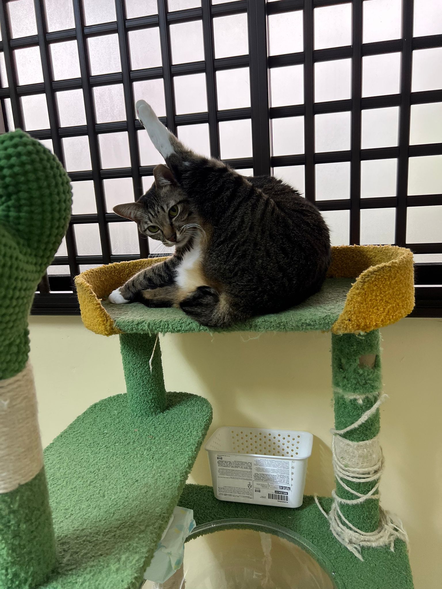 Entered 猫房 w her 2 brothers as 3 fierce kittens. Over the time in 猫房 free roaming and mixing with other cats n making friends, the boys are fine n I can kiss them. Nala still scare of everything, don’t allow touch will jump away. She will find Jack papa for comfy. Got to find a very patient adopter for her.