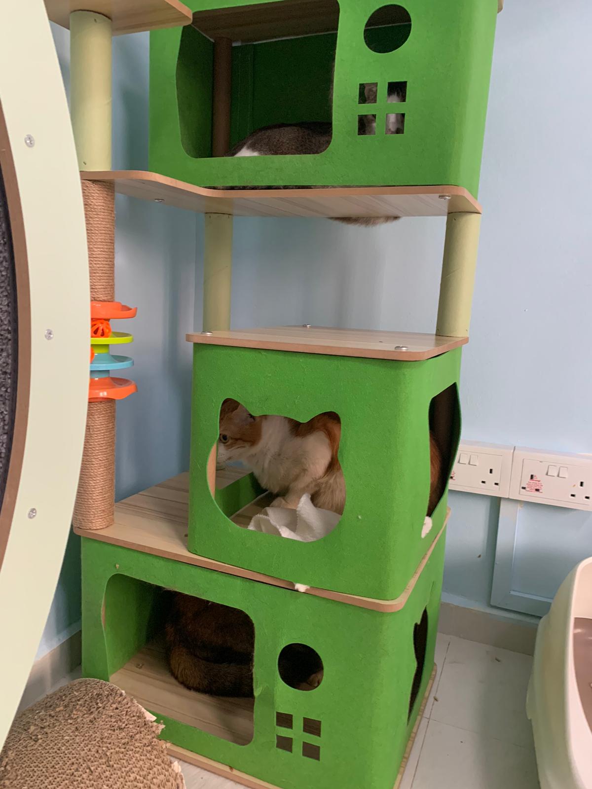 10am+: I check their bin, for 3 days overnight – the pee amount is a lot, should be from cherie. Today Benji sit on lower deck cat tree, i sayang him and brush him also. Look more relax than last time. I put in one more oval sb for him, didn’t see them use it yet.
