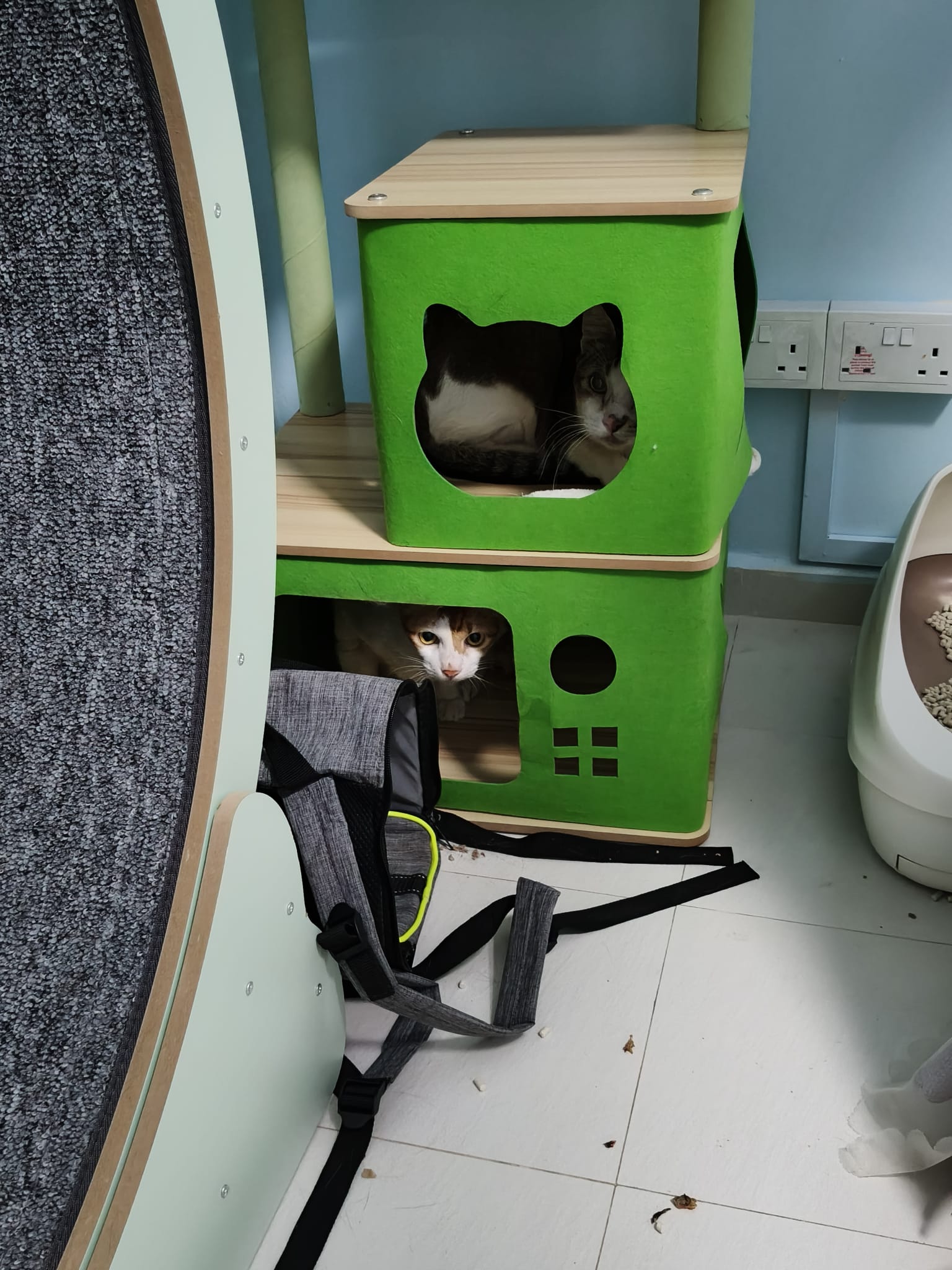 10.02pm: omg even mmm serve new food, Cherie n Gigli still didn’t move for so many hours. Benji is trapped. If Tmr morning still didn’t move, I’m going to remove whole cage 03 trays and mesh and split them. Or maybe I should take out the ctn of food to make more space for them at once. Got cat tree don’t hide sigh.