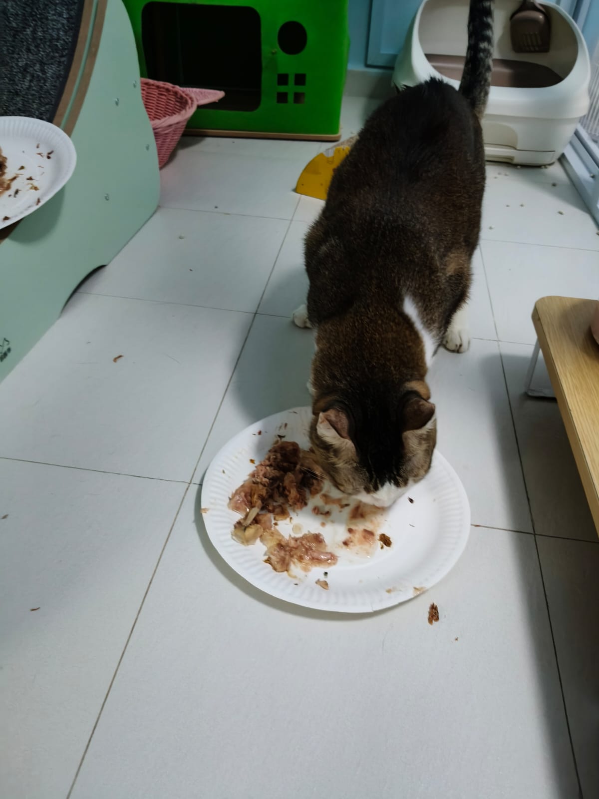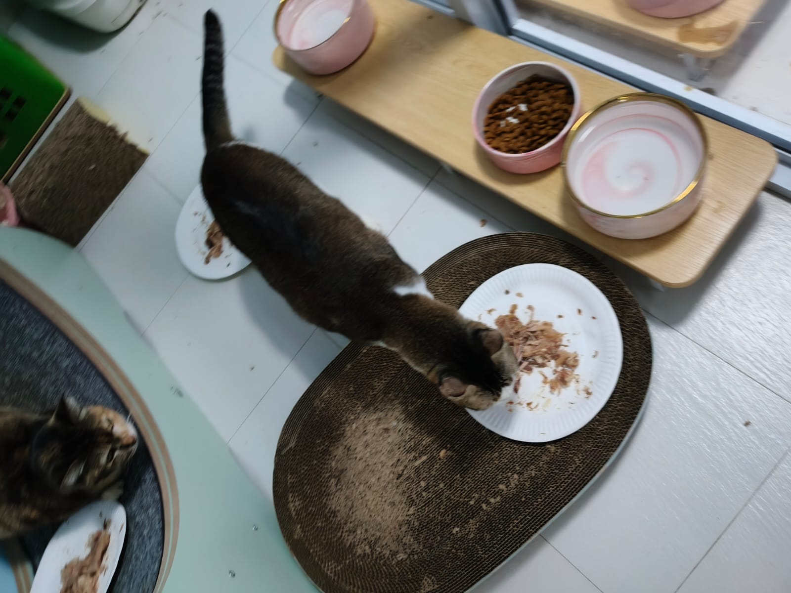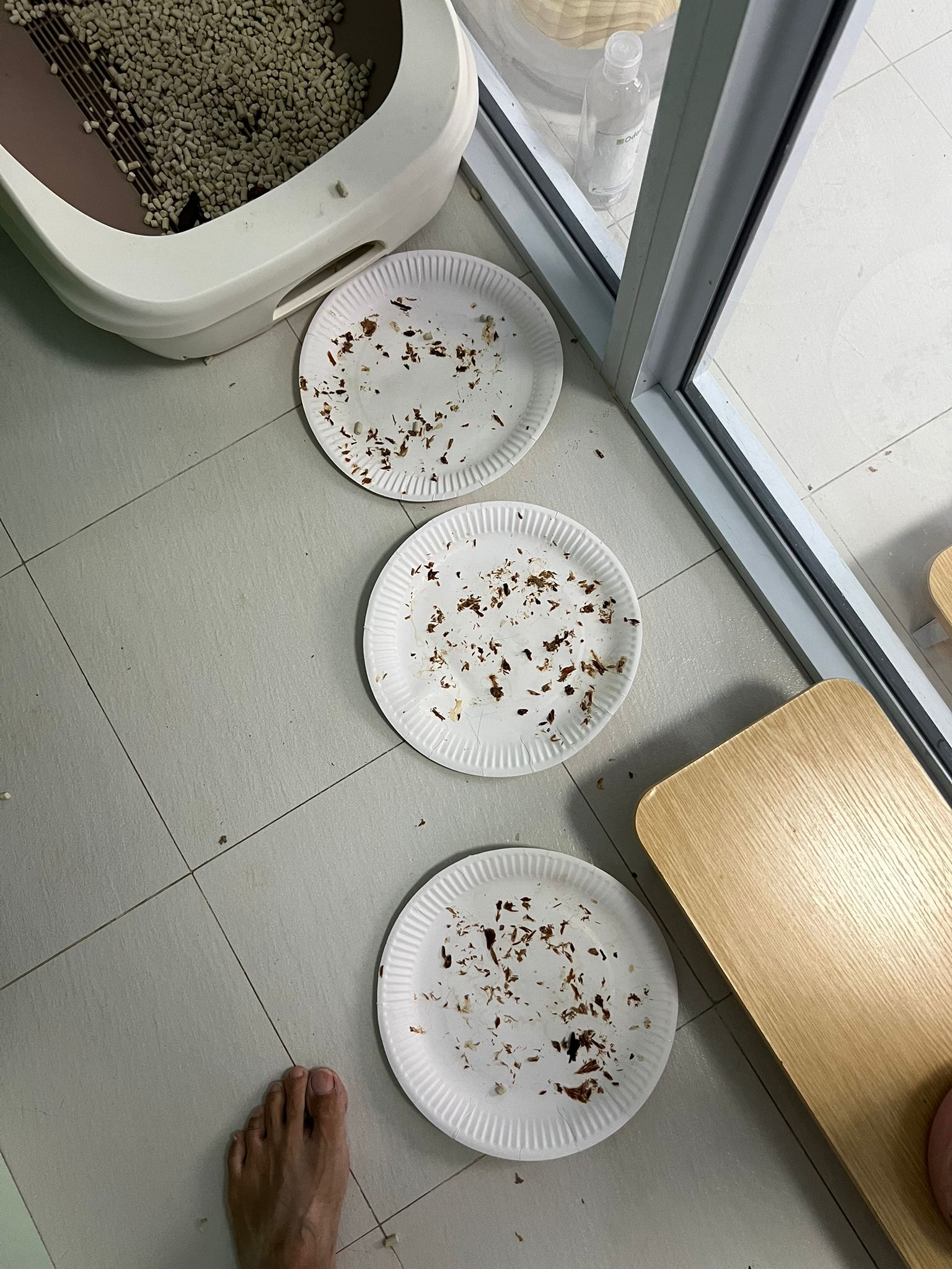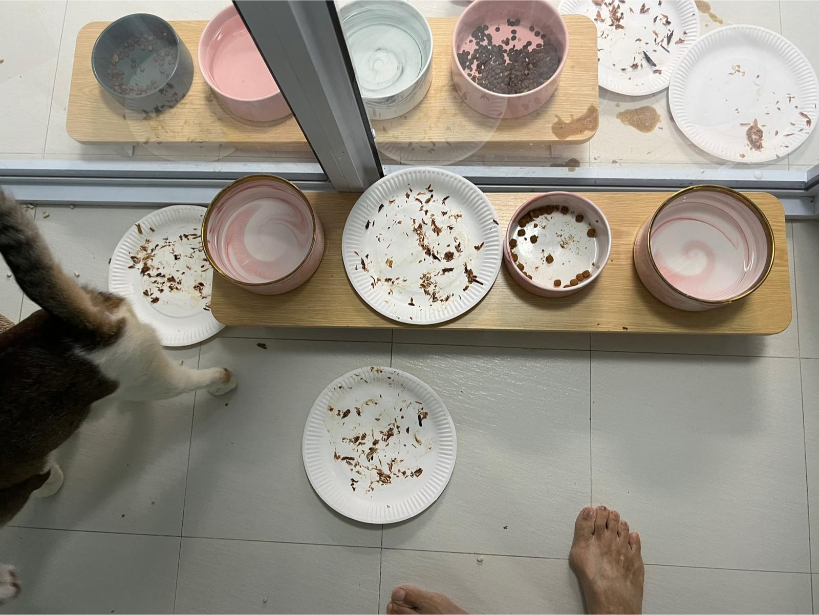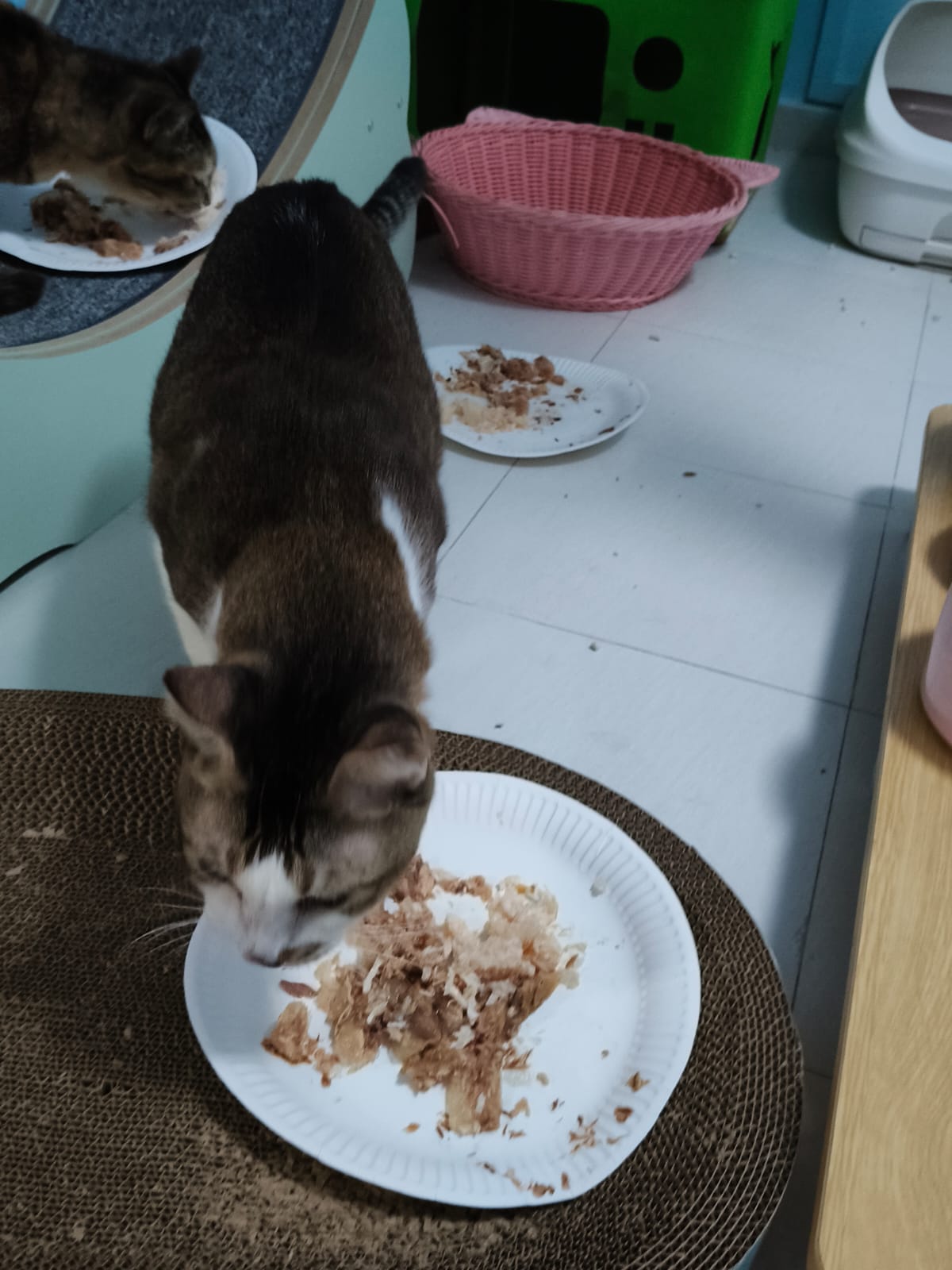 10am+: wa their room 3 plates all quite full, like 2.5 plates left untouched, it’s tuna w pumpkin they don’t like ah.