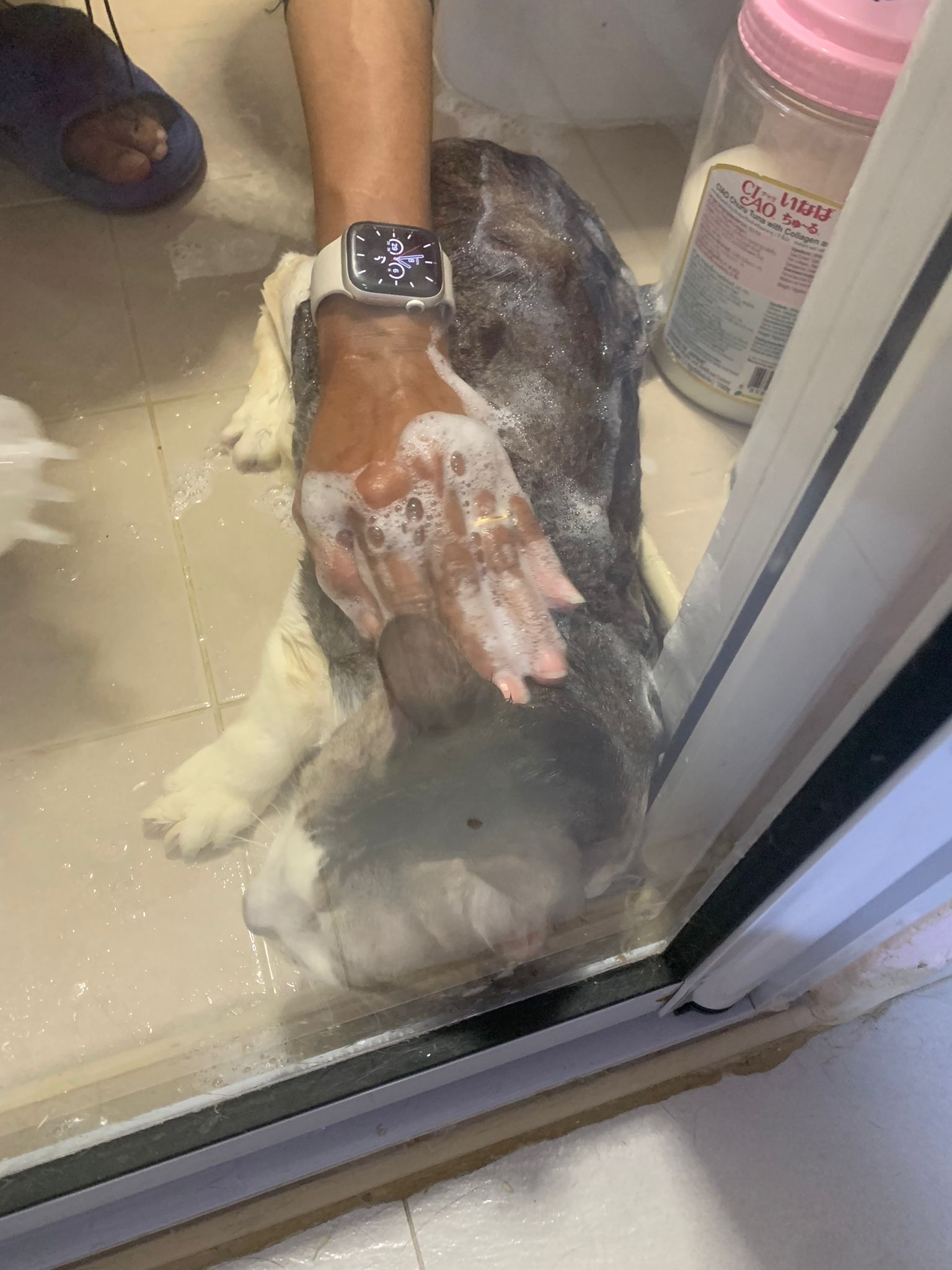 Ha he need to be towel and blanket wrap to go into shower room. Main groomer shampoo him on the floor and he is more stable and he just lie on the floor w his tongue out.
