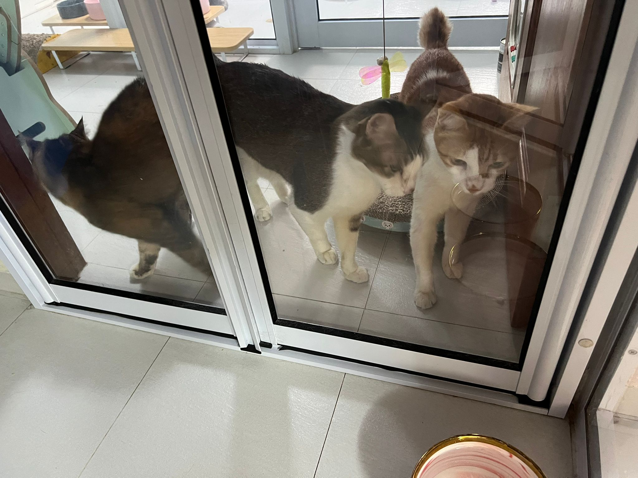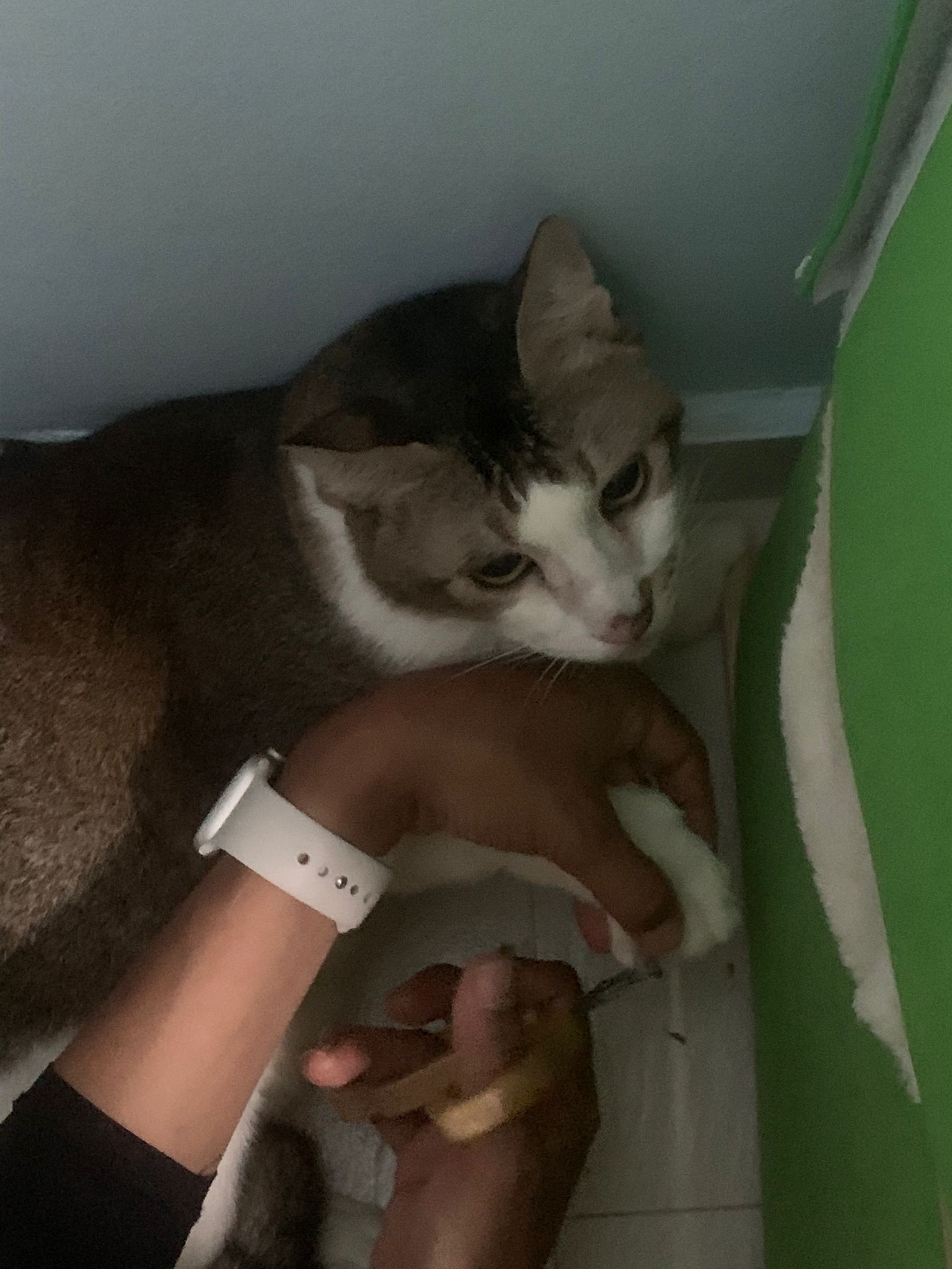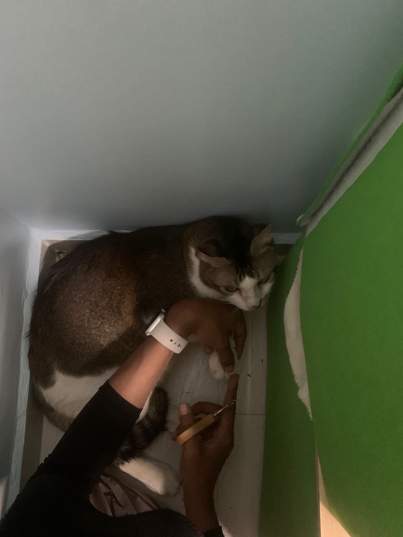 Calm in 猫房 seeing gigi and cherie but no space so let him cut nails and clean ears in their own room first. Ears clean and no ingrowth.