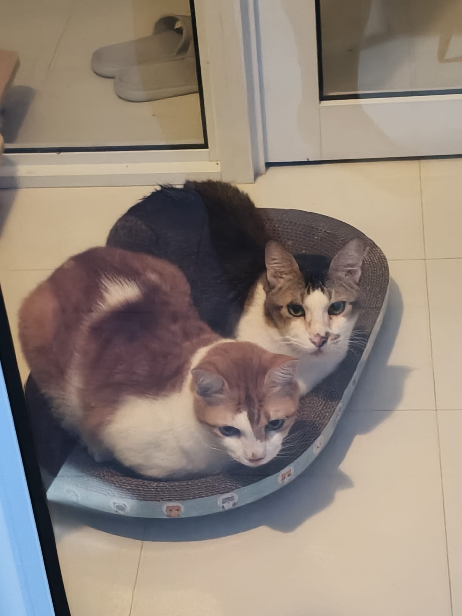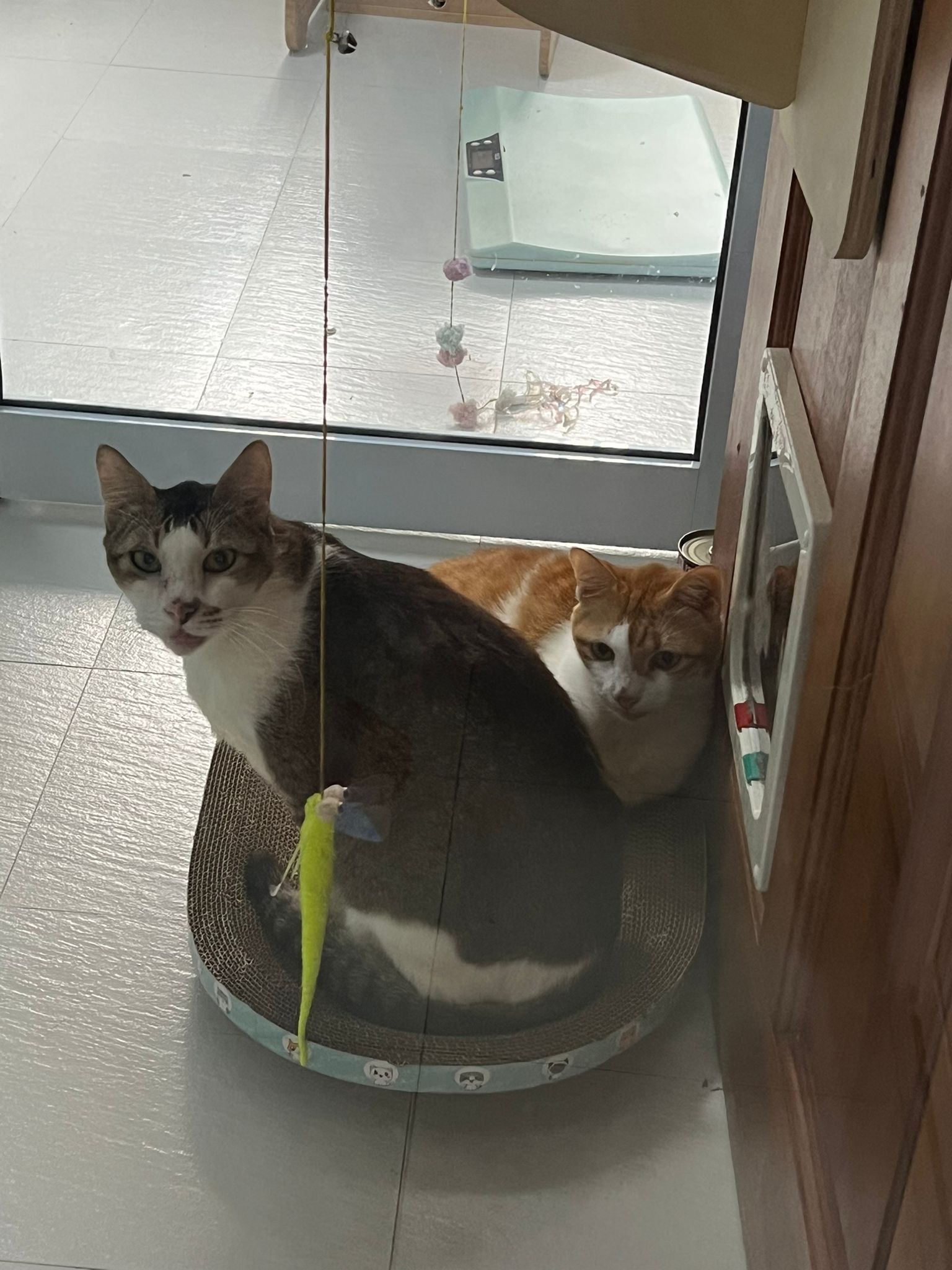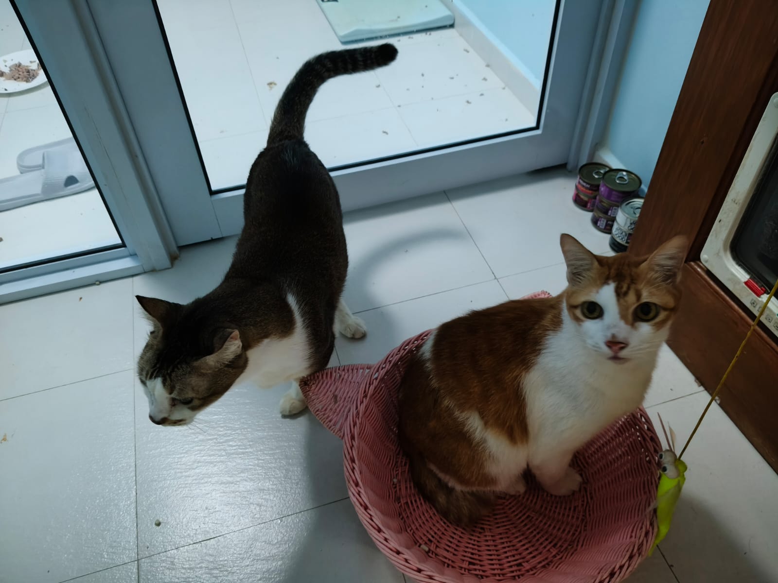 Both are brothers. Their mother gave birth to 3 kittens outside my house. Bought them in and later, adopted the mother and their brother to a family. Both are happy cats and have a sweet temperament. Benji loves to eat and not fussy about food