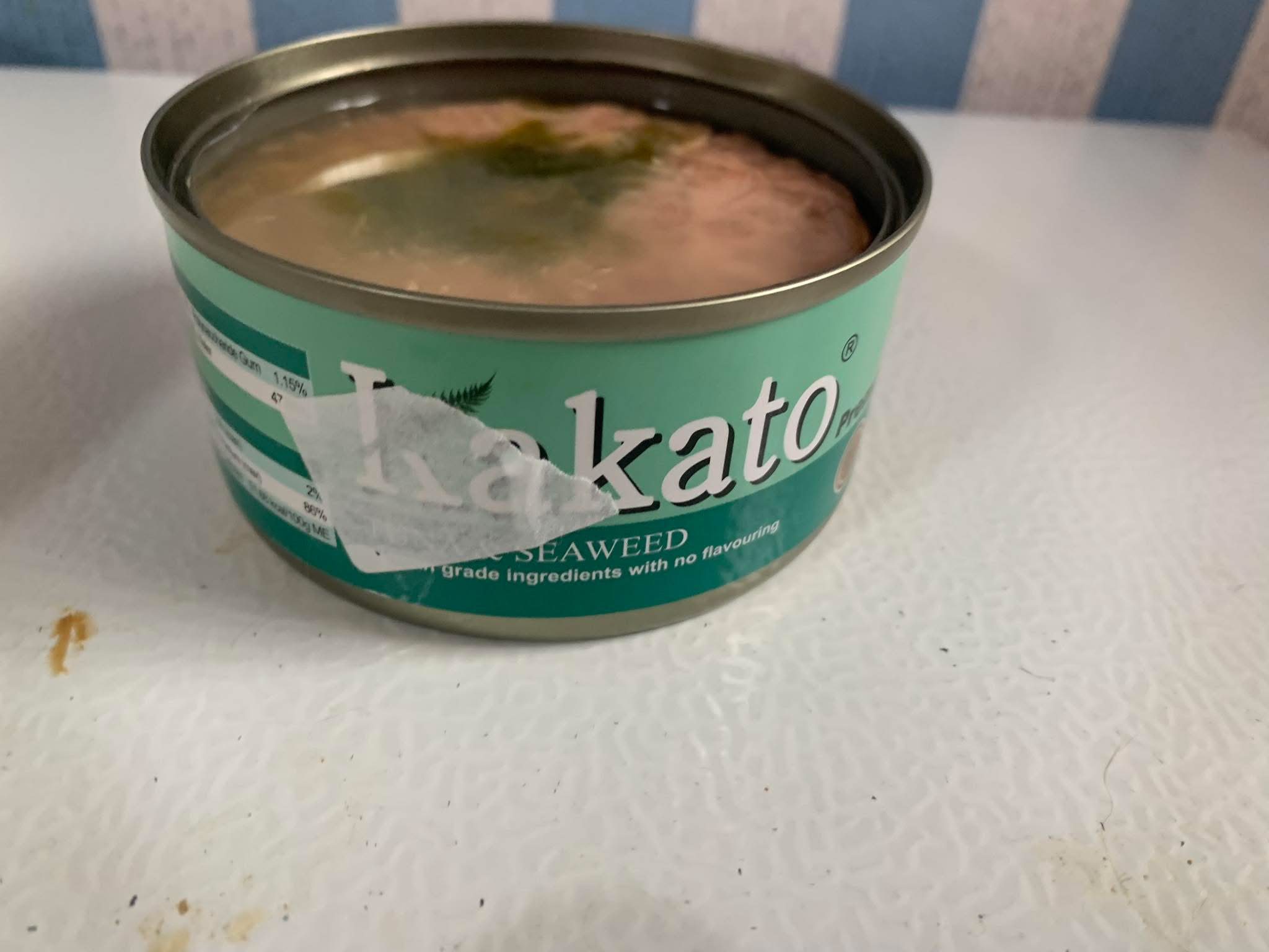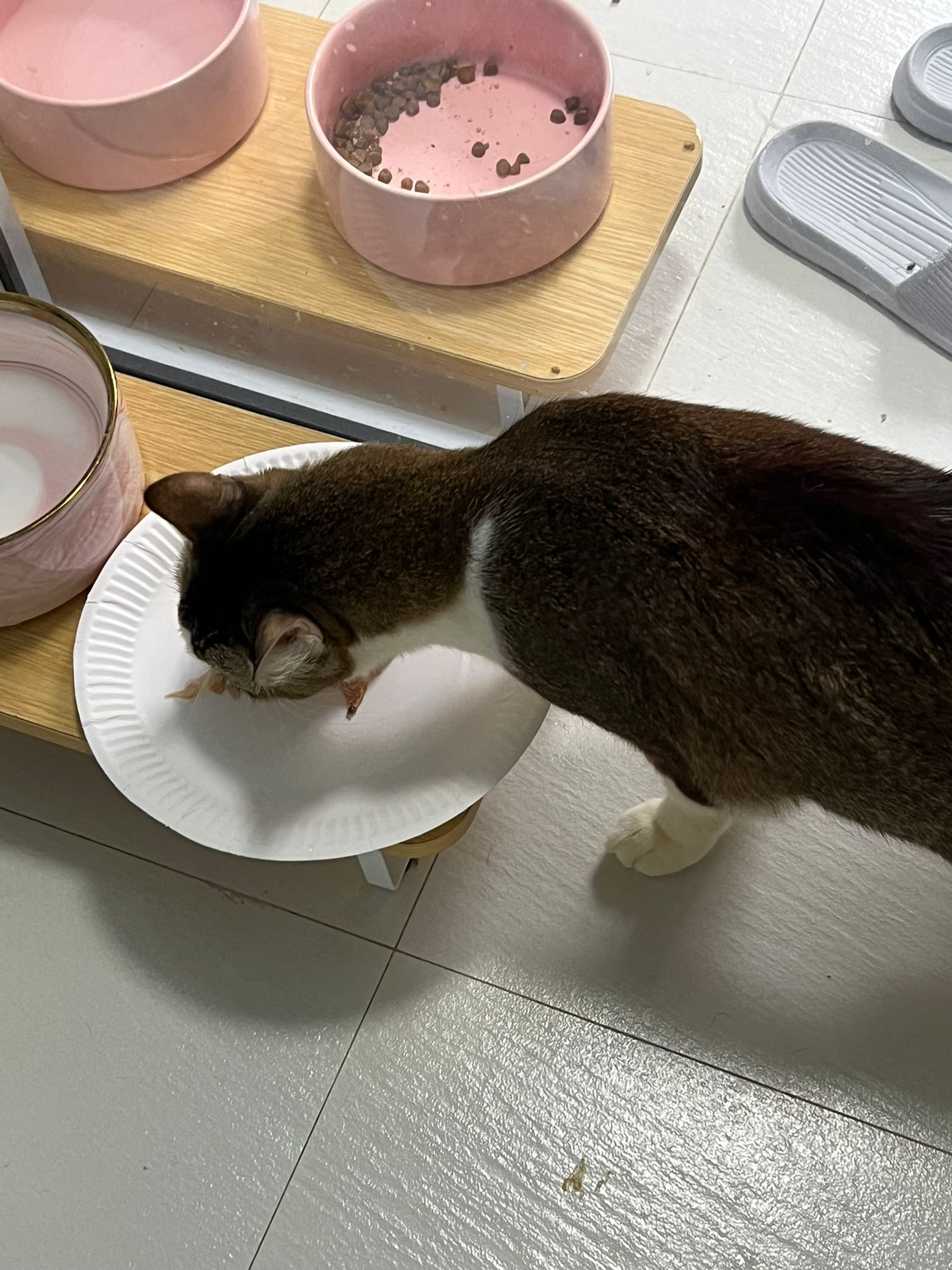 9am+: all good plate empty. No poo. Jo serve tuna food all got eat. The kibble bowl w the ba woo Erm … they don’t like branded treats ah? Think they like The feline natural much more.