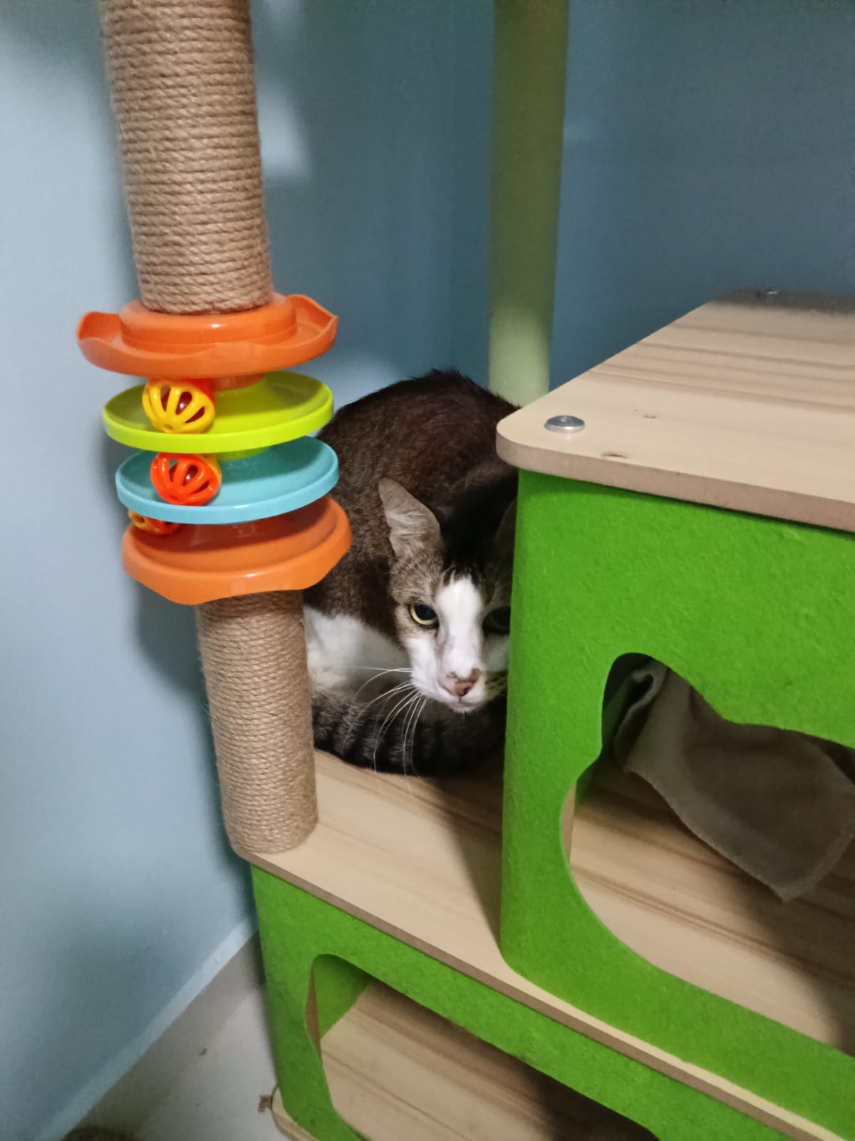 10am+: enter 猫房. First to come out of his big carrier, sayang him and hide into the cat tree, then hide behind the cat tree. Can carry him out to weigh, 5.26kg – gain 120g from 10.5 months. Brush his fur.