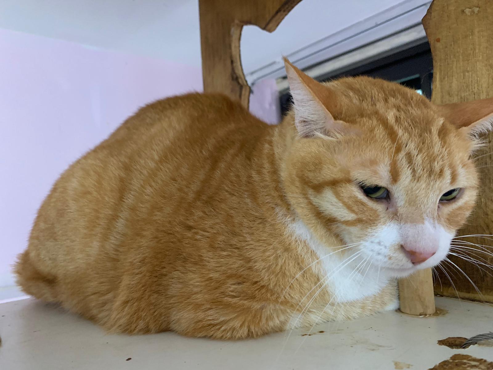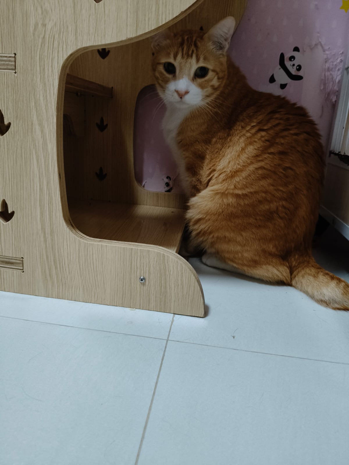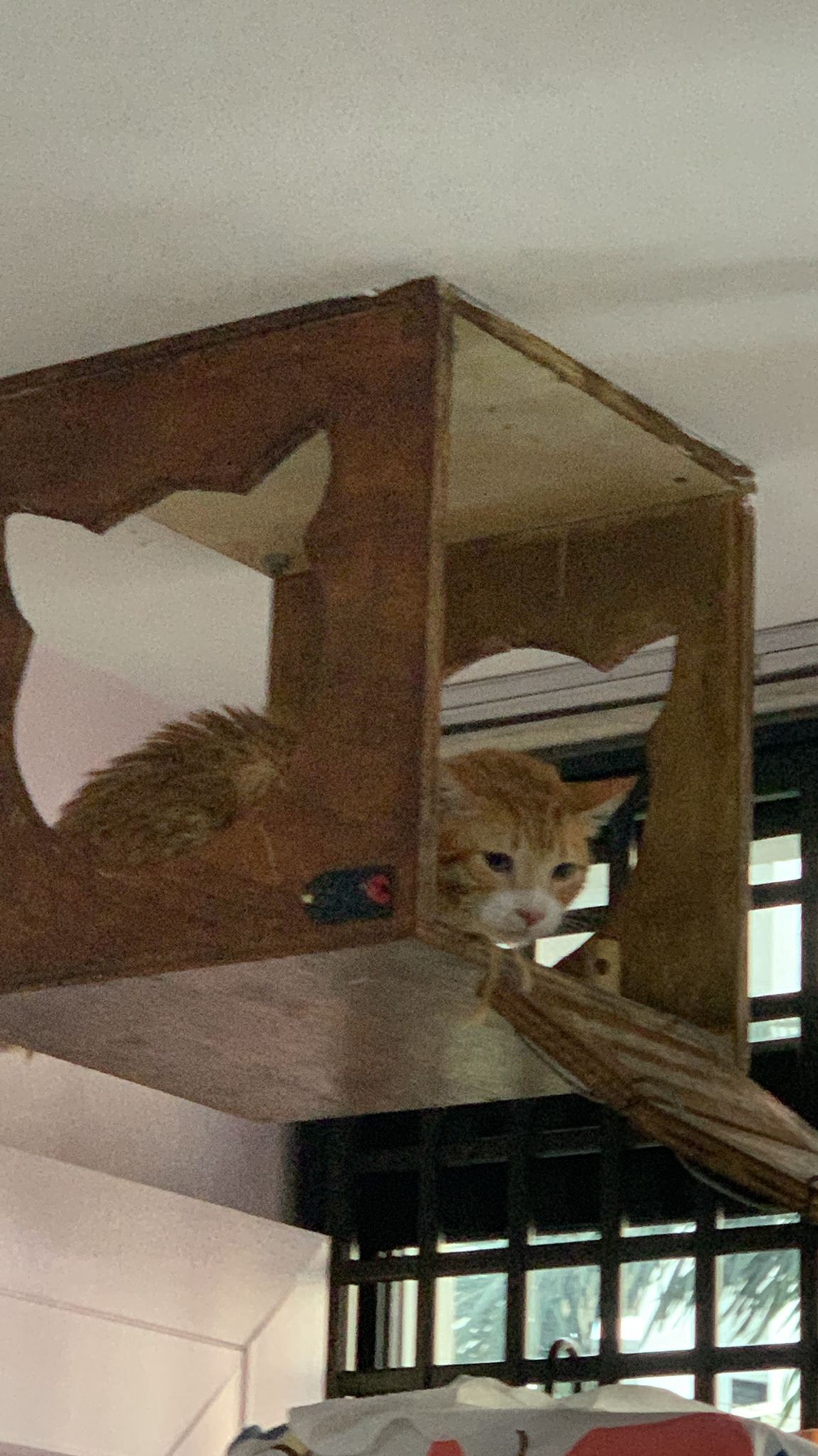 Follow his mummy Amber since young, scare of human, don’t allow touch. He don’t really attack me if I touch him but he will fly away. He is playful, play feather time n laser light he will come. I assume he grow up well in 猫房 – muscular and strong.