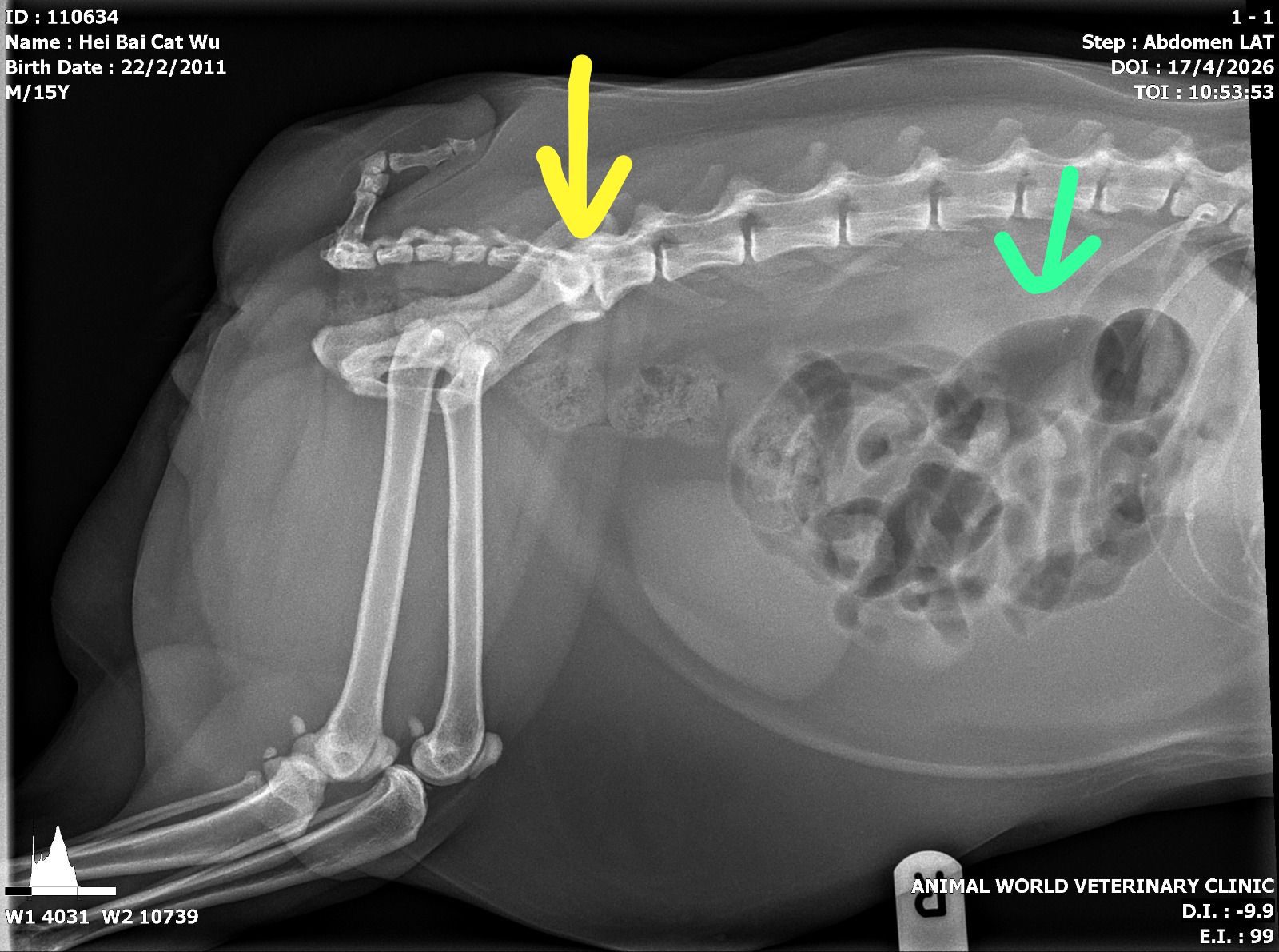 Yellow arrow – area of bright white ie sclerosis could be lower back/pelvis area arthritis, monitor for any dragging of backpaws in case of nerve pinching”