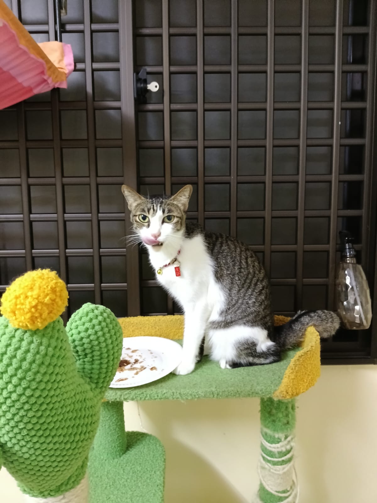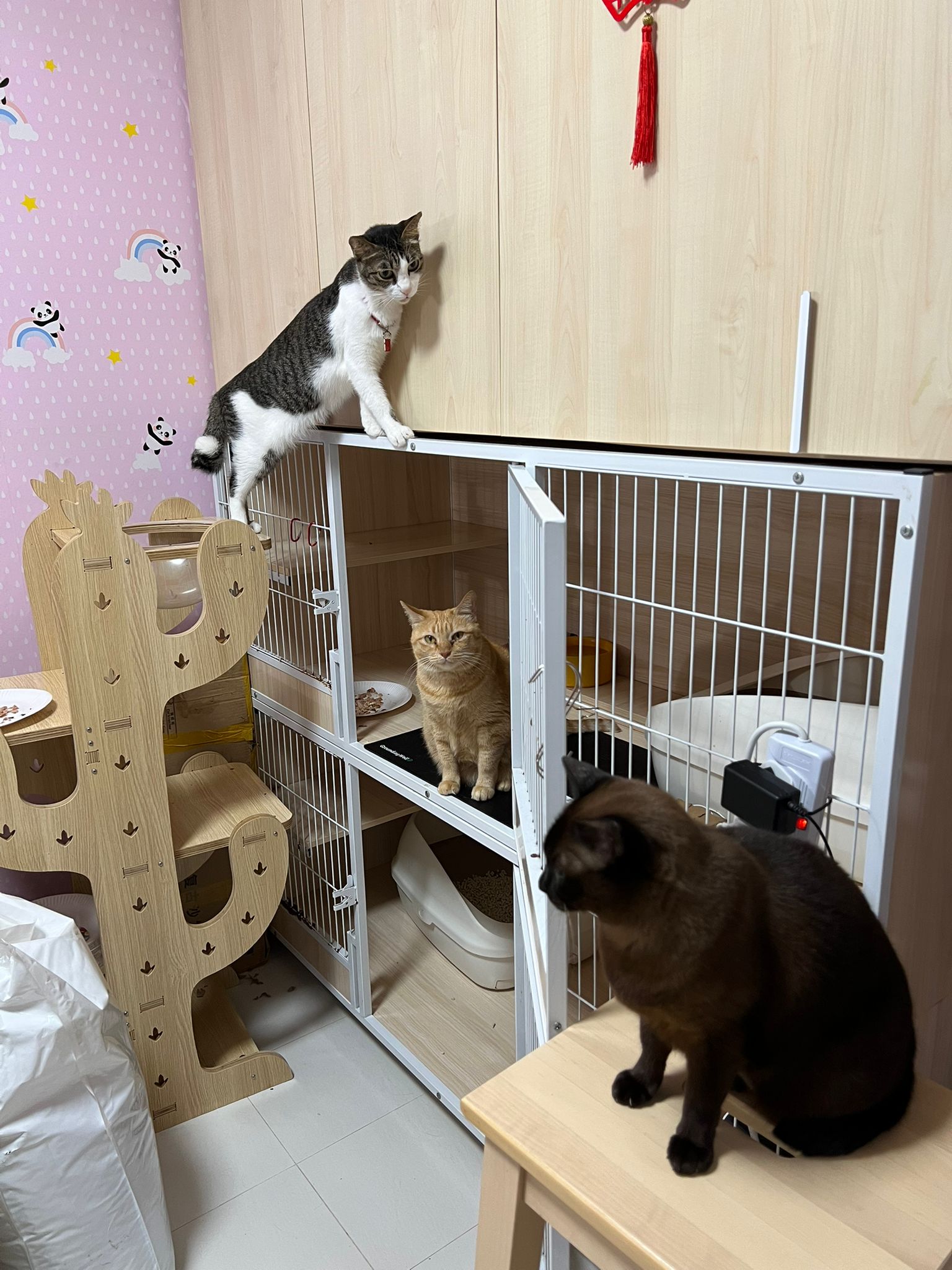 9Am+: my fighter boy, got eat Aristocat. Even char go into cage to accompany him. He got come out to sit on the bowl on the cactus tree.