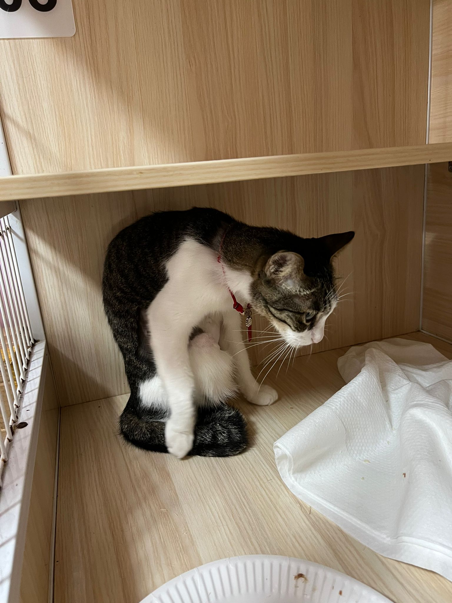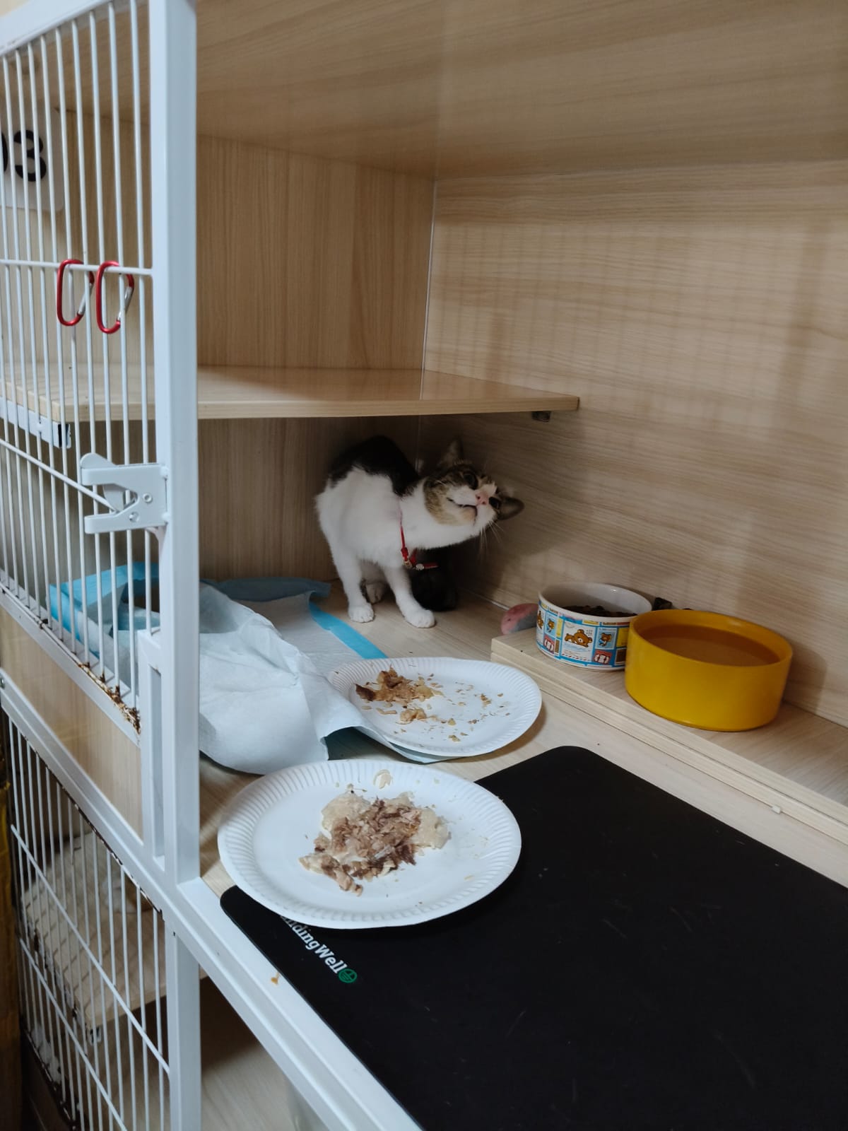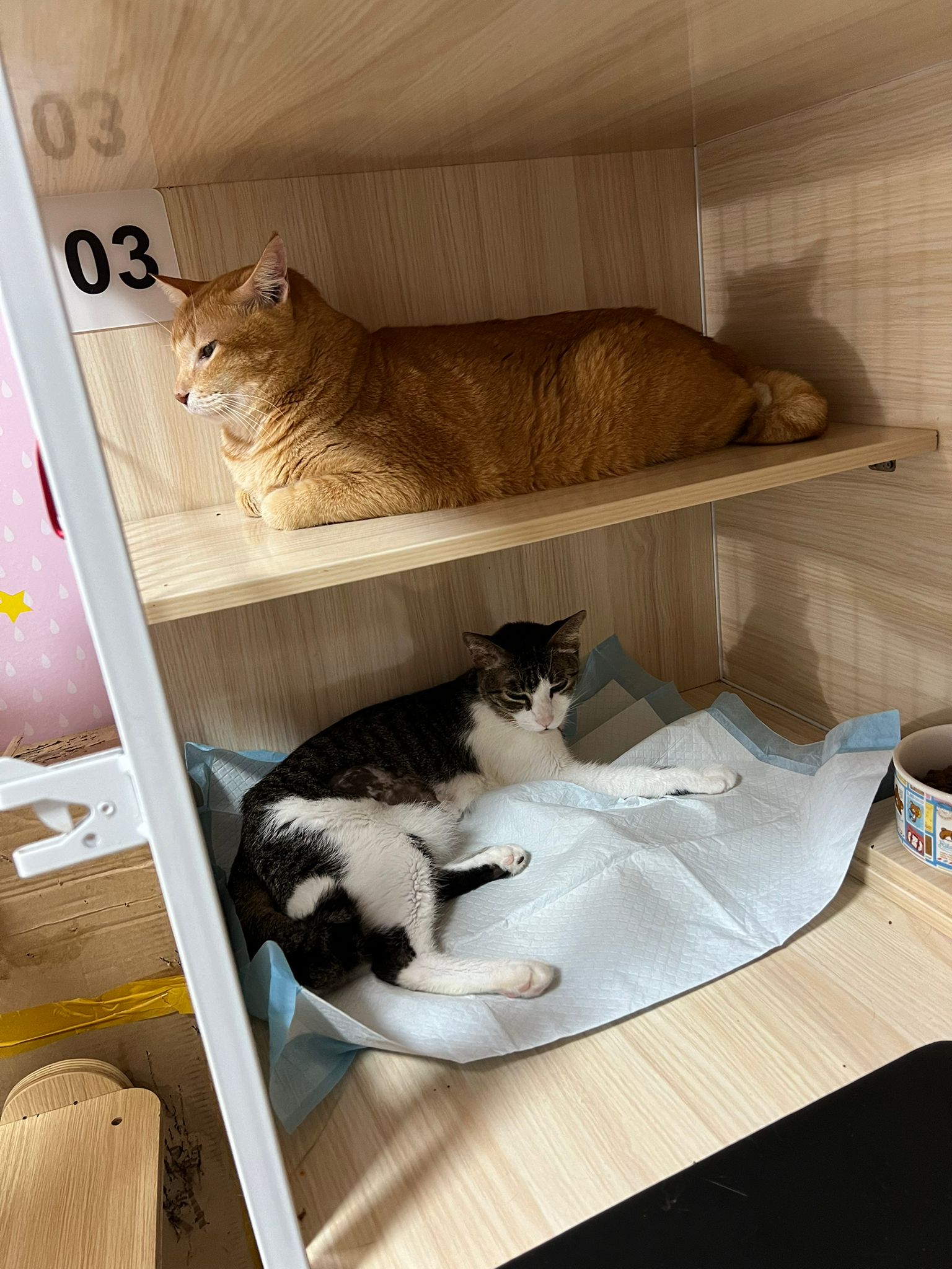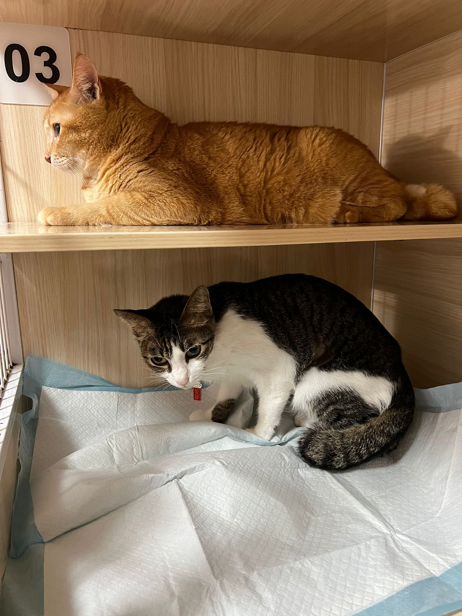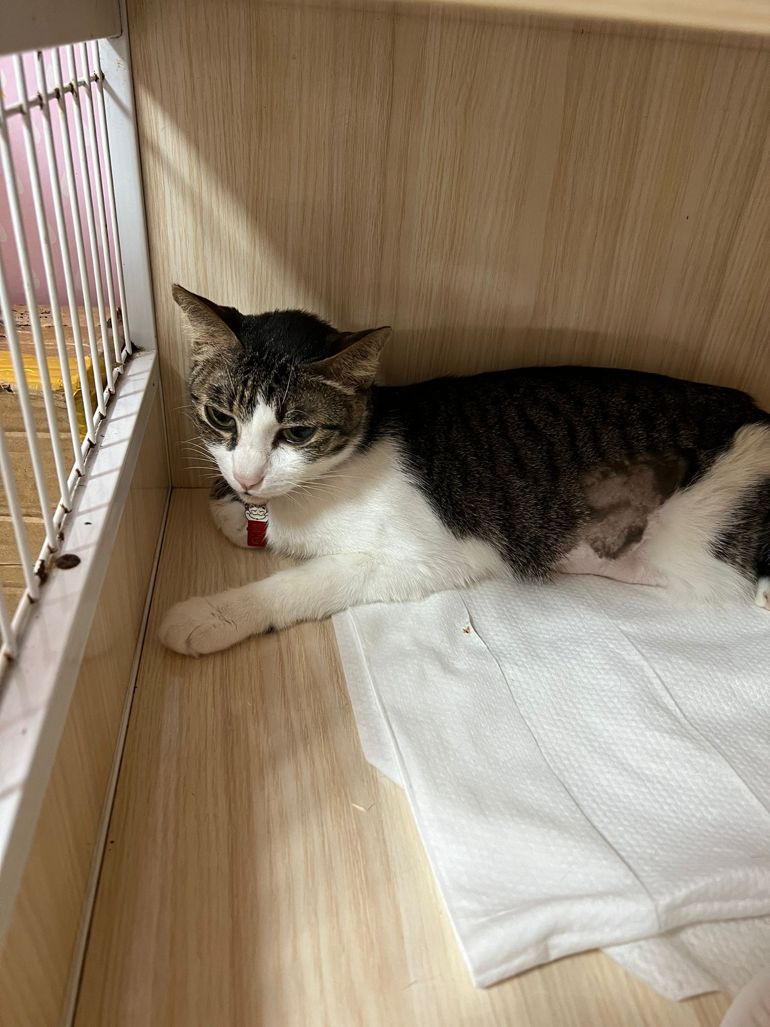 3.30pm+: i added new teabreak slot for the cats so that the critical one someone is there to check latest status and sayang. Jo photo show Peepad in cage i ask her why:”Coz he keep laying in the bin so I put pee pad for him to rest there” – then the video seem like ah boy got a tape on his tummy? Did they try to tap him just now?