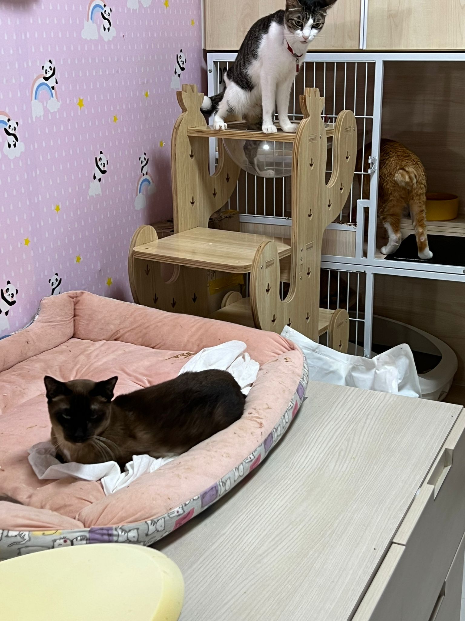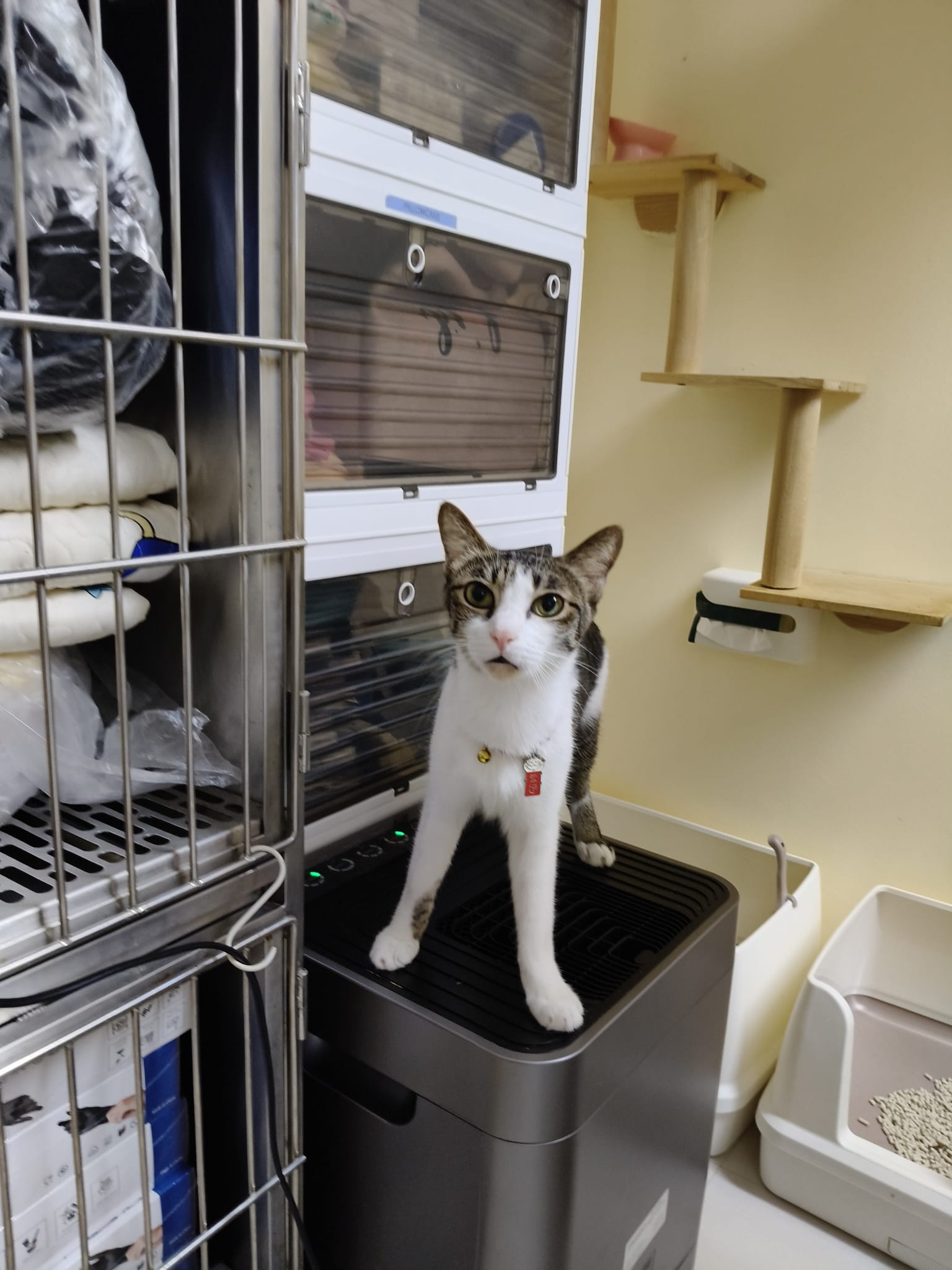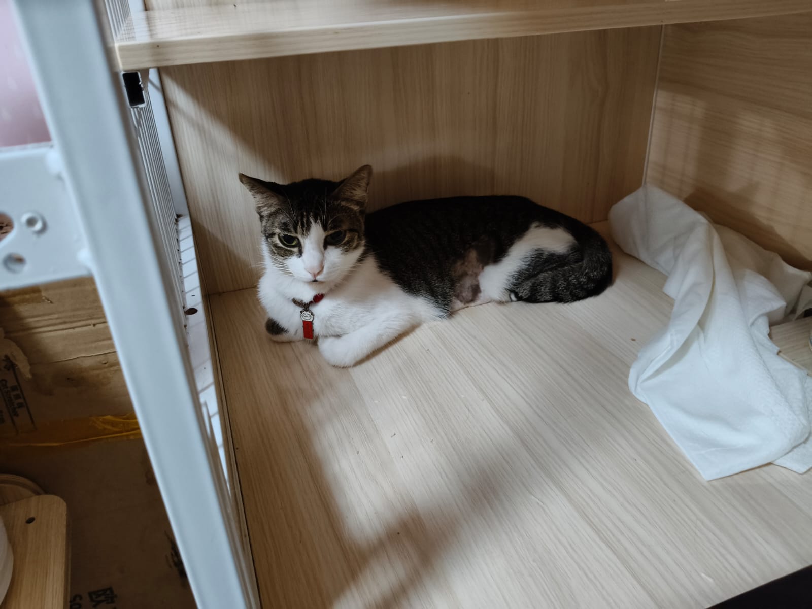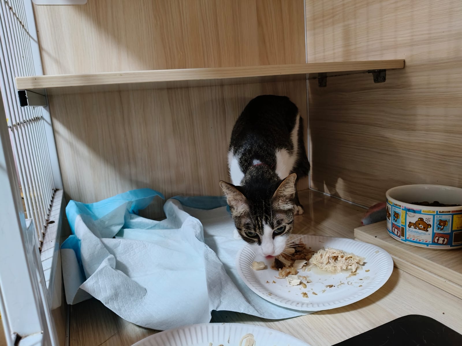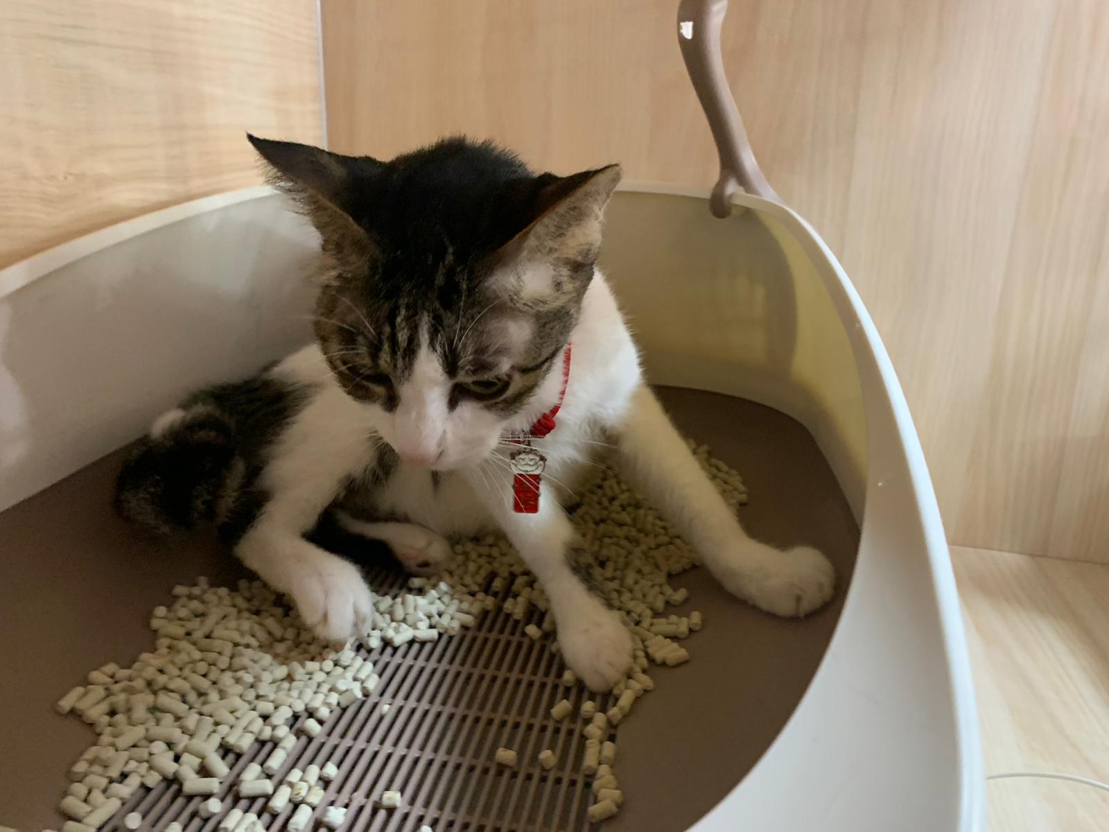3.30pm+: i added new teabreak slot for the cats so that the critical one someone is there to check latest status and sayang. Jo photo show Peepad in cage i ask her why:”Coz he keep laying in the bin so I put pee pad for him to rest there” – then the video seem like ah boy got a tape on his tummy? Did they try to tap him just now?