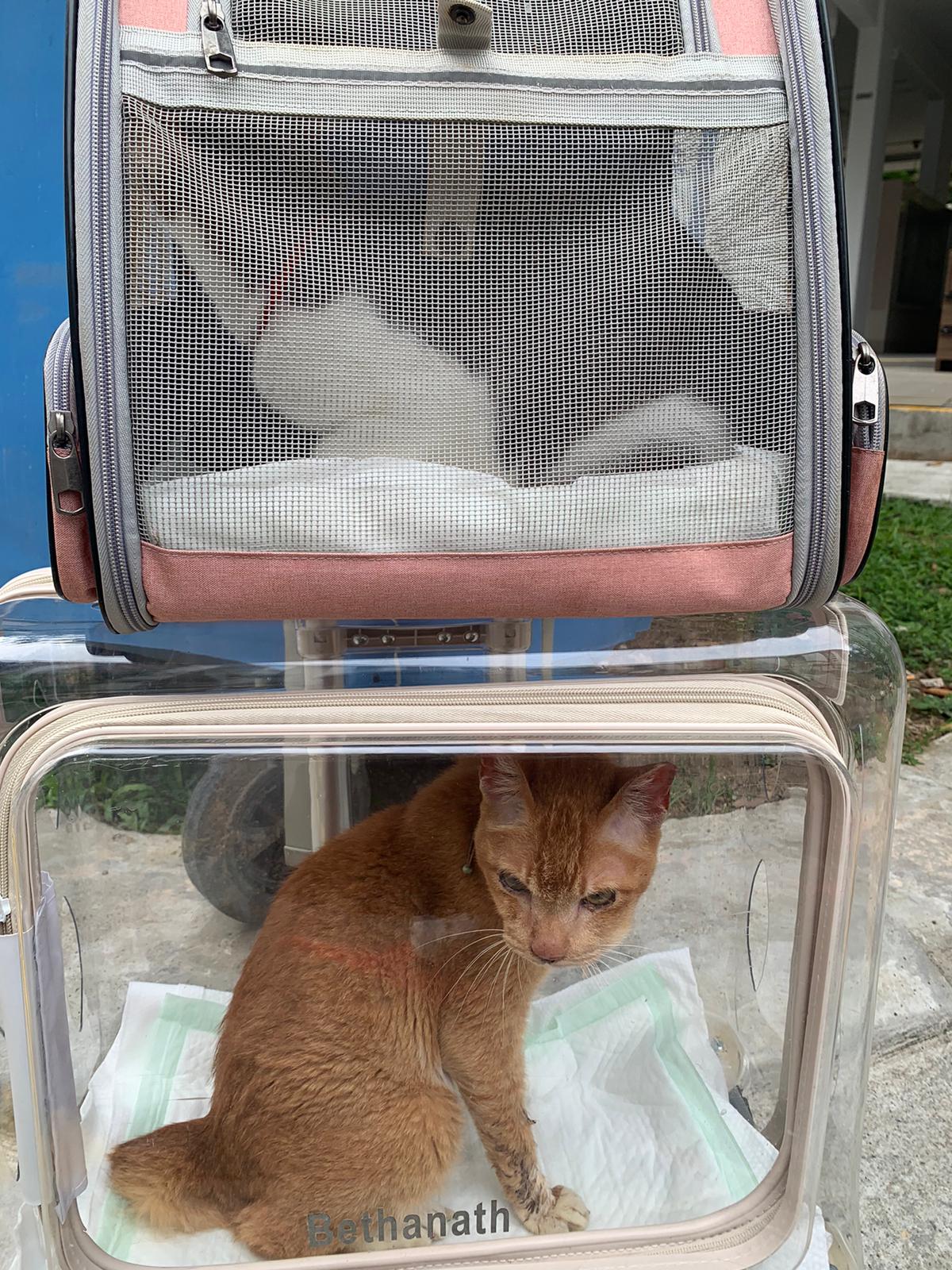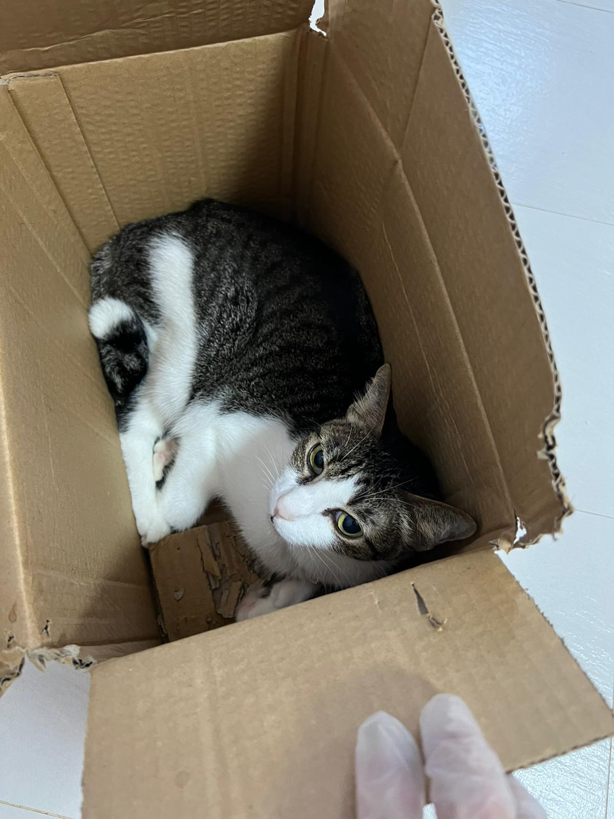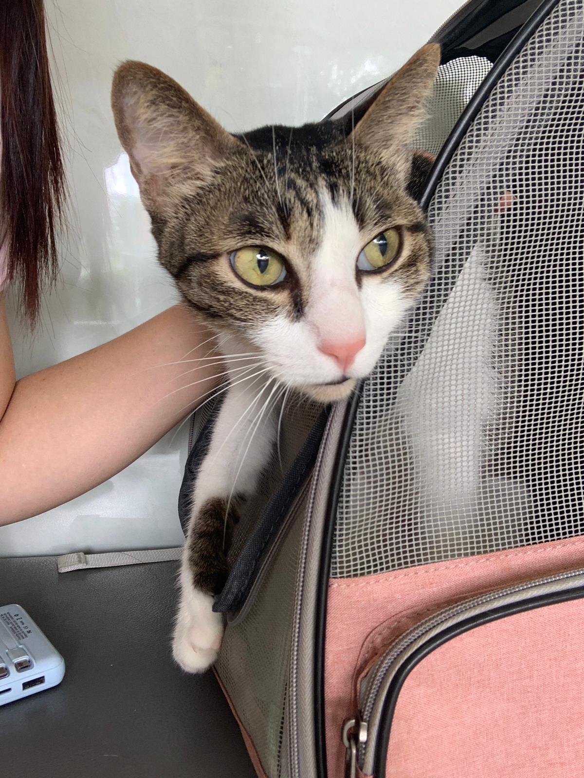 “bring to AD on26. Im otw to james tan to vacc and fiv felv. Two n half months. Rescurer thought is girl, so called mei mei on vaccination card, he is called ah boy now. Deworm done. Only Revo do later. They just give kibble. Adult kibble. Yes he ate some of their adult cat kibbles last night. Last time he ate was 6+am in the morning, in total he ate about 1 big scoop of food. I believe the current kibble we’re on is snappy Tom (my cat loves the little anchovies) Then nv pee or poo yet. Did not eat much. Last night so active also this am in cage”