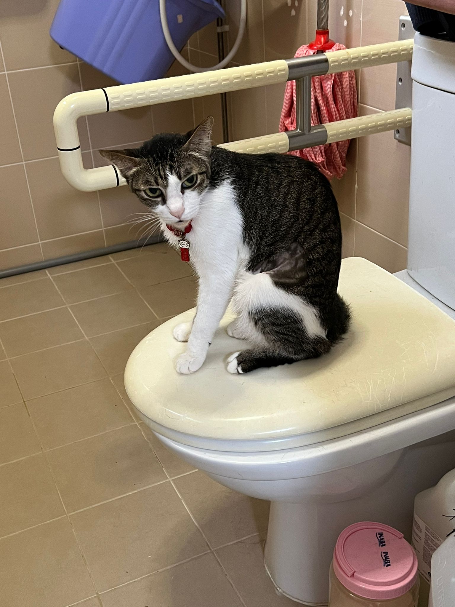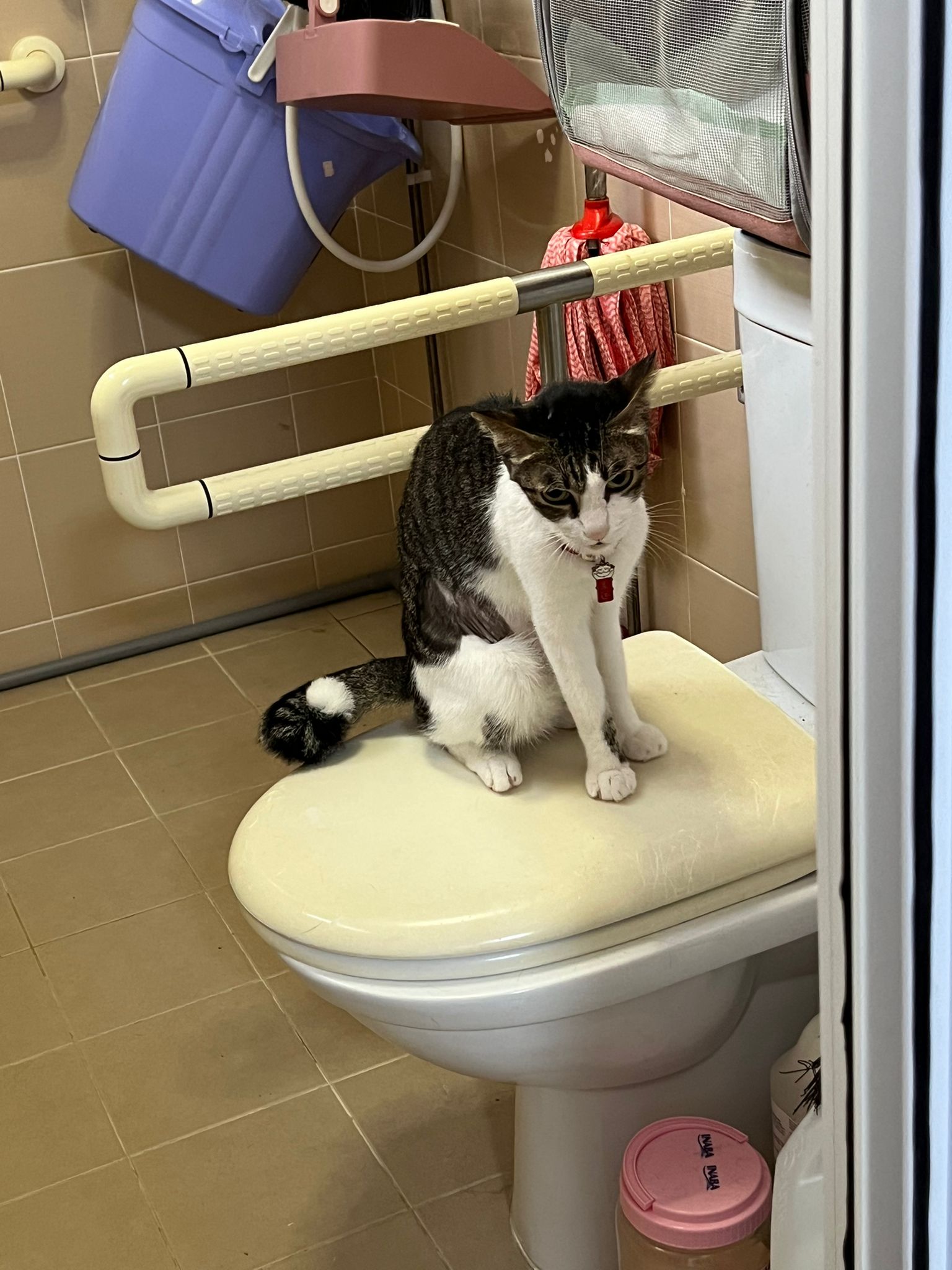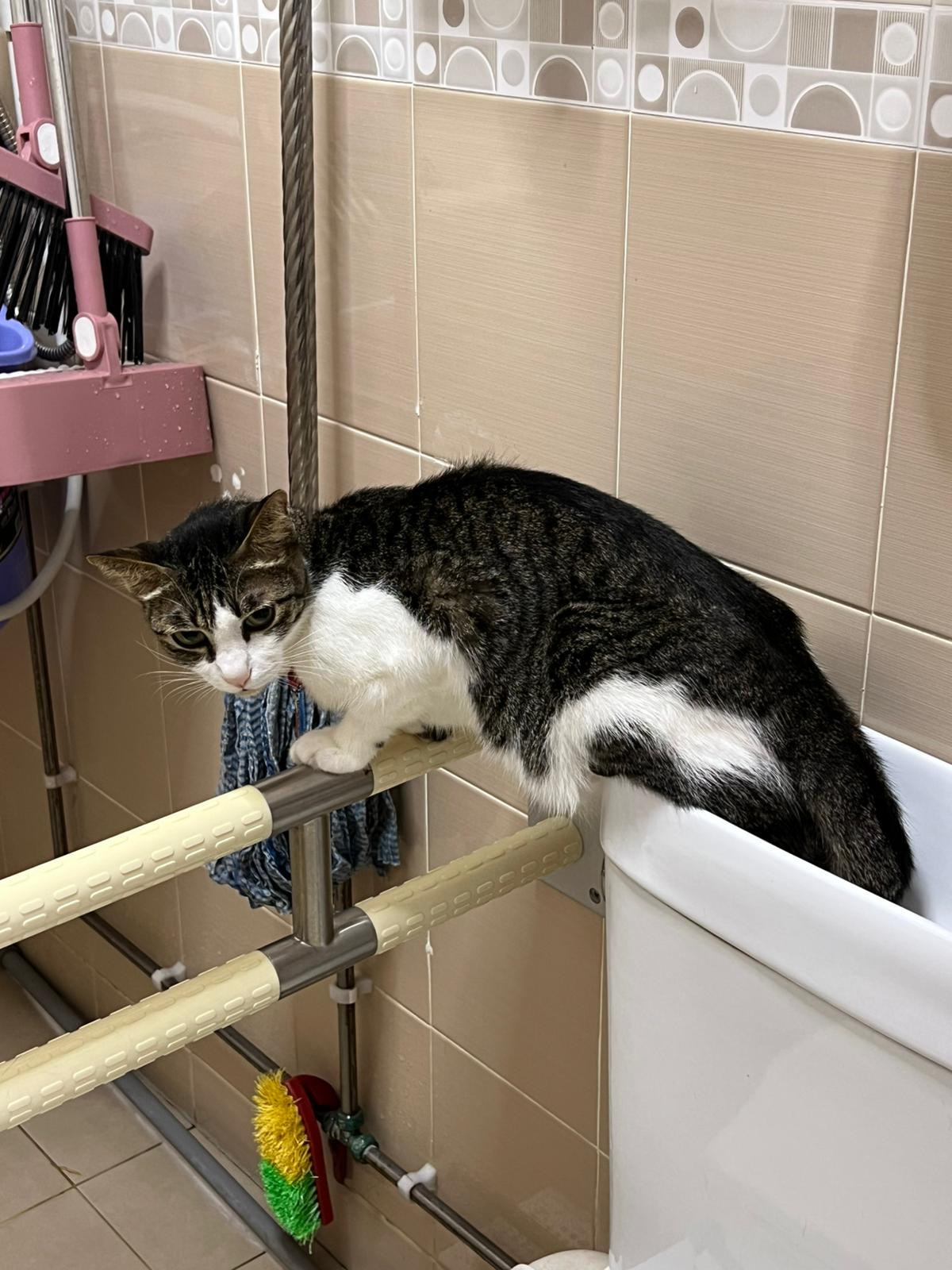 9.41am: told jo send me video and told her what mmm say. Jo:”He seem fine right now”. – video he seem ok also grooming on top of toilet bowl.