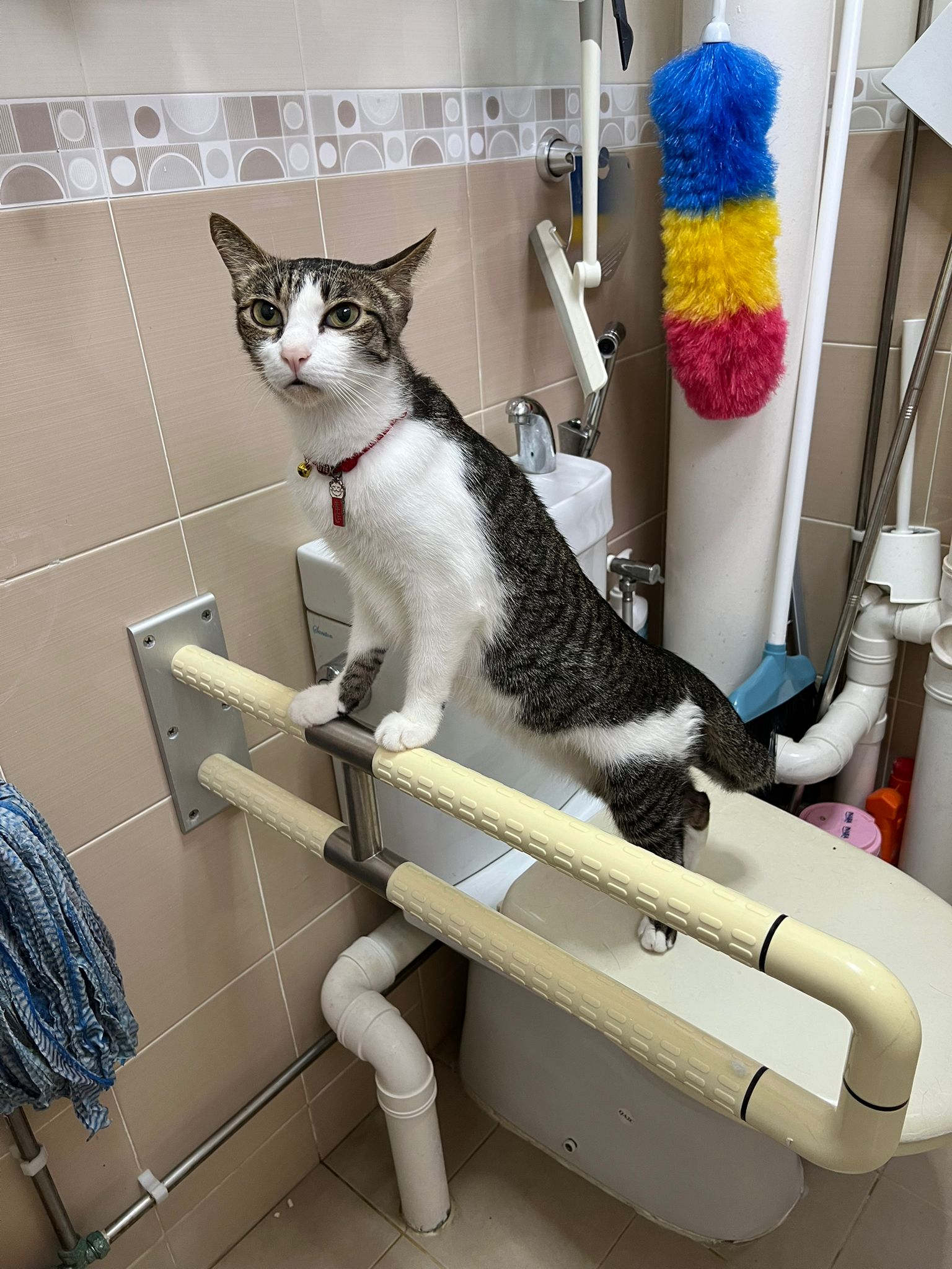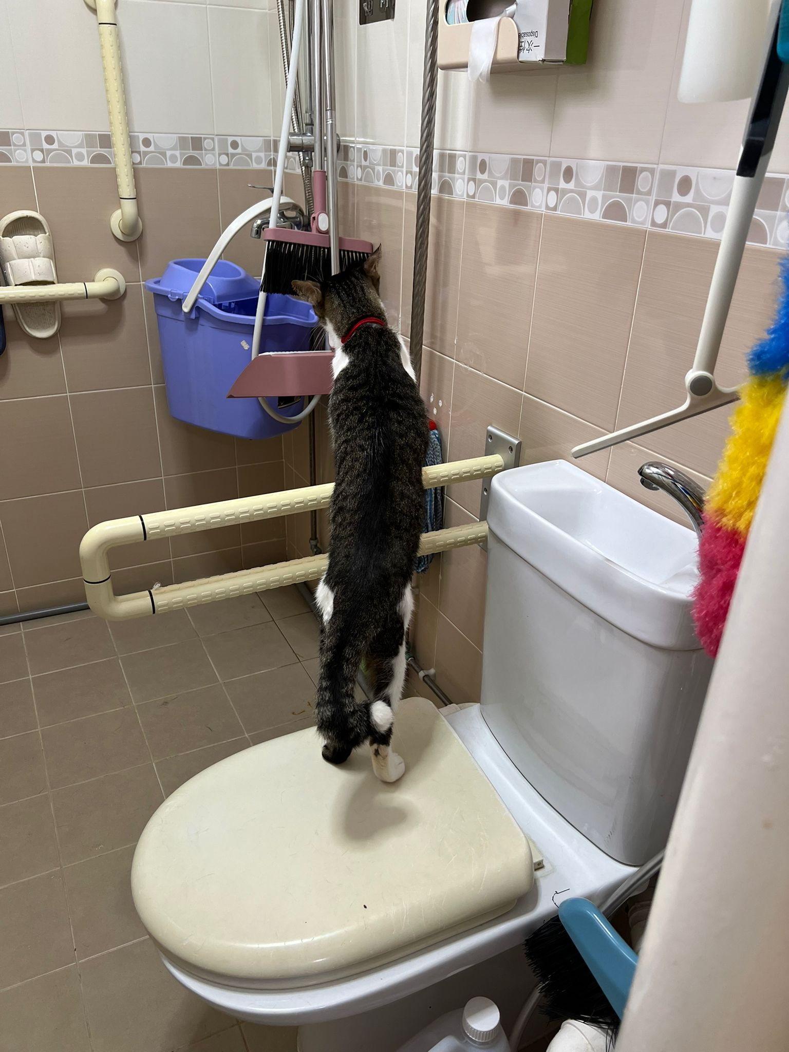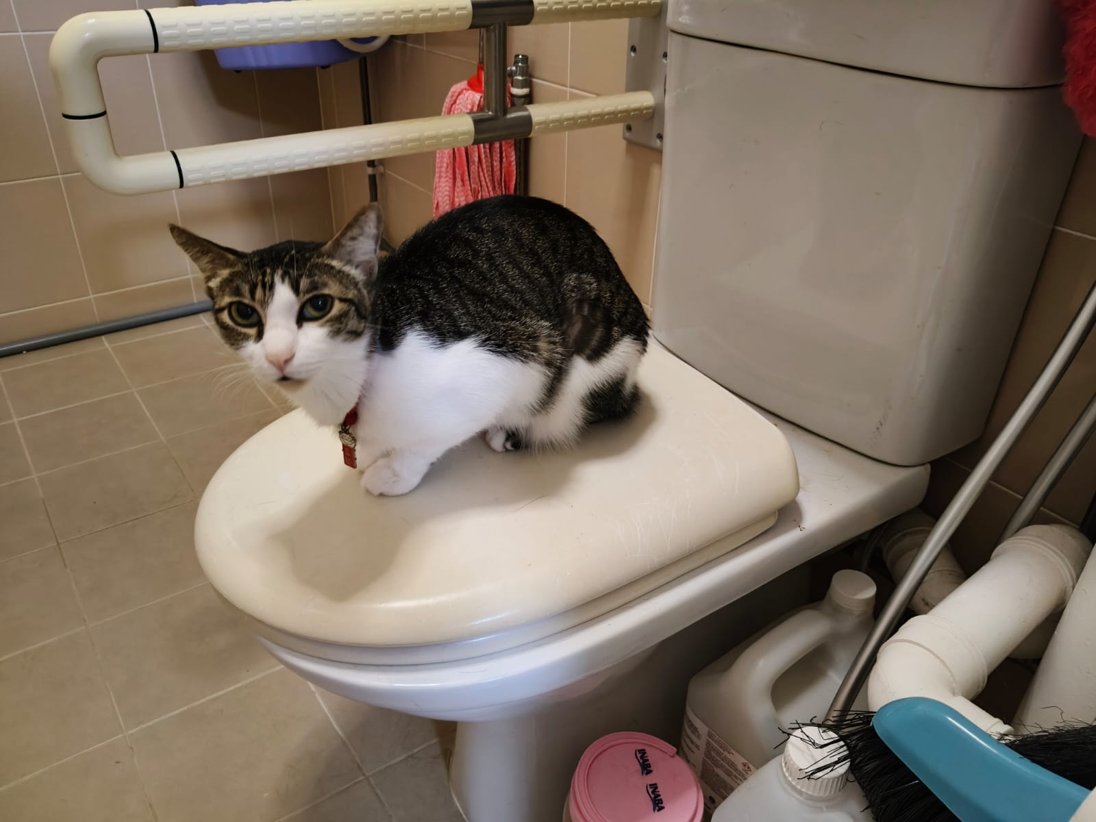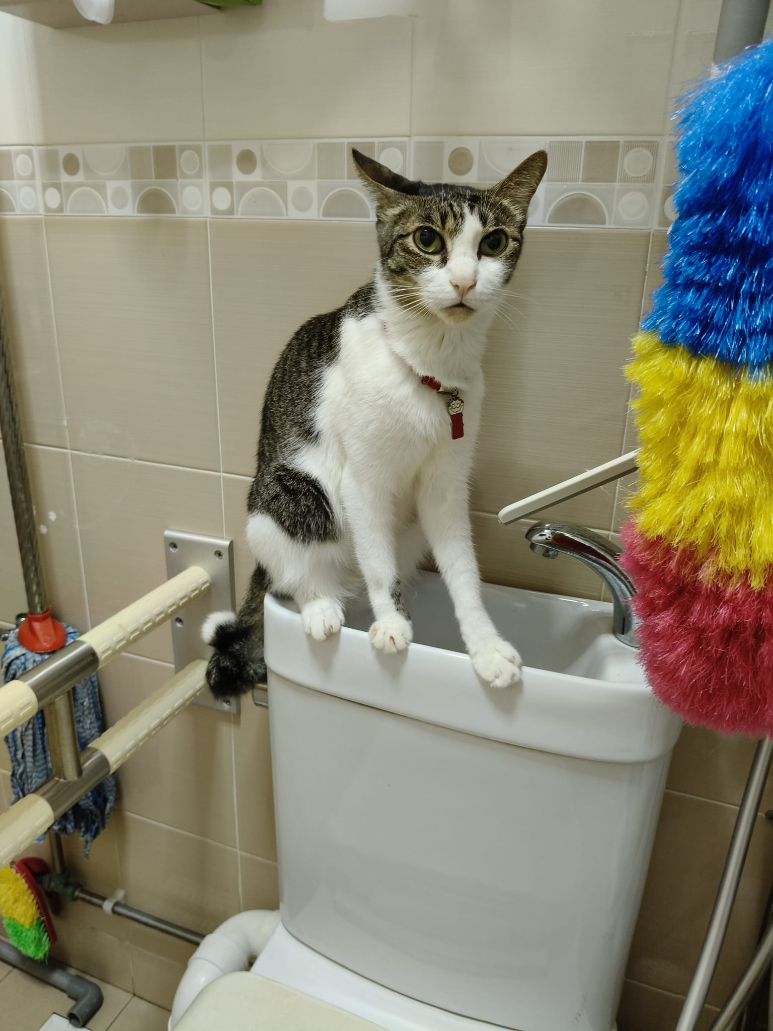 9.41am: told jo send me video and told her what mmm say. Jo:”He seem fine right now”. – video he seem ok also grooming on top of toilet bowl.
