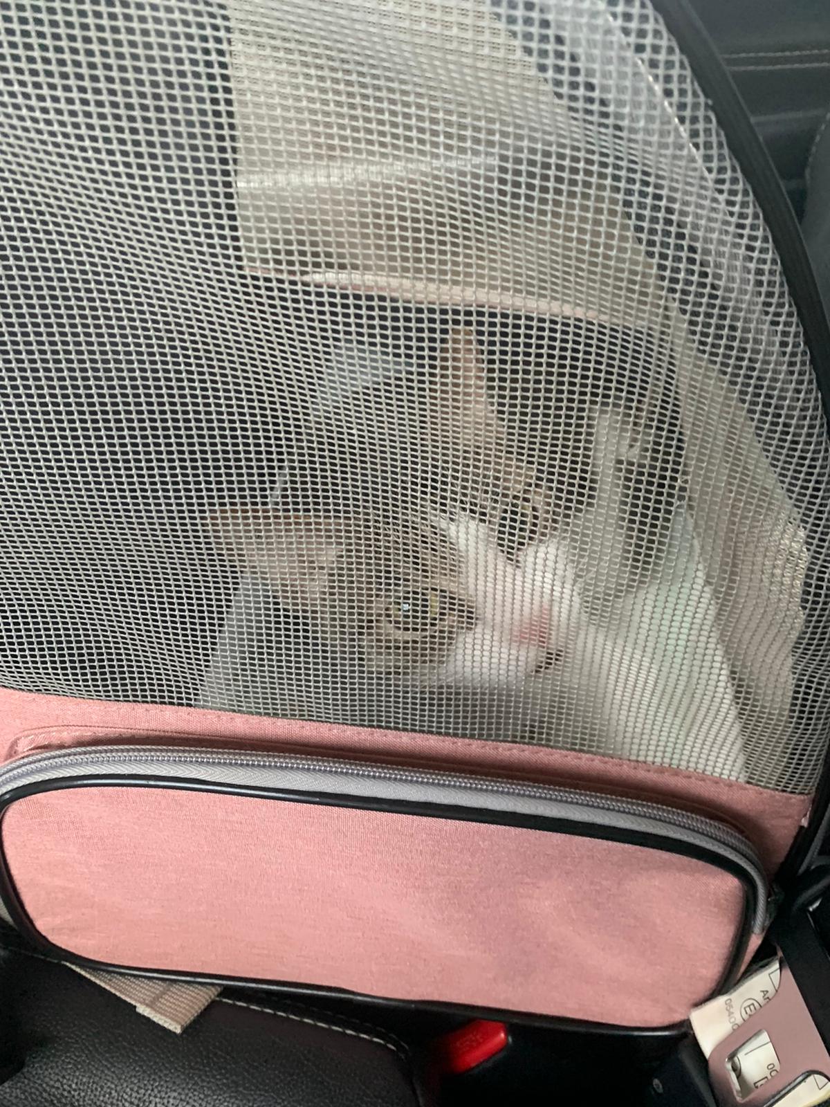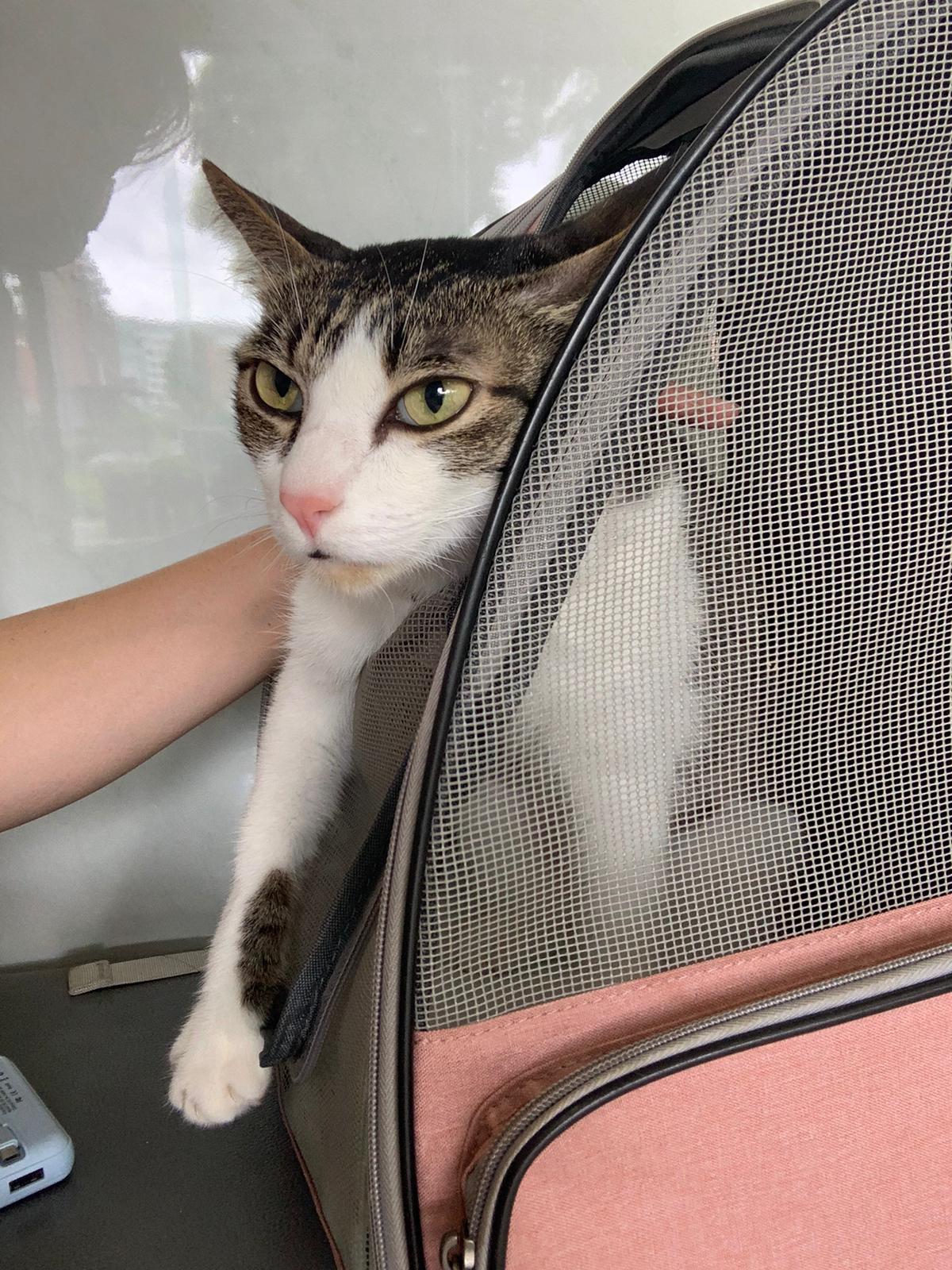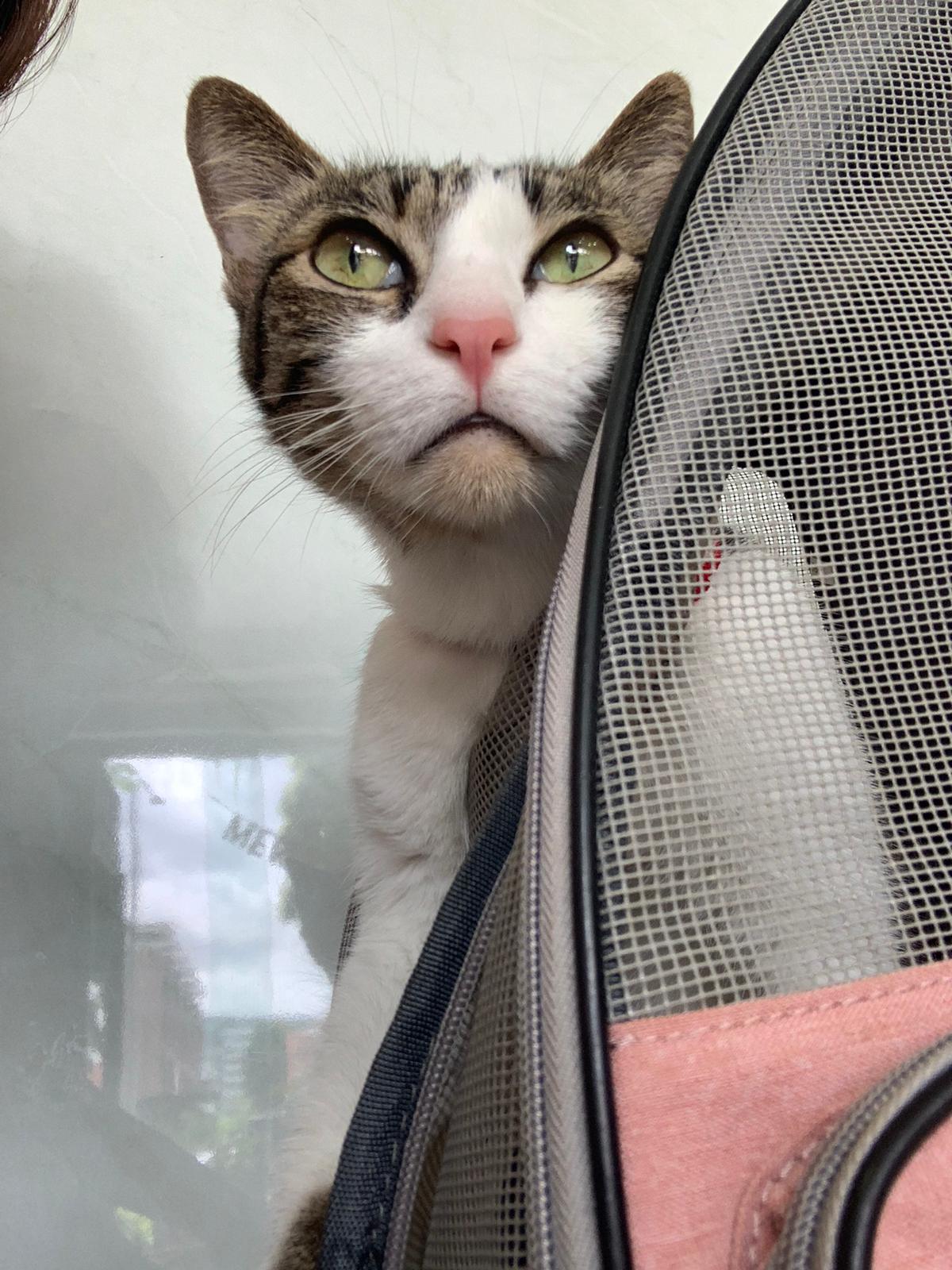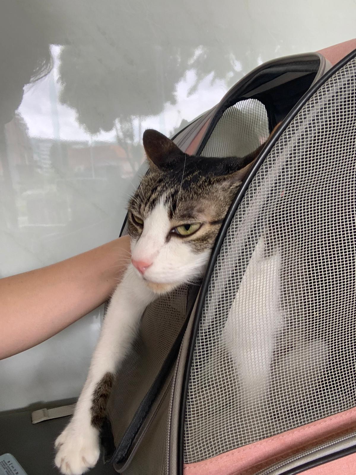 11.27am: ah boy is calm cos w me, he get out of bag to hug my shoulder. another new cat come into clinic. They really just keep letting the one w appts go in first even when they r late for their appt too, or earlier for their appt.