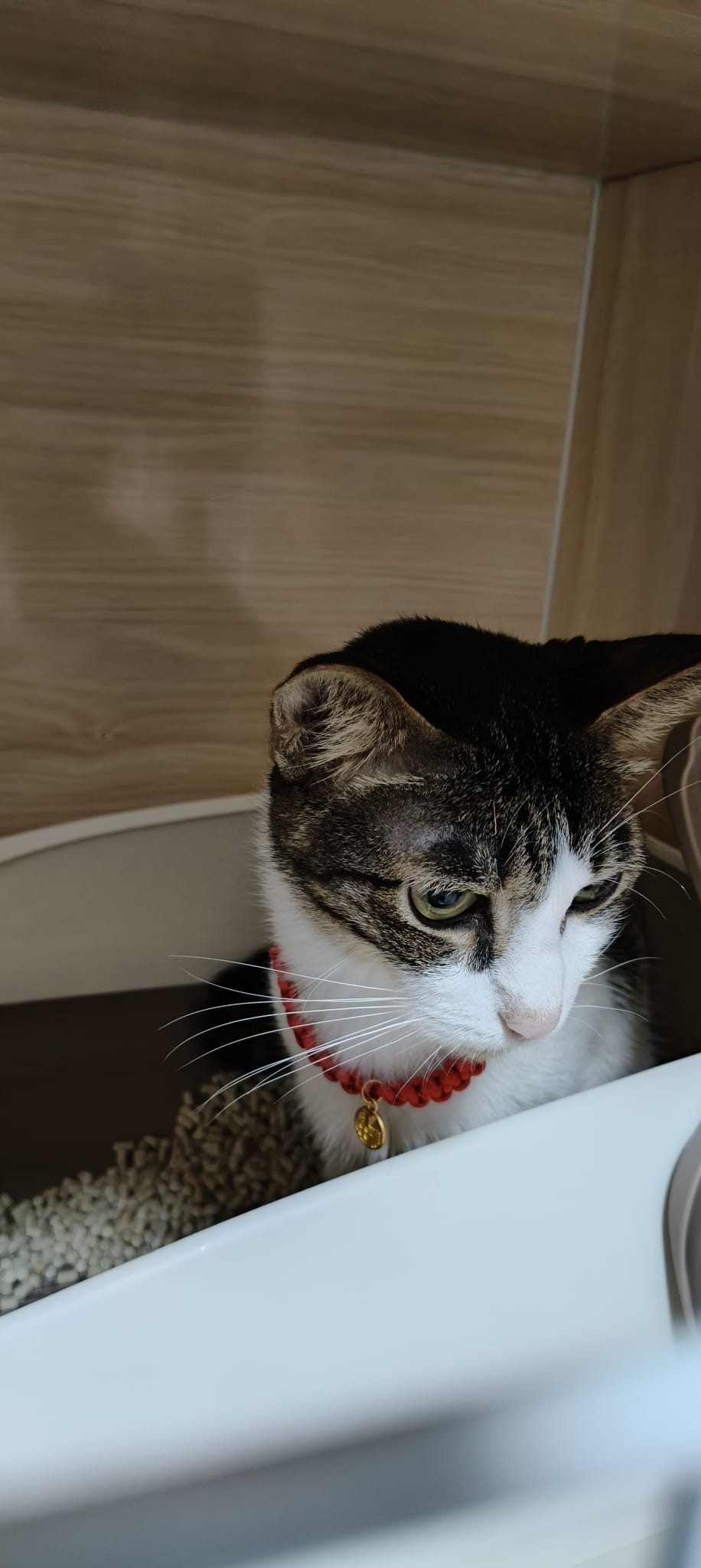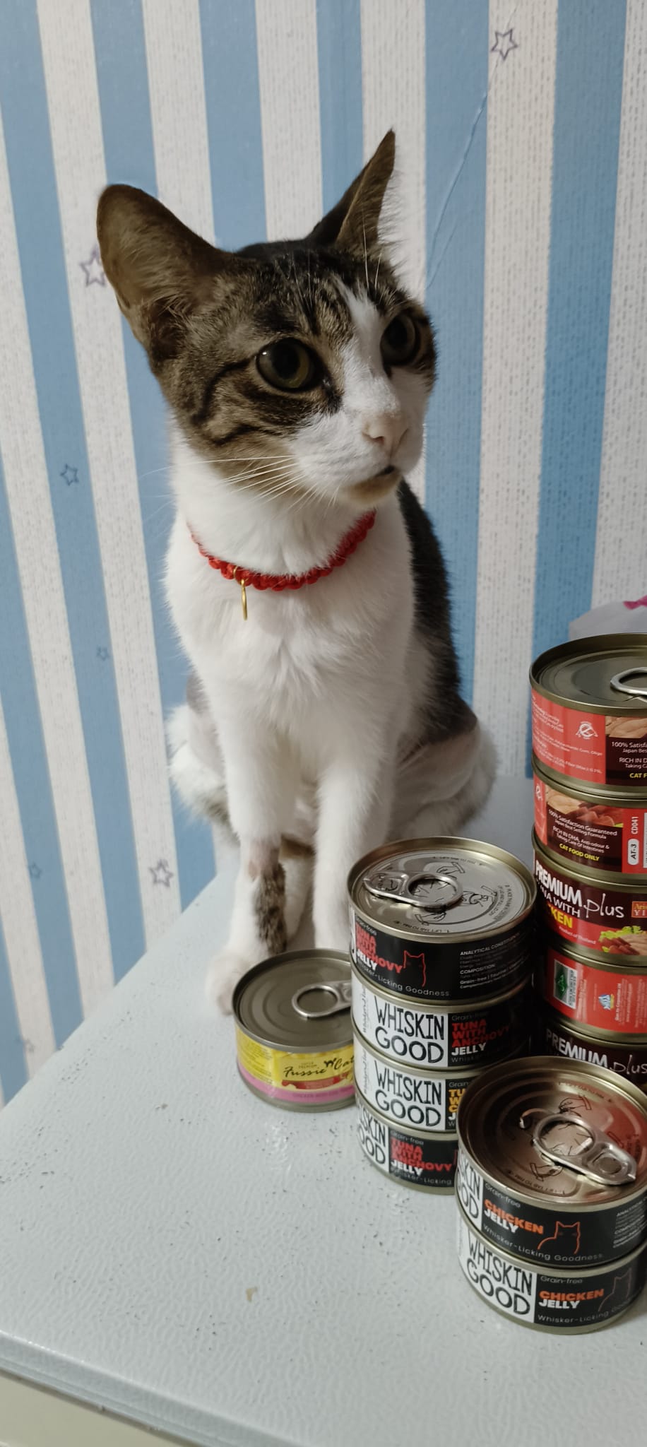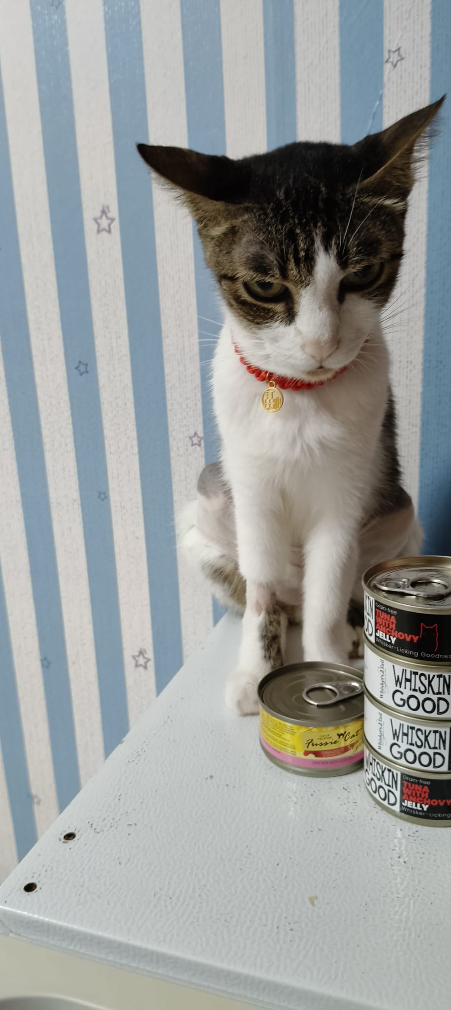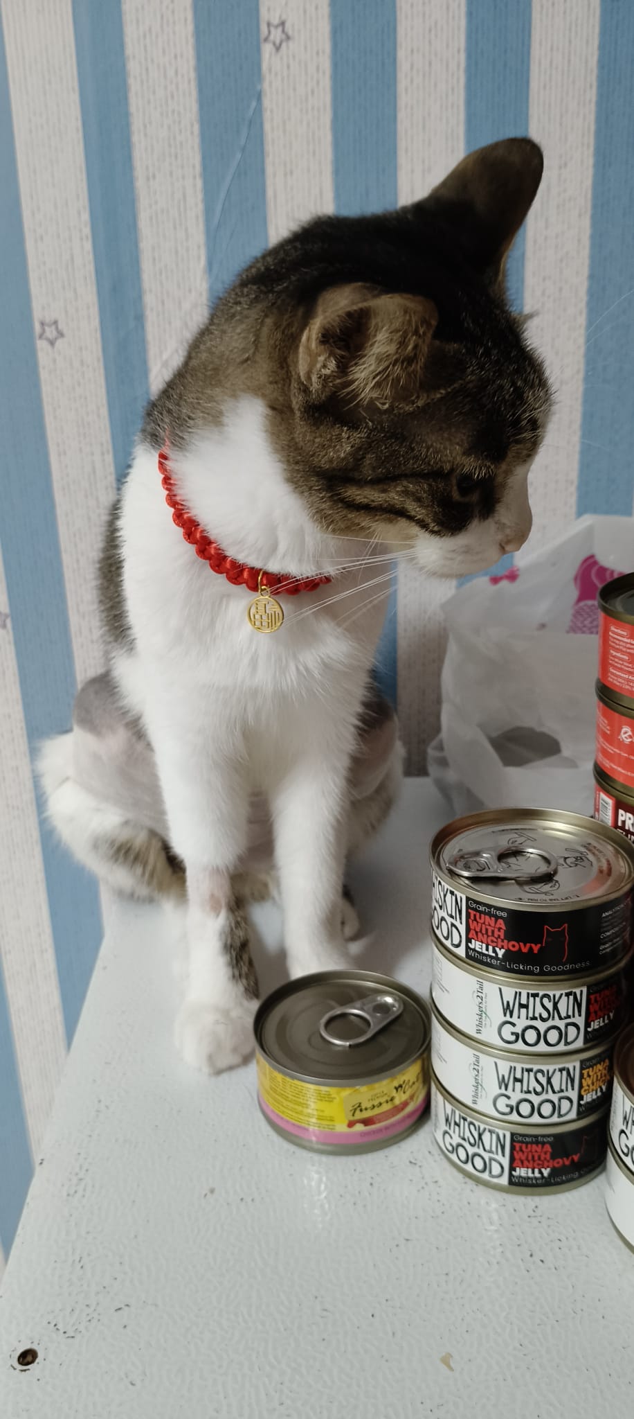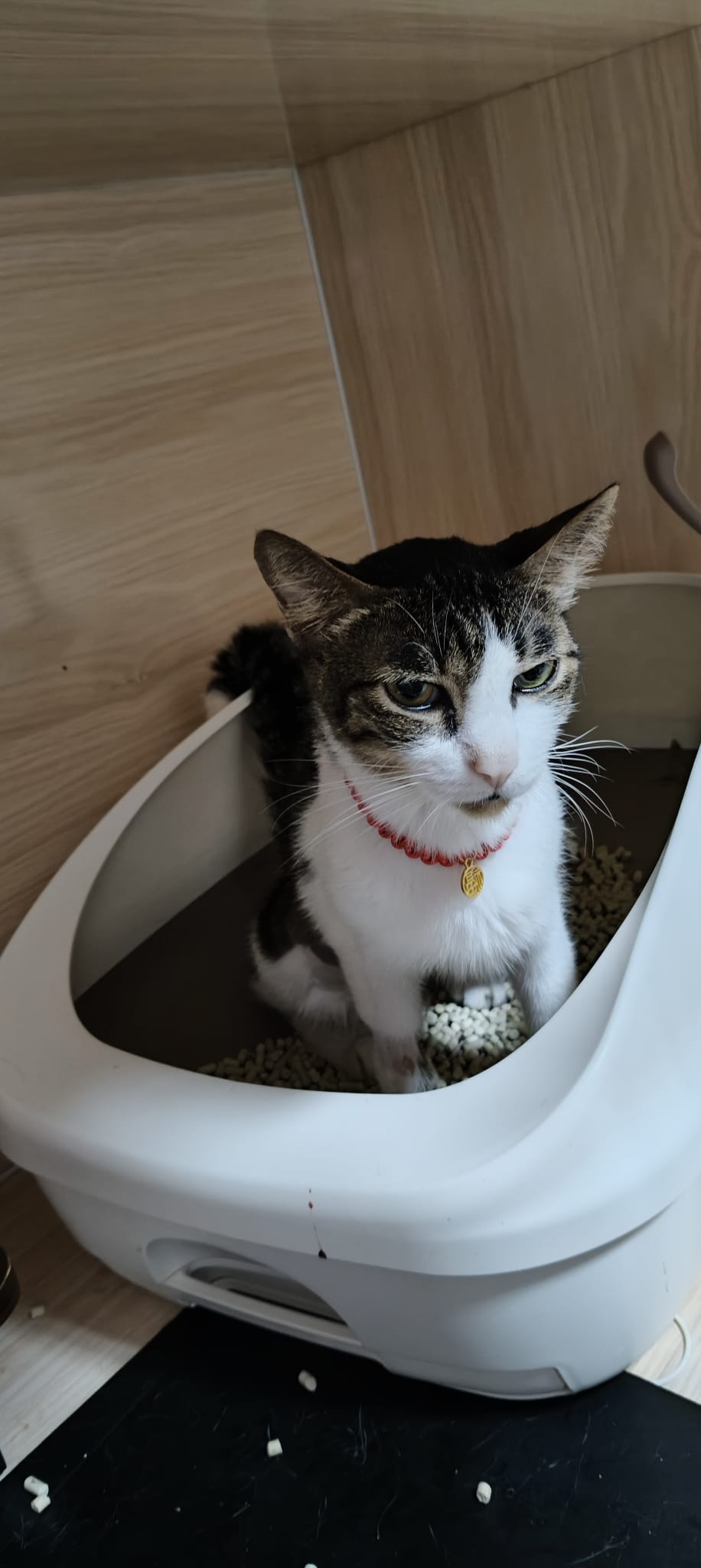 10.30am+: I go in and he dash out, carry him back. He go various bins got blood as usual. Got one point I empty out half ctn food n he step in to pee blood, got scolding by me cos the rest need to eat the food leh. When I “throw” him to the floor spray blood on the floor. Sayang him as usual. The box stain his blood also. Everyone serve tuna w white fish and ciao chicken fillet – he ate ok.