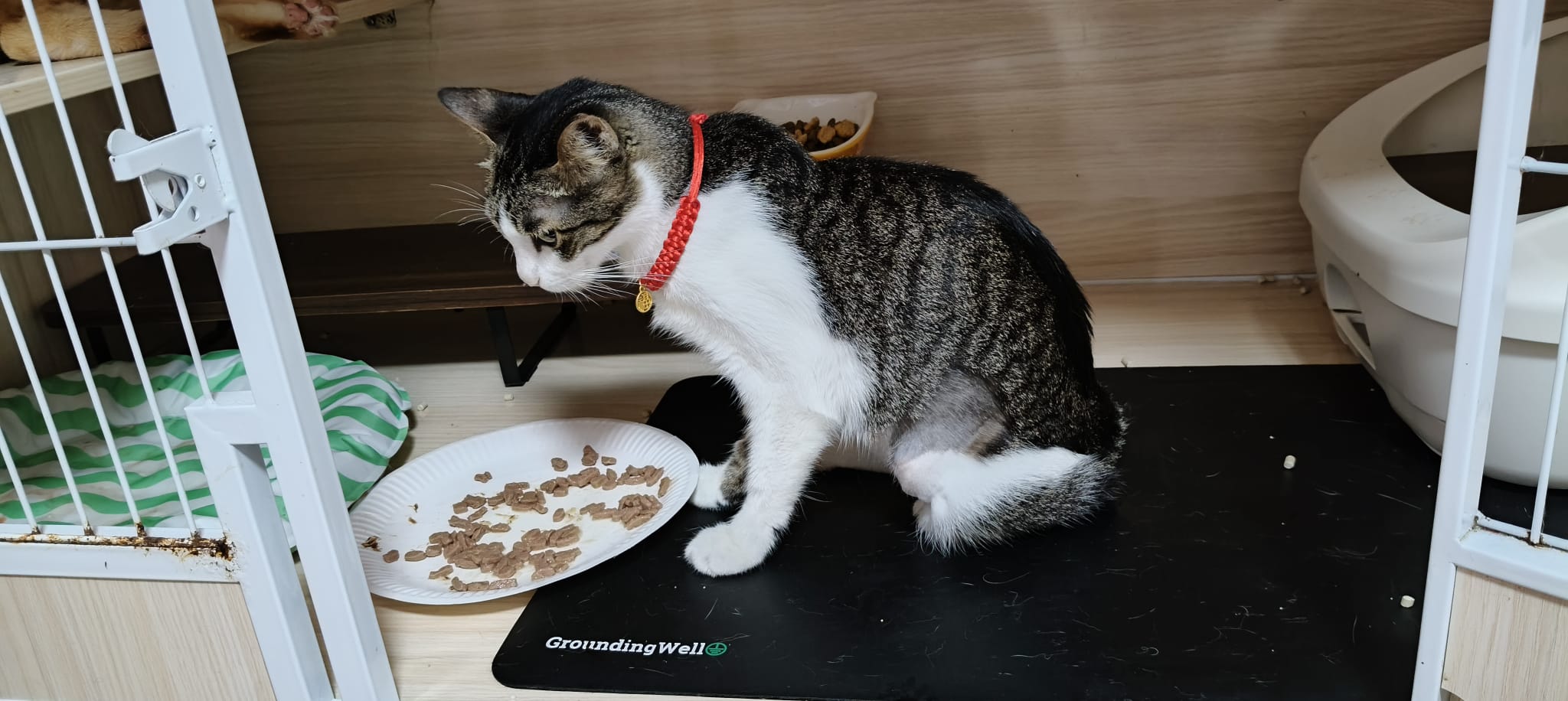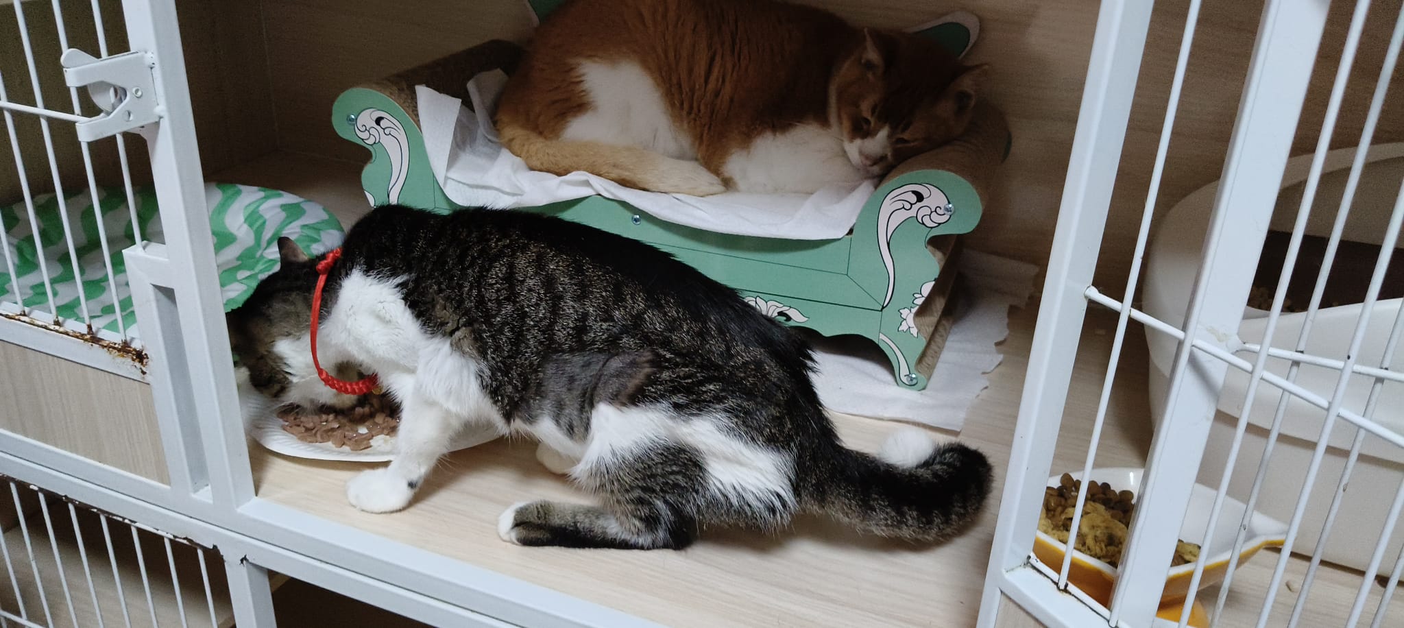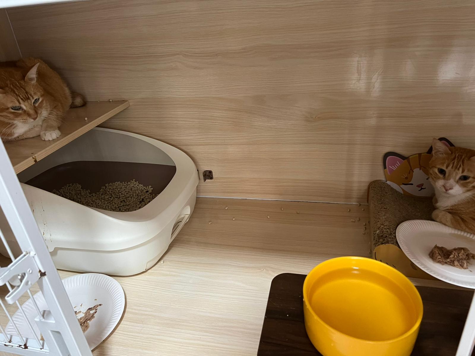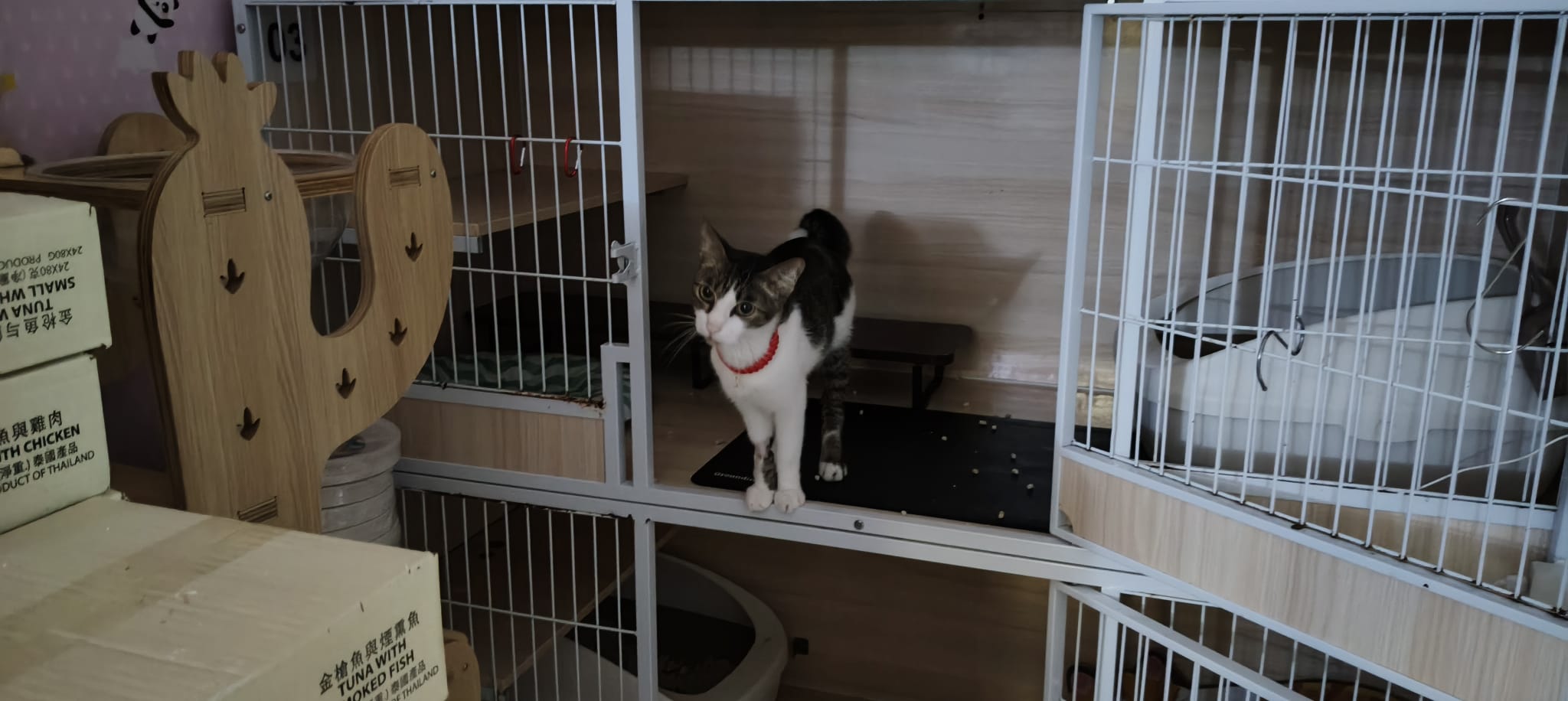 Since back to 猫房, he go multiple bins n did eat but eat little only. Breathing harder. He go back to cage on his own, all cages open.