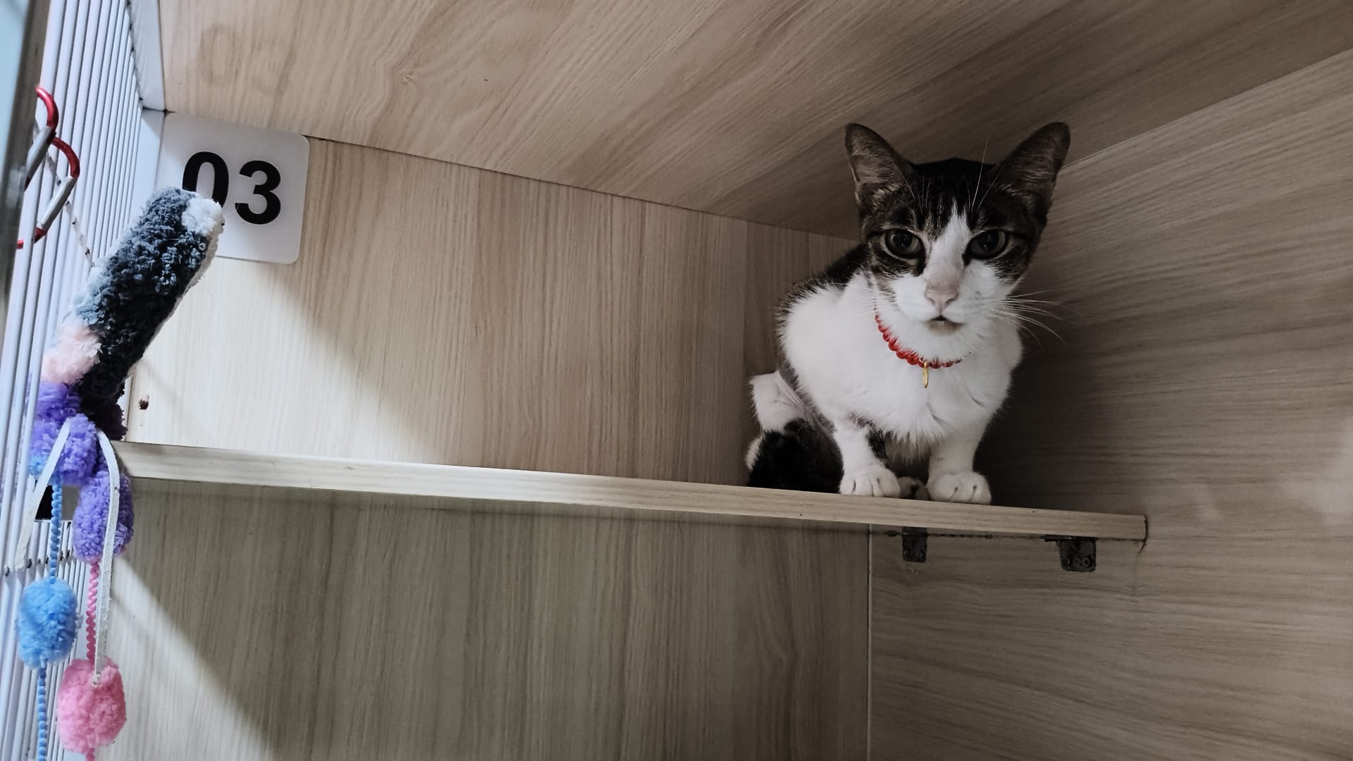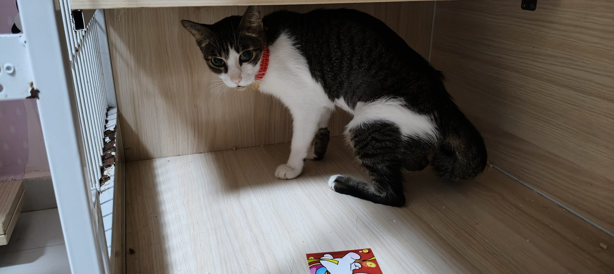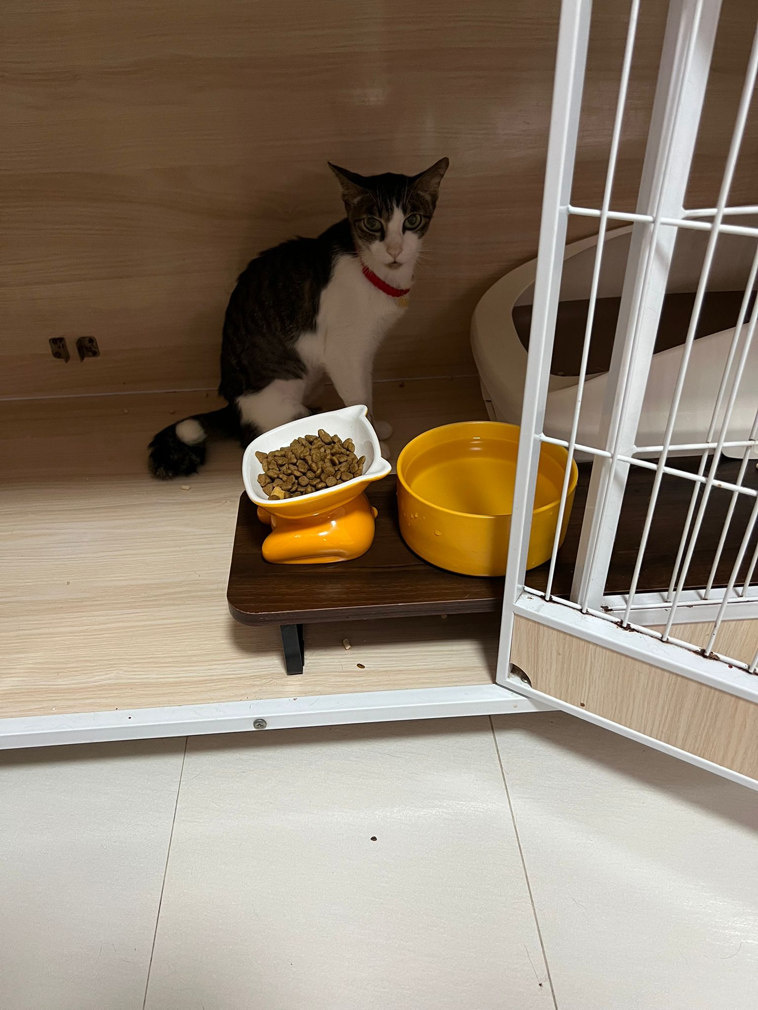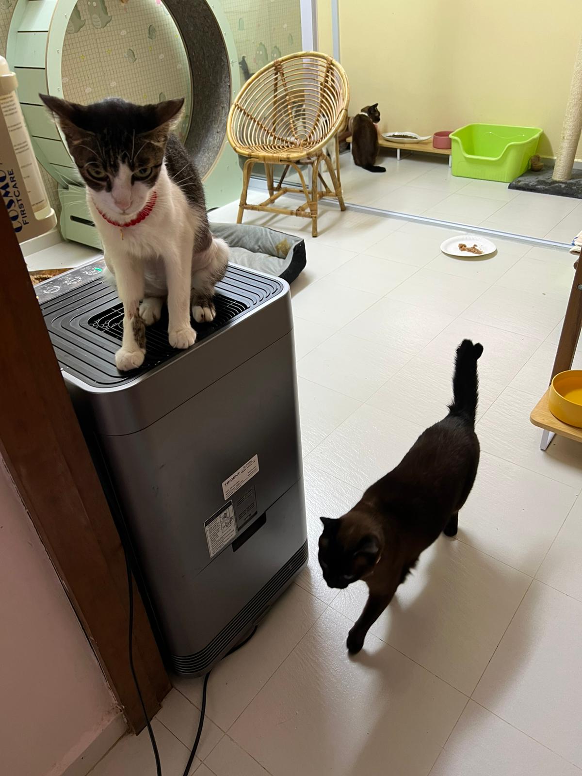 Since back to 猫房, he go multiple bins n did eat but eat little only. Breathing harder. He go back to cage on his own, all cages open.