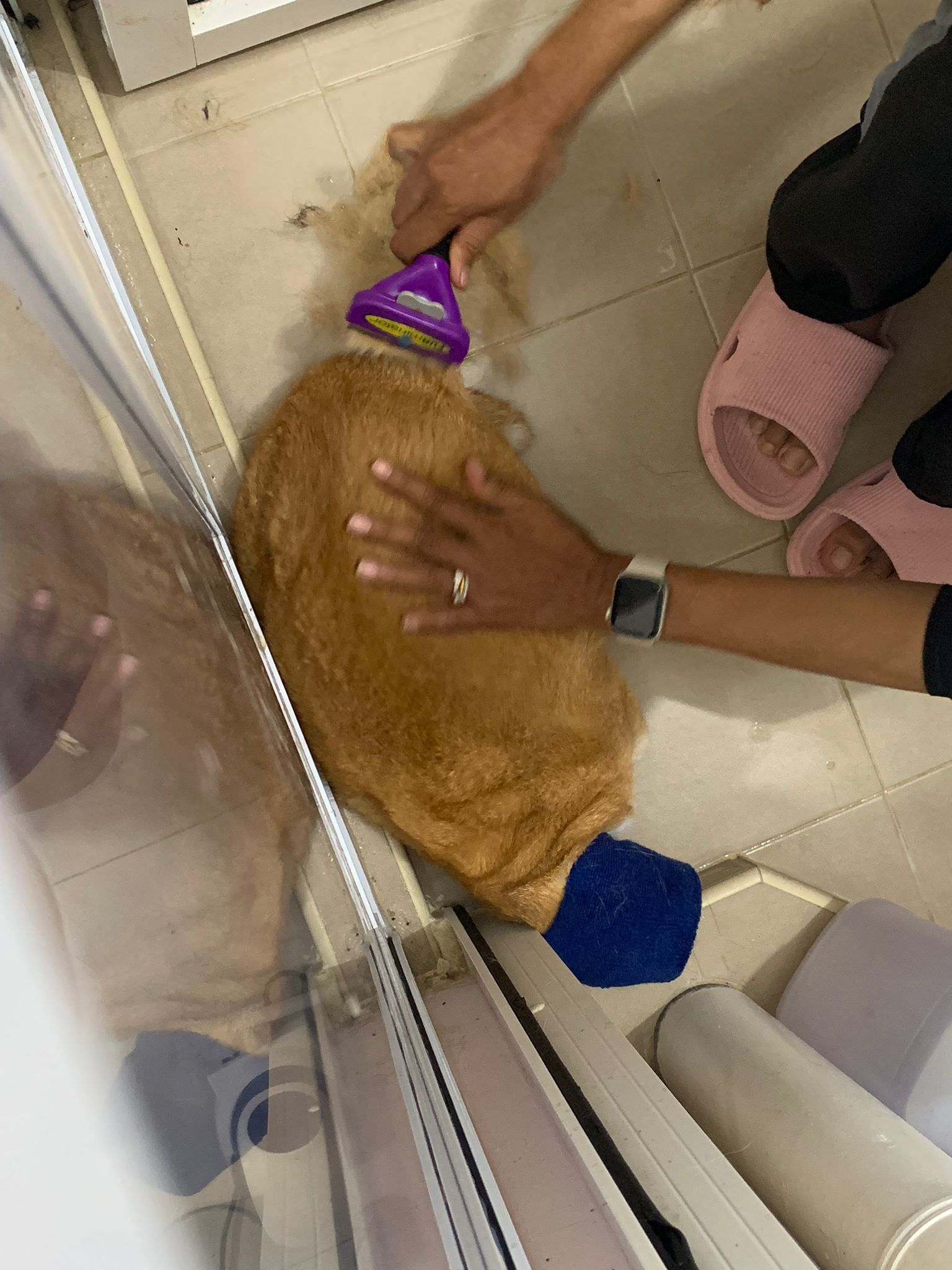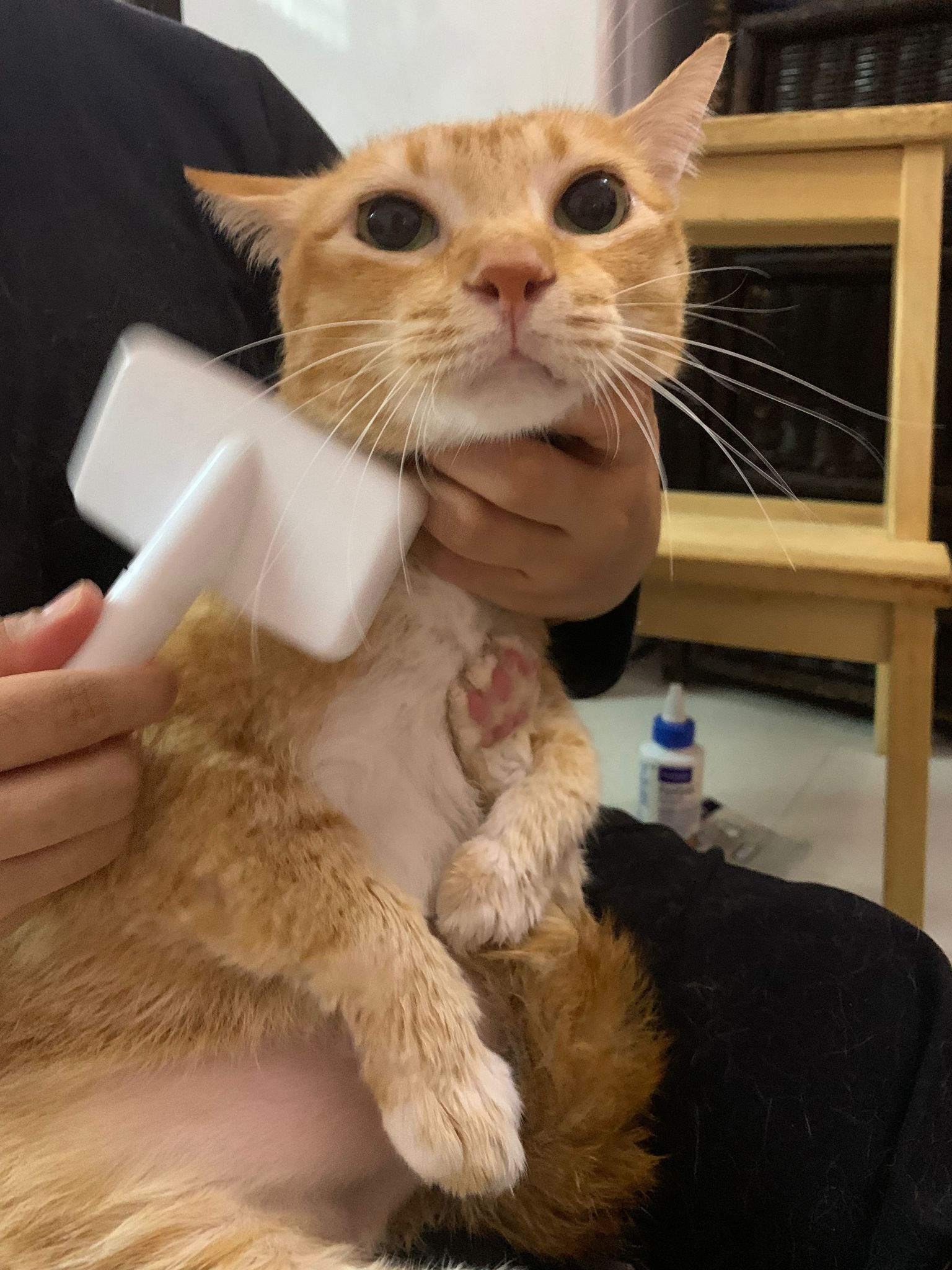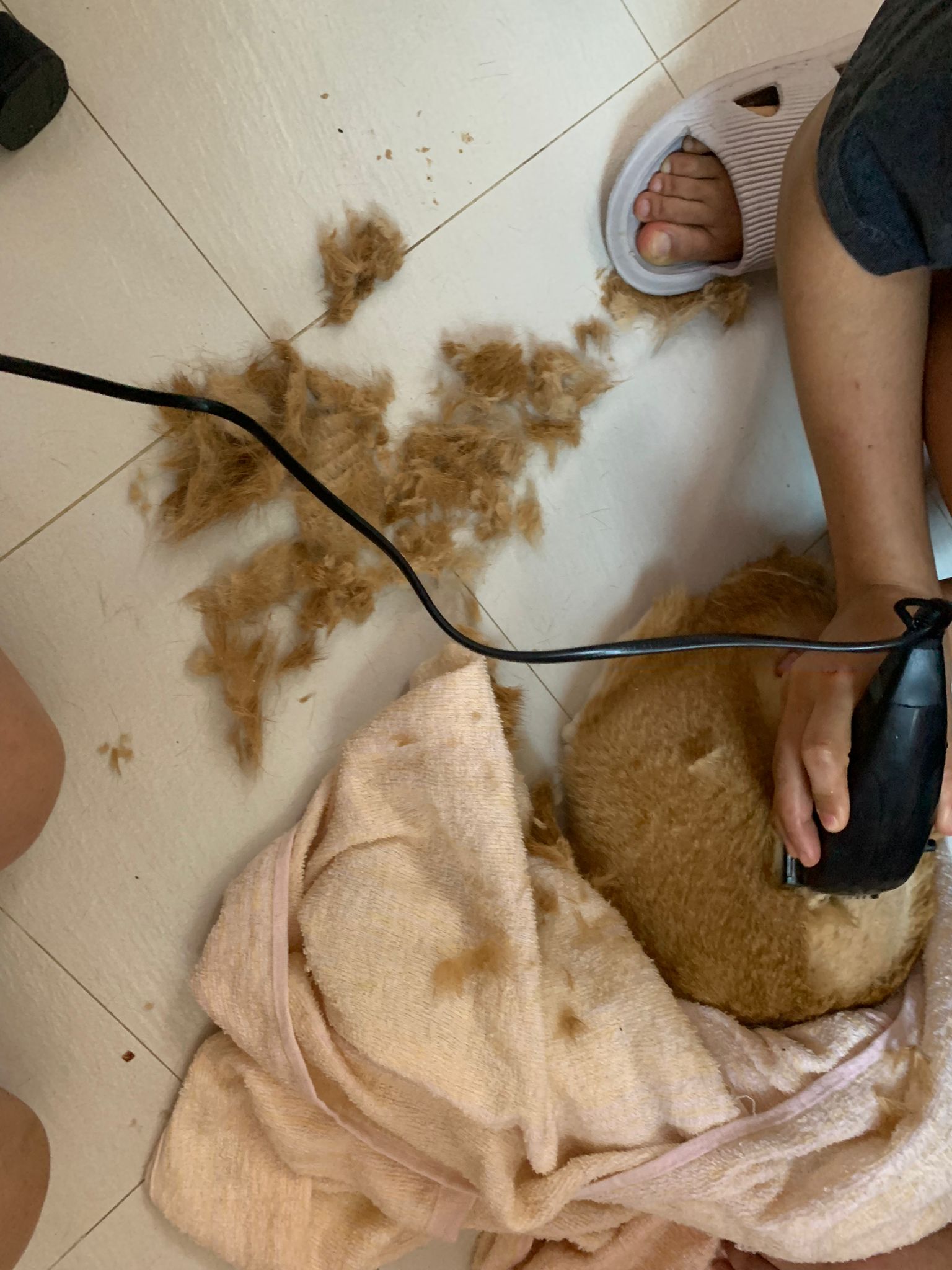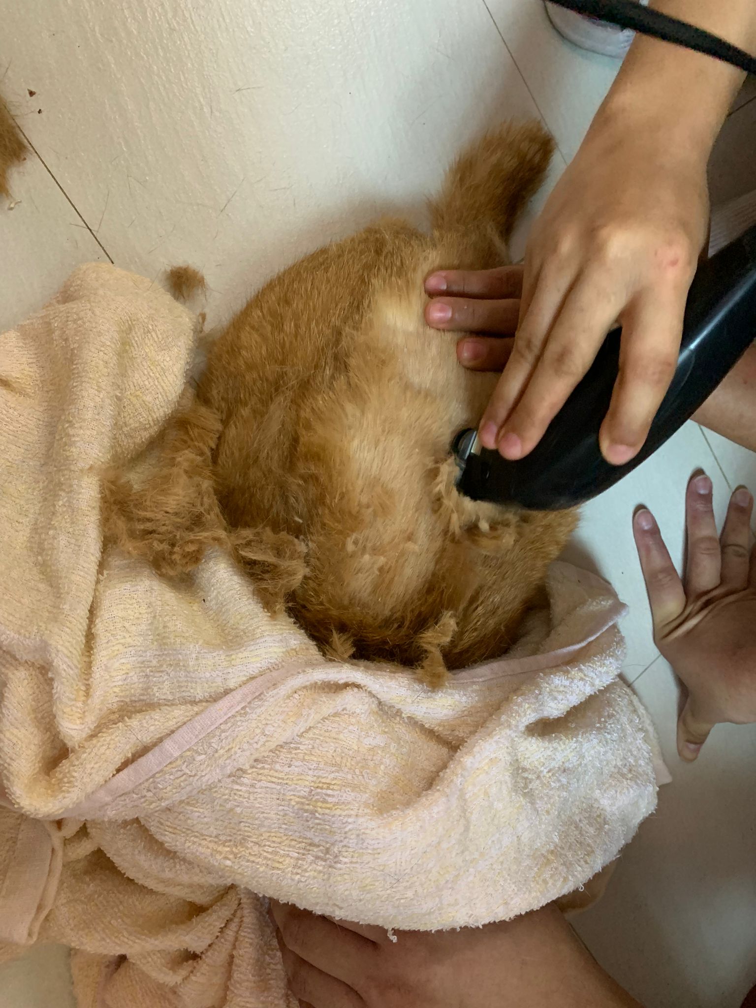 12pm+: told groomer amber pattern n she can sayang her front n head for a while then she run, n amber panic le. But still manage to hug her go grooming. Nails cut easy. Ears dirty, hind leg almost ingrowth le. Her same butt area matted not as bad as last time. Degrease for sure. Today amber will be ultra pretty!