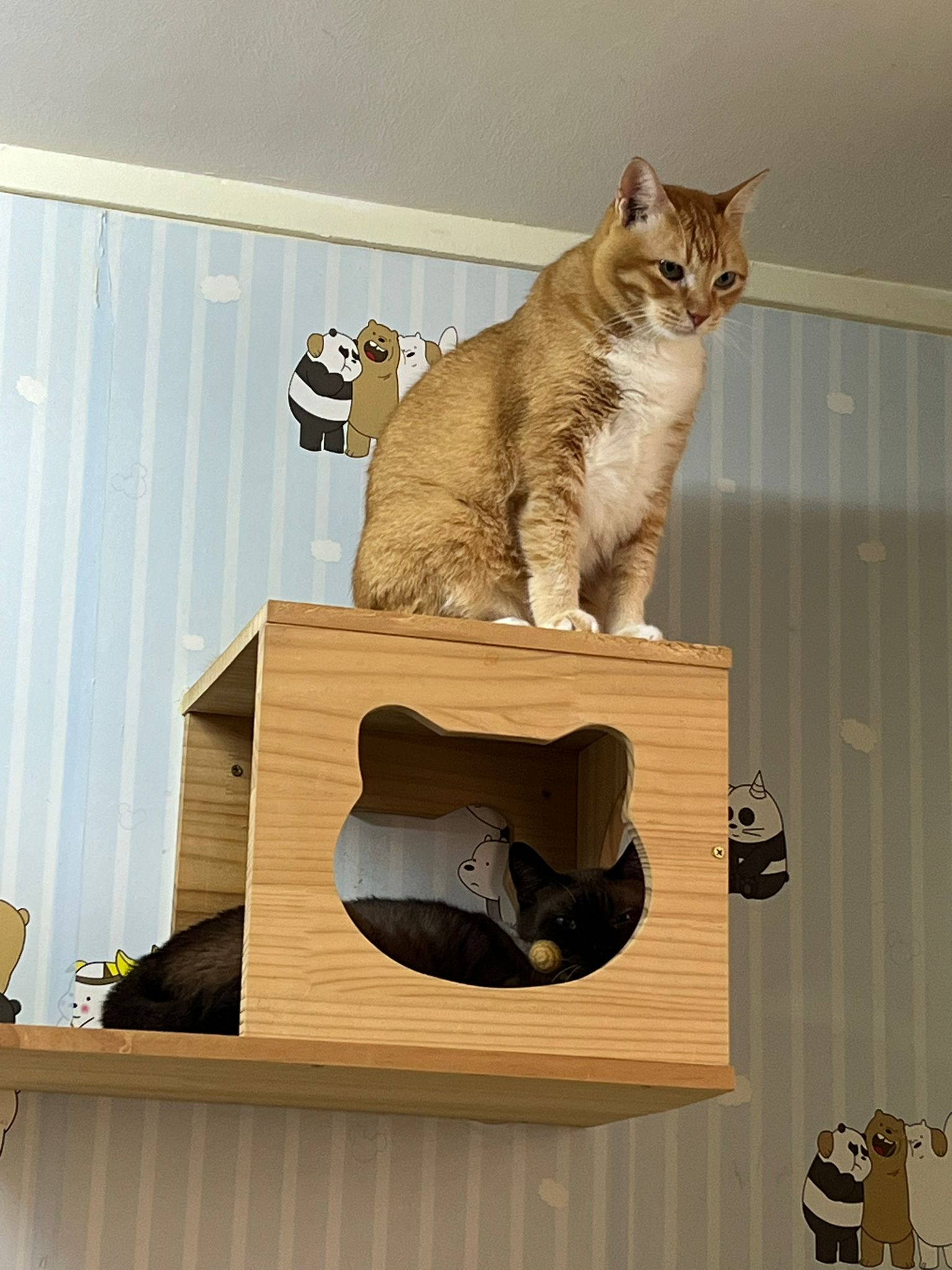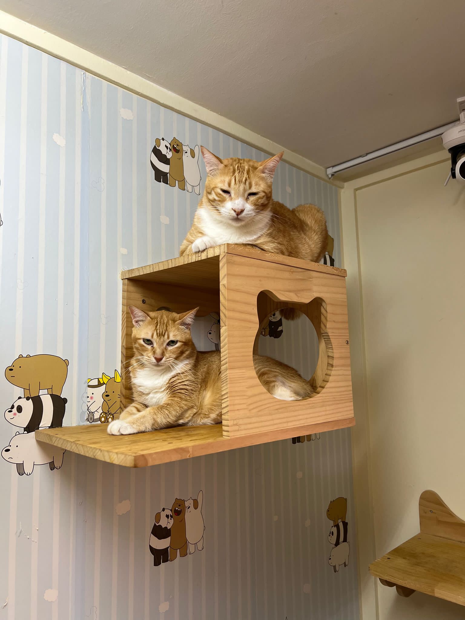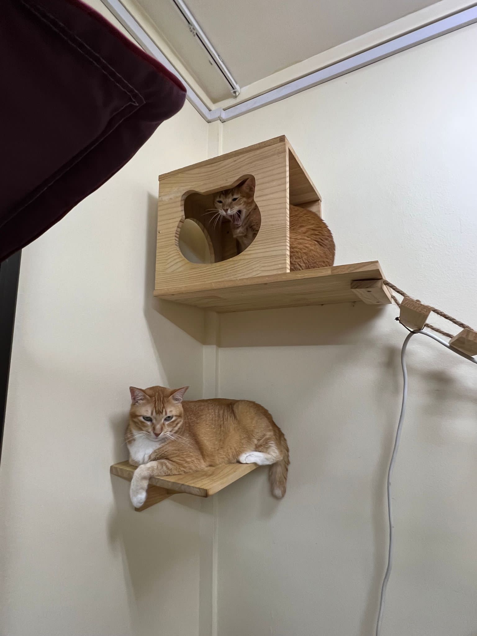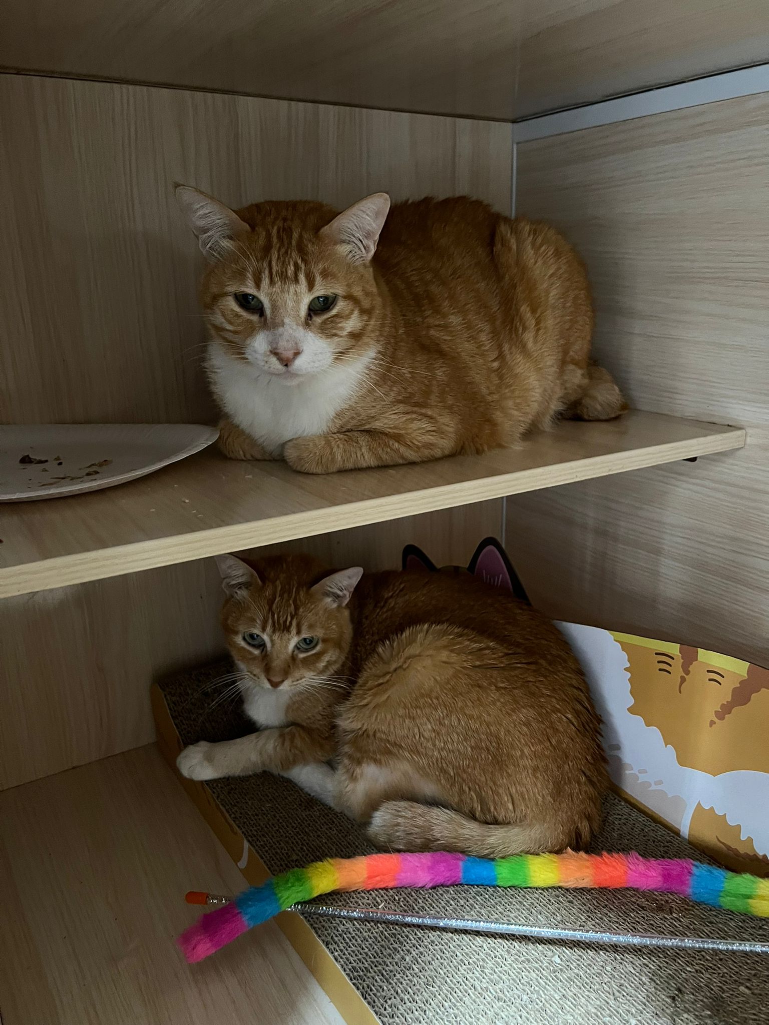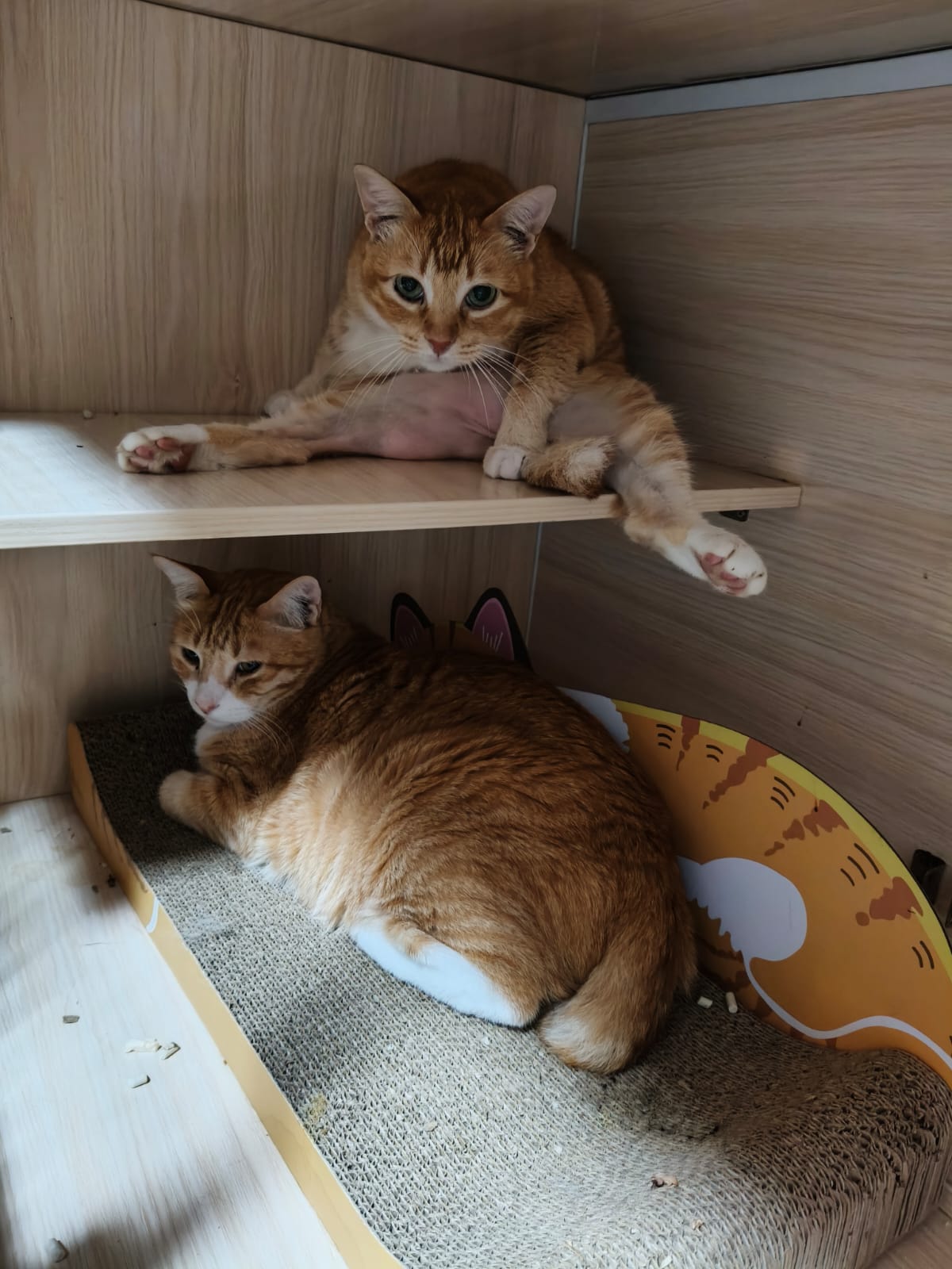 • insist on squeezing w dusty on the cat platform w dusty angry n hissing, but end up both girls calm down and rest tgt laze ard