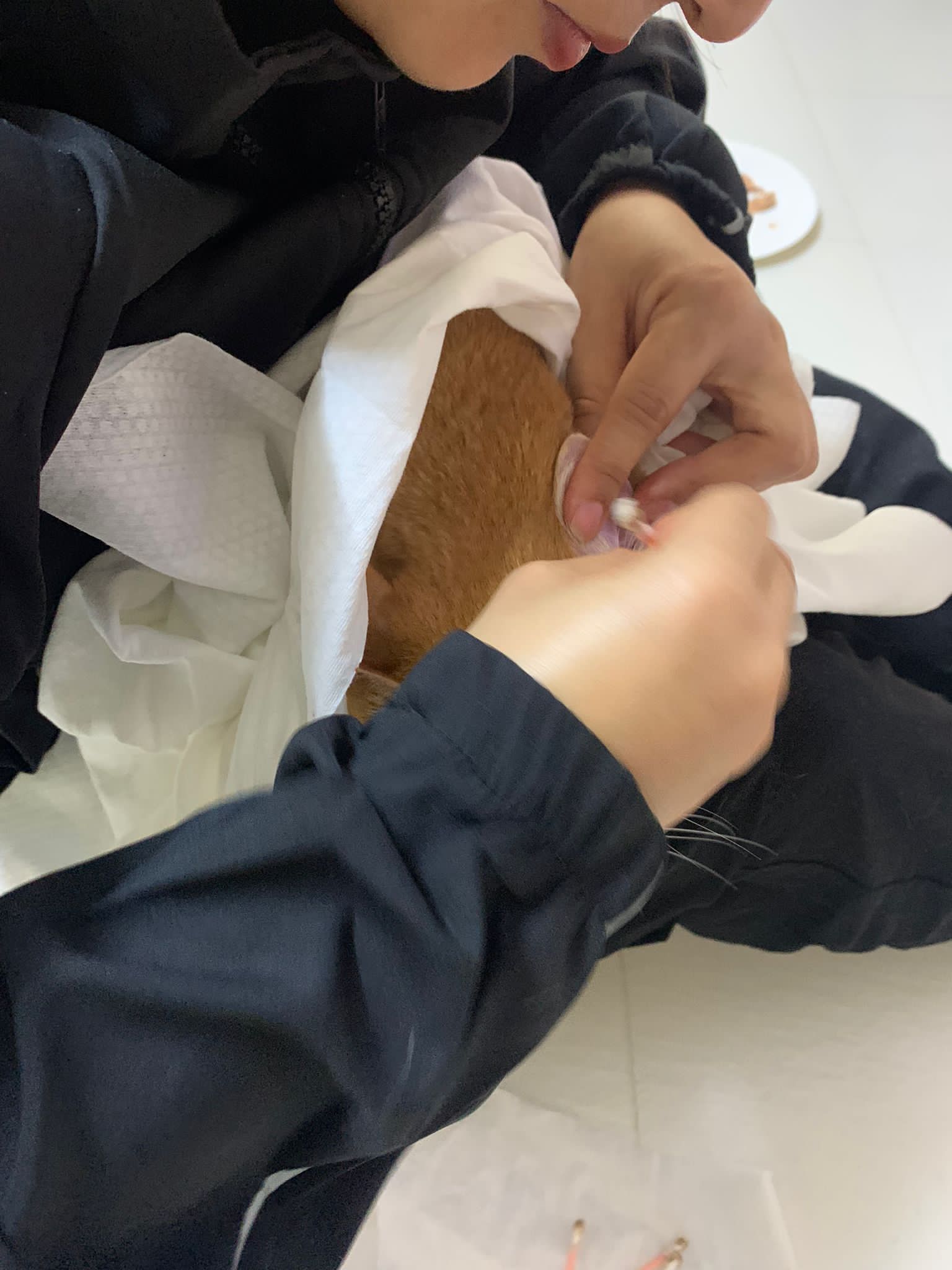130pm: back to safe room, she got 2 bandages on her 2 hind legs.
