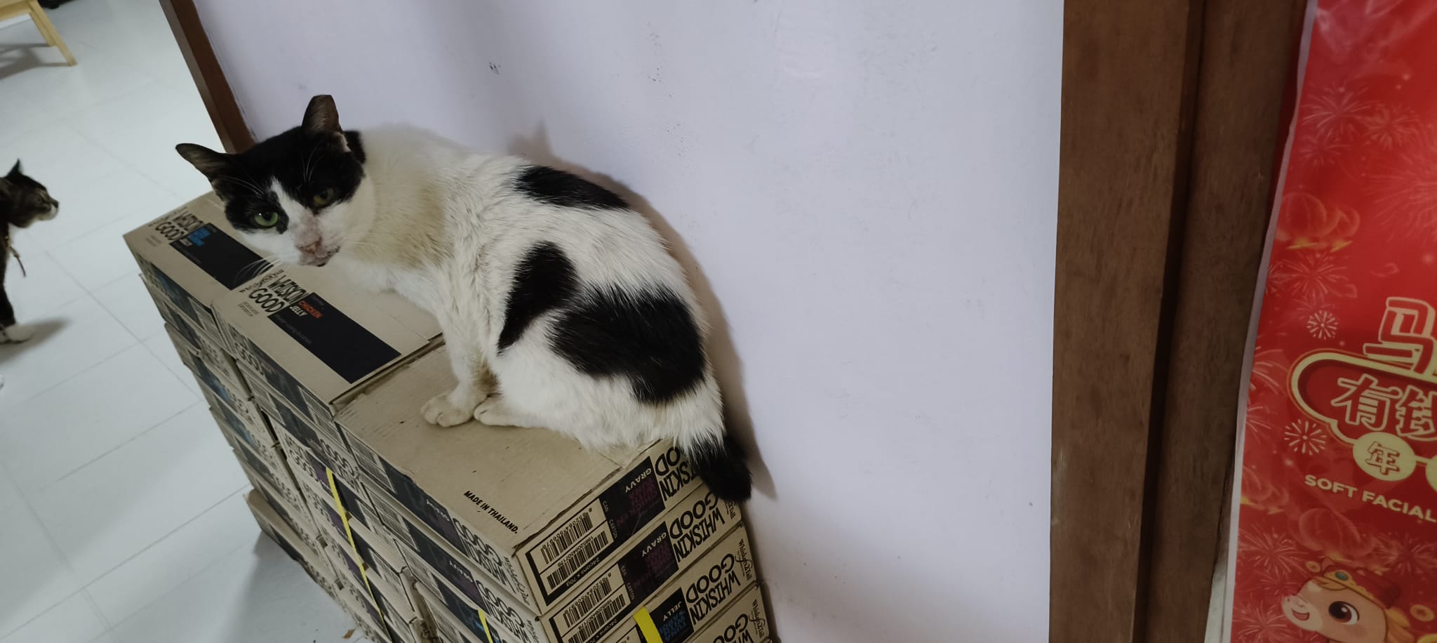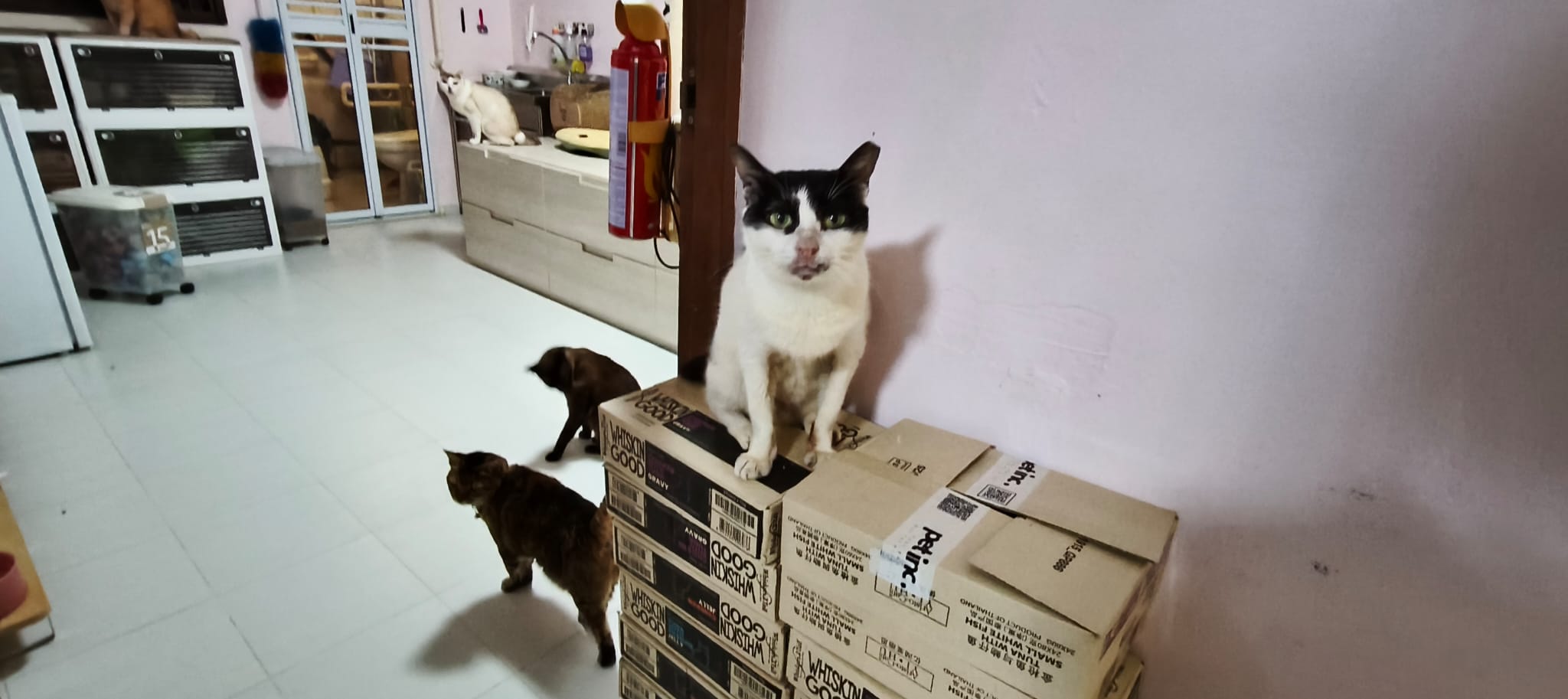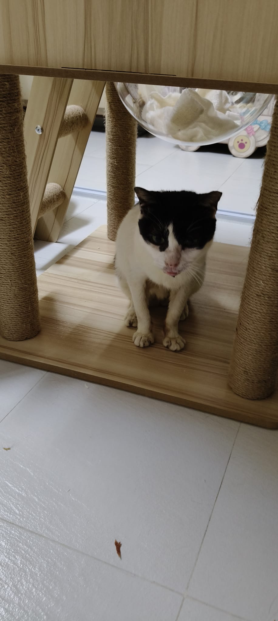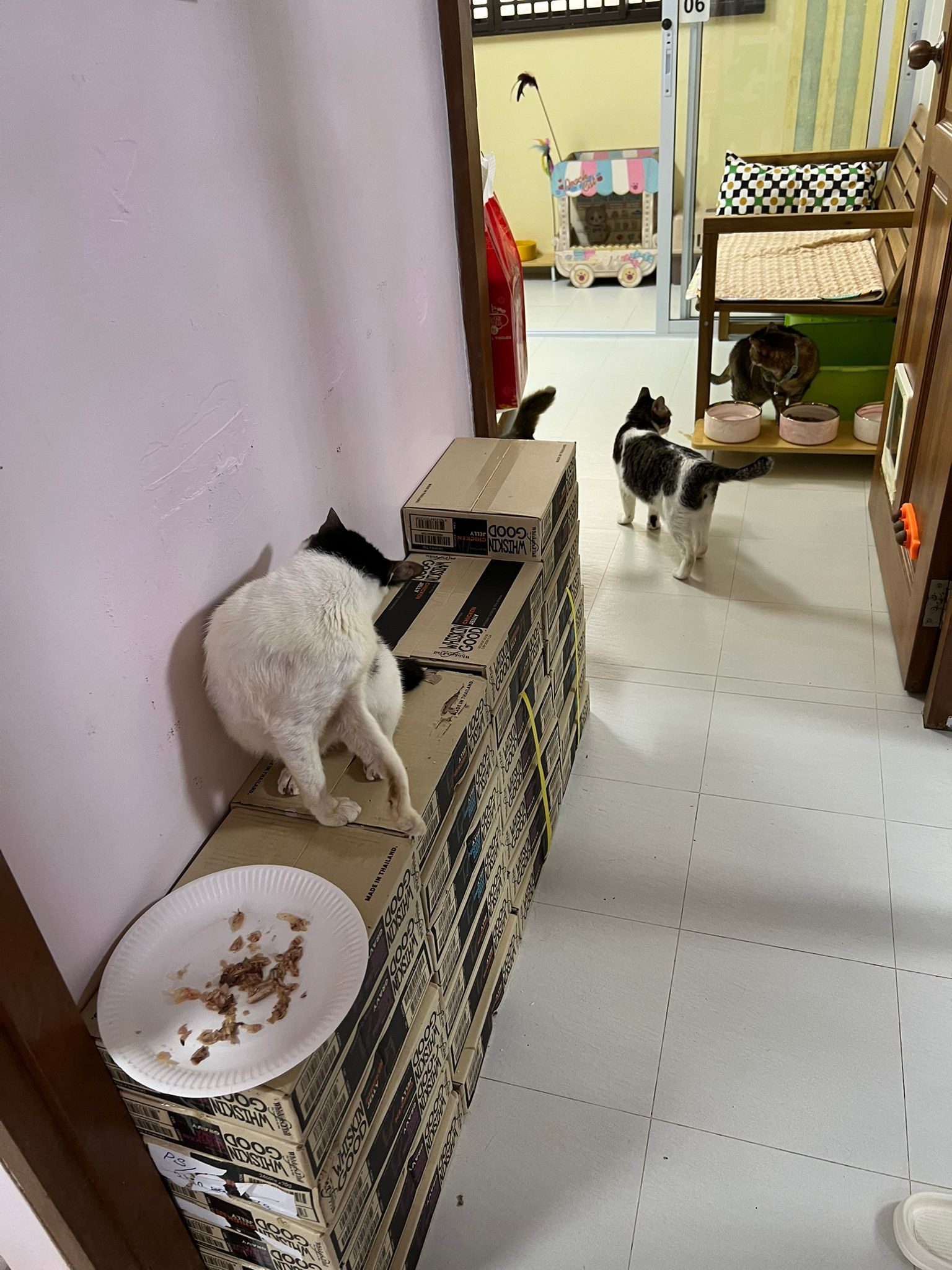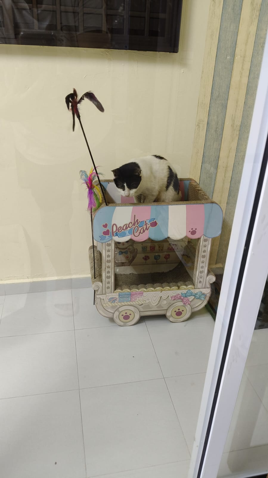 11.00am: enter 猫房 – Bai hide in the catnip toy, I sayang clean her eye, she want whack me. I sayang her neck again. – check: 9.30am jo in she alr hide here but she did come out to eat on the floor. She got sit on top of the ctn food