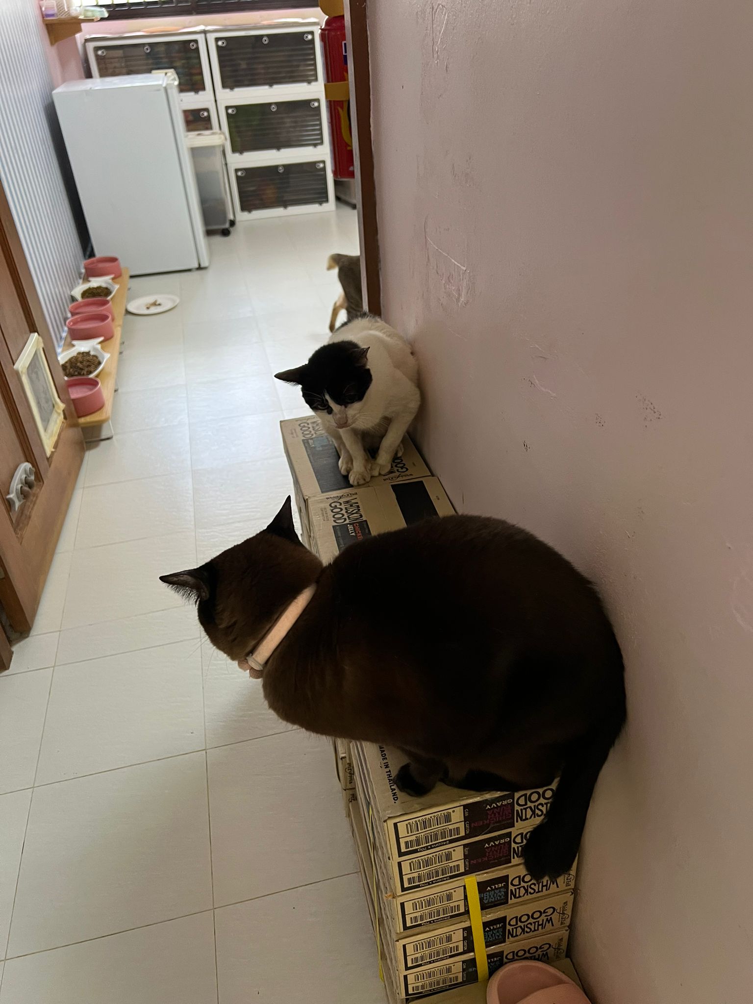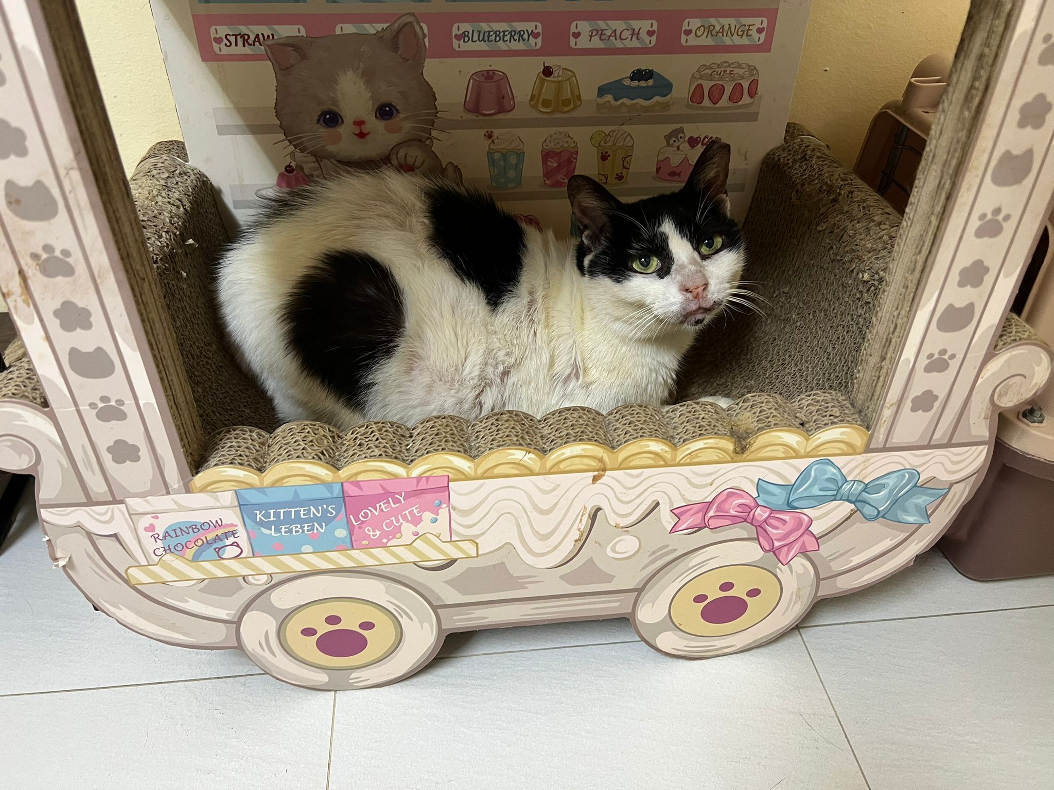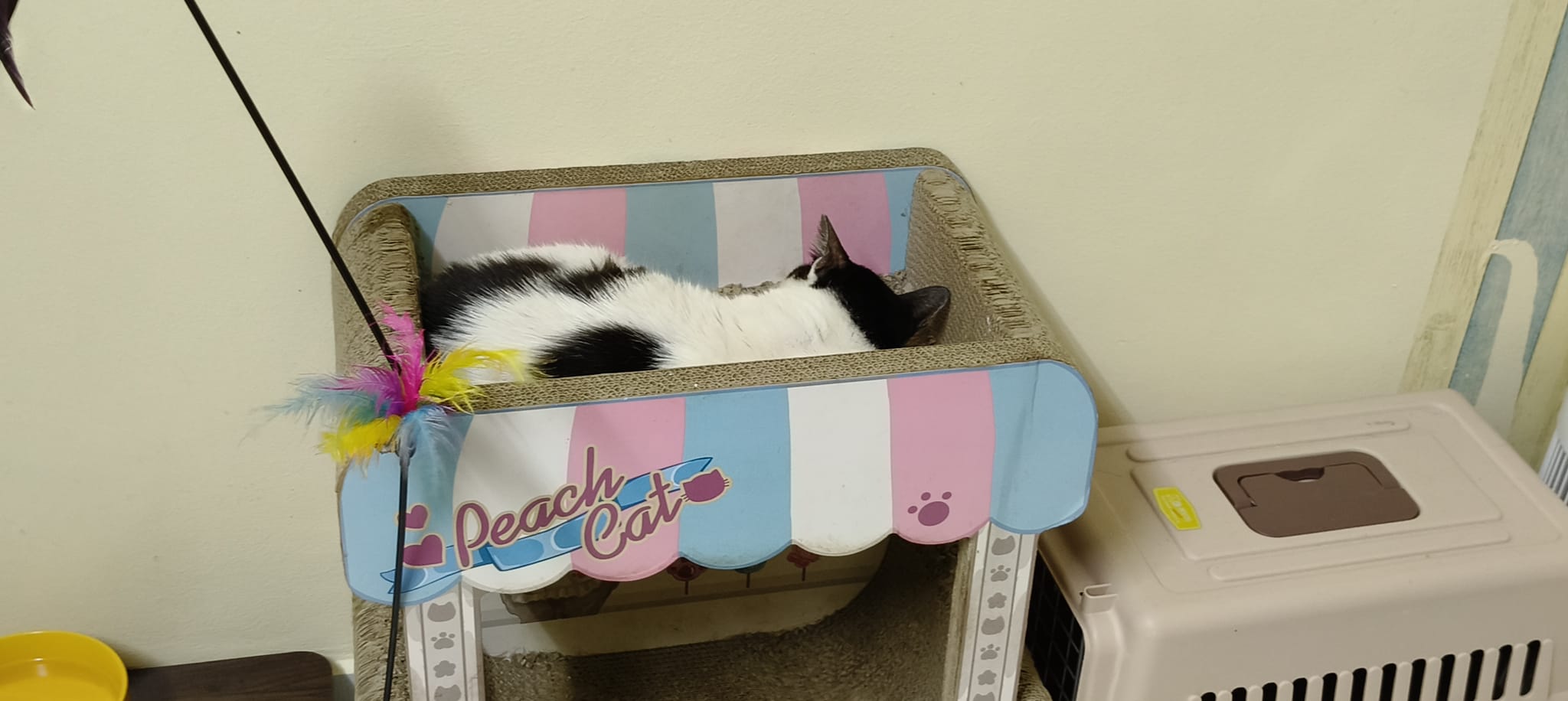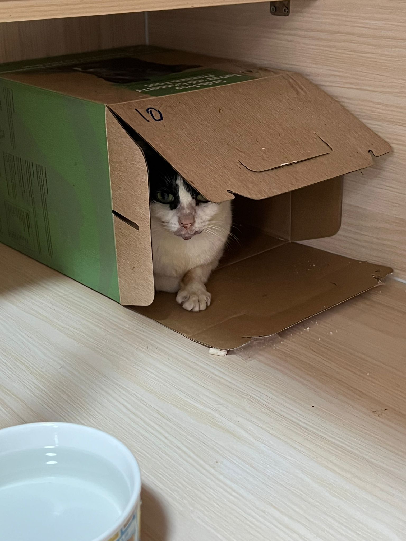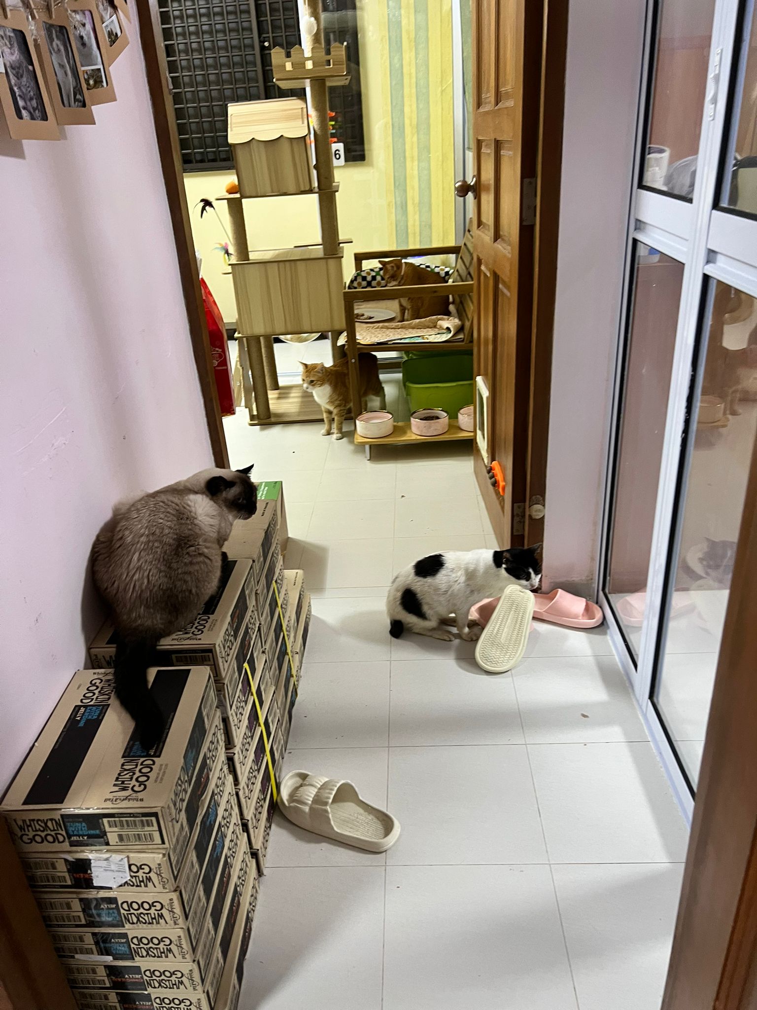 11.00am: enter 猫房 – Bai hide in the catnip toy, I sayang clean her eye, she want whack me. I sayang her neck again. – check: 9.30am jo in she alr hide here but she did come out to eat on the floor. She got sit on top of the ctn food