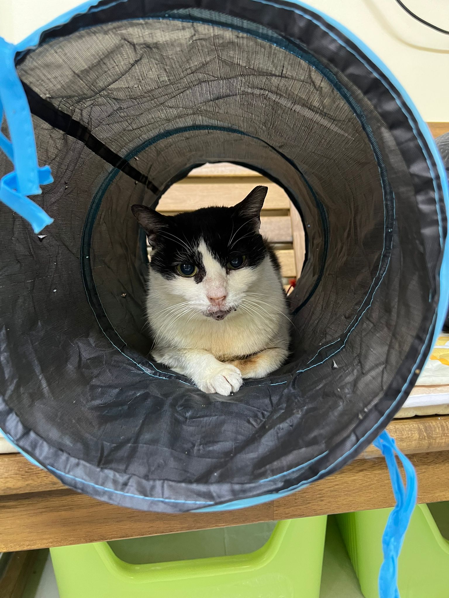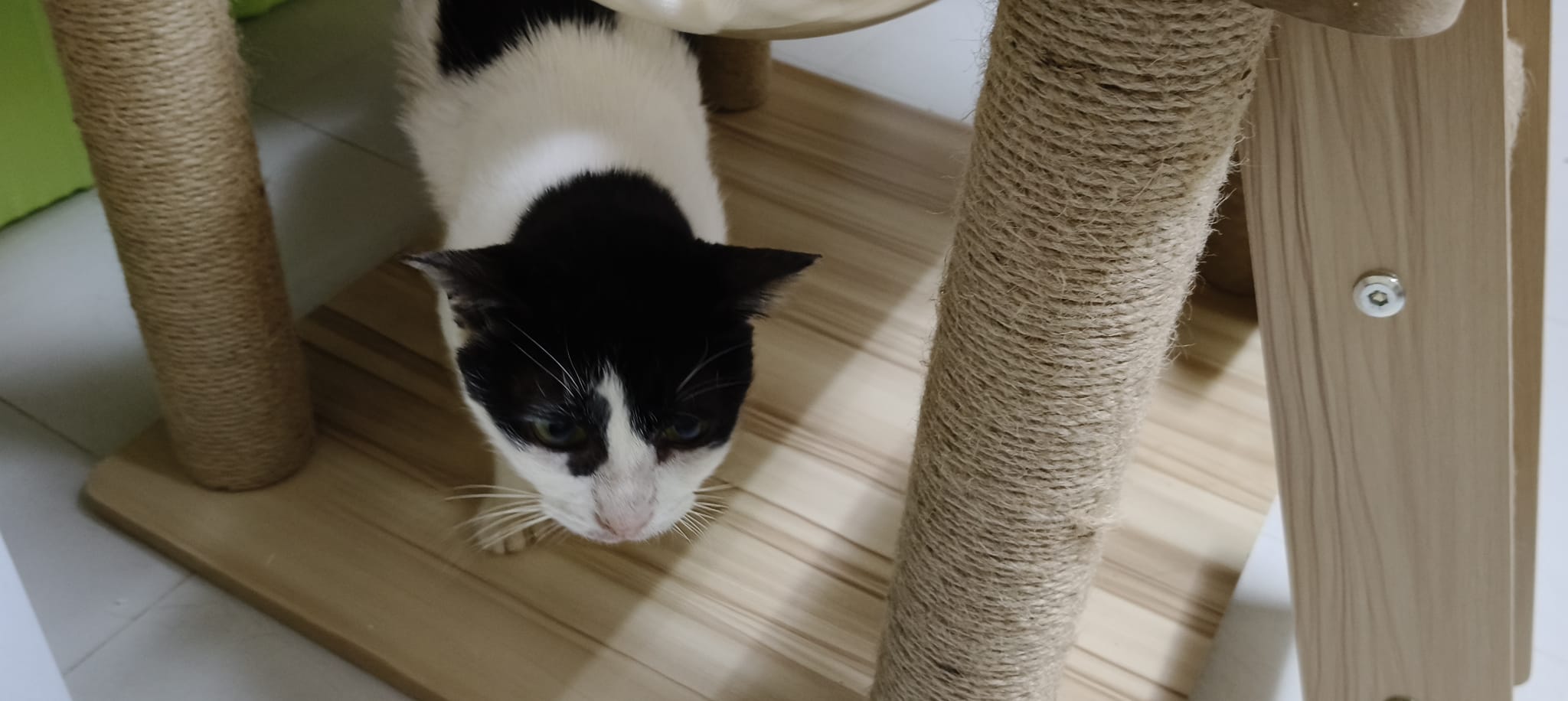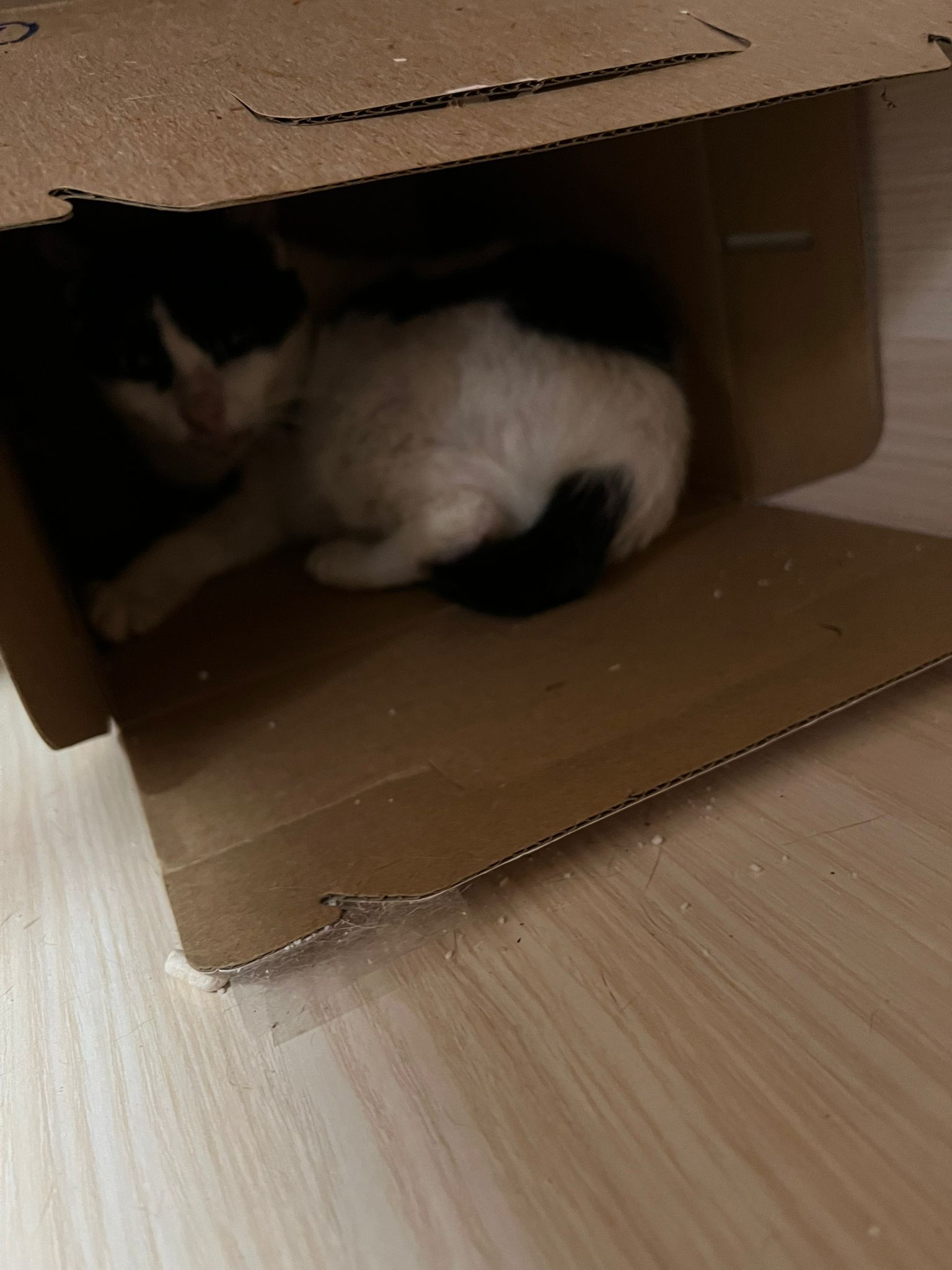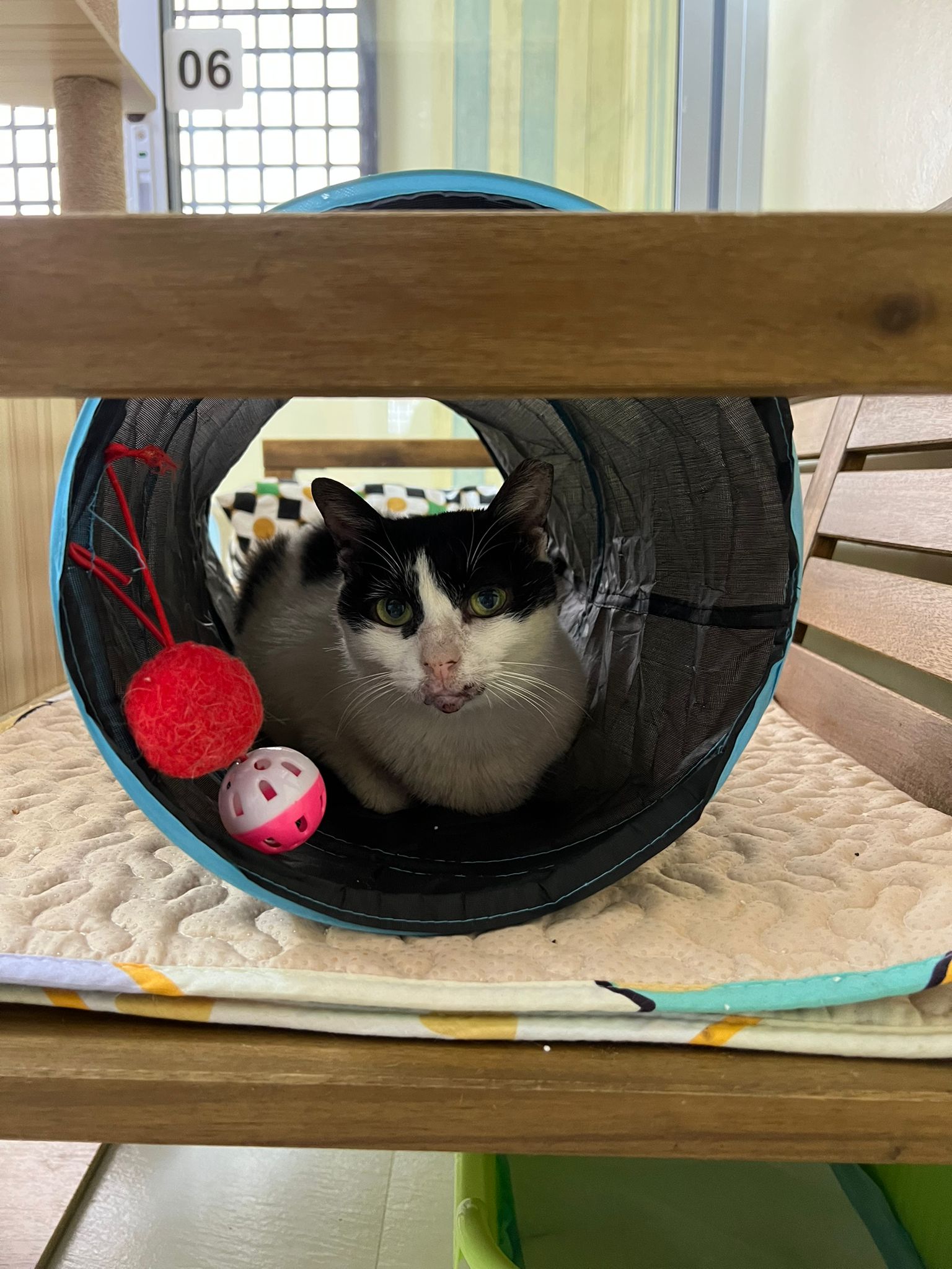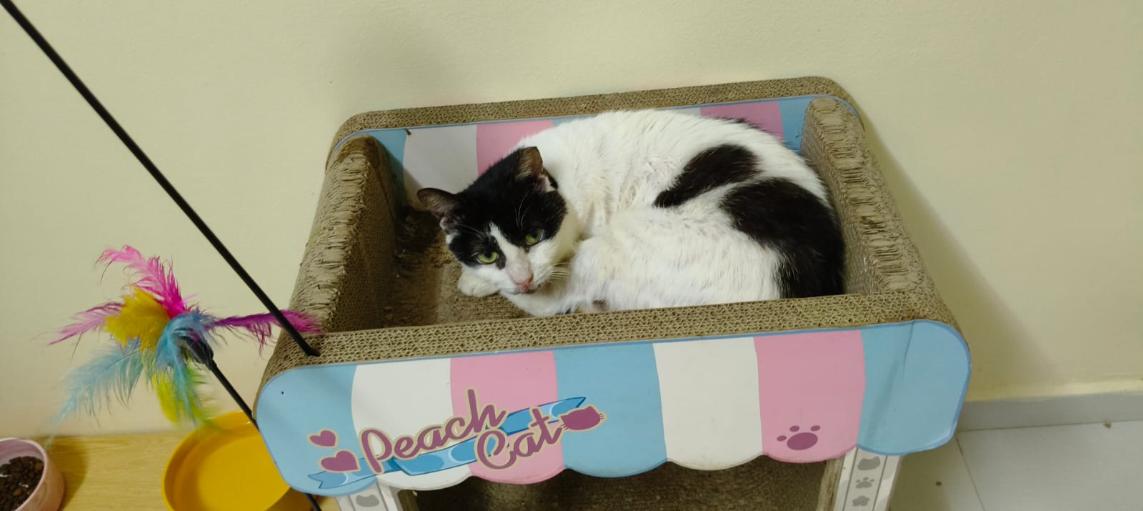 11.00am: enter 猫房 – Bai hide in the catnip toy, I sayang clean her eye, she want whack me. I sayang her neck again. – check: 9.30am jo in she alr hide here but she did come out to eat on the floor. She got sit on top of the ctn food