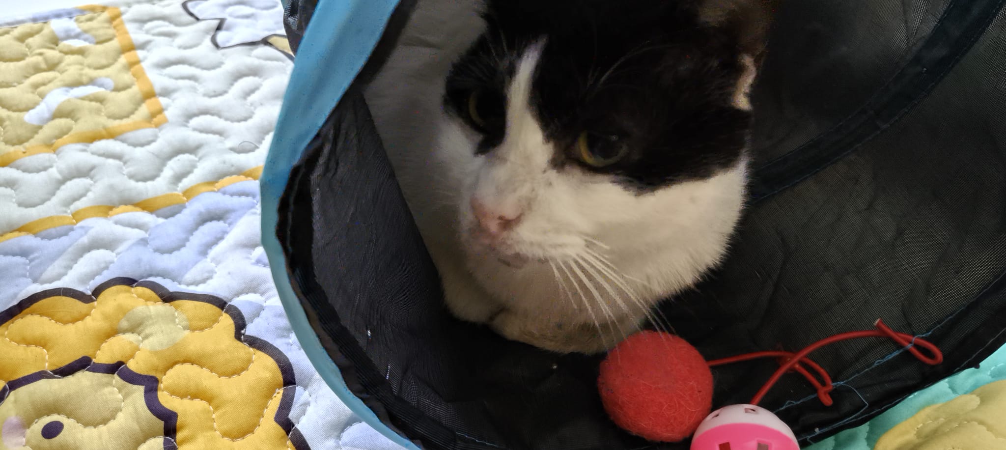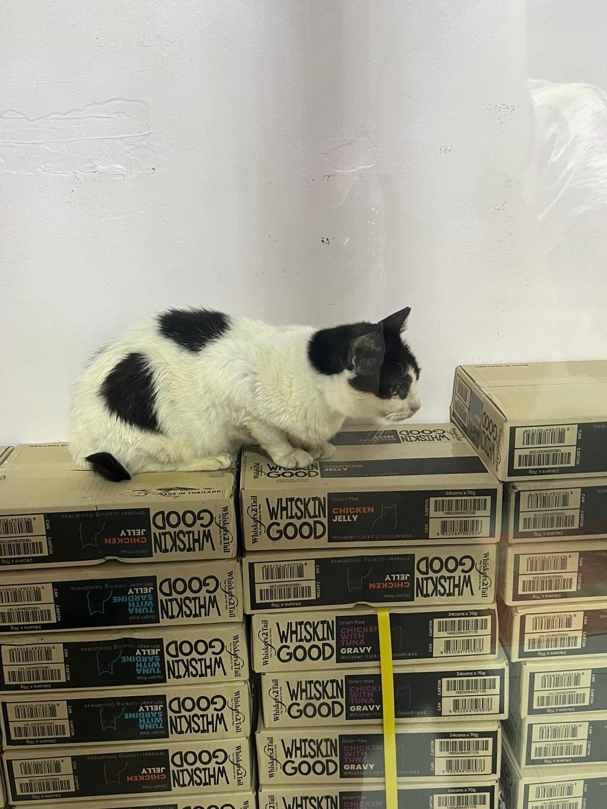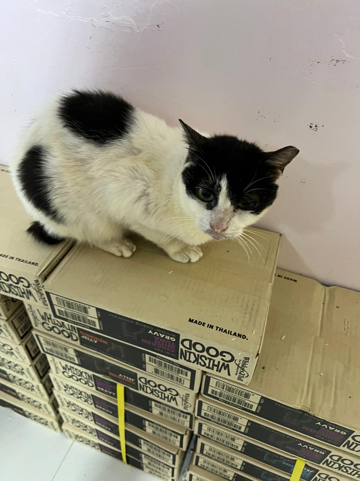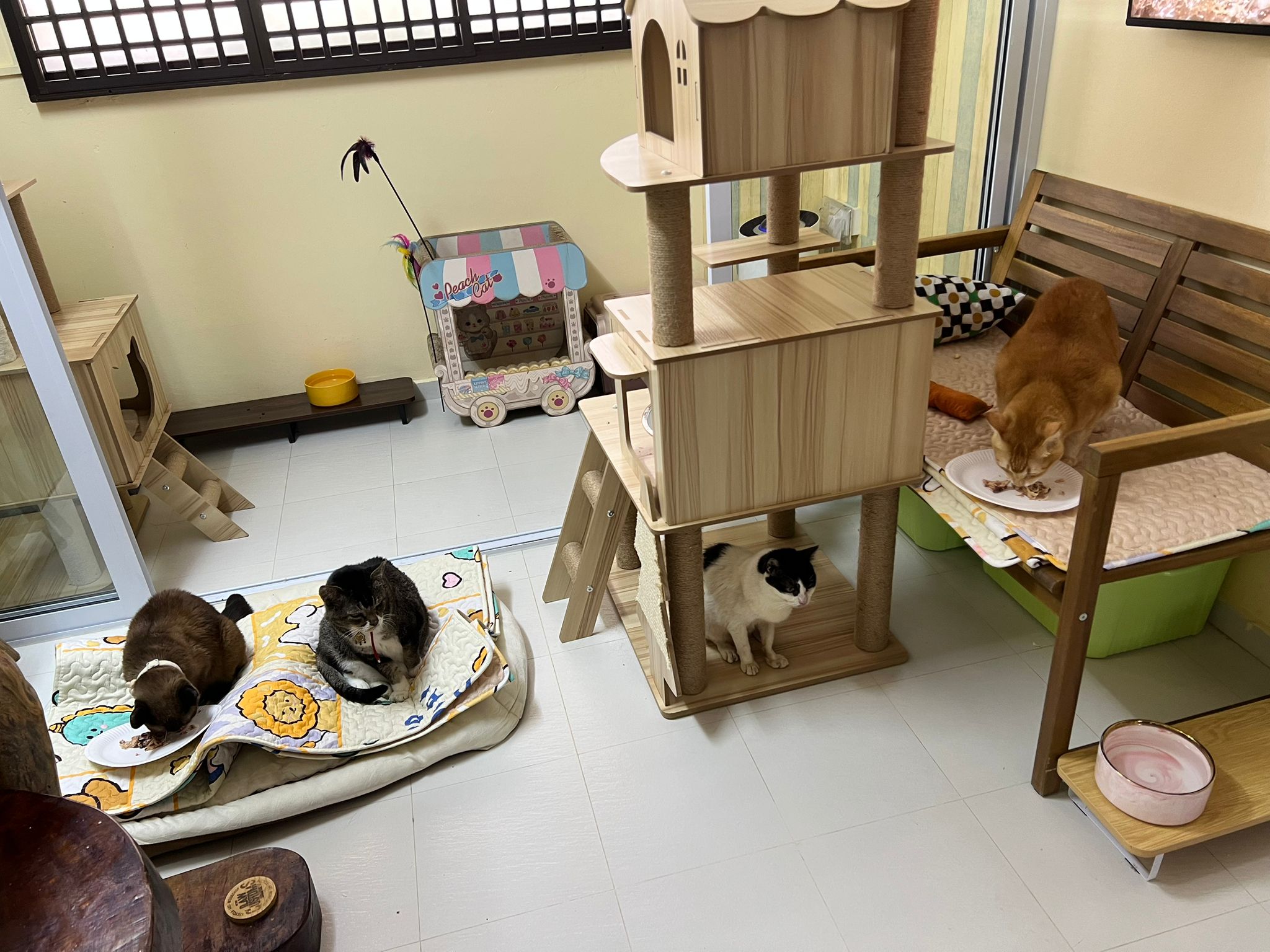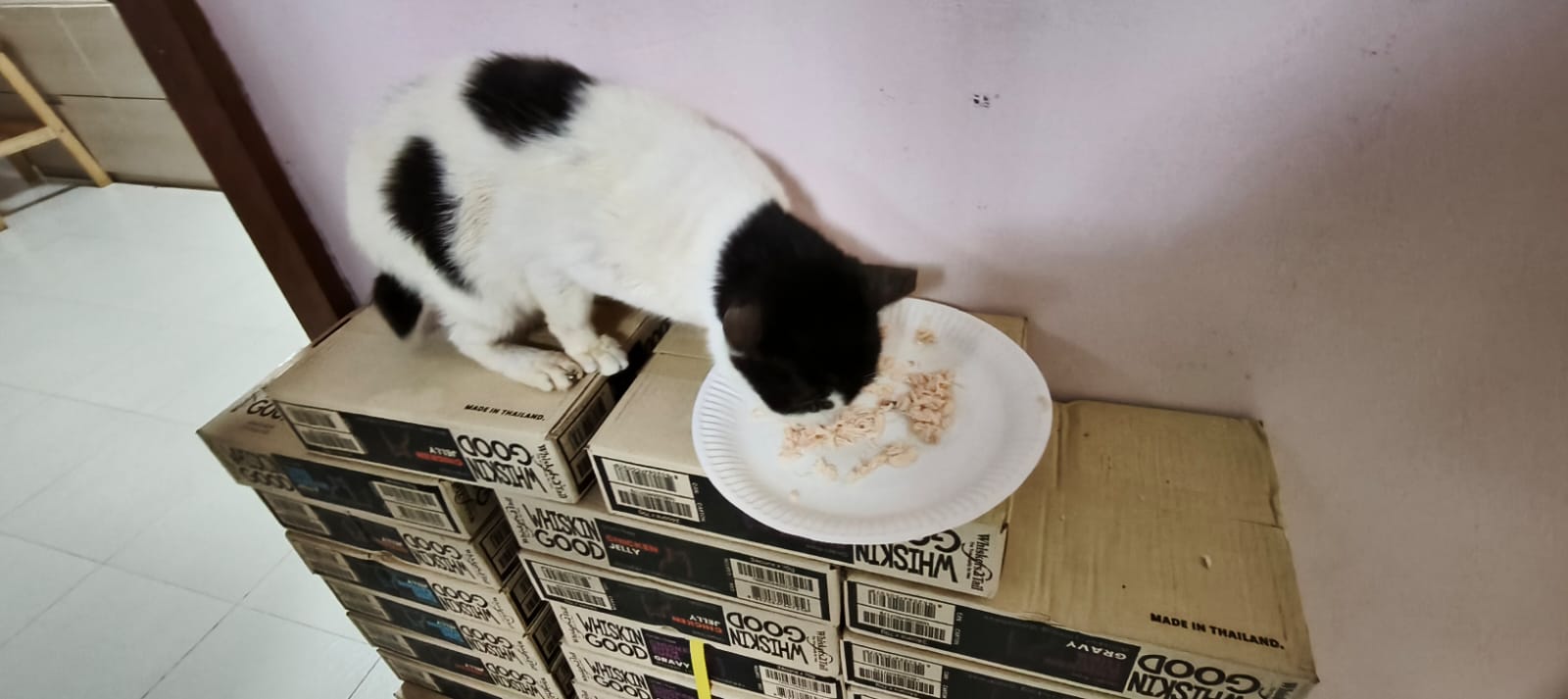 11.00am: enter 猫房 – Bai hide in the catnip toy, I sayang clean her eye, she want whack me. I sayang her neck again. – check: 9.30am jo in she alr hide here but she did come out to eat on the floor. She got sit on top of the ctn food