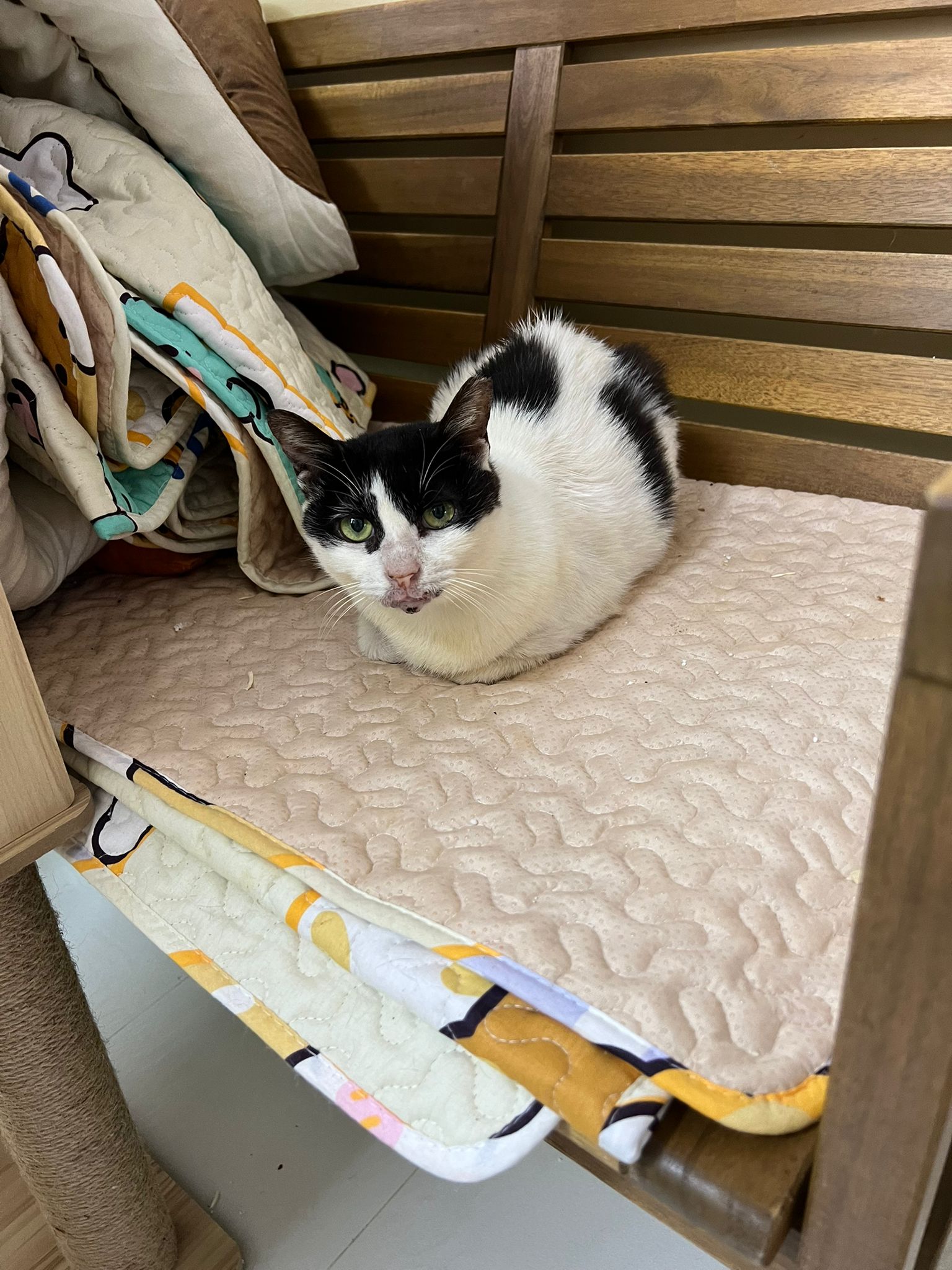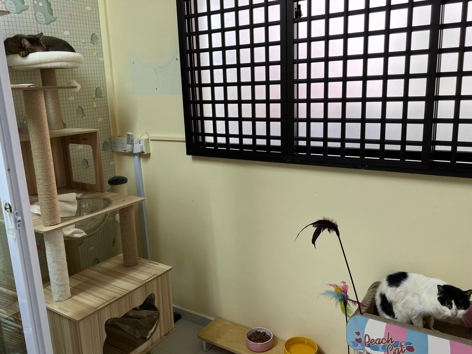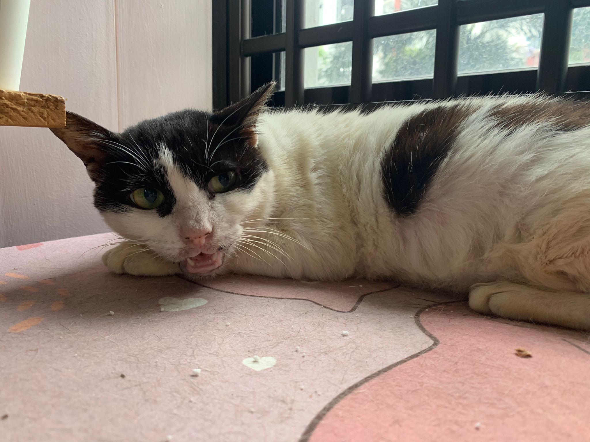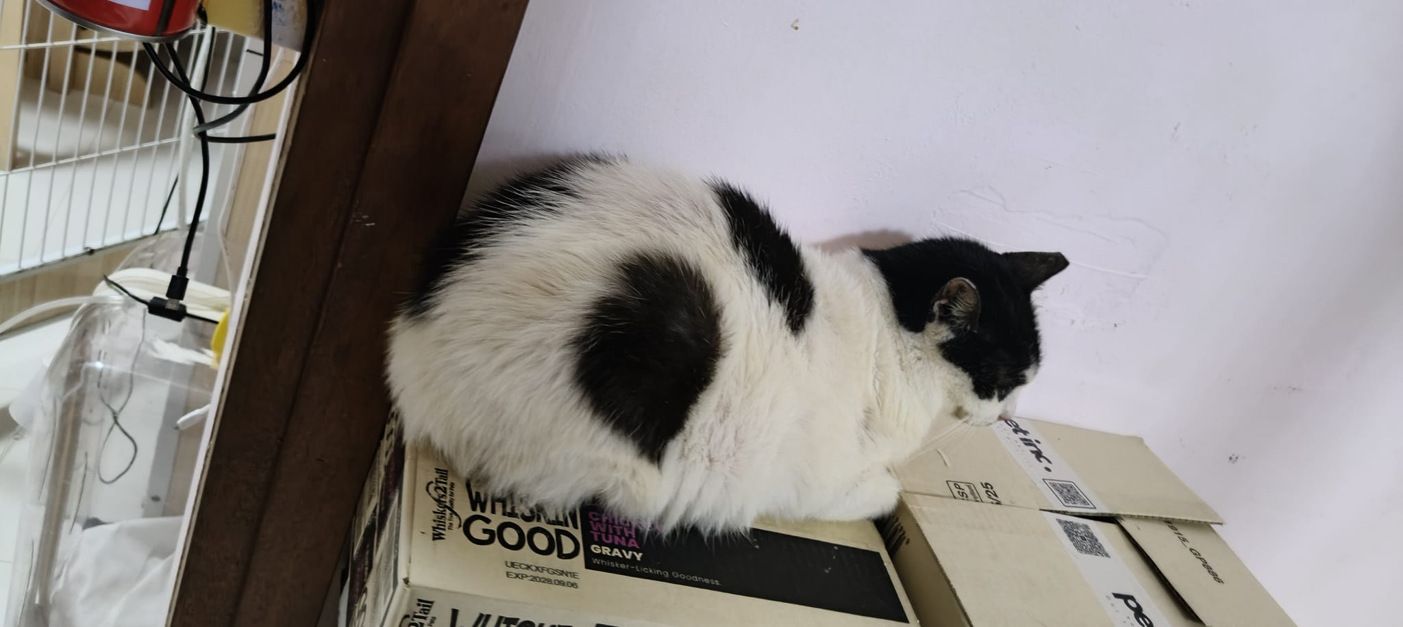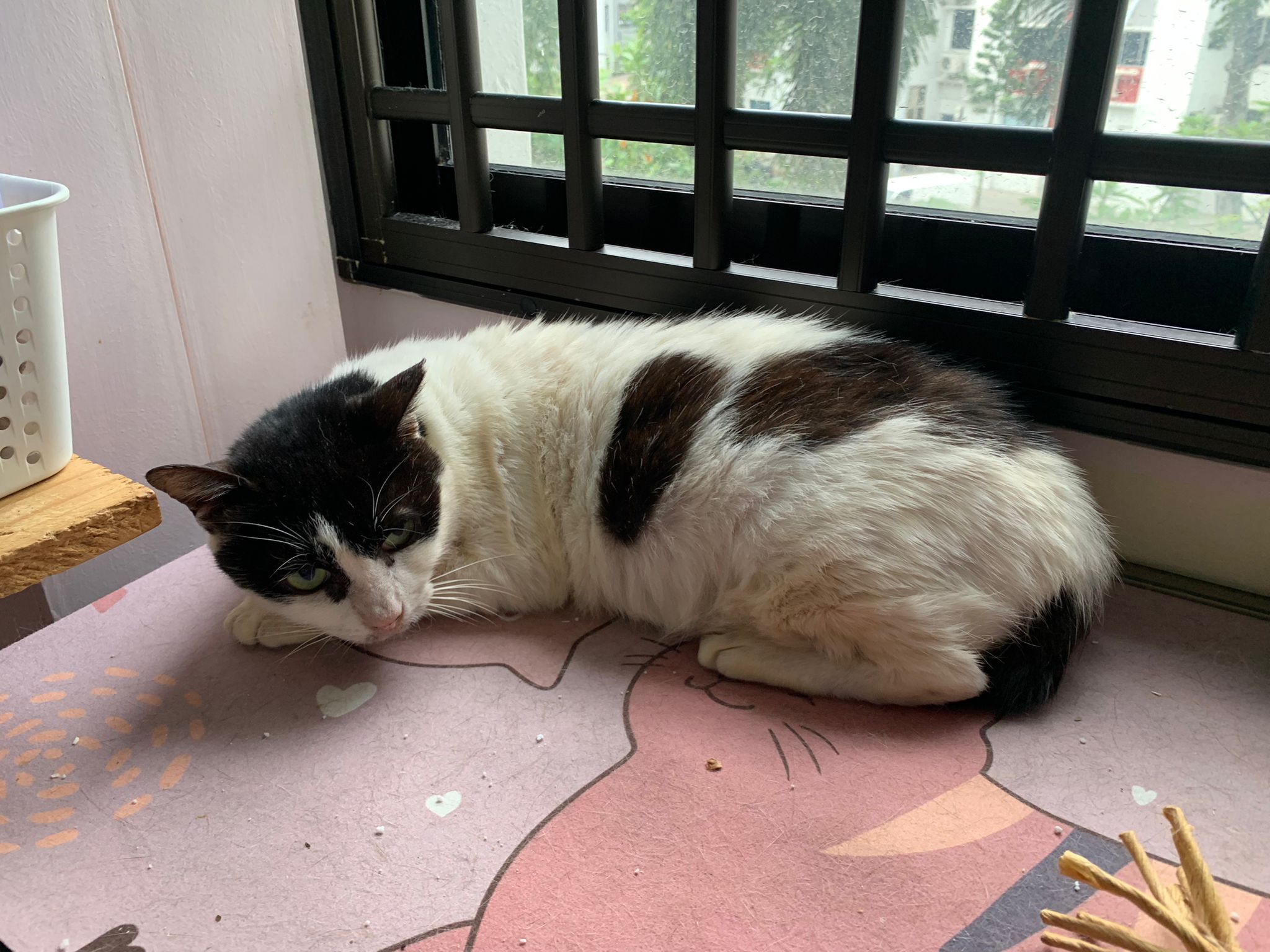 3.30pm+: I’m back in 猫房 cos got major cleaning round. She is at the window area, eat snack when I serve and she go n sit on the water bed in cage.