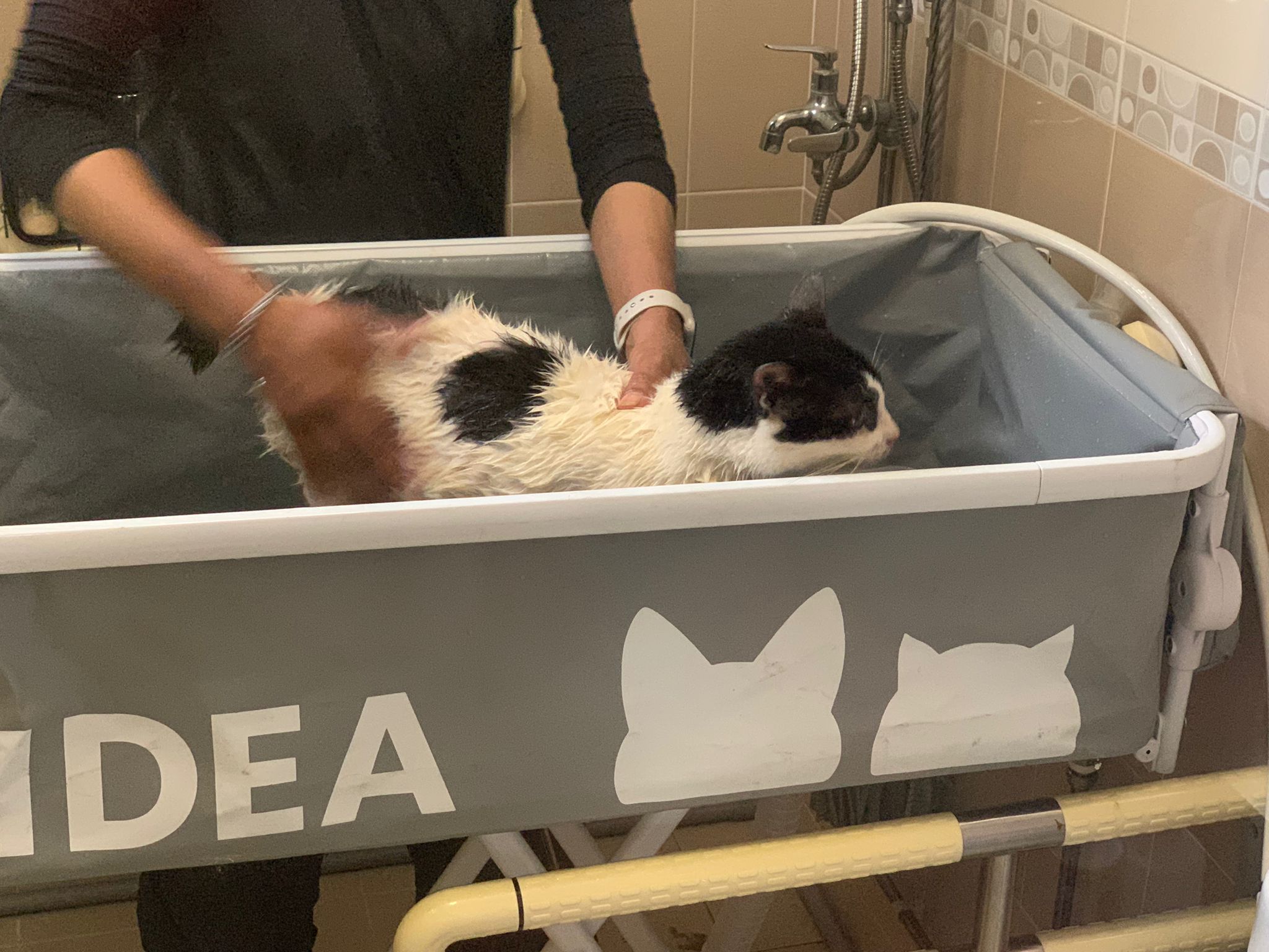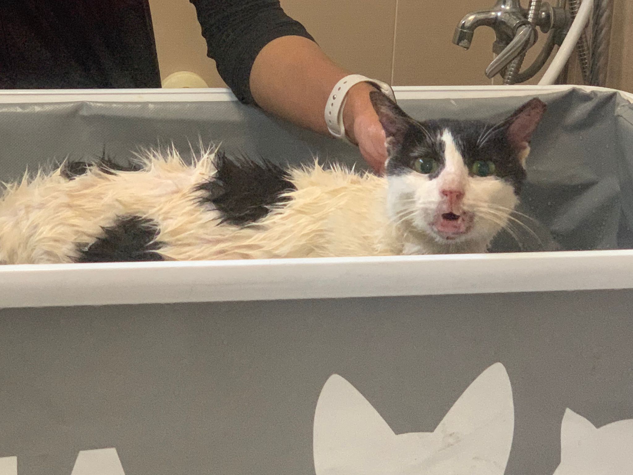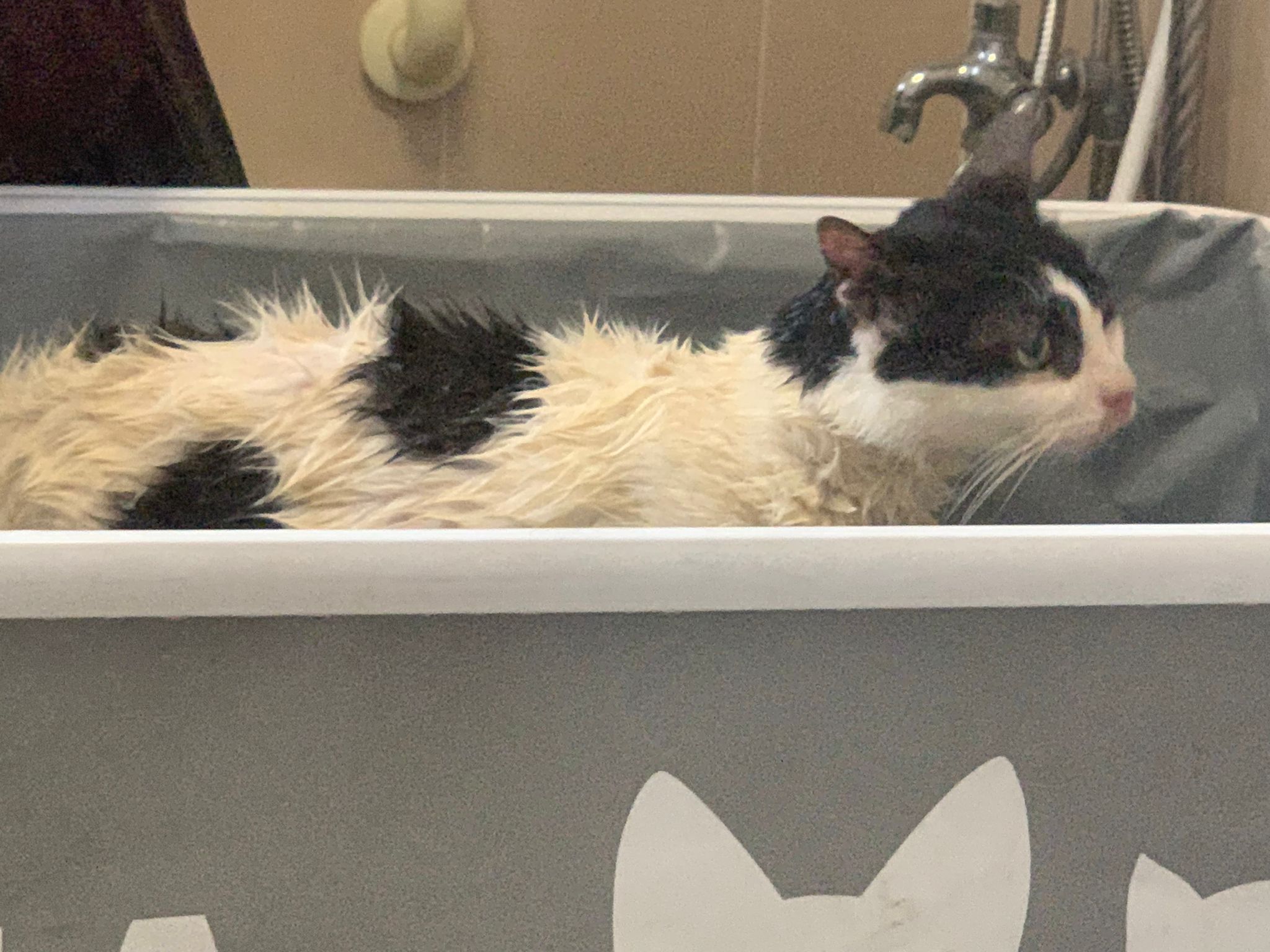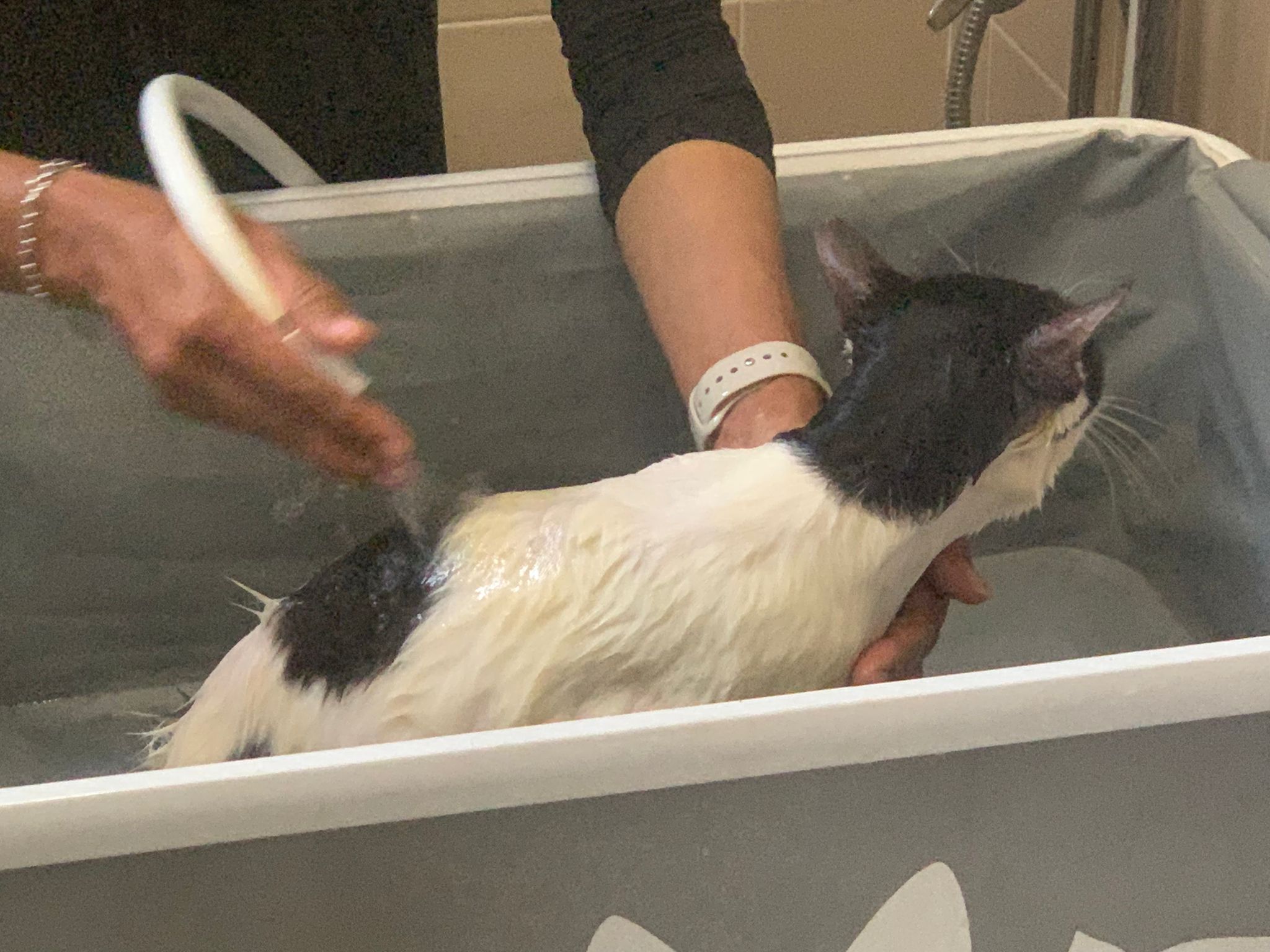 I release the felv gang and I bath myself v fast. then she shampoo 3 Times water black and her nails dirt all clean up and butt hole a little anal gland come out and clean up. Her fur so short till it dry quite fast, not much drying needed.