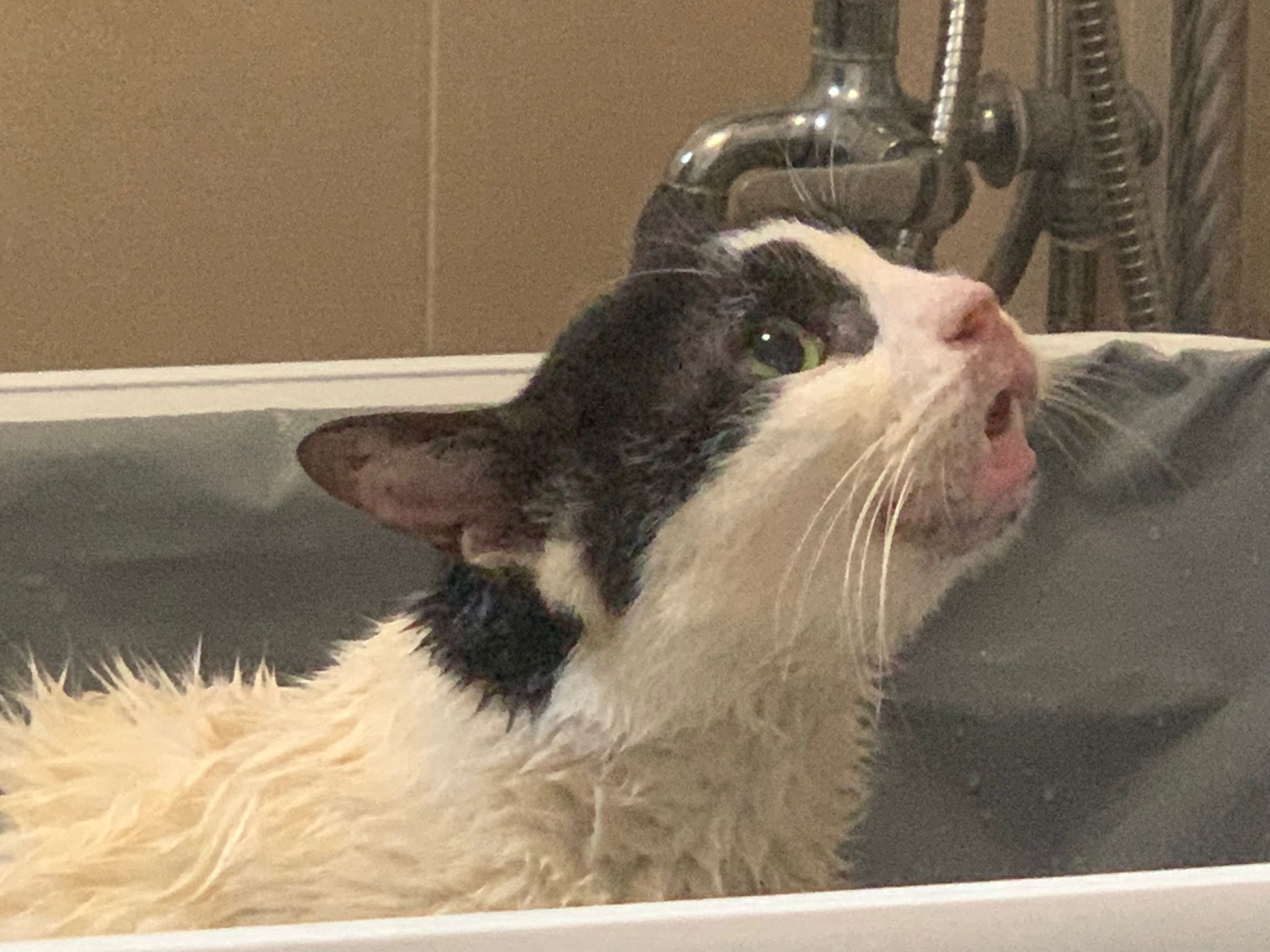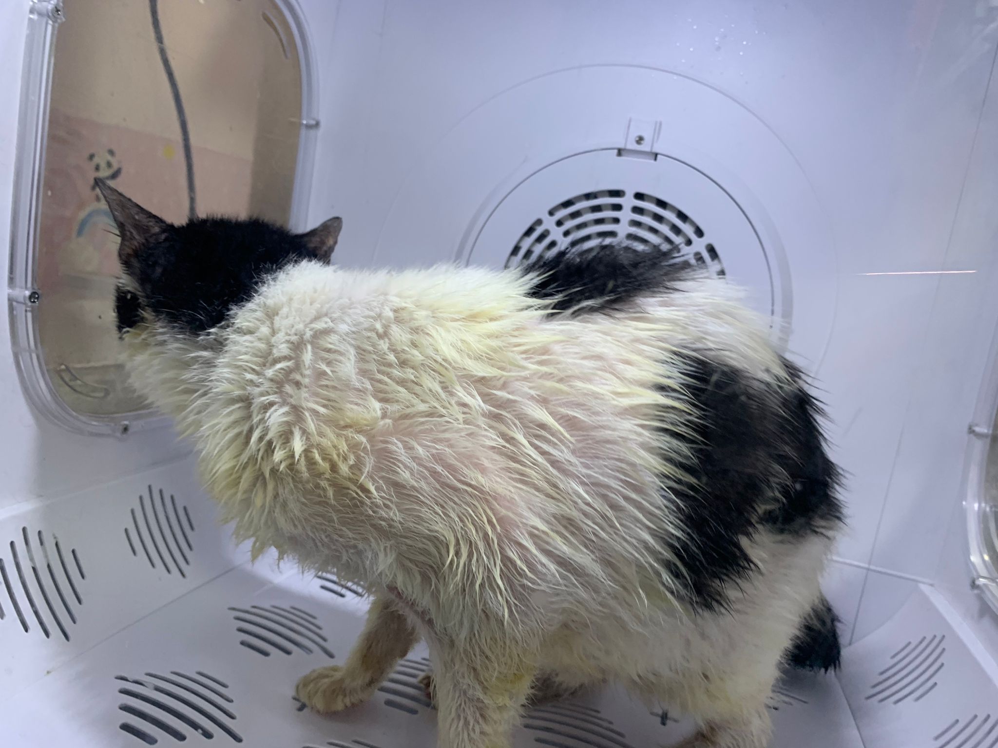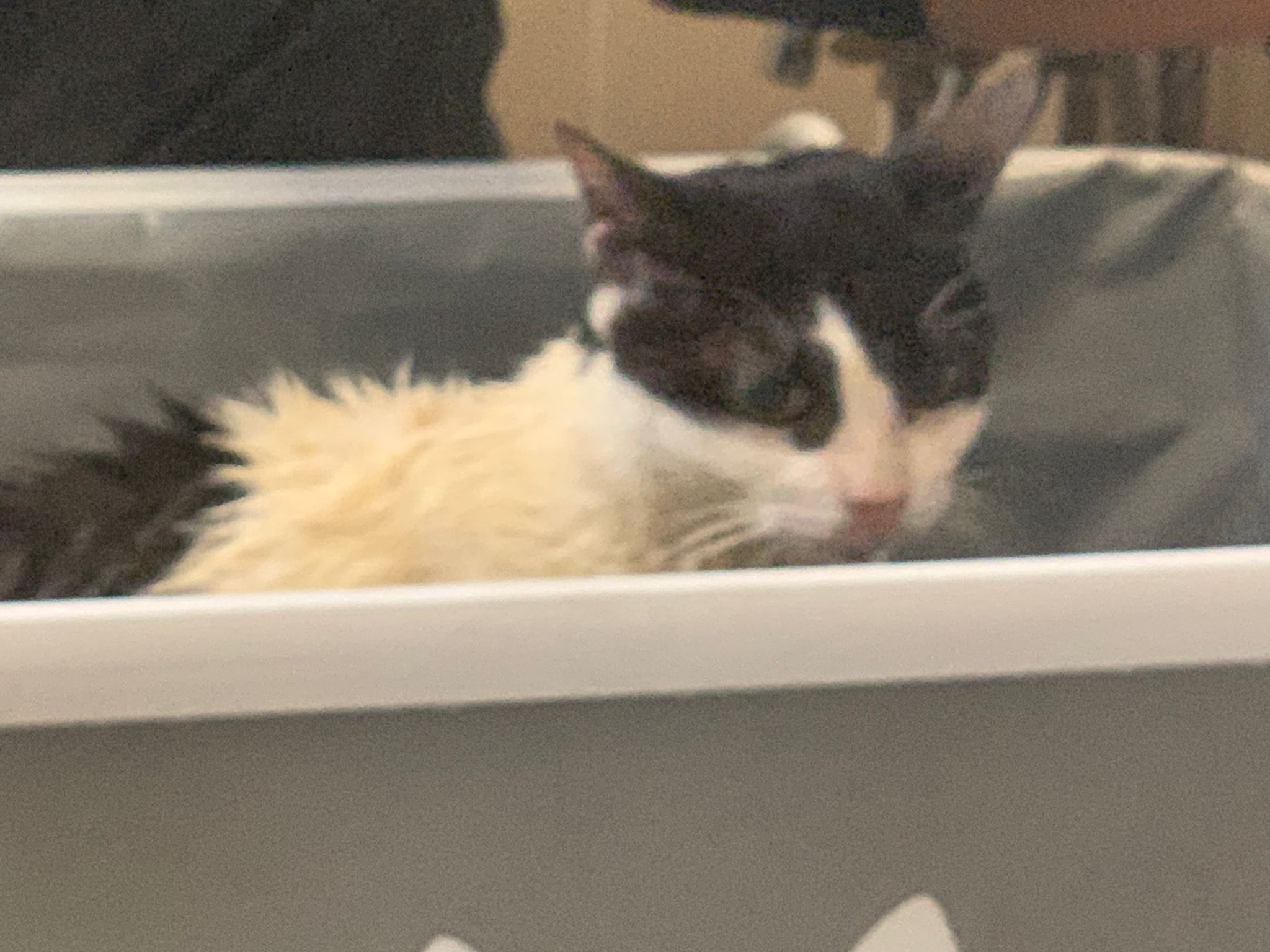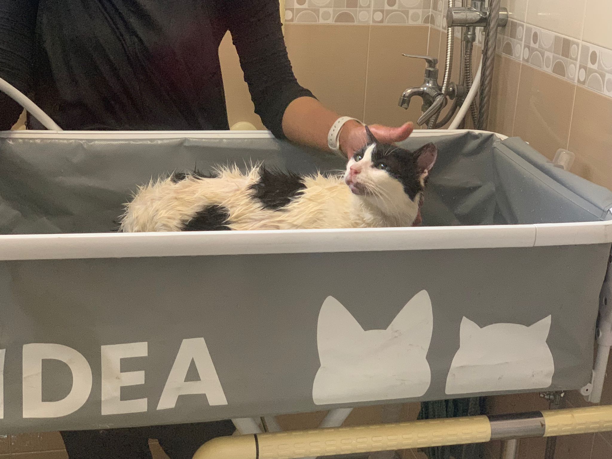 I release the felv gang and I bath myself v fast. then she shampoo 3 Times water black and her nails dirt all clean up and butt hole a little anal gland come out and clean up. Her fur so short till it dry quite fast, not much drying needed.