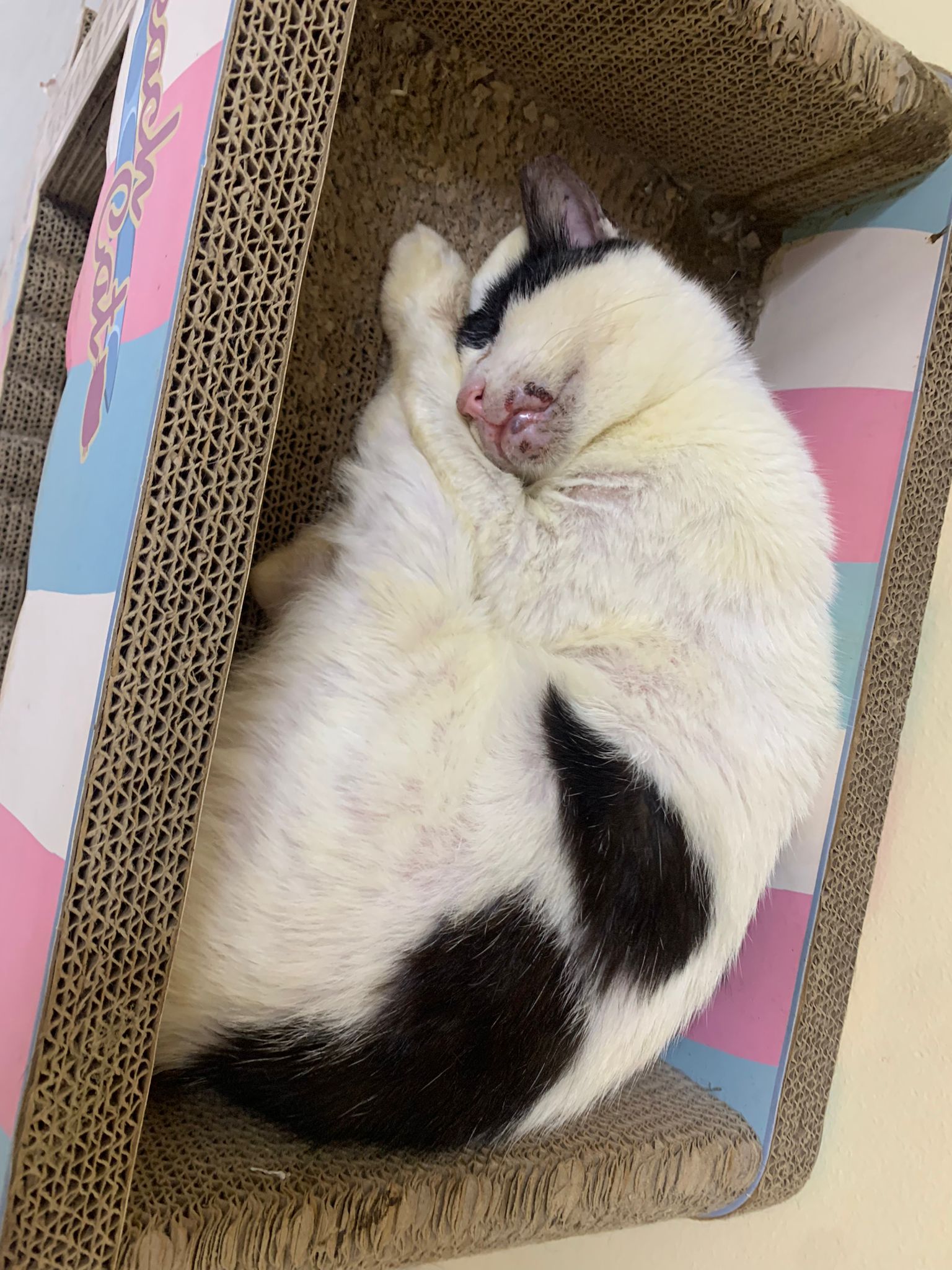 Morning and afternoon she always love me, eat well sleep well. Not much meowing in the afternoon. Ha. Sometime I want go in sayang her but she sleeping soundly so I don’t disturb her. clean her paws one more time, put banocin. Last Clav jab told her Tmr no more jab. She is going back to hood tonight.