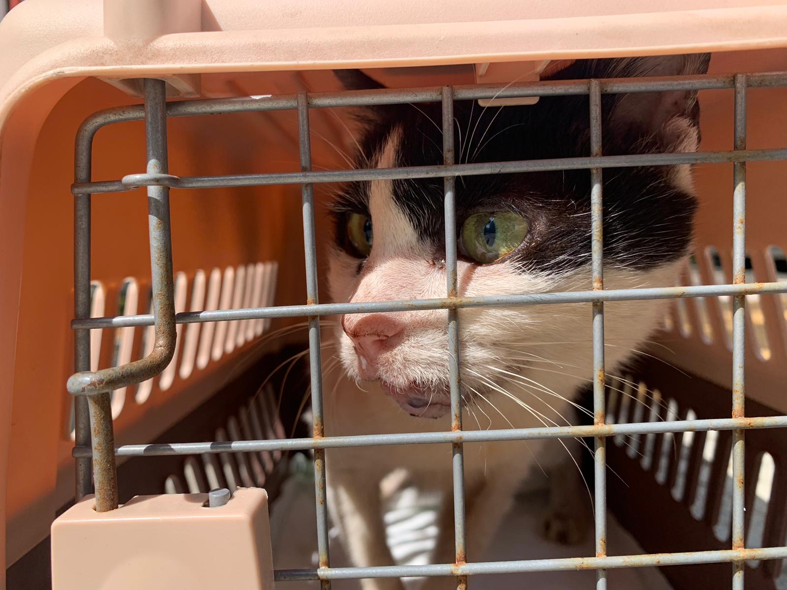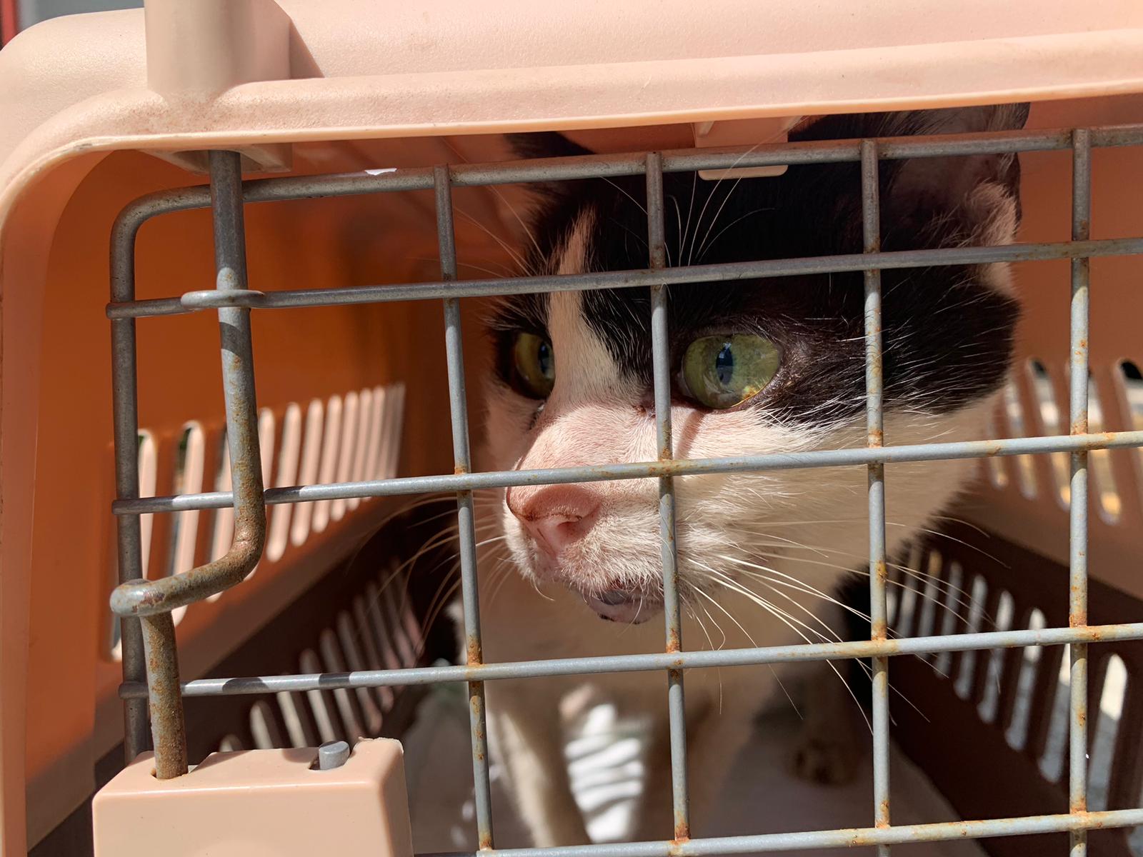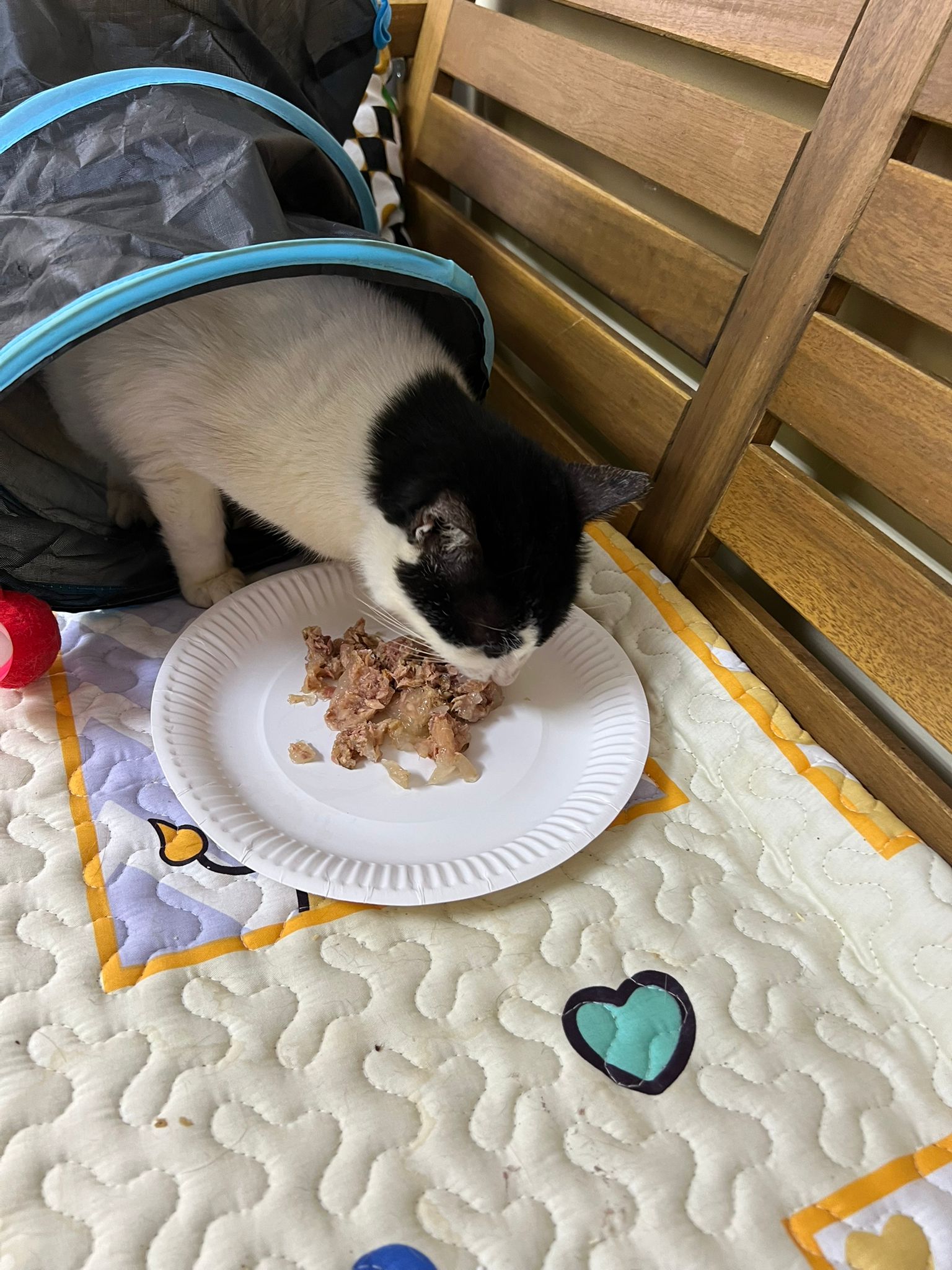 Back to 猫房, i serve a plate of tuna w chicken for her to eat at the top. Remove carrier.