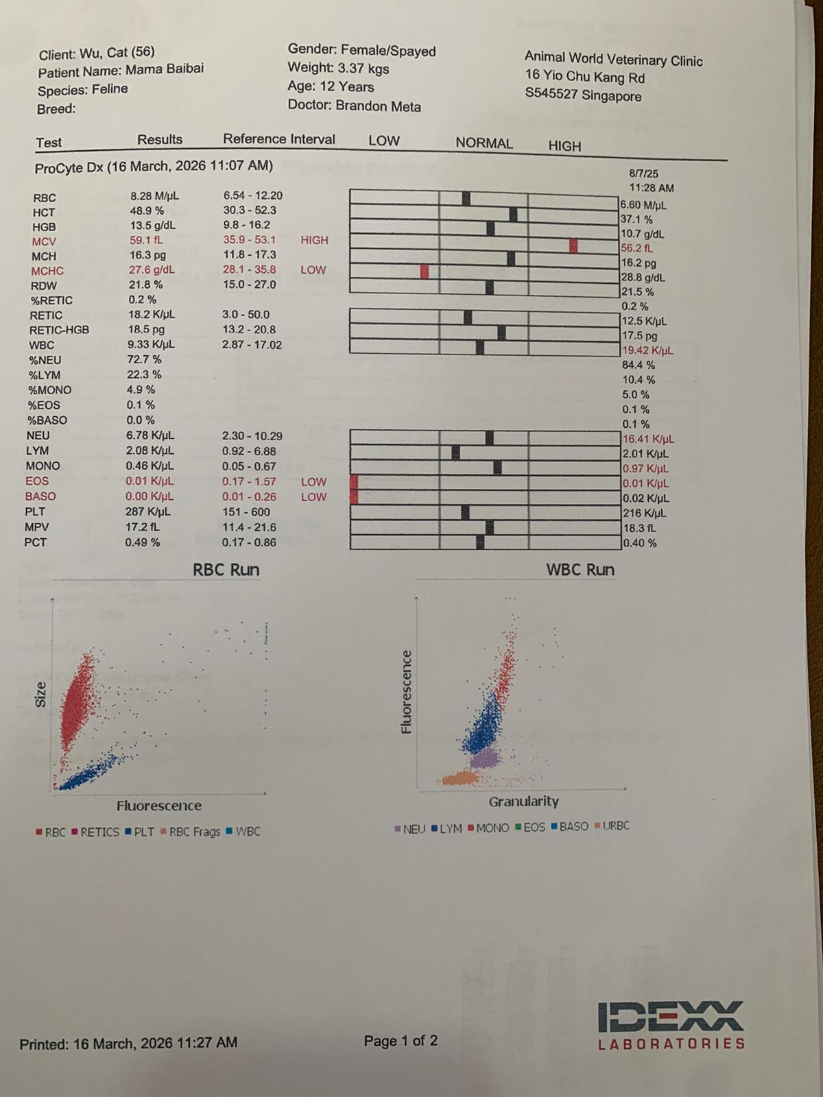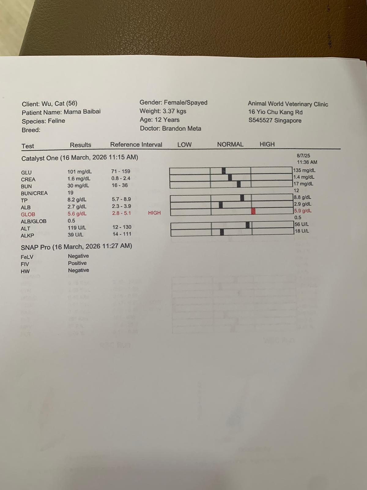 Sigh I reach clinic at 10.50am recept cork up, didn’t book me in, dr Sheryl doing surgery. Sigh. Want me to see dr Jonas – nah nah nahhhhhhhh No way. end up Alex do for me: just idexx fiv felv, Cbc, Chem10. no consult at all. Sigh. Nvm I see the status of her bloods first (last is 8 months ago)