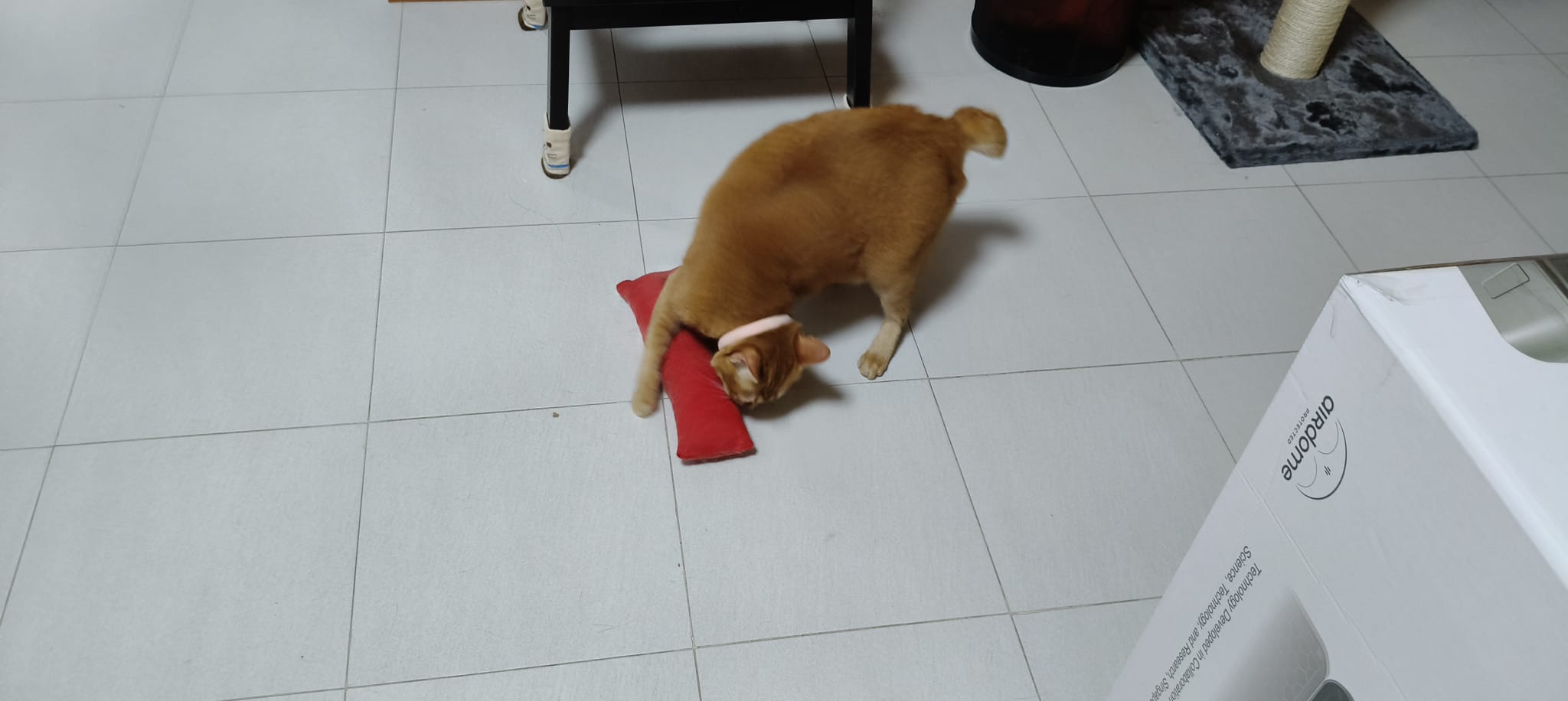 4pm+: Bessie hugging the catnip pillow to play. I won’t be ordering new one. We still got some old Joni one n old mettacats mouse
