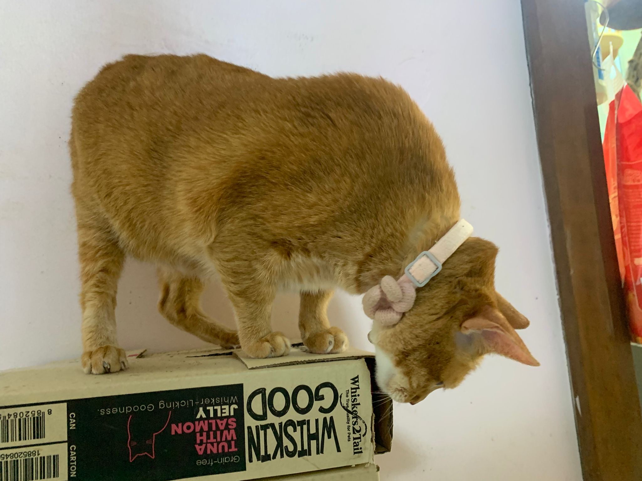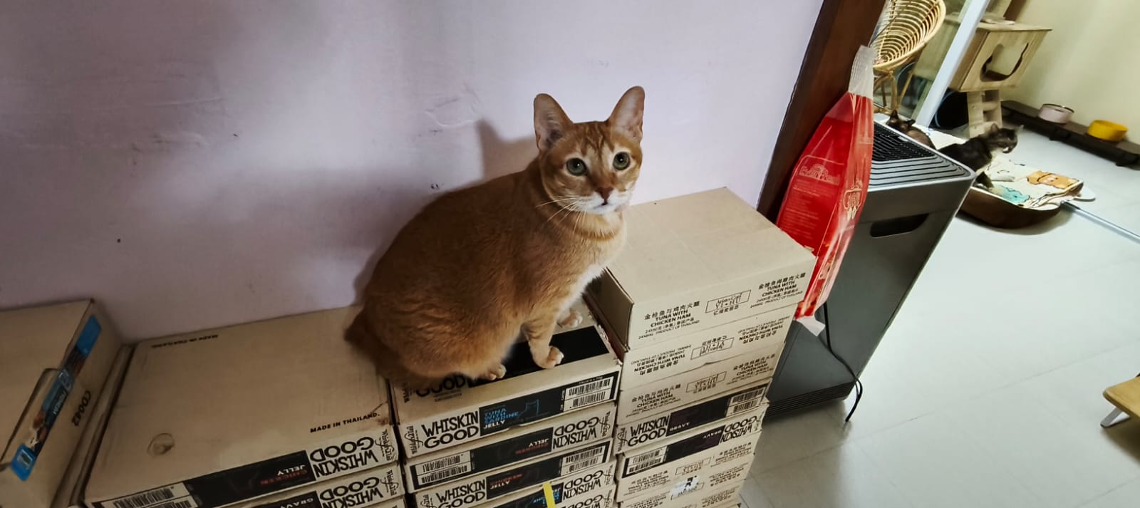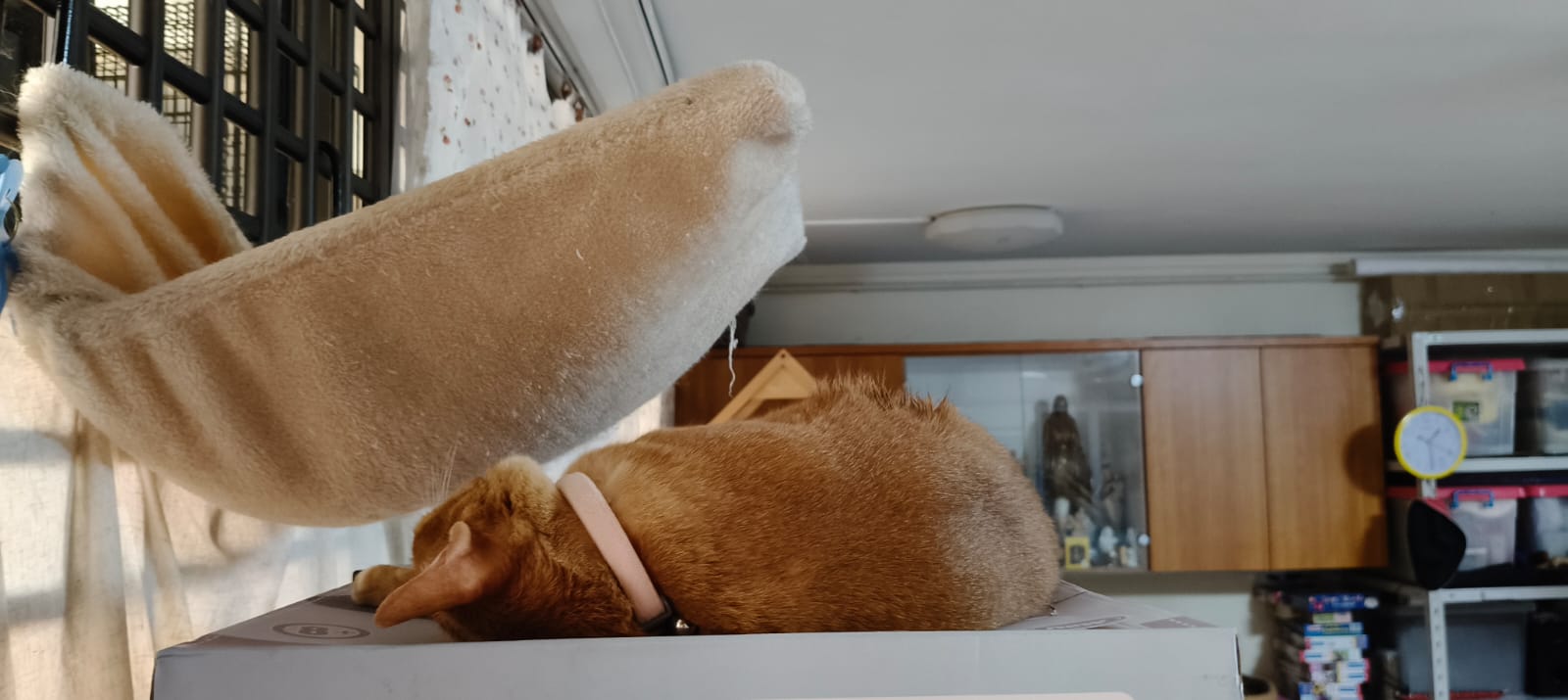 9.16am: Naicha was curious why Bessie can come out to living room to roam. She sit and groom Herself in the box right outside his room