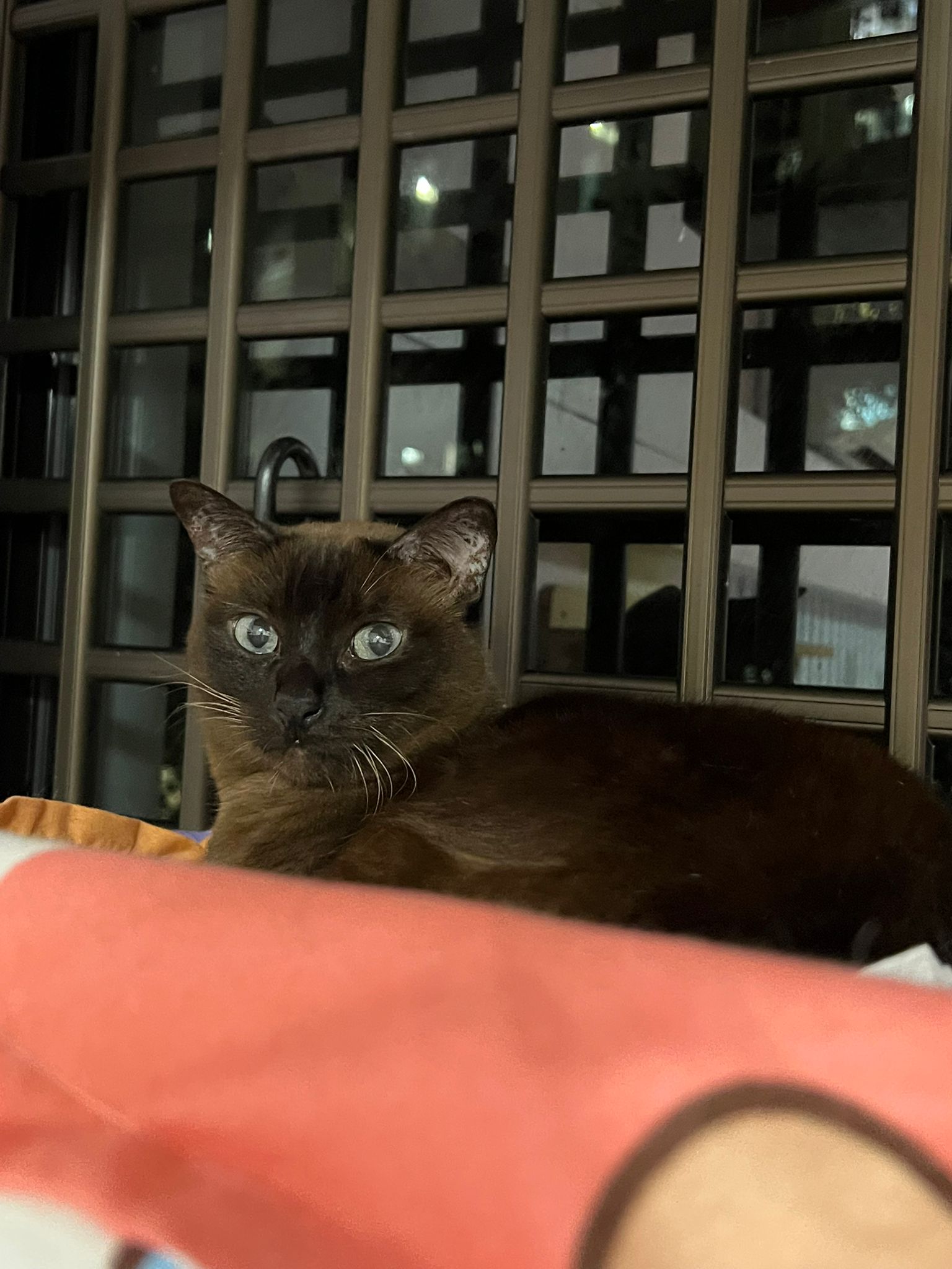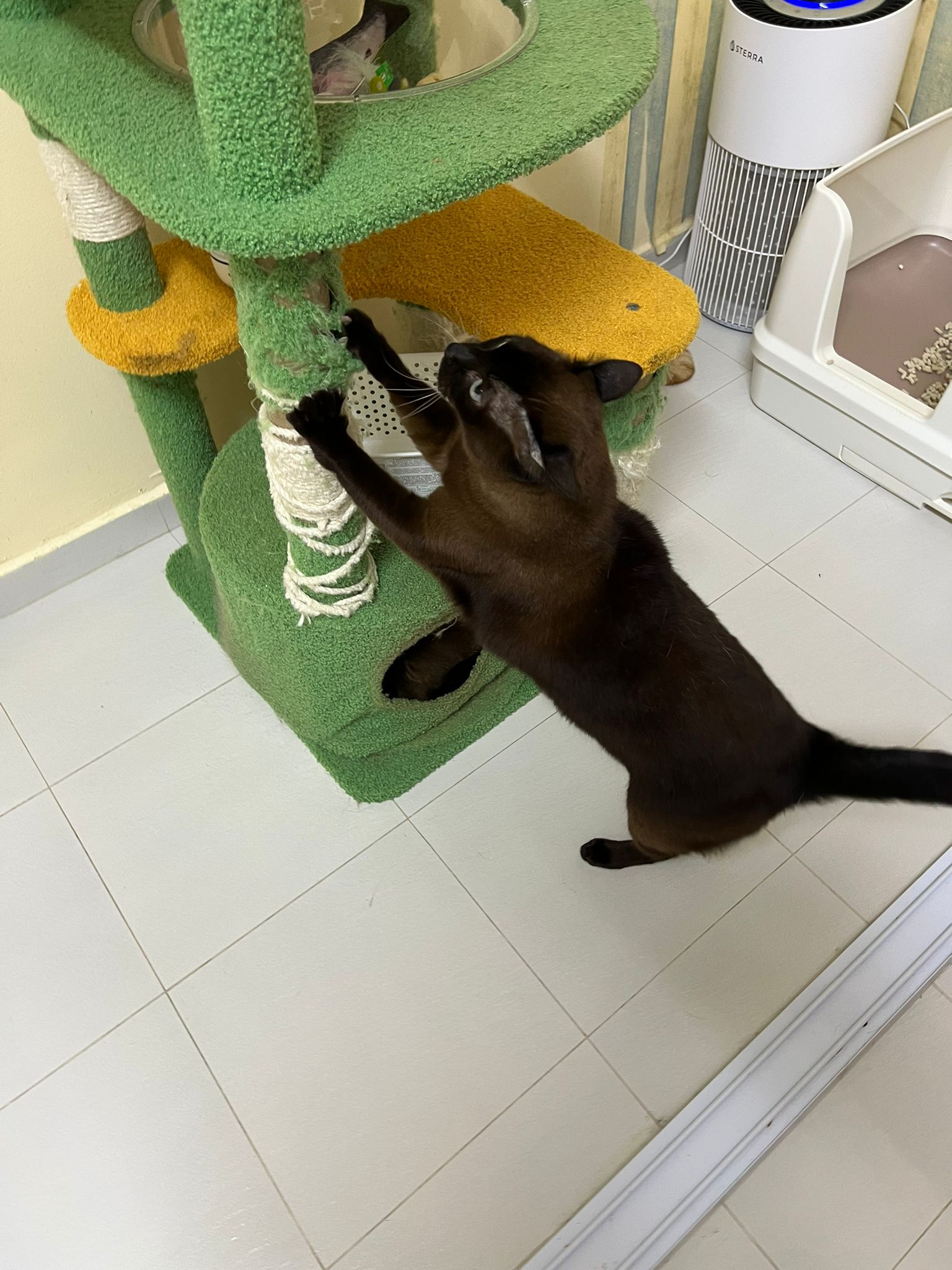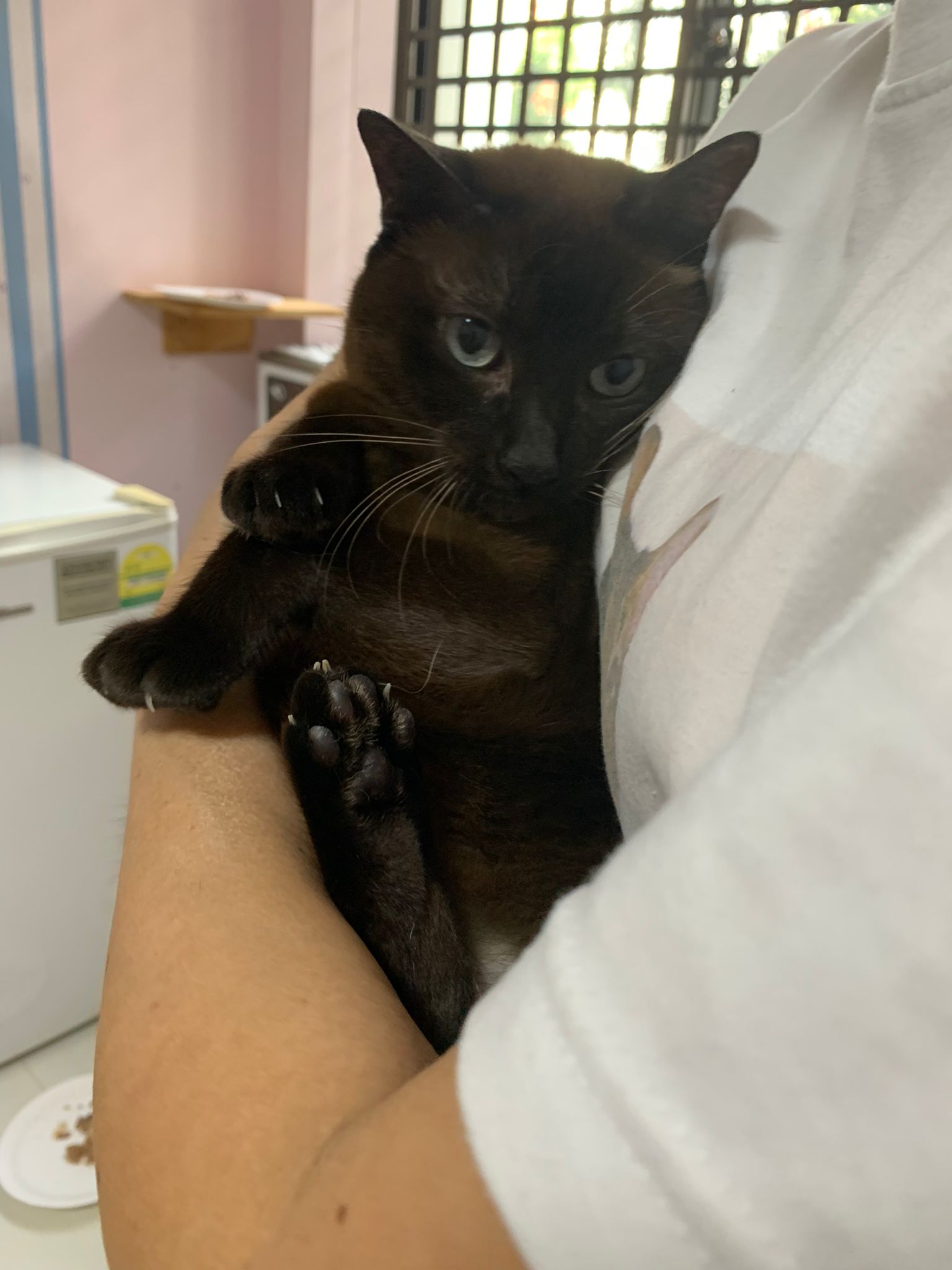 I rescued her bcos she was initially hiding in the drain when she is newly abandoned (I can hack care) but she move on to the dangerous carpark so i become no choice. It’s her own luck that I told her U want to come w me I’ll bring u back to 猫房 or I’ll go home. She went w me and her story in 猫房 start. A sweet cat who love to follow me around to ask for sayang. She loves to eat daily delight pure. If there is stranger, she will react differently, she will hiss and etc. Her character become braver after she befriended 2 boys – Stitch and Junior. Will be good if she is adopted with Junior.