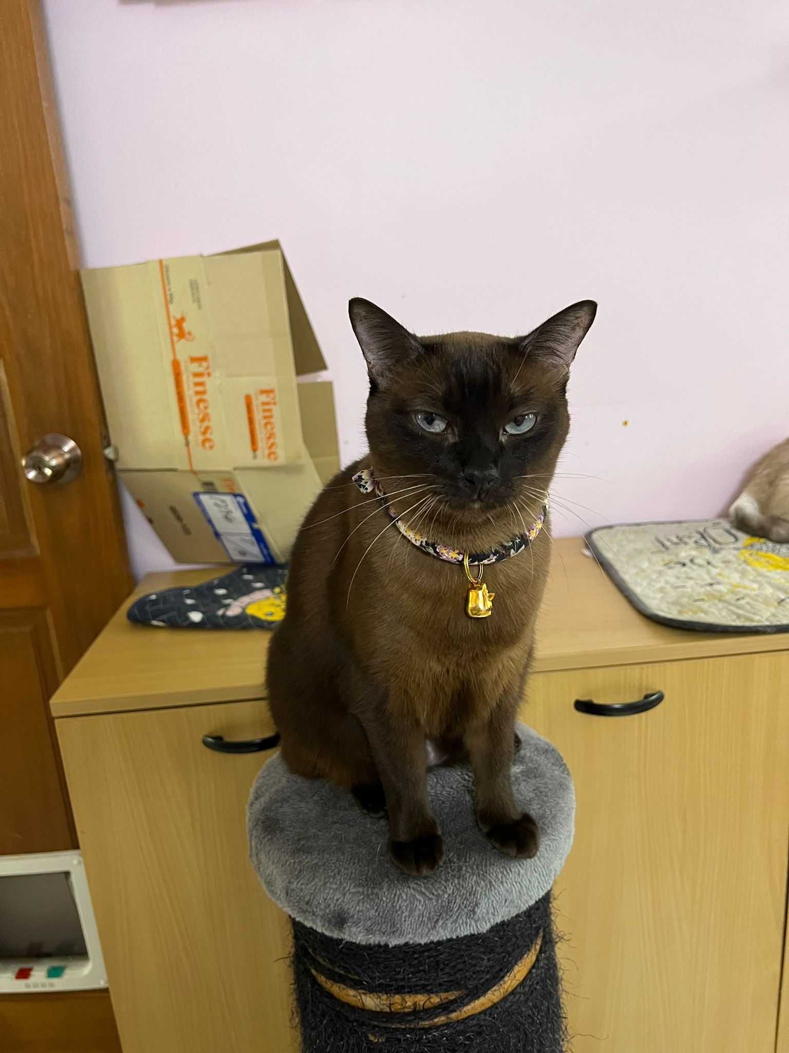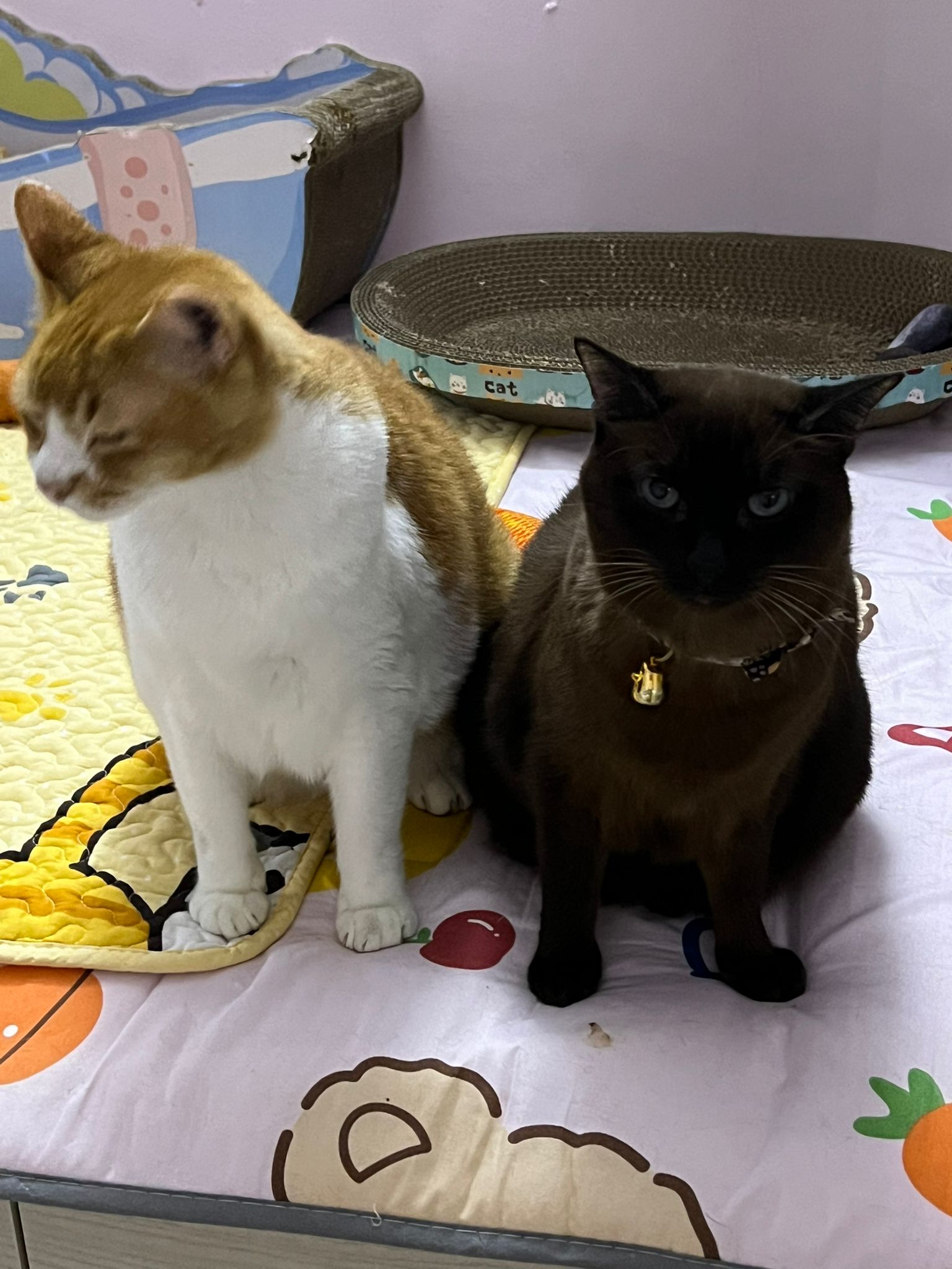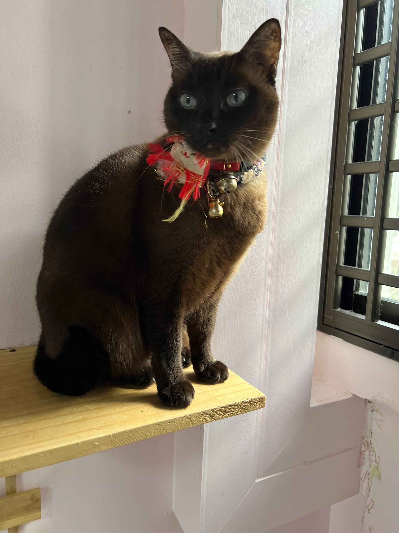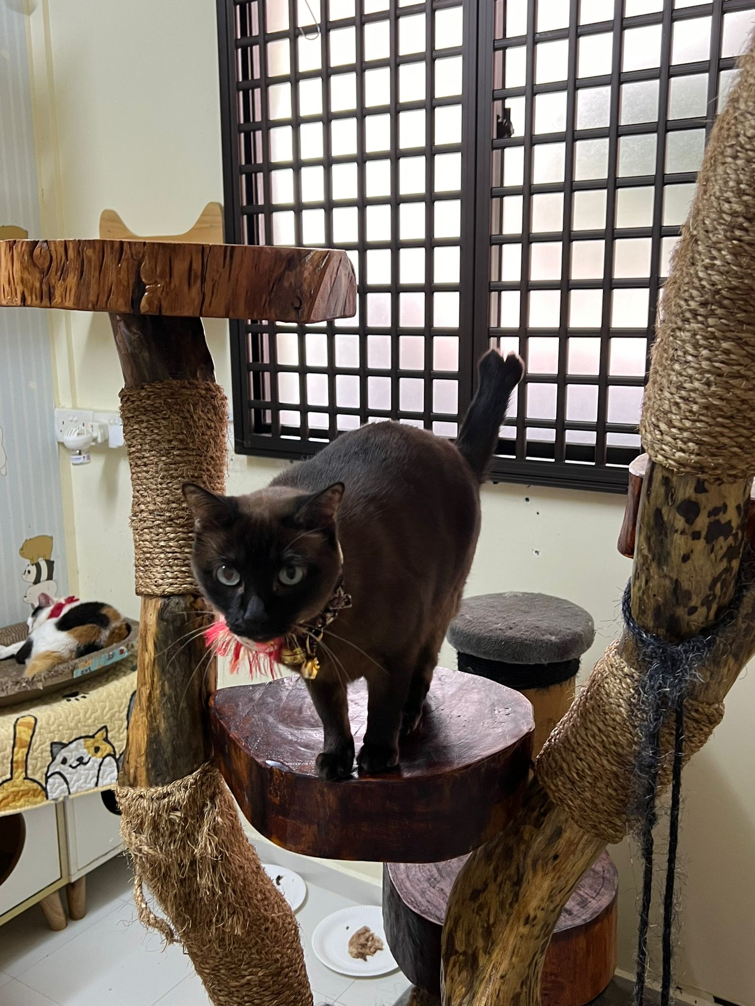 I rescued her bcos she was initially hiding in the drain when she is newly abandoned (I can hack care) but she move on to the dangerous carpark so i become no choice. It’s her own luck that I told her U want to come w me I’ll bring u back to 猫房 or I’ll go home. She went w me and her story in 猫房 start. A sweet cat who love to follow me around to ask for sayang. She loves to eat daily delight pure. If there is stranger, she will react differently, she will hiss and etc. Her character become braver after she befriended 2 boys – Stitch and Junior. Will be good if she is adopted with Junior.