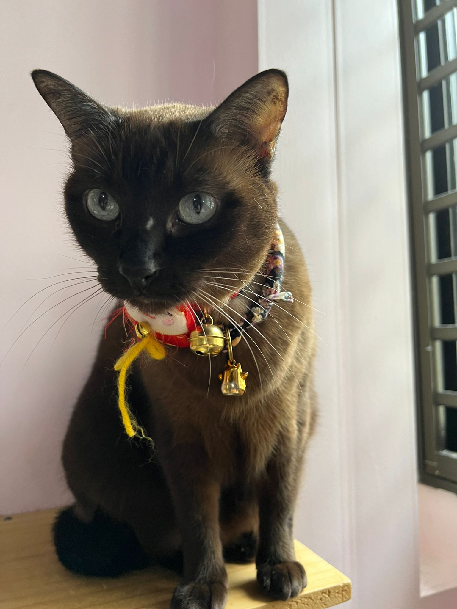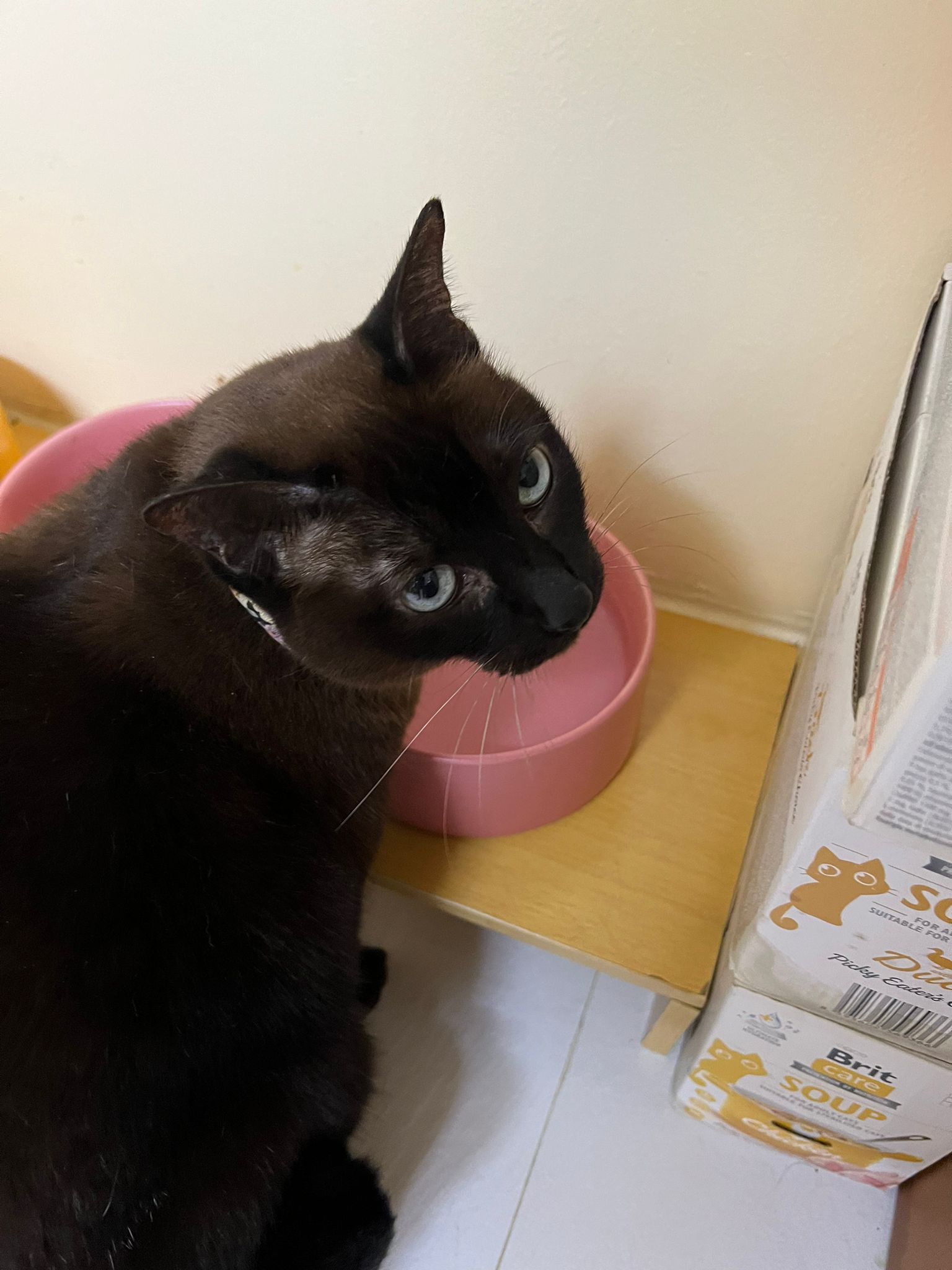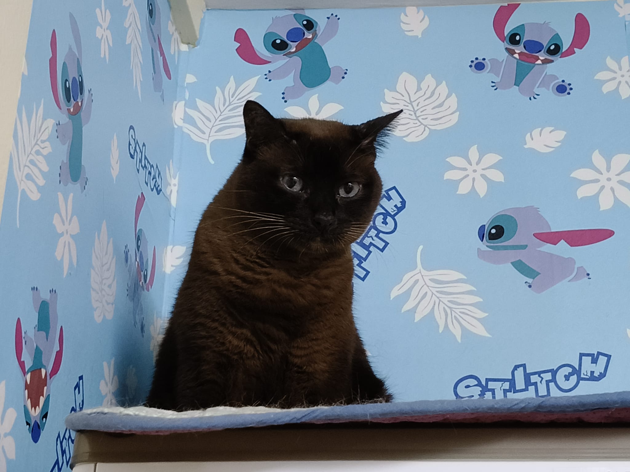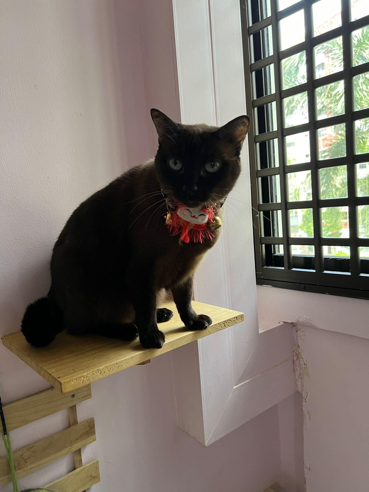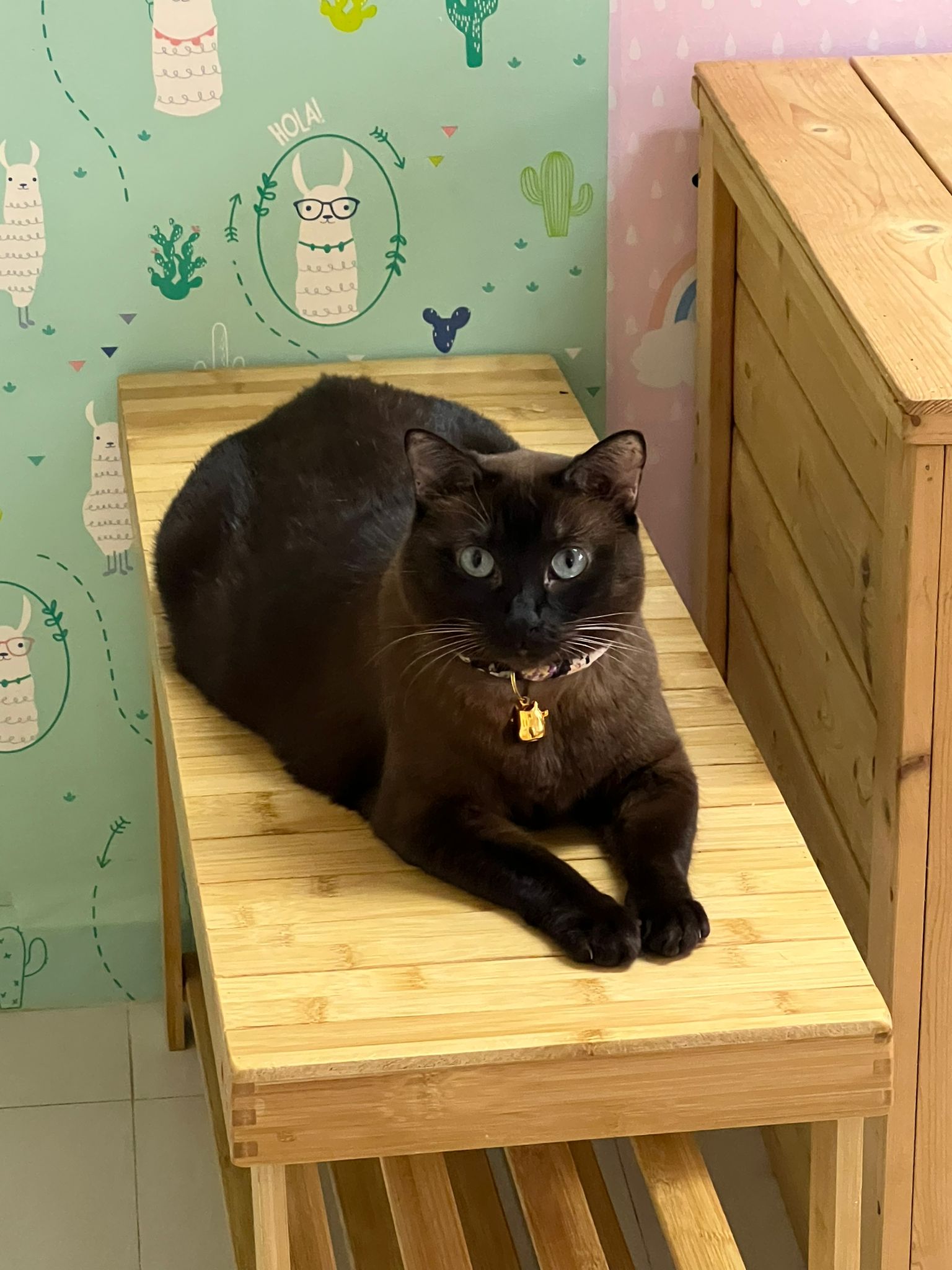 I rescued her bcos she was initially hiding in the drain when she is newly abandoned (I can hack care) but she move on to the dangerous carpark so i become no choice. It’s her own luck that I told her U want to come w me I’ll bring u back to 猫房 or I’ll go home. She went w me and her story in 猫房 start. A sweet cat who love to follow me around to ask for sayang. She loves to eat daily delight pure. If there is stranger, she will react differently, she will hiss and etc. Her character become braver after she befriended 2 boys – Stitch and Junior. Will be good if she is adopted with Junior.