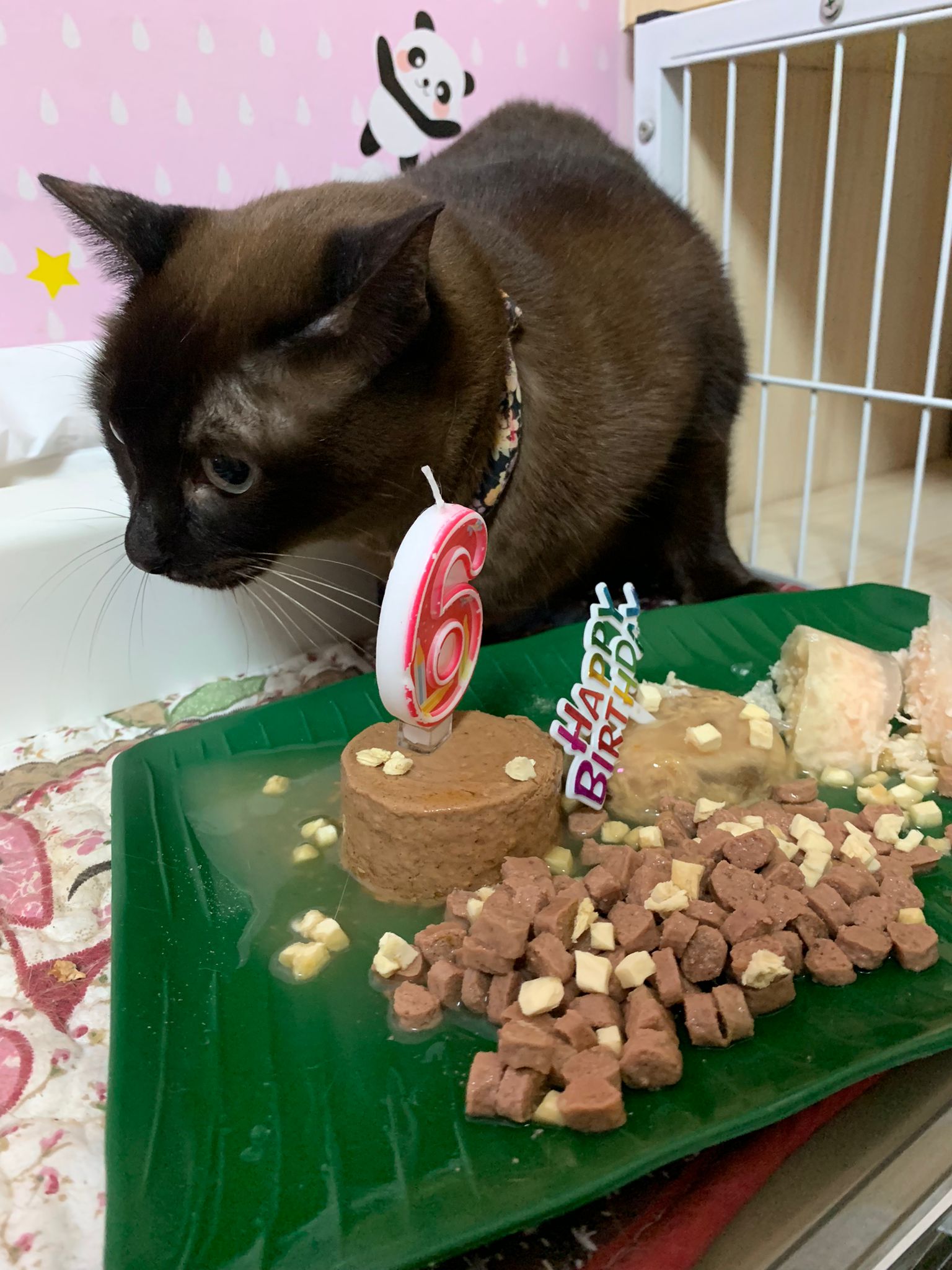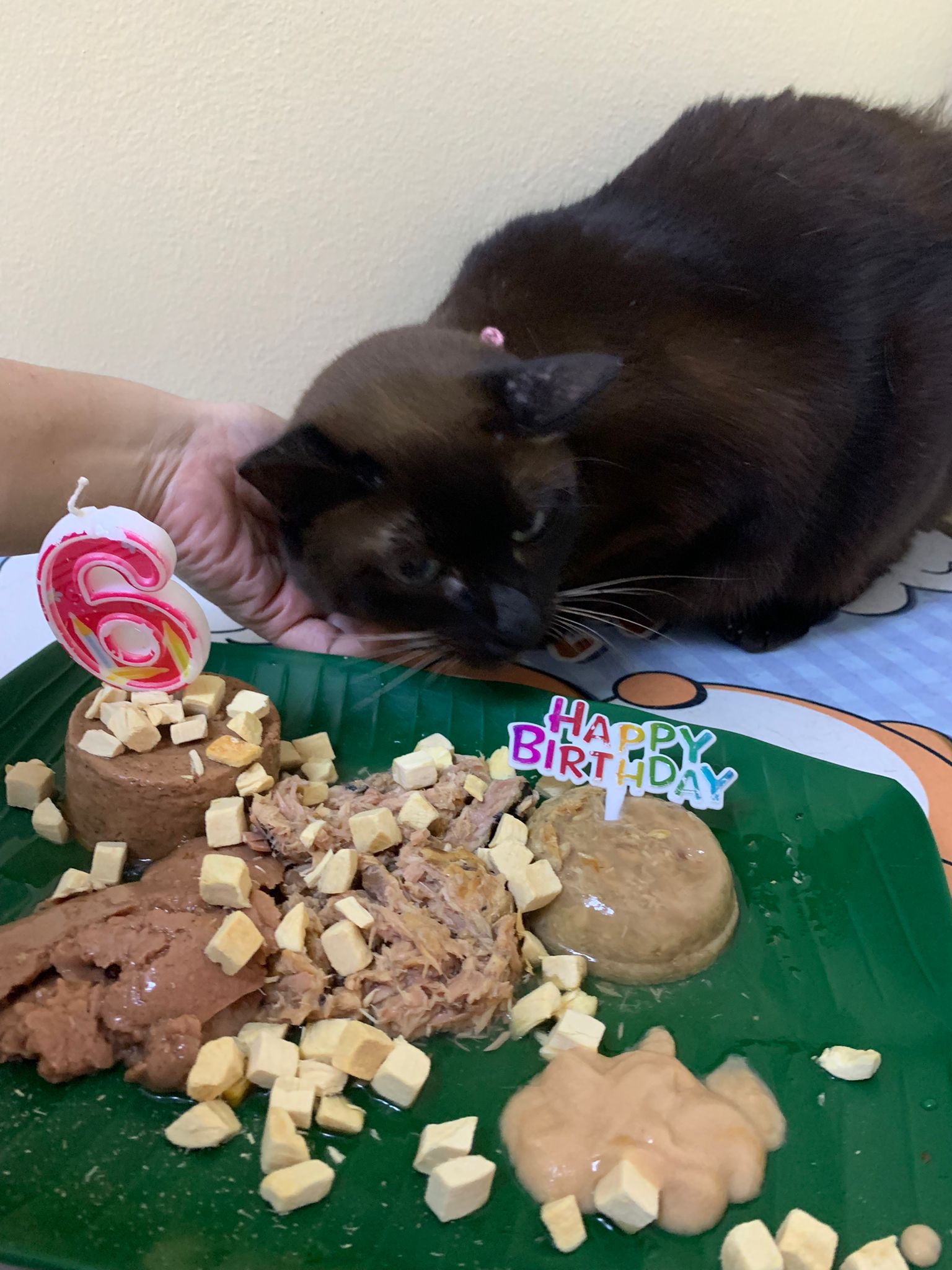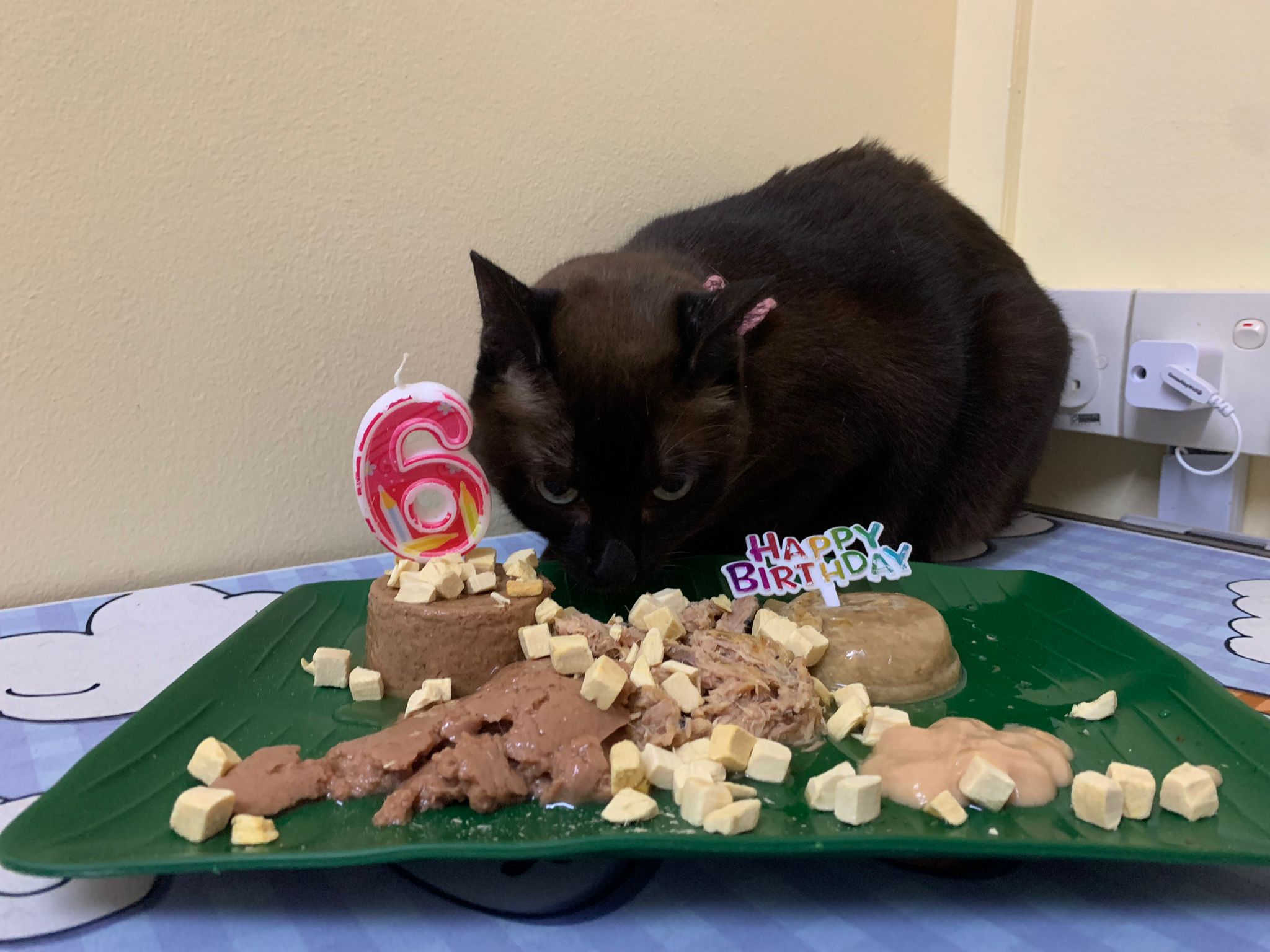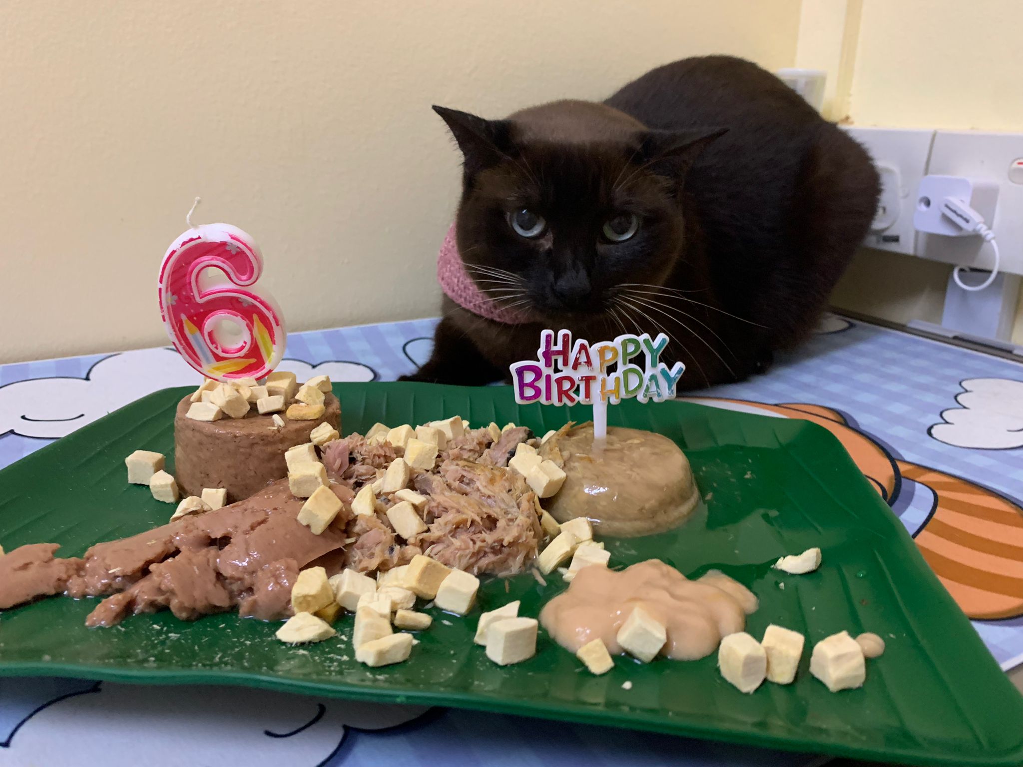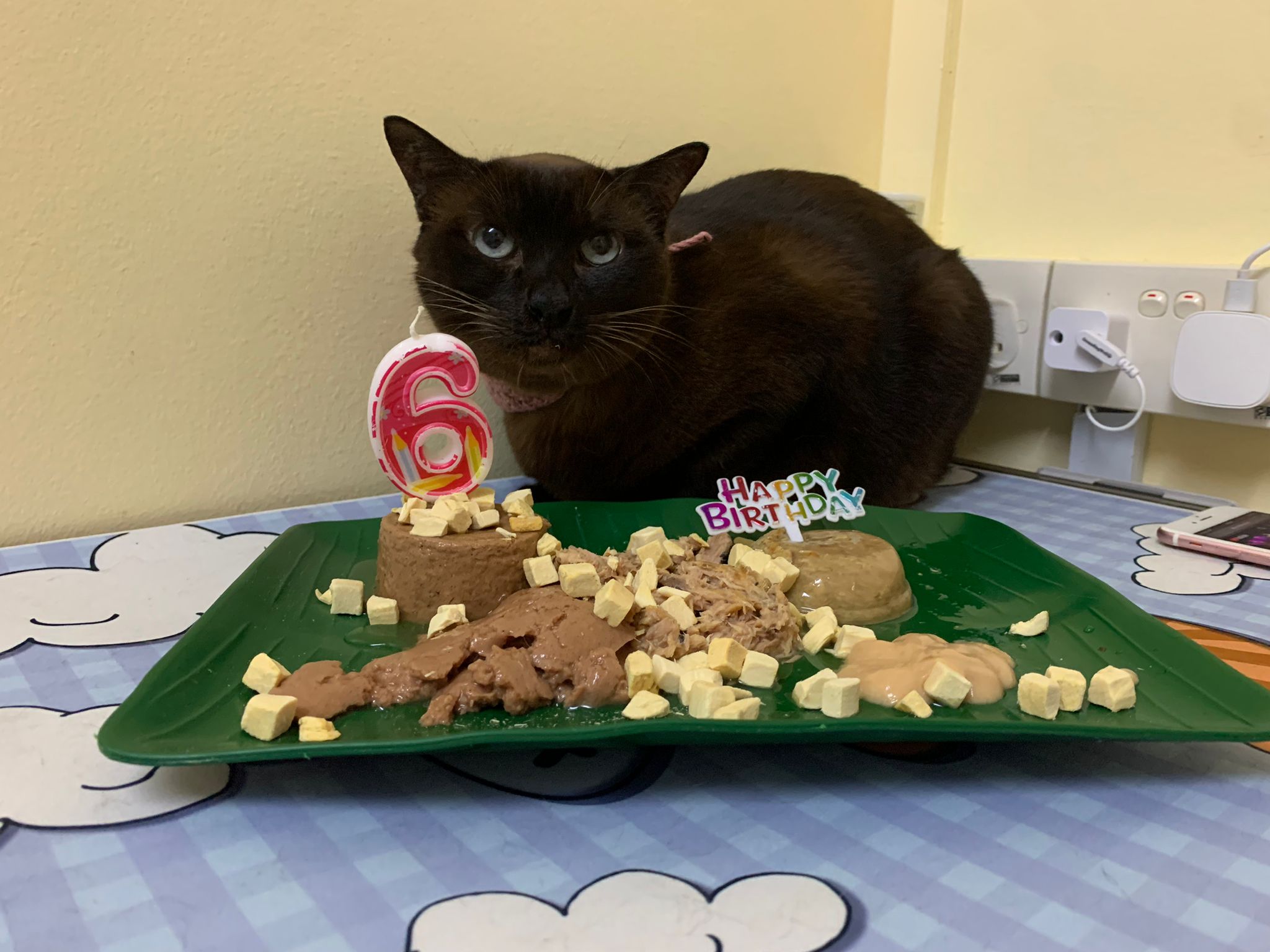Morning: celebrate her 6th bday w her. Eat a little chicken treats and keep running away cos of music and cake plate. b4 that, she keep meow n follow me everywhere n I keep saying happy birthday to her n sayang her. Give her a knitted collar.