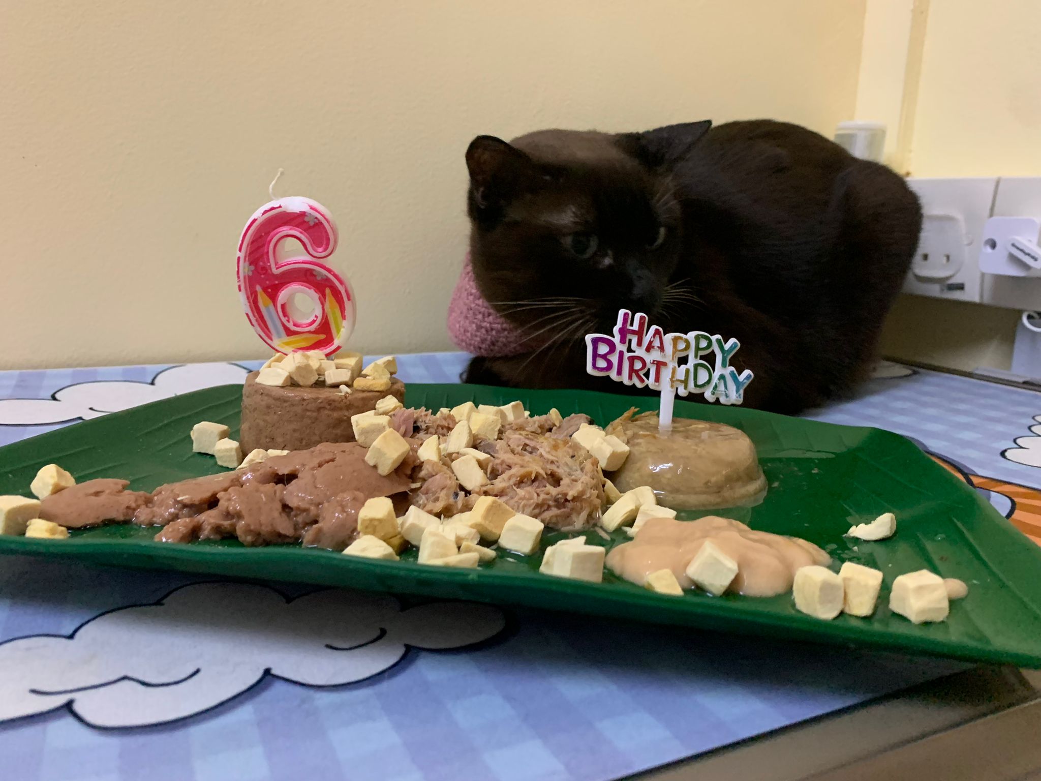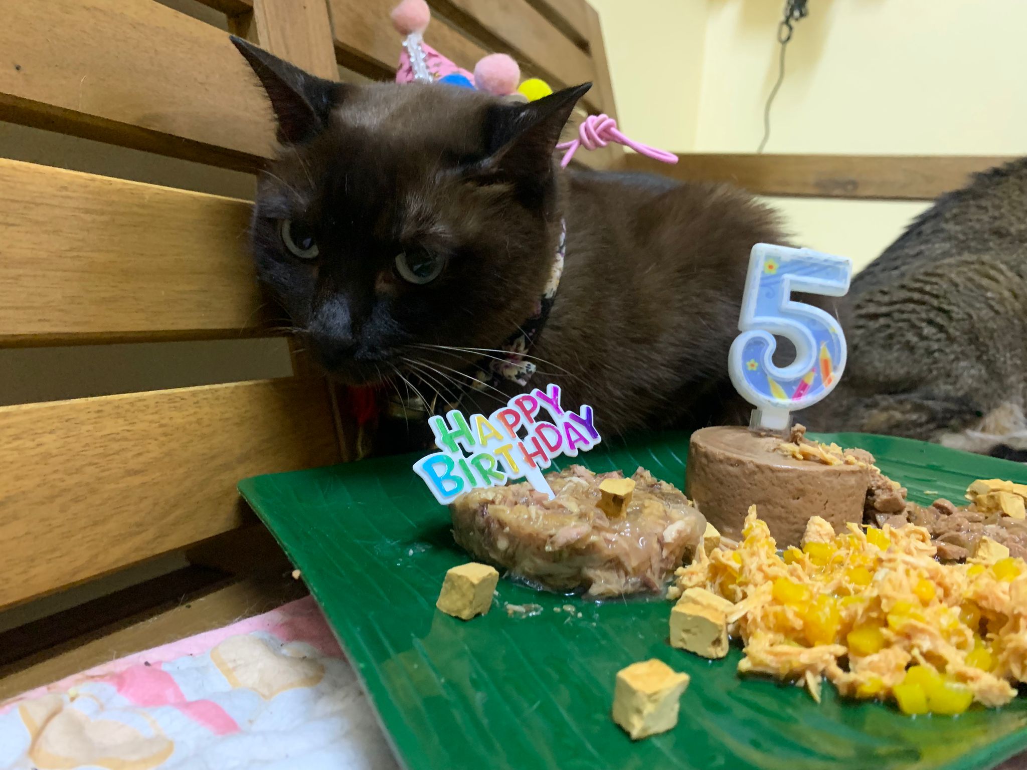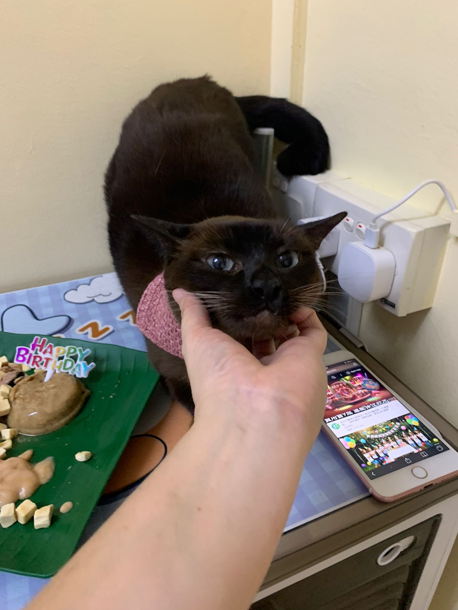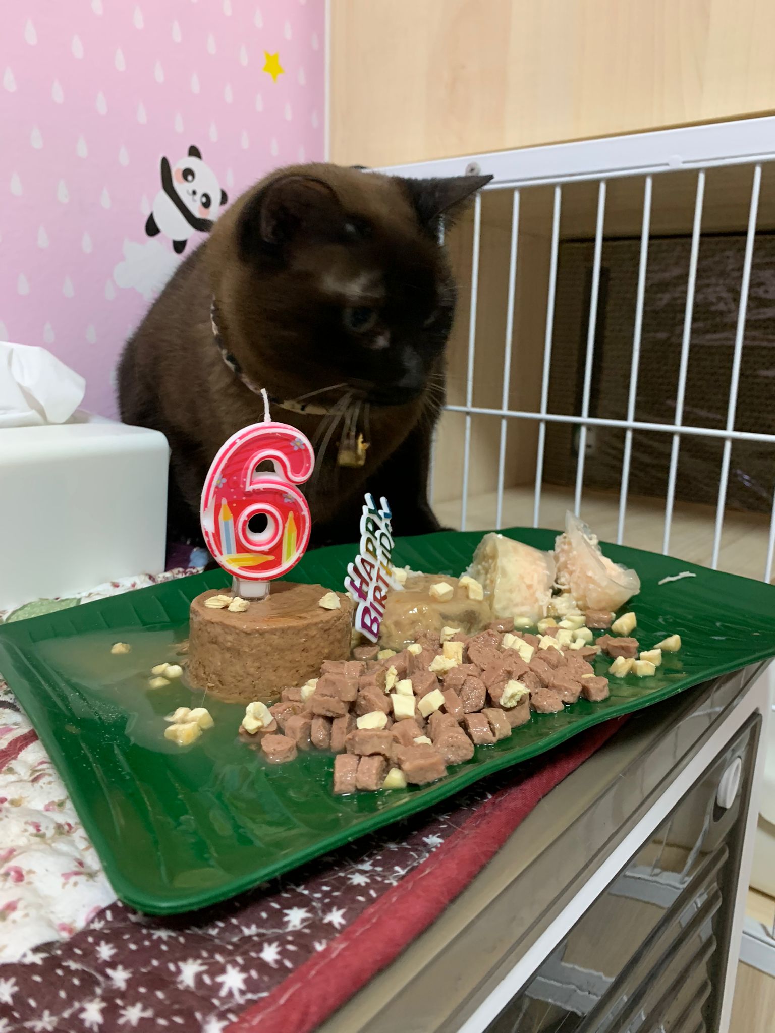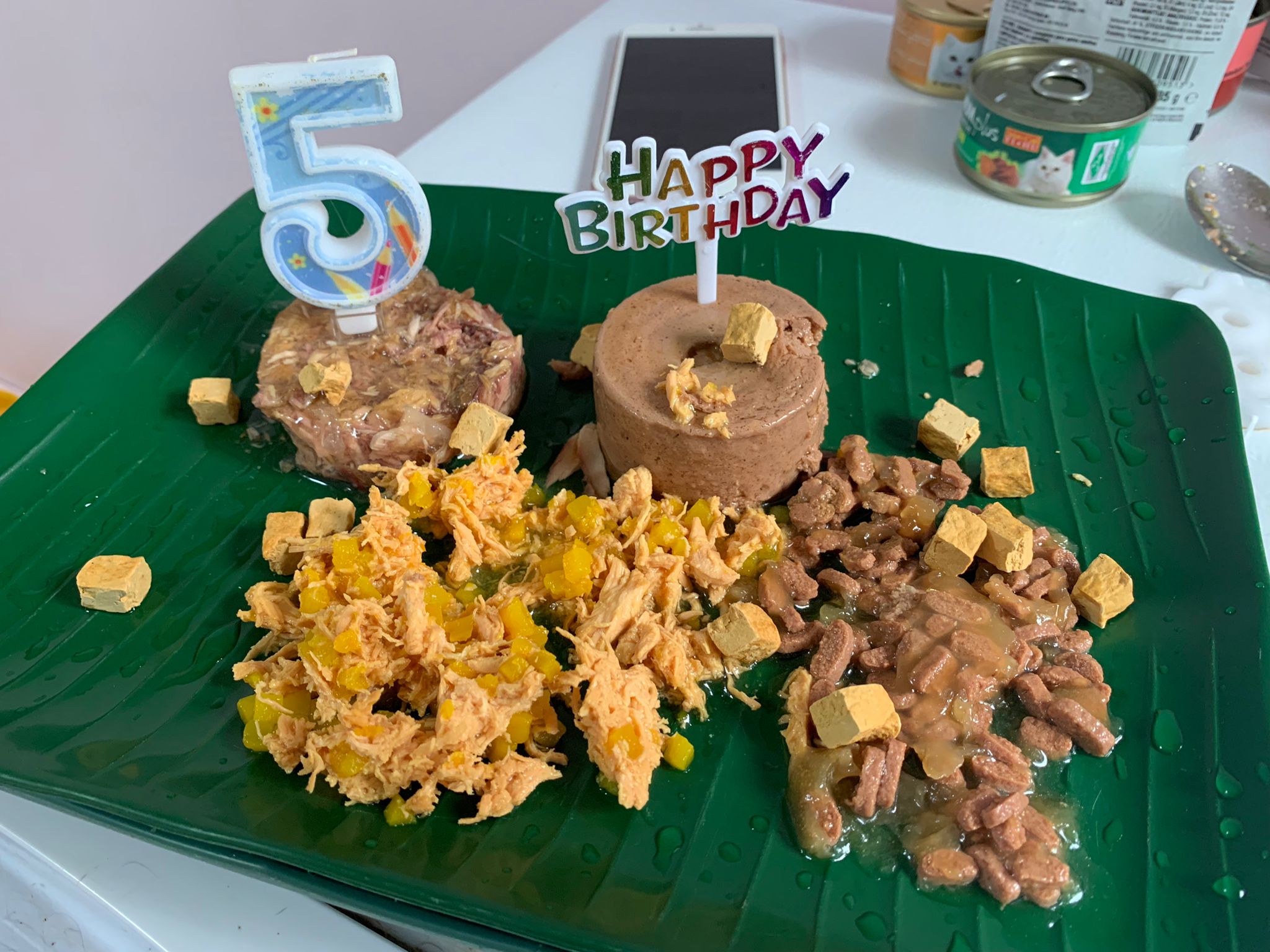 Morning: celebrate her 6th bday w her. Eat a little chicken treats and keep running away cos of music and cake plate. b4 that, she keep meow n follow me everywhere n I keep saying happy birthday to her n sayang her. Give her a knitted collar.