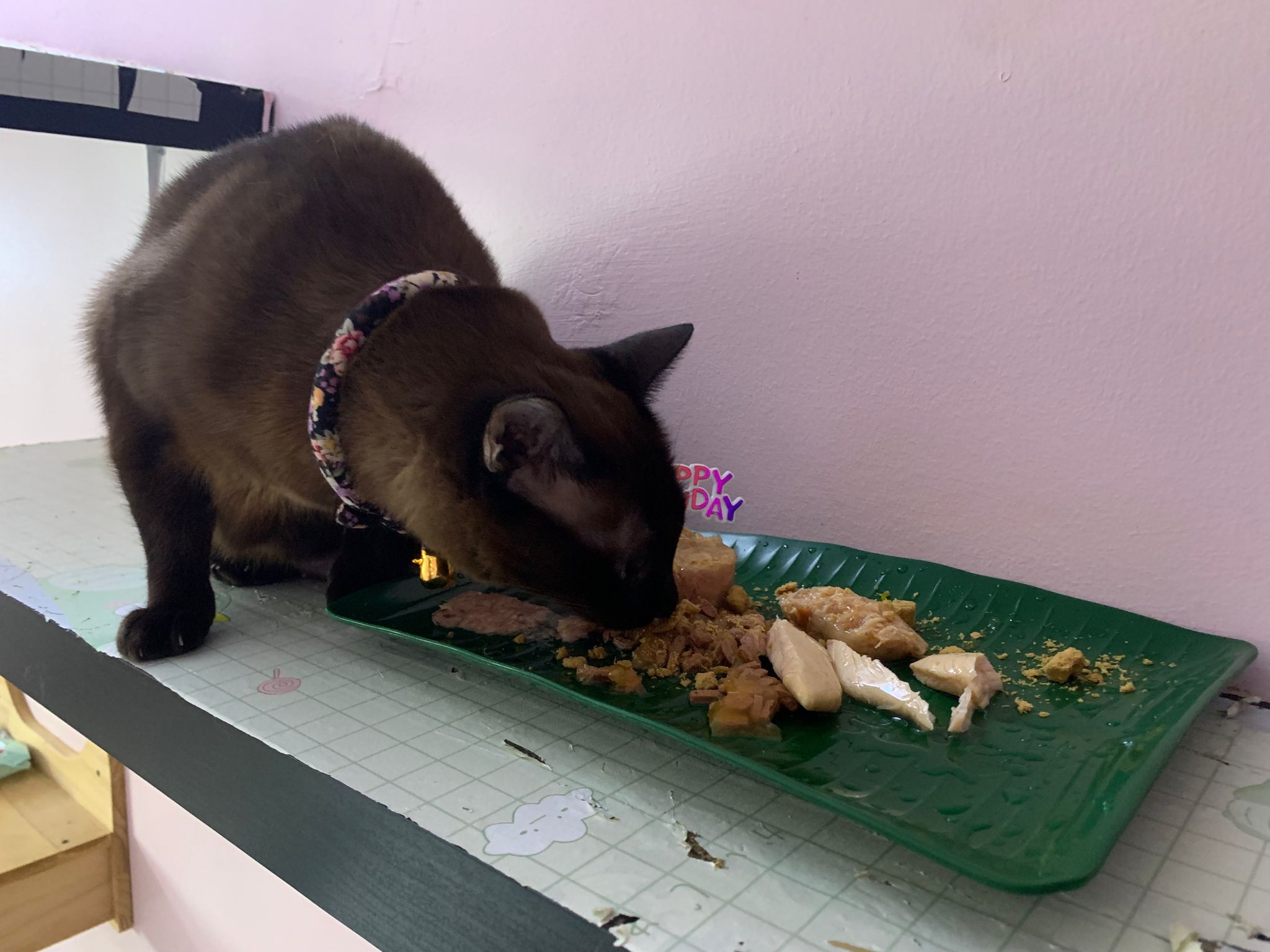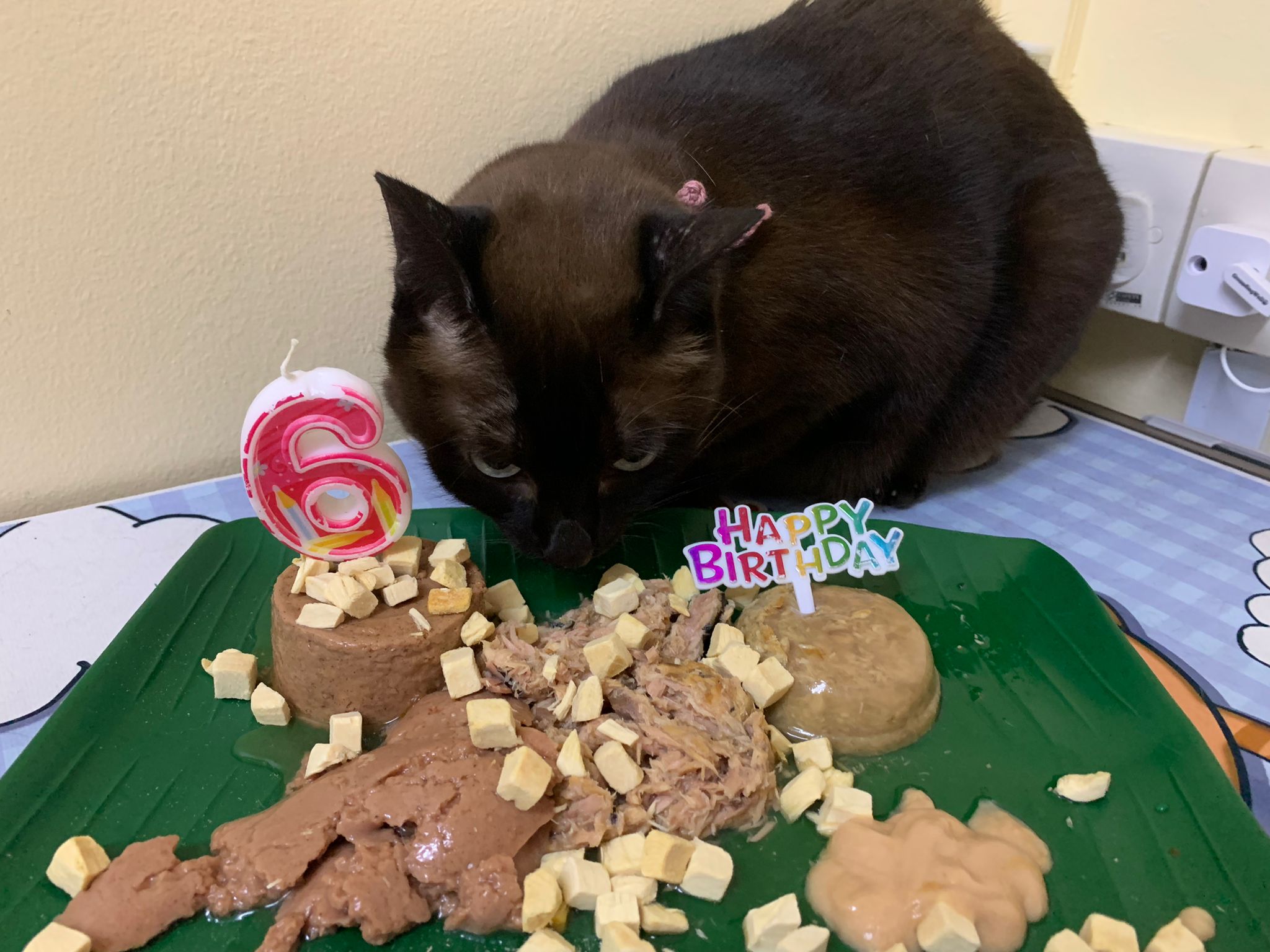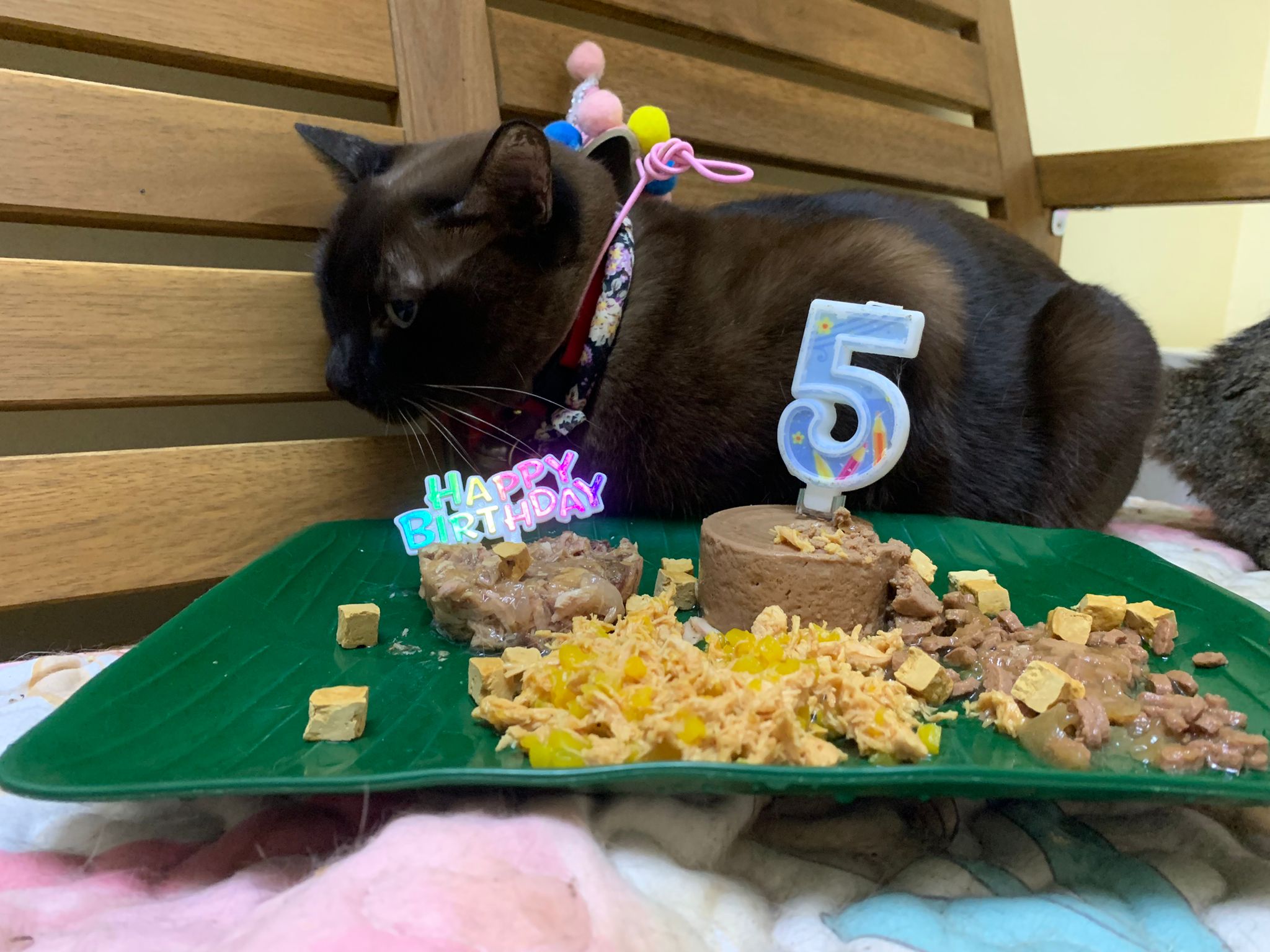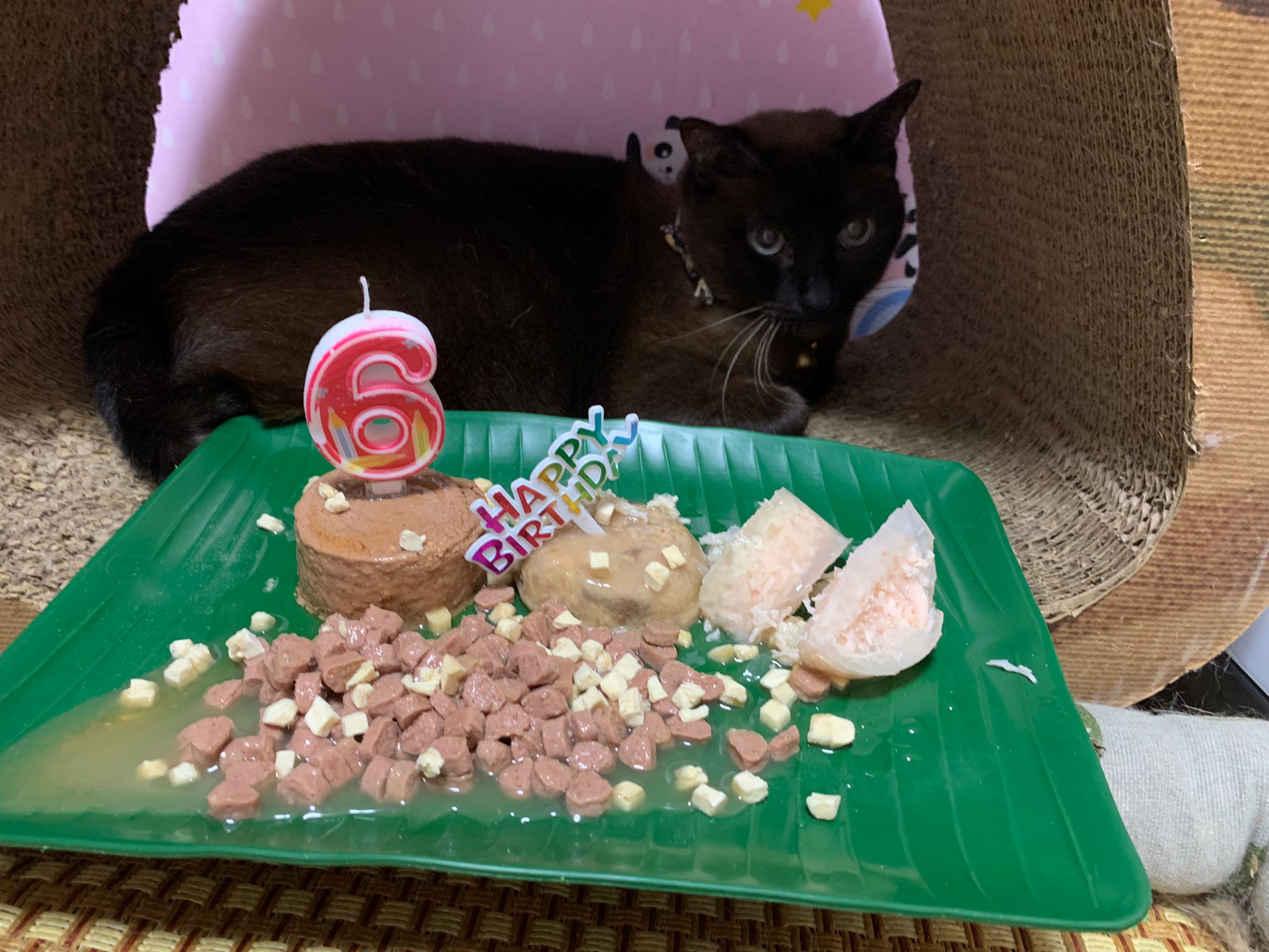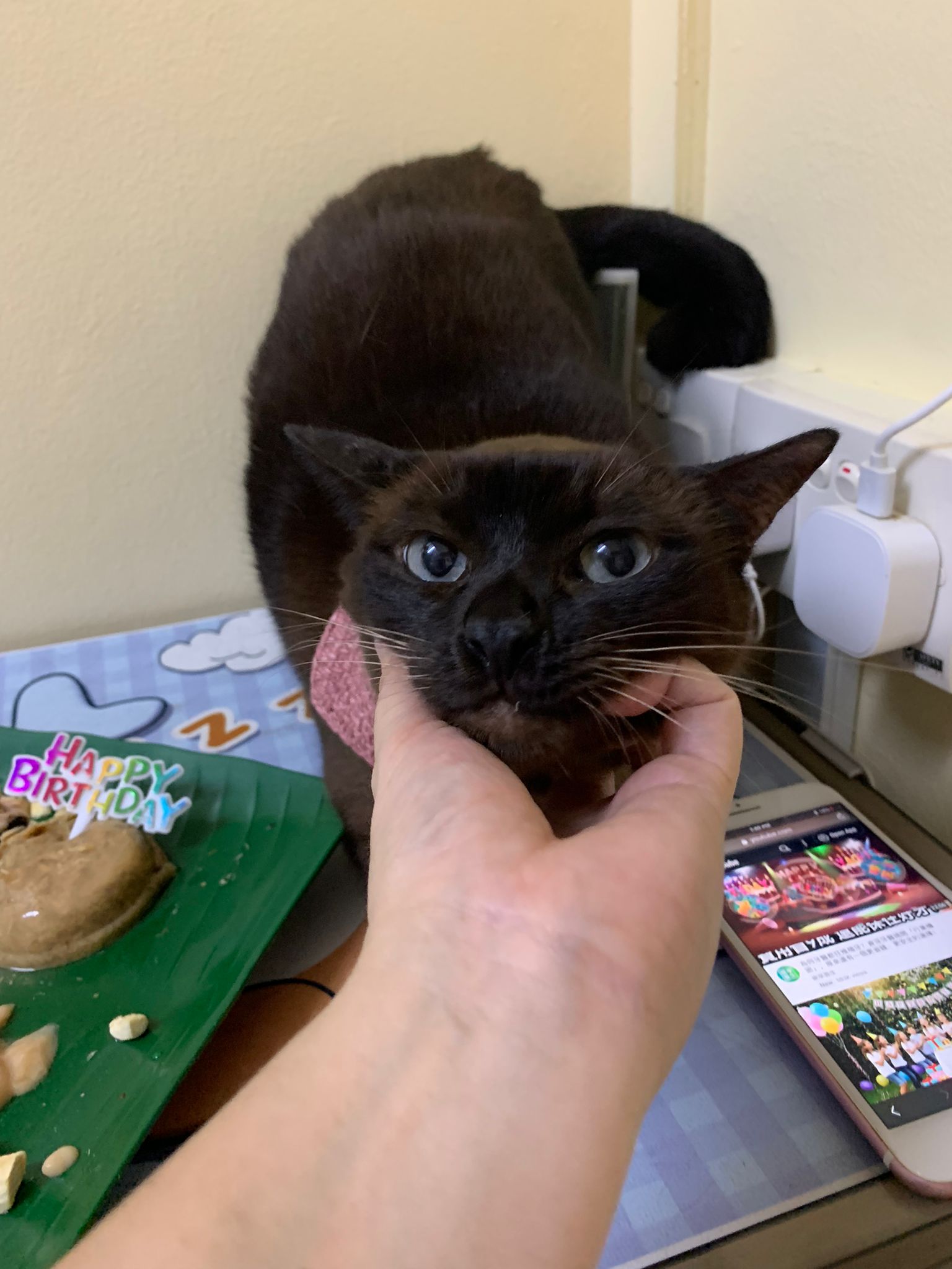 Morning: celebrate her 6th bday w her. Eat a little chicken treats and keep running away cos of music and cake plate. b4 that, she keep meow n follow me everywhere n I keep saying happy birthday to her n sayang her. Give her a knitted collar.