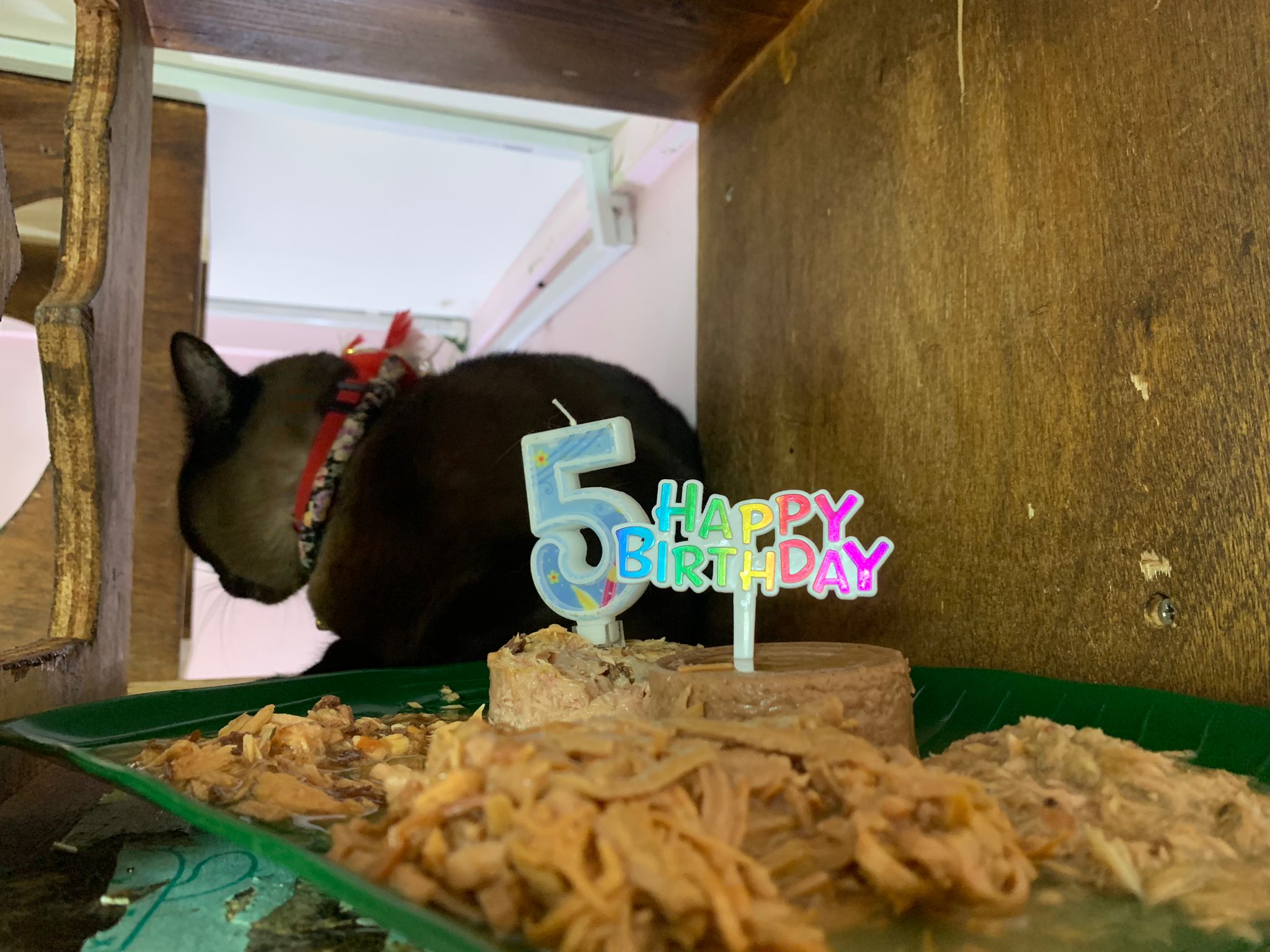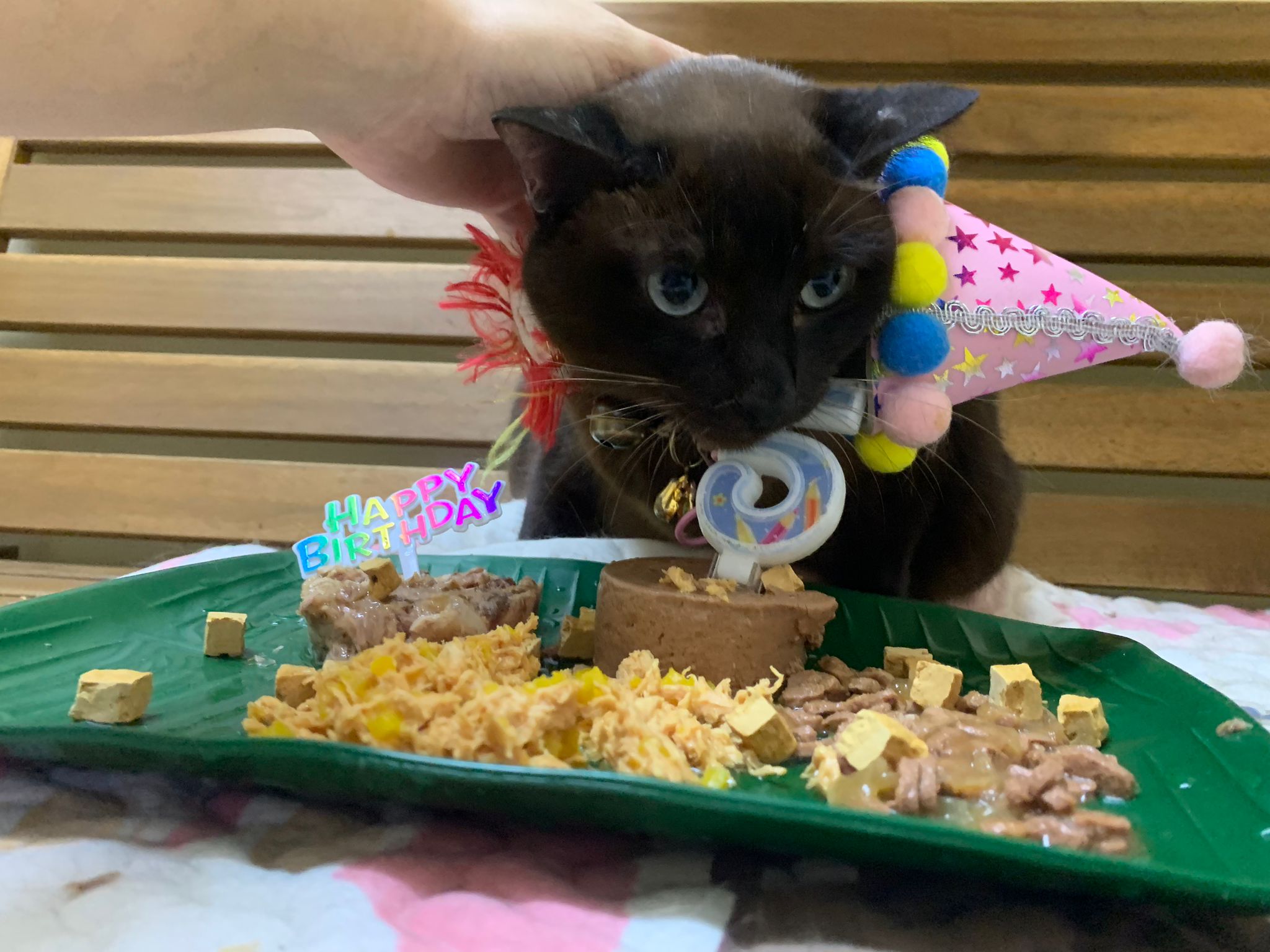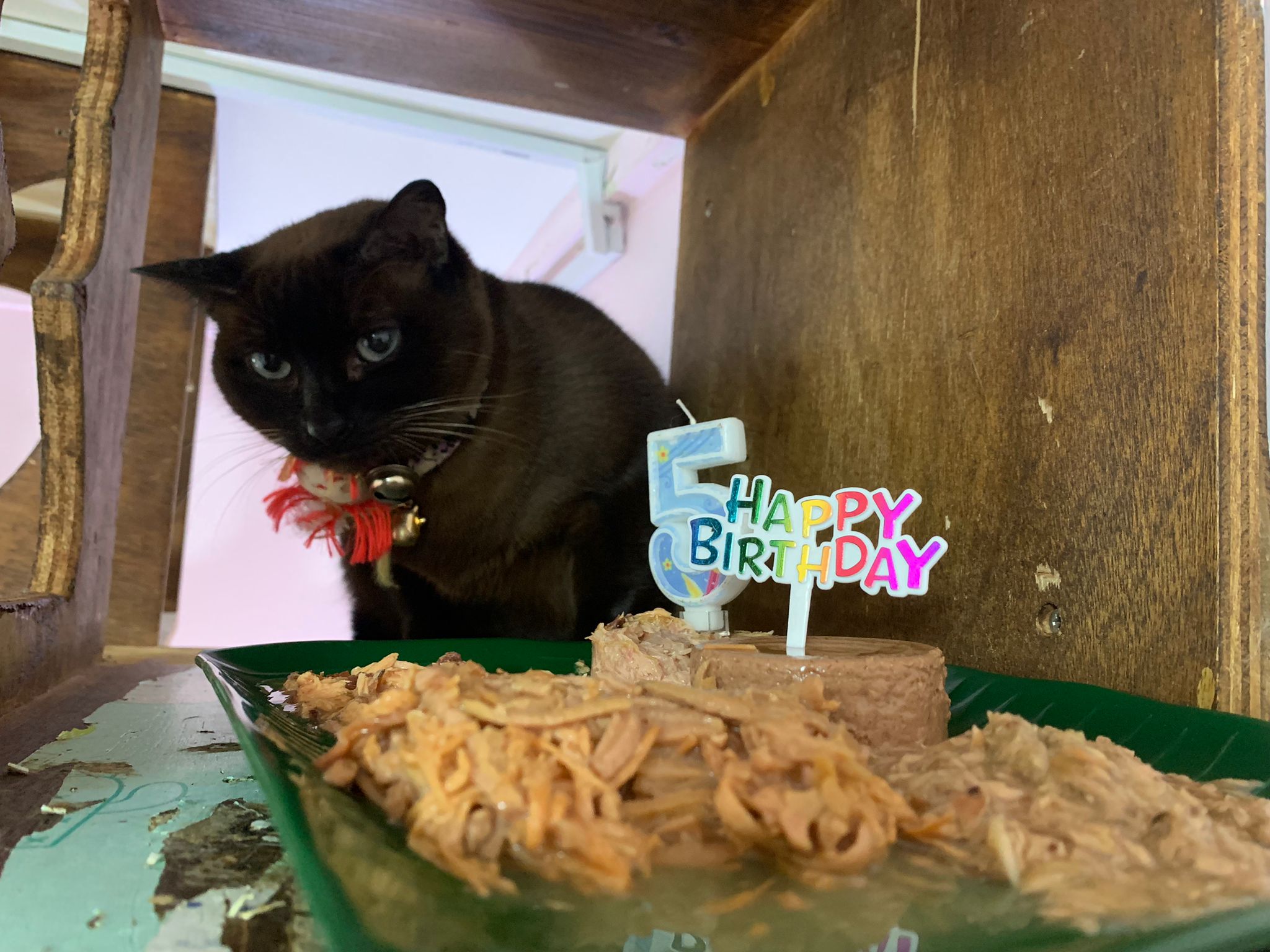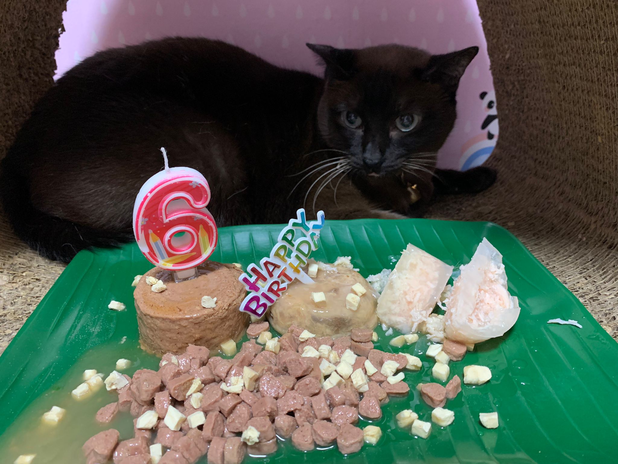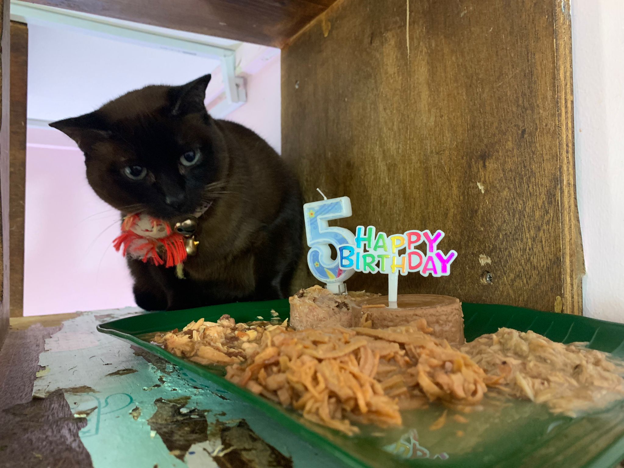 Morning: celebrate her 6th bday w her. Eat a little chicken treats and keep running away cos of music and cake plate. b4 that, she keep meow n follow me everywhere n I keep saying happy birthday to her n sayang her. Give her a knitted collar.