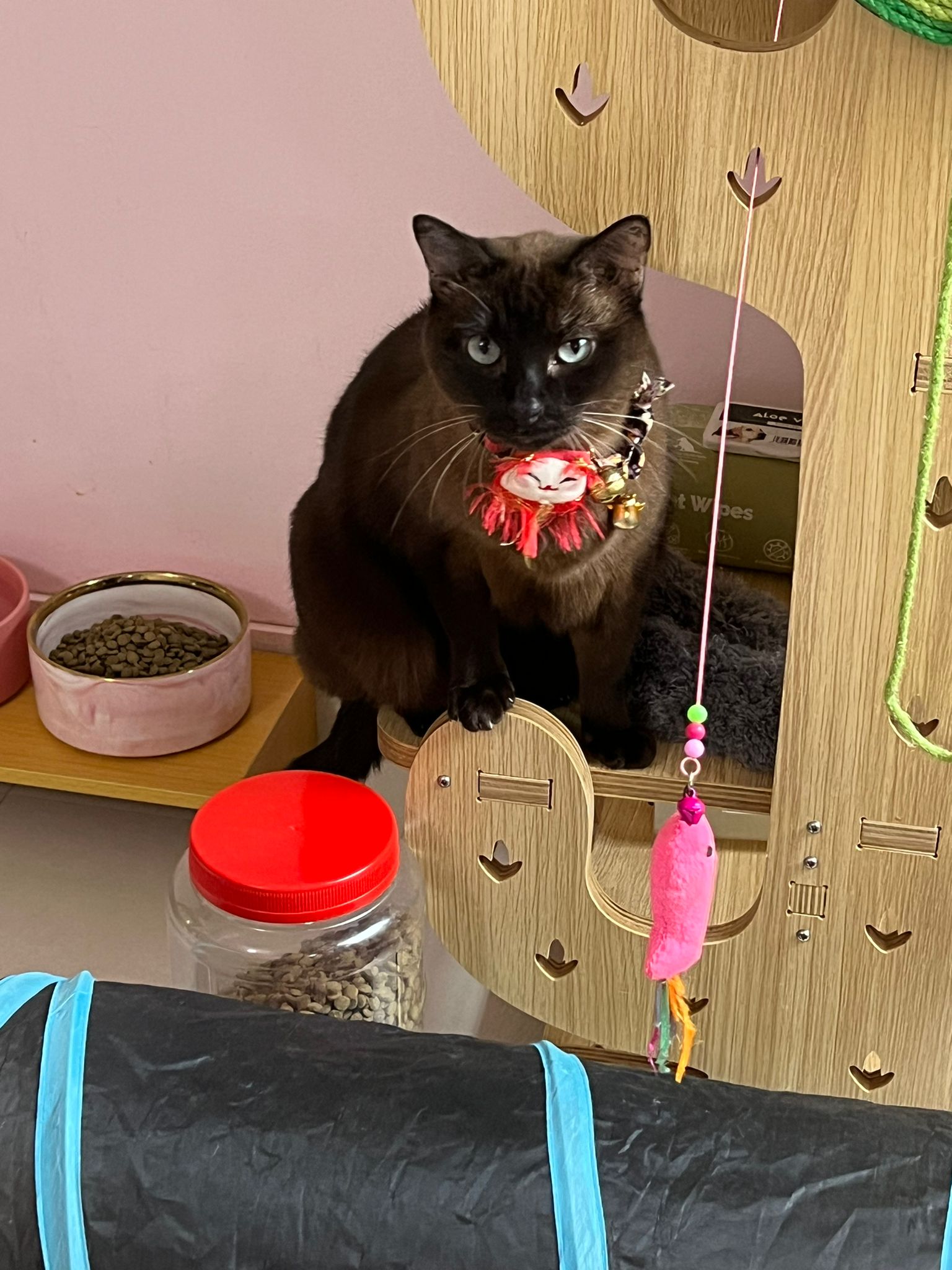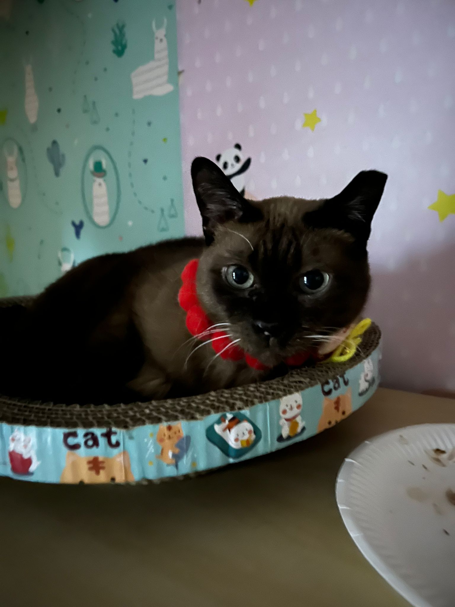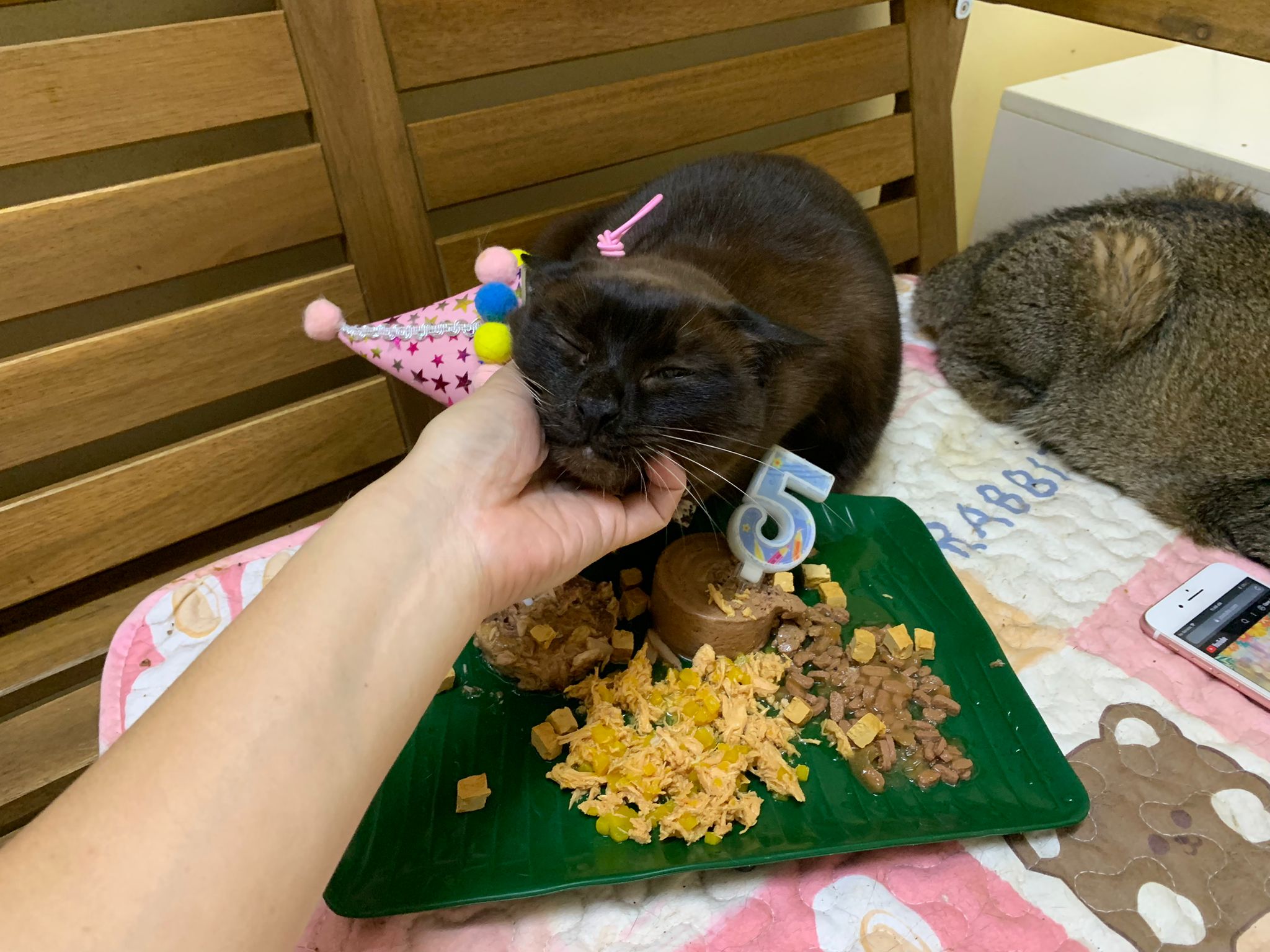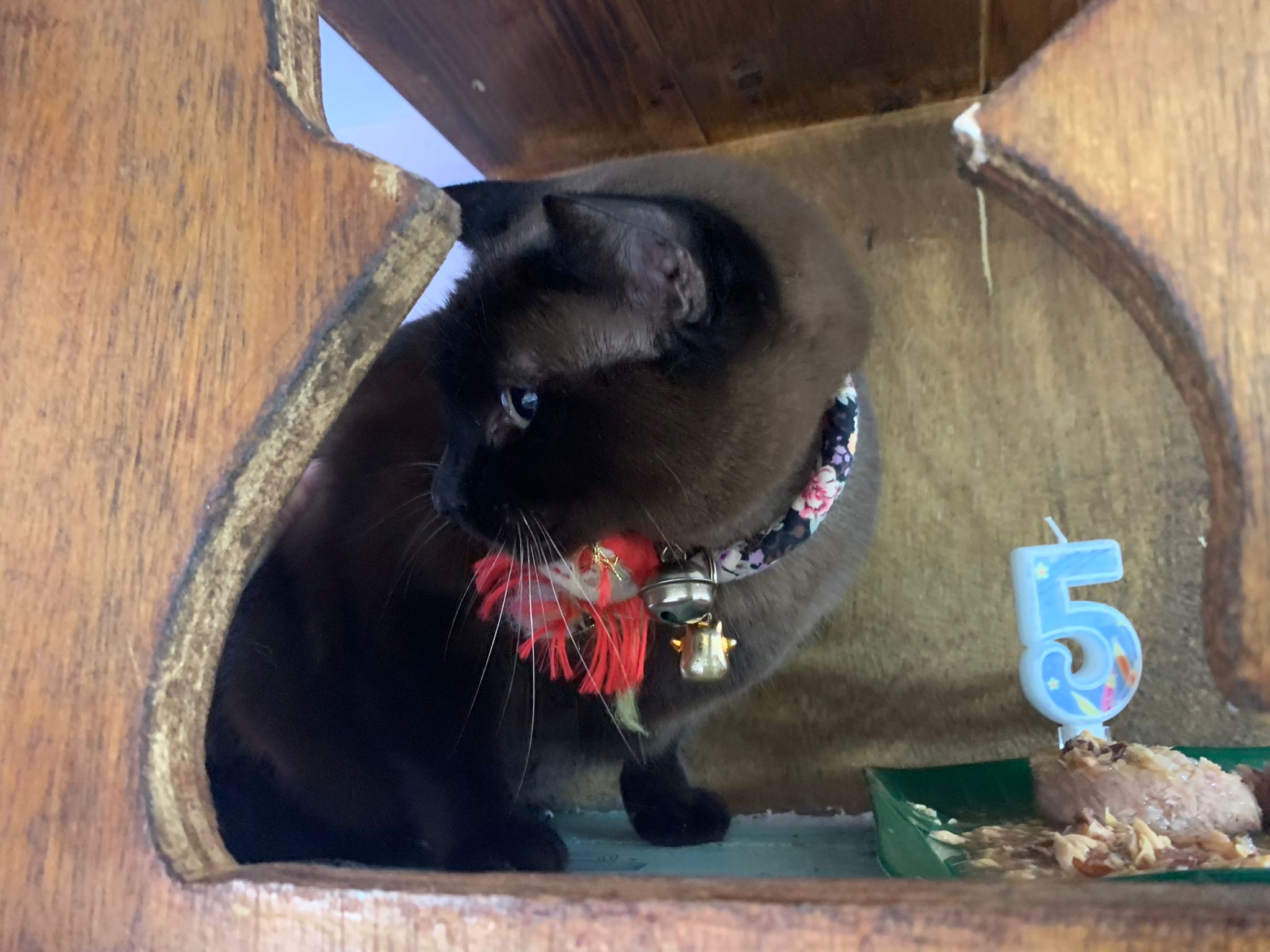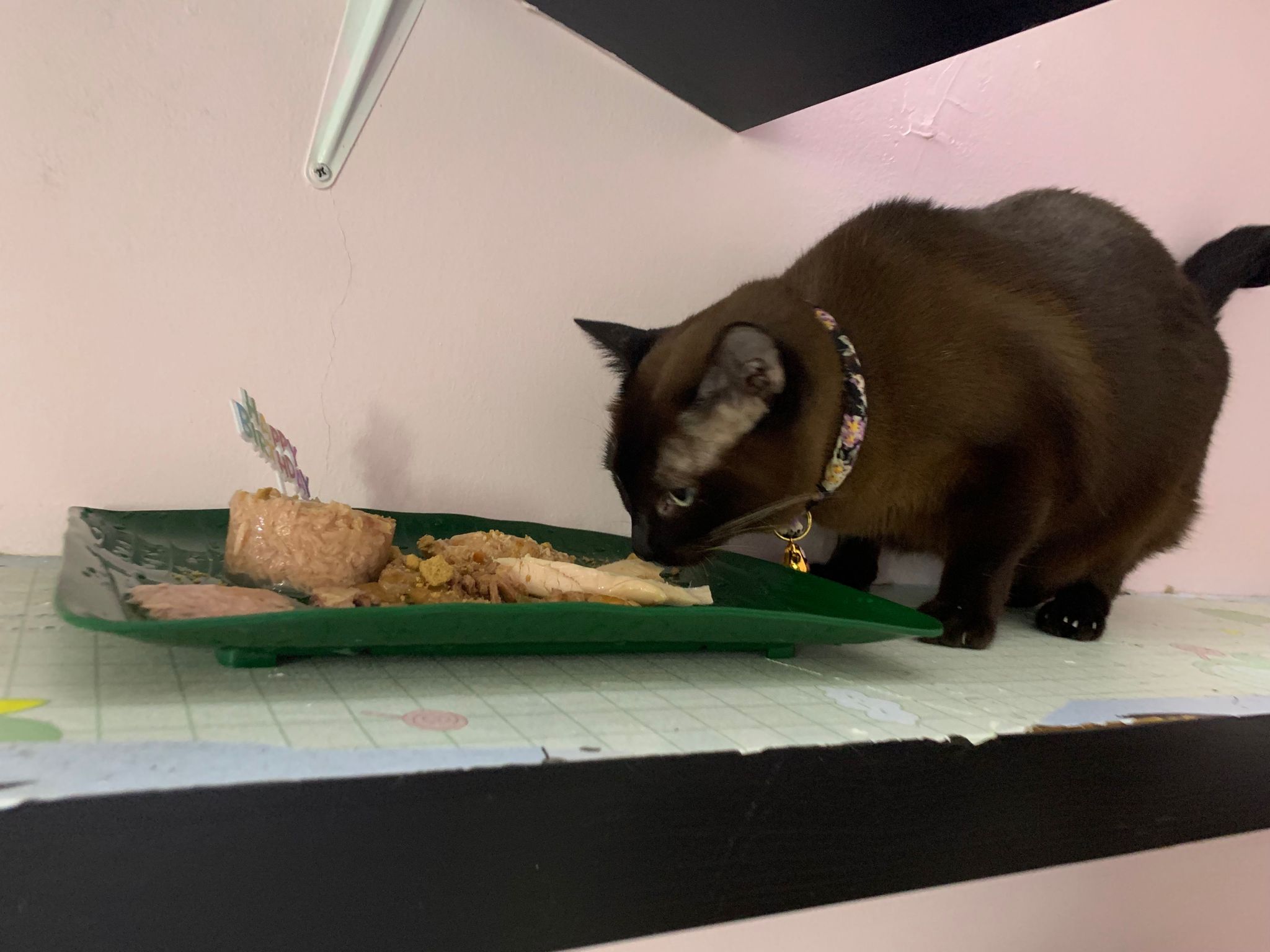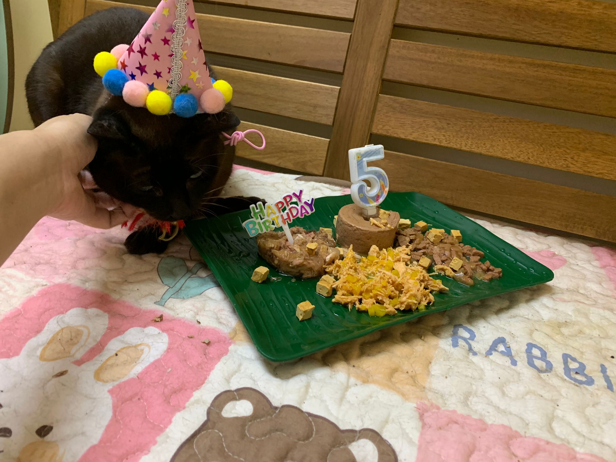 Morning: celebrate her 6th bday w her. Eat a little chicken treats and keep running away cos of music and cake plate. b4 that, she keep meow n follow me everywhere n I keep saying happy birthday to her n sayang her. Give her a knitted collar.