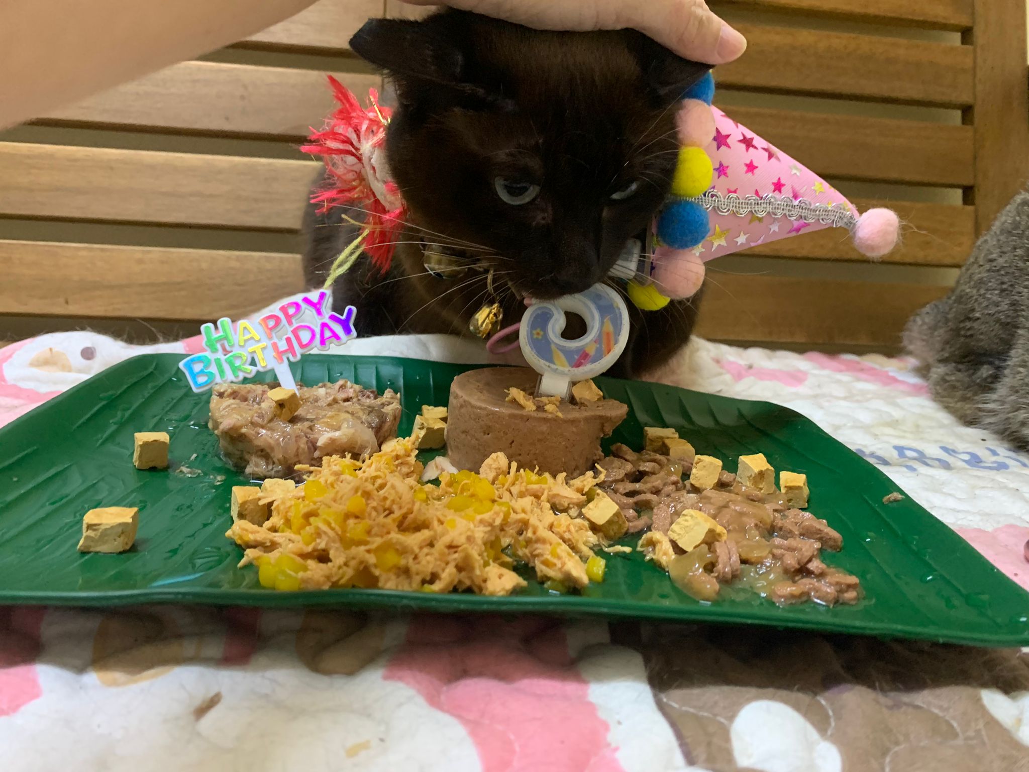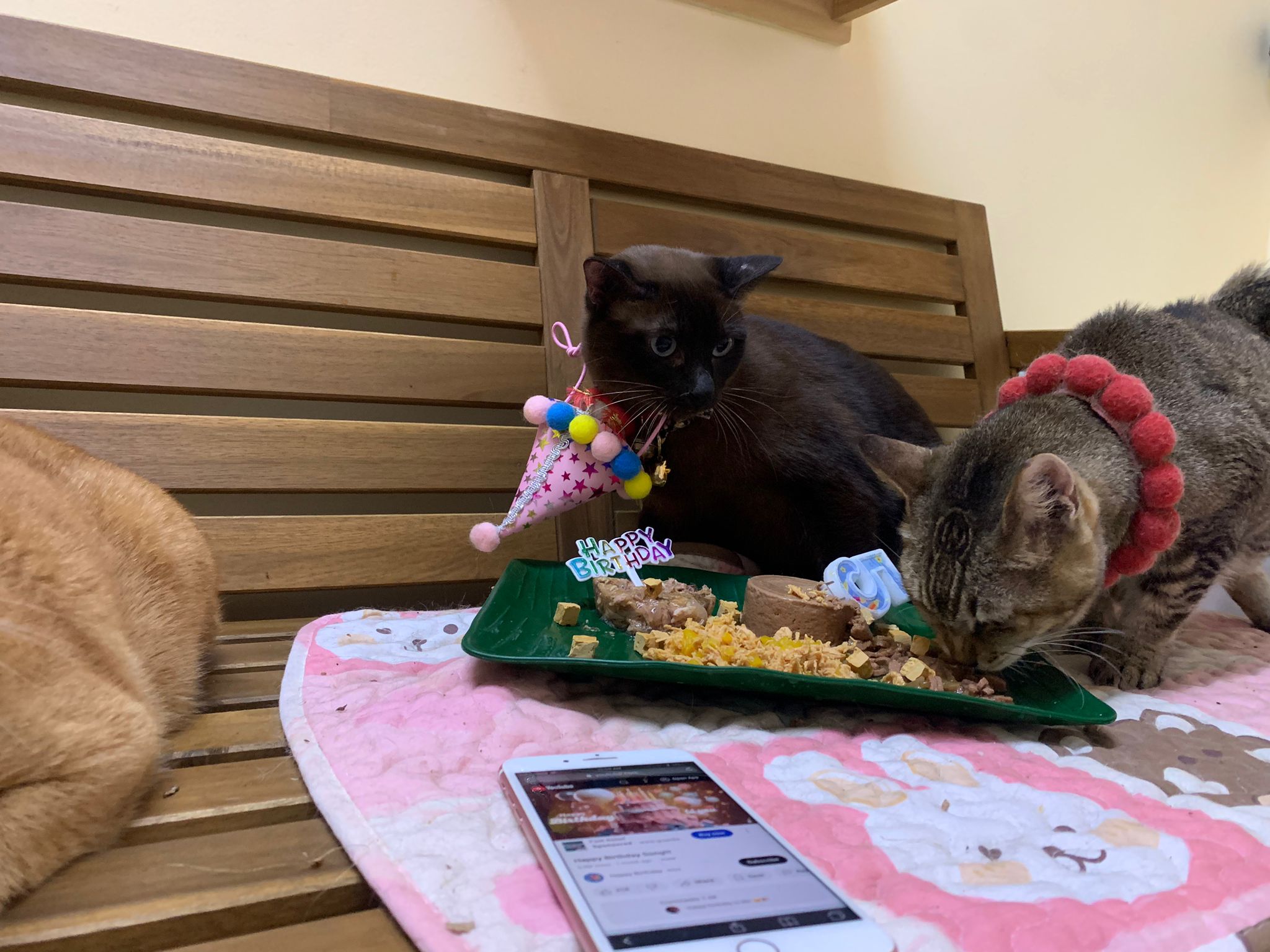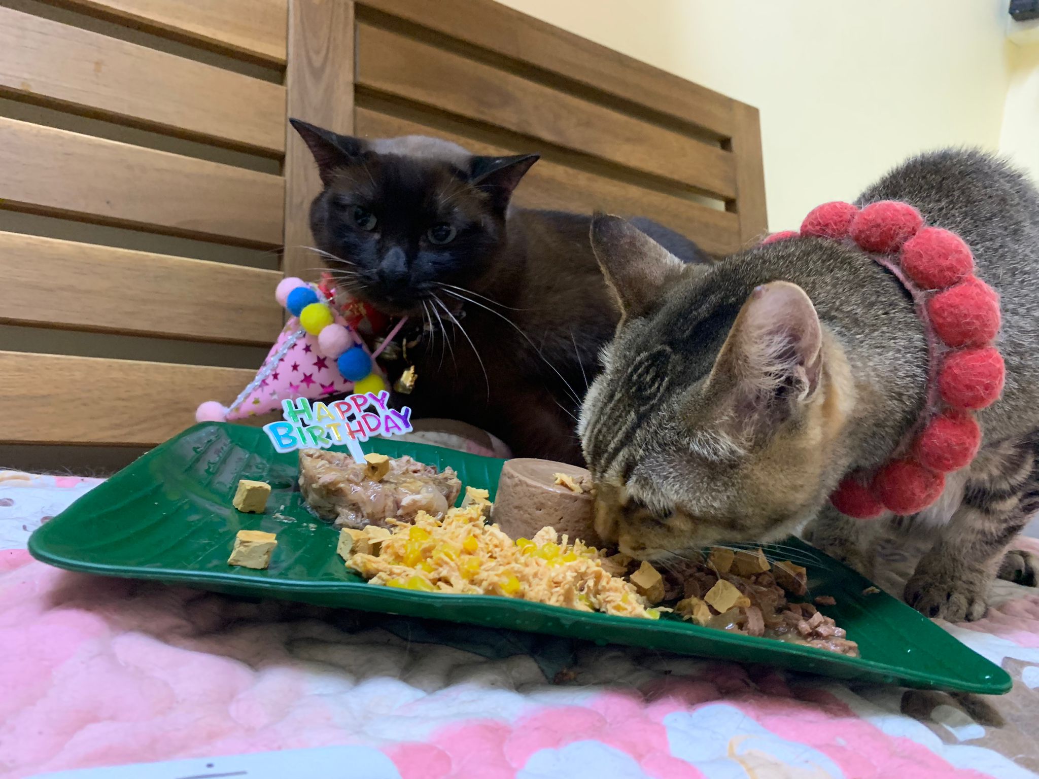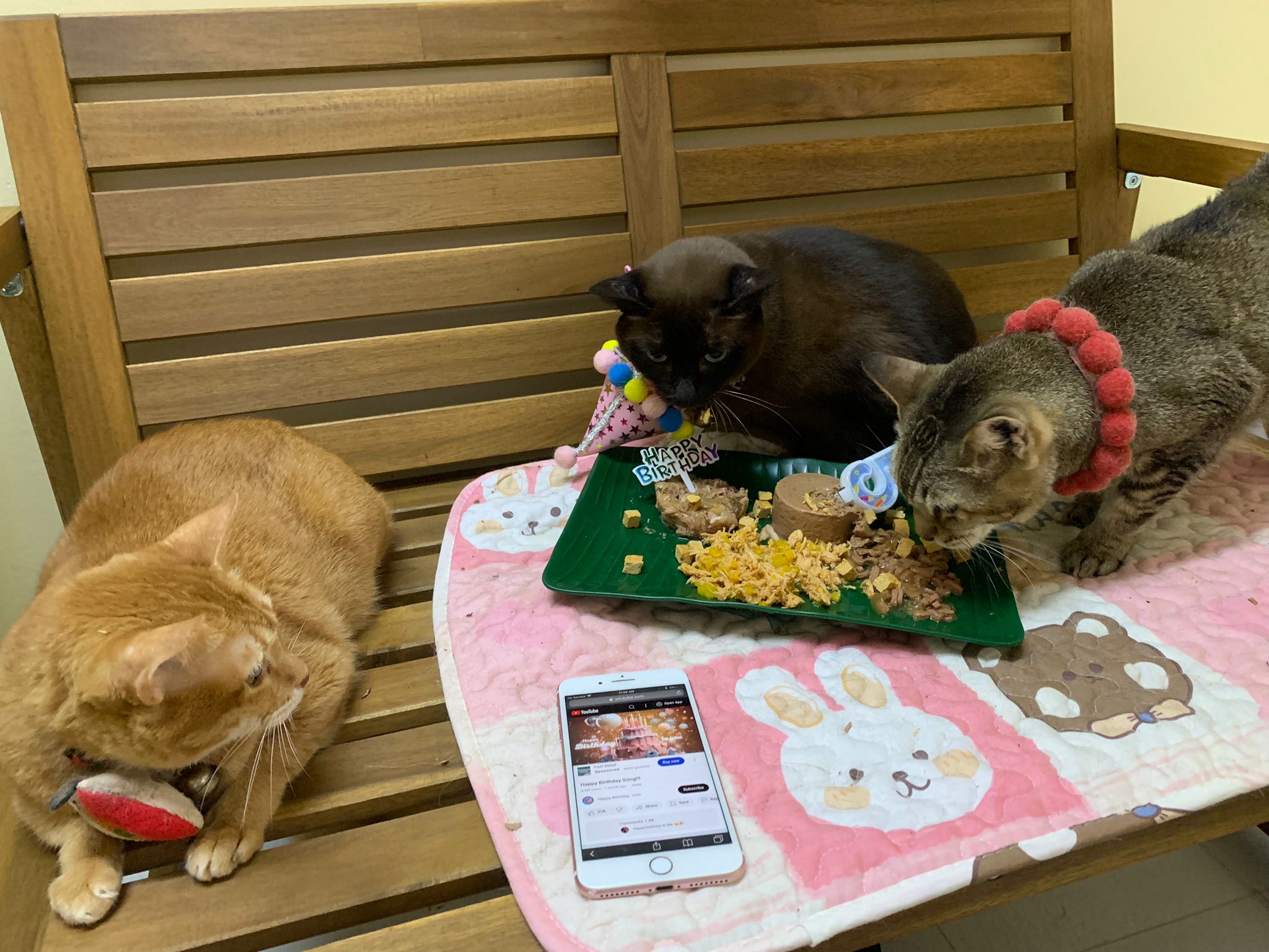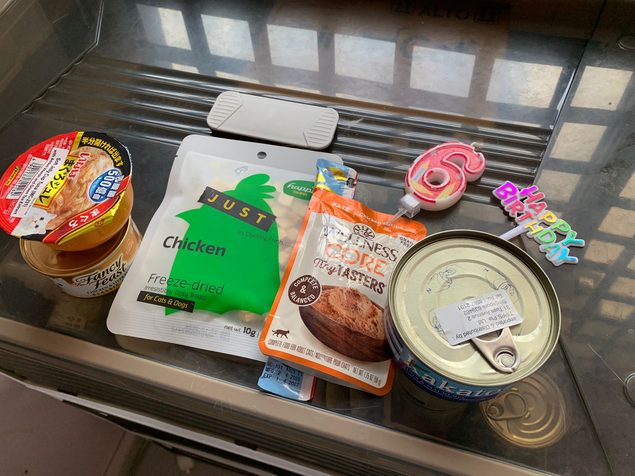 Morning: celebrate her 6th bday w her. Eat a little chicken treats and keep running away cos of music and cake plate. b4 that, she keep meow n follow me everywhere n I keep saying happy birthday to her n sayang her. Give her a knitted collar.