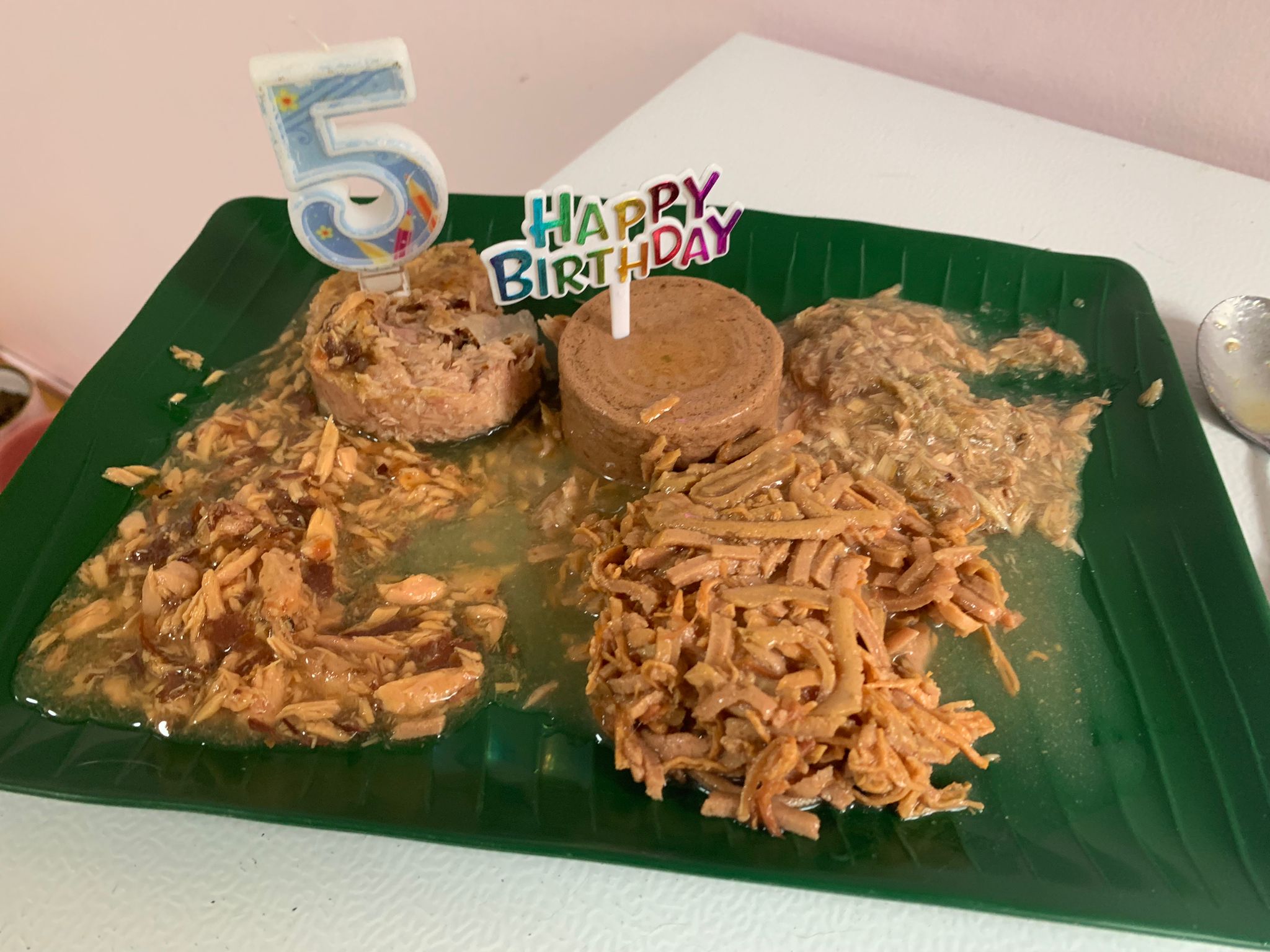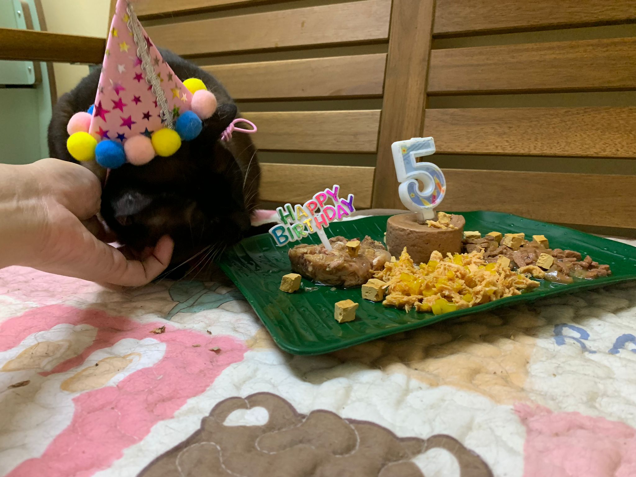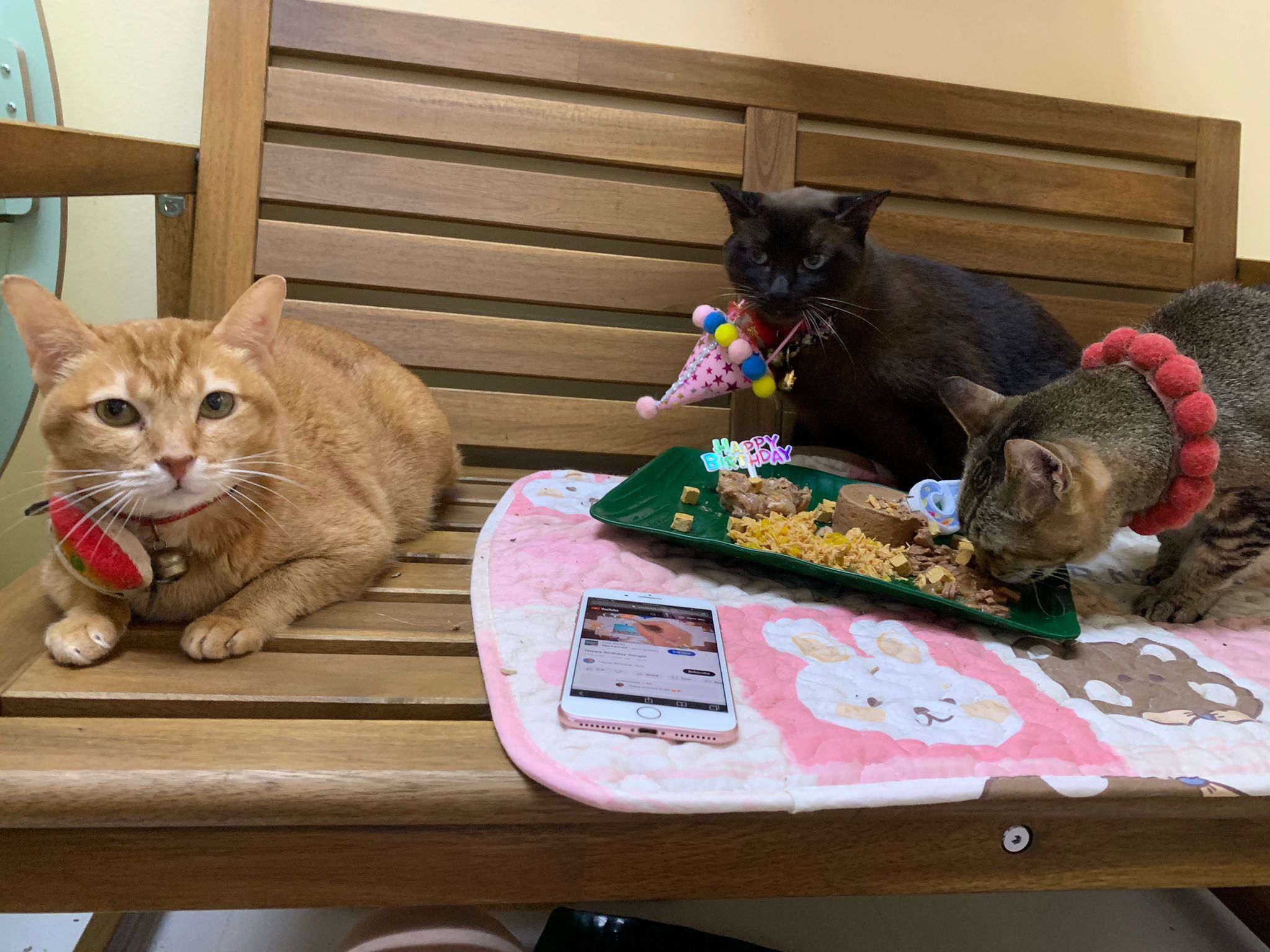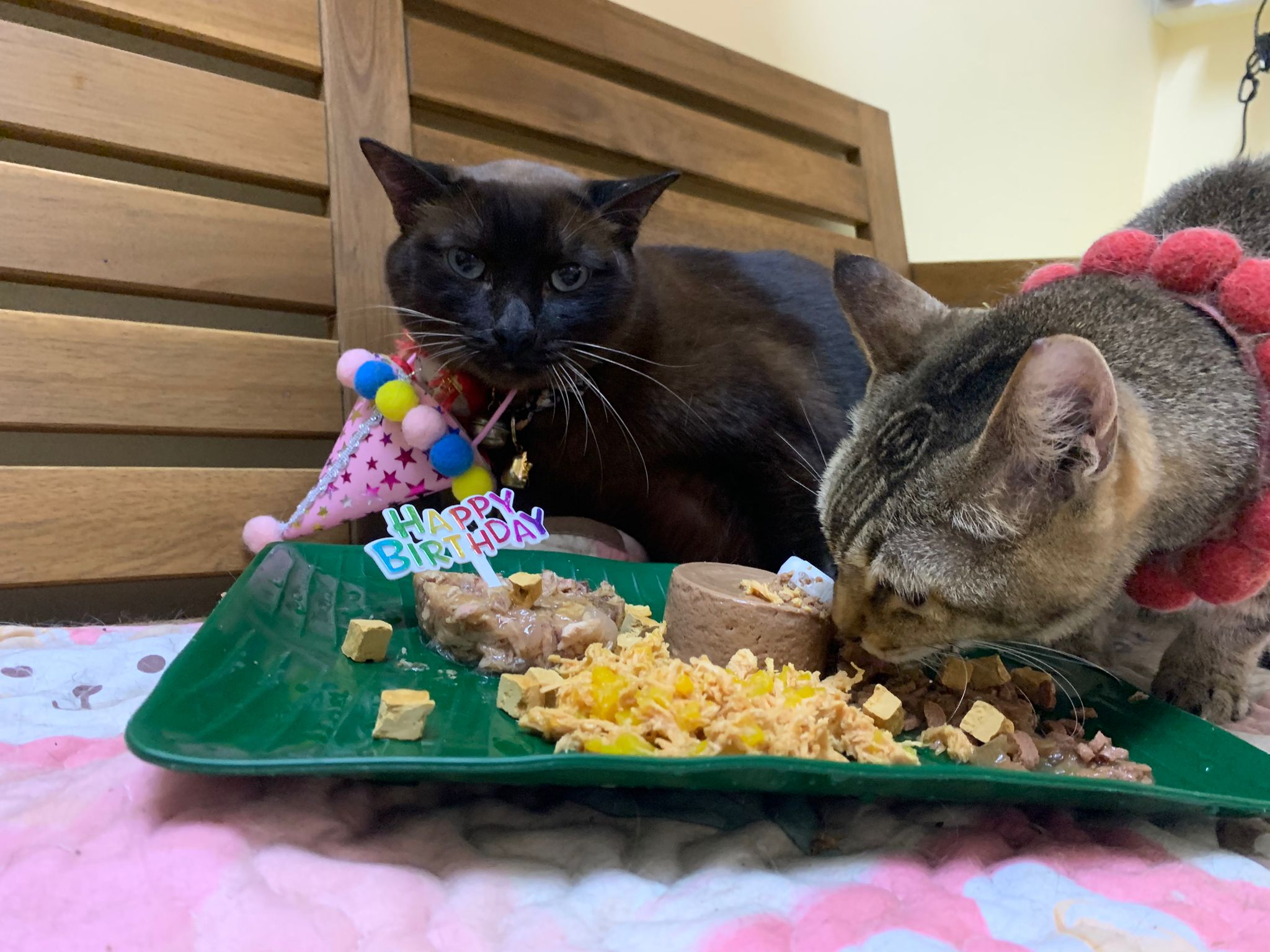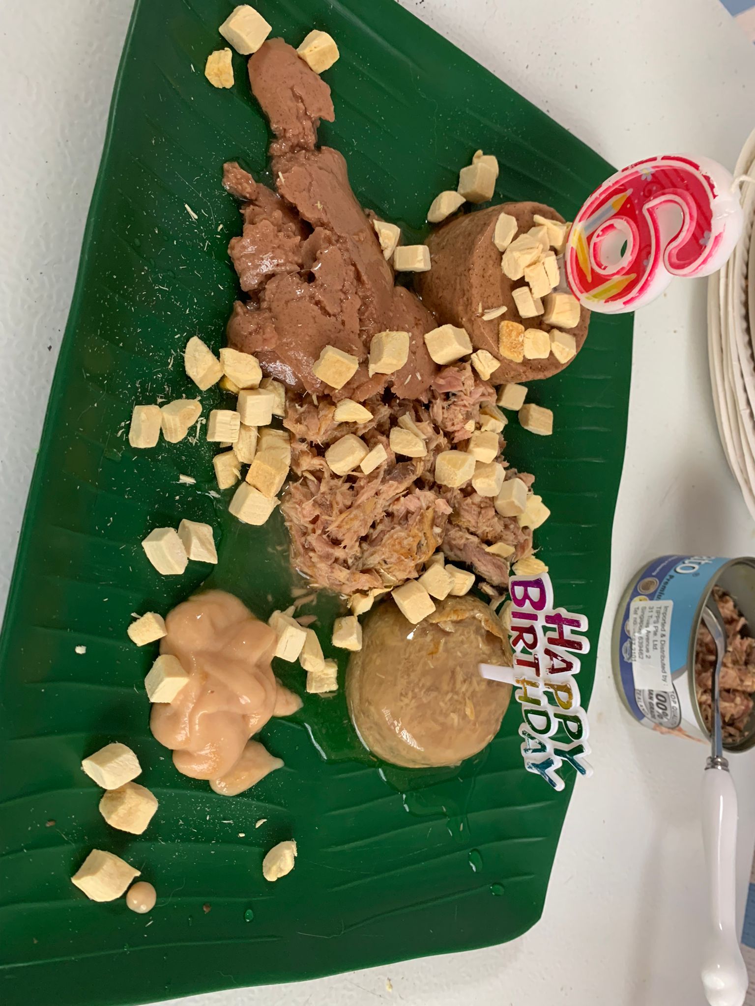 Morning: celebrate her 6th bday w her. Eat a little chicken treats and keep running away cos of music and cake plate. b4 that, she keep meow n follow me everywhere n I keep saying happy birthday to her n sayang her. Give her a knitted collar.