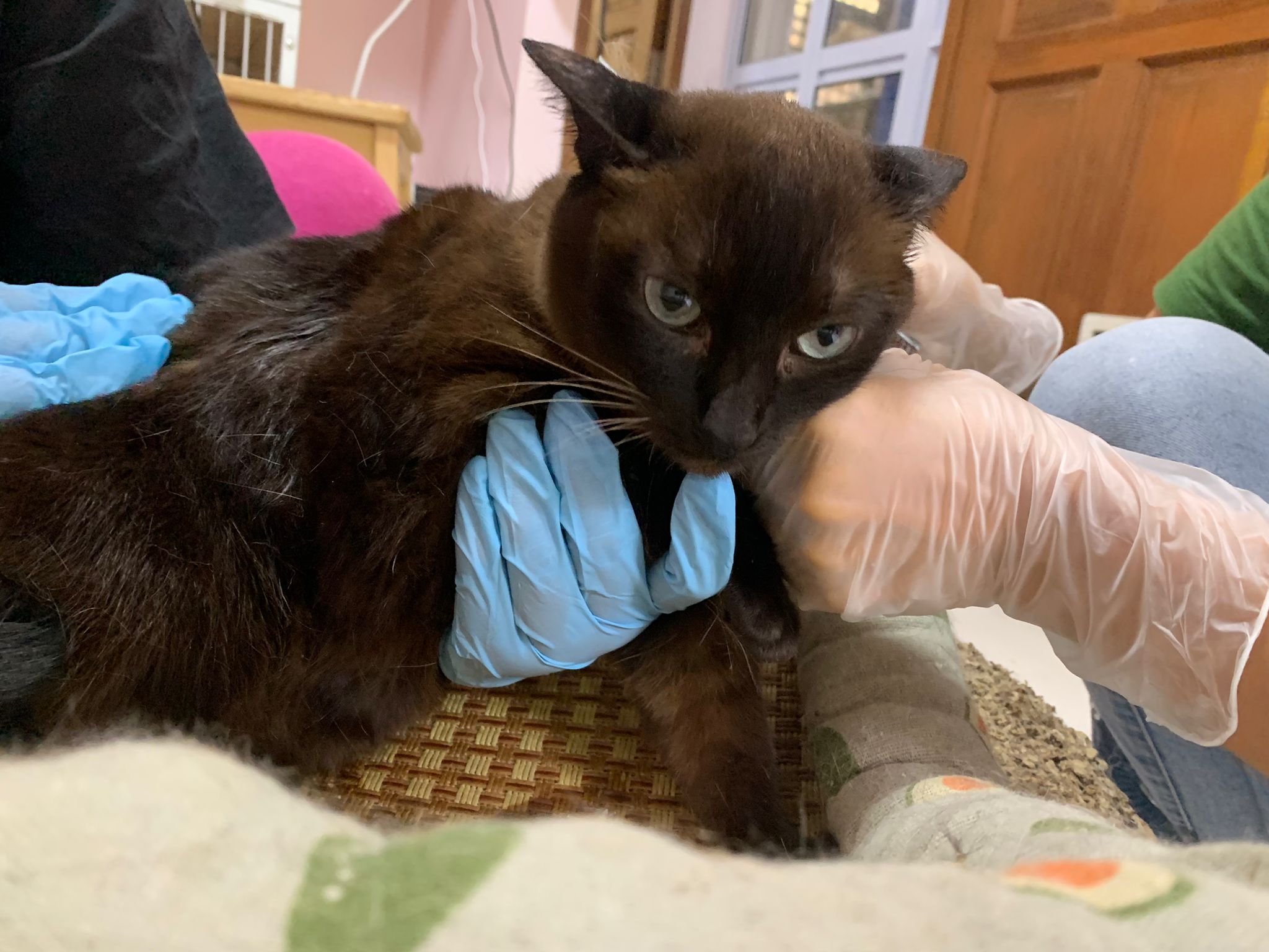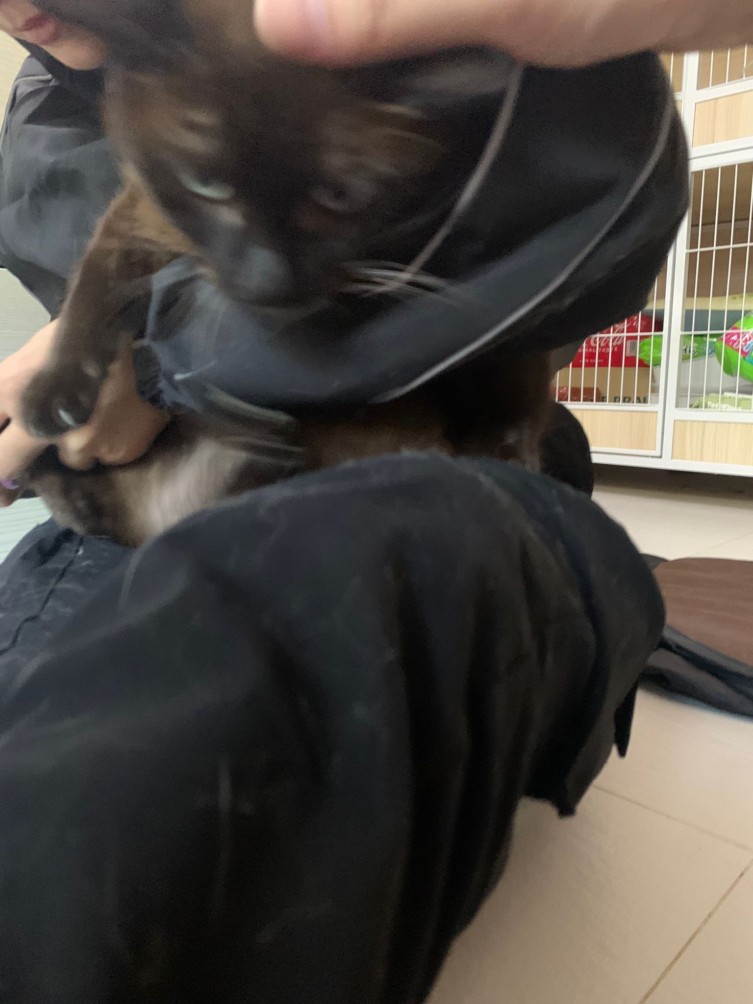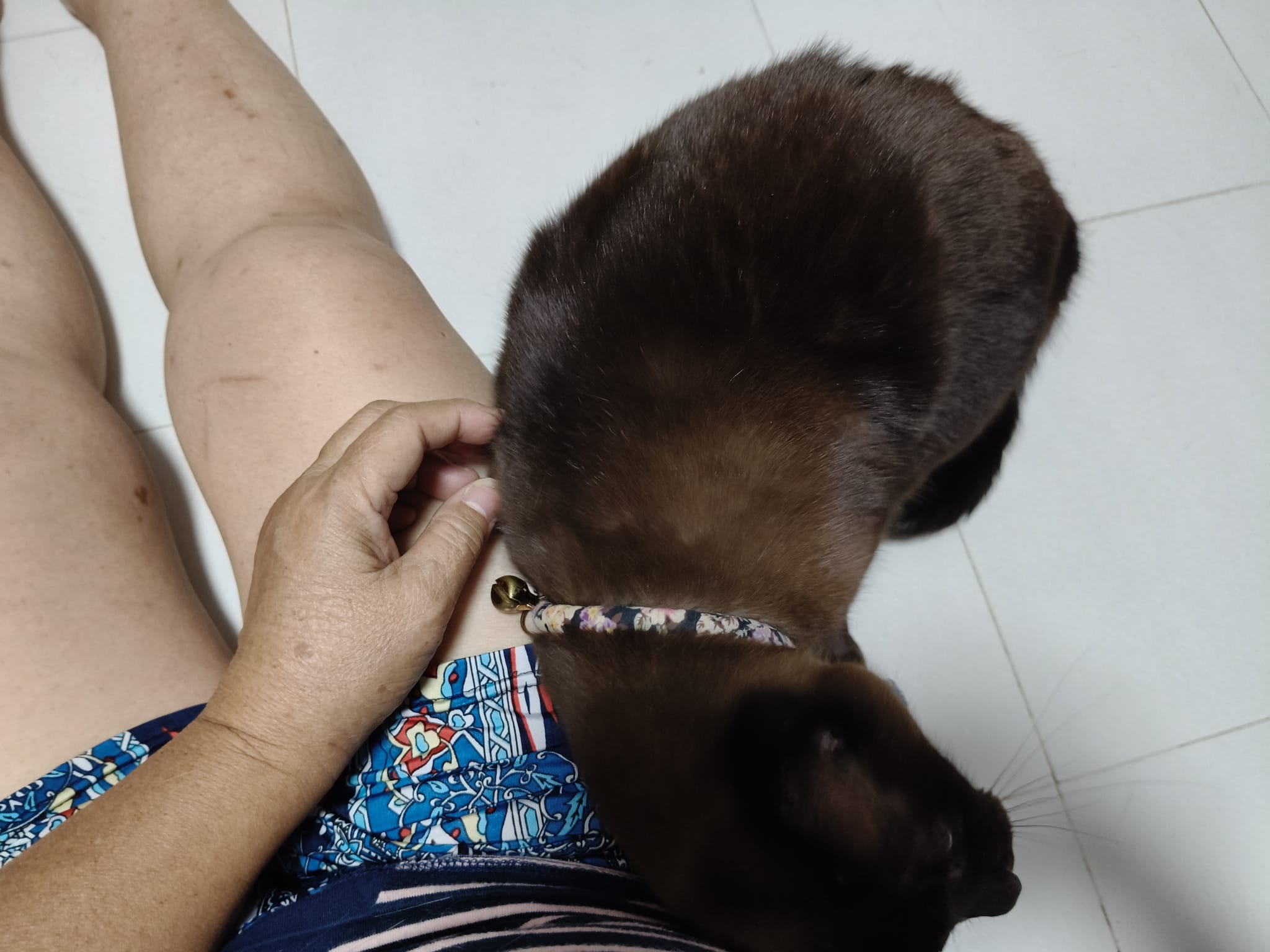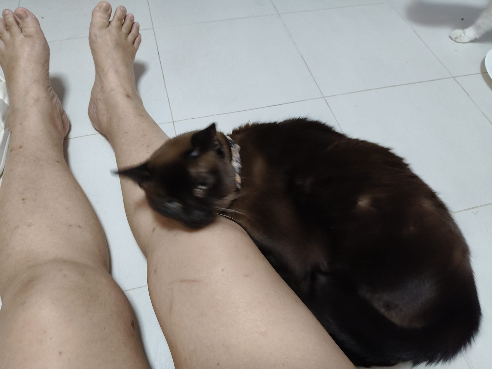 Night; today mmm cover jo. Think the cats happy. Mmm:”Couldn’t reach to pat. Asked her to come down. N then stick on me. Brownie – 2 nights not eating”
