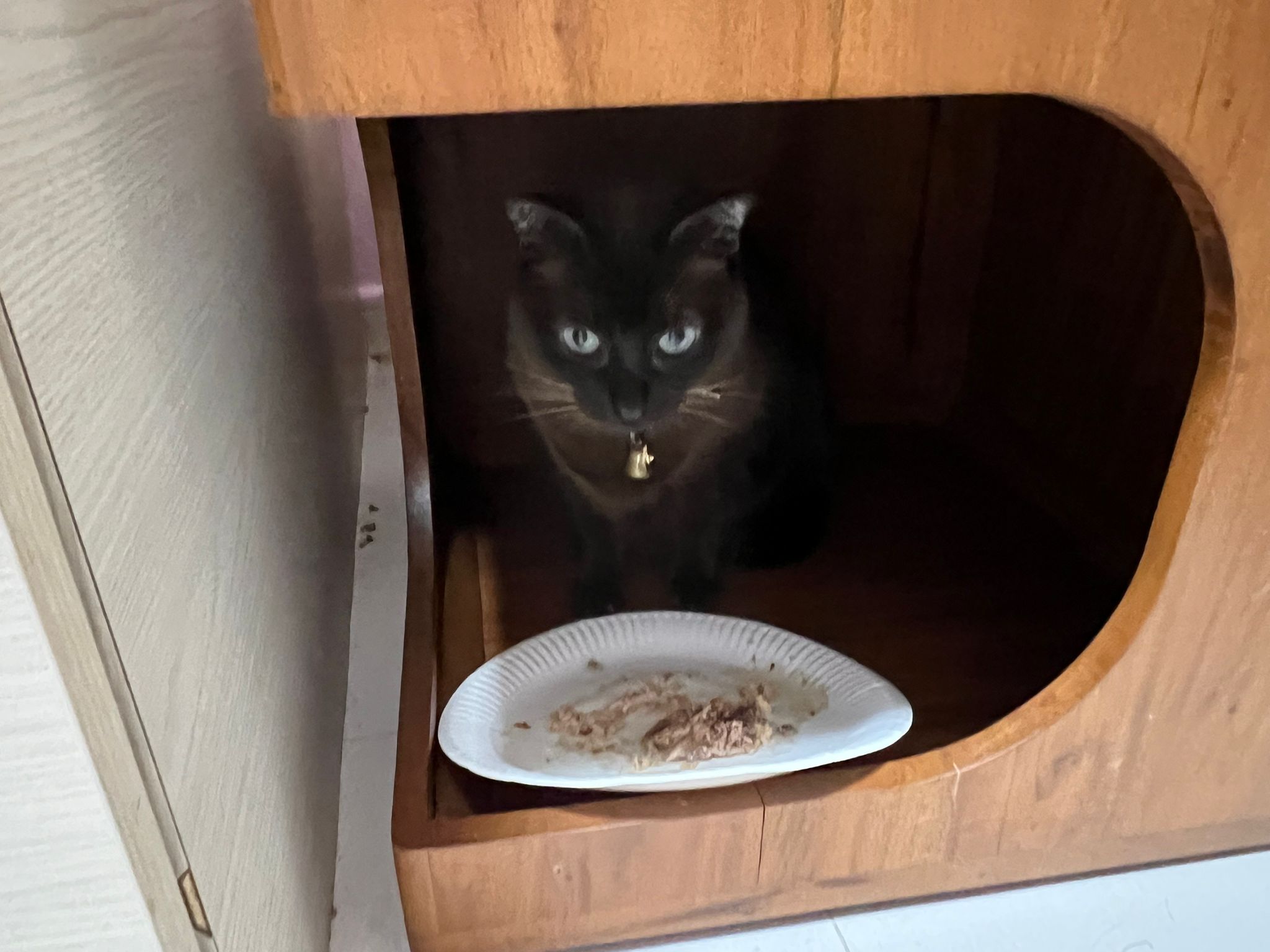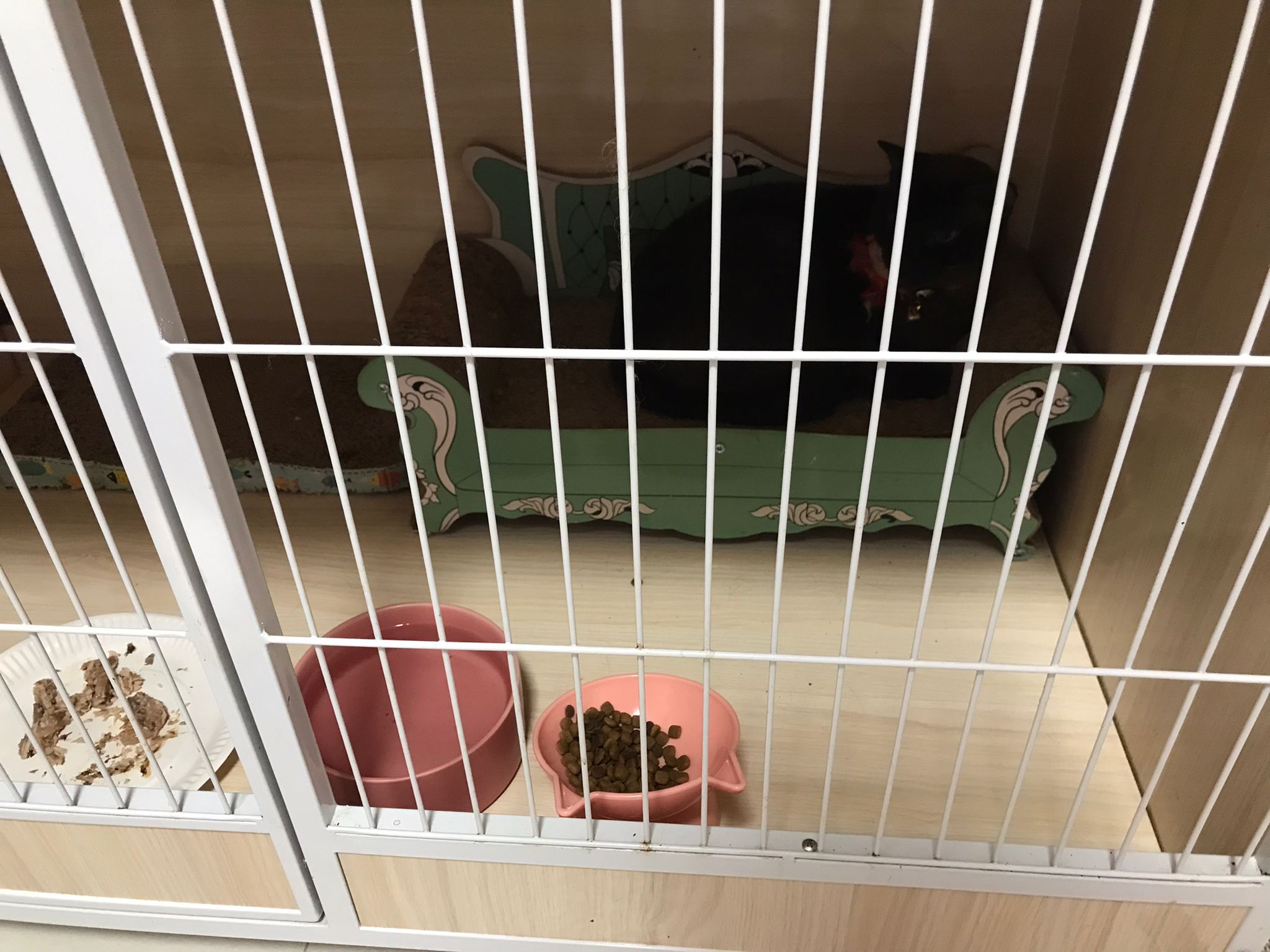 • getting comfy no major issue but she is still at room C, but now at the door will meow at me for food
