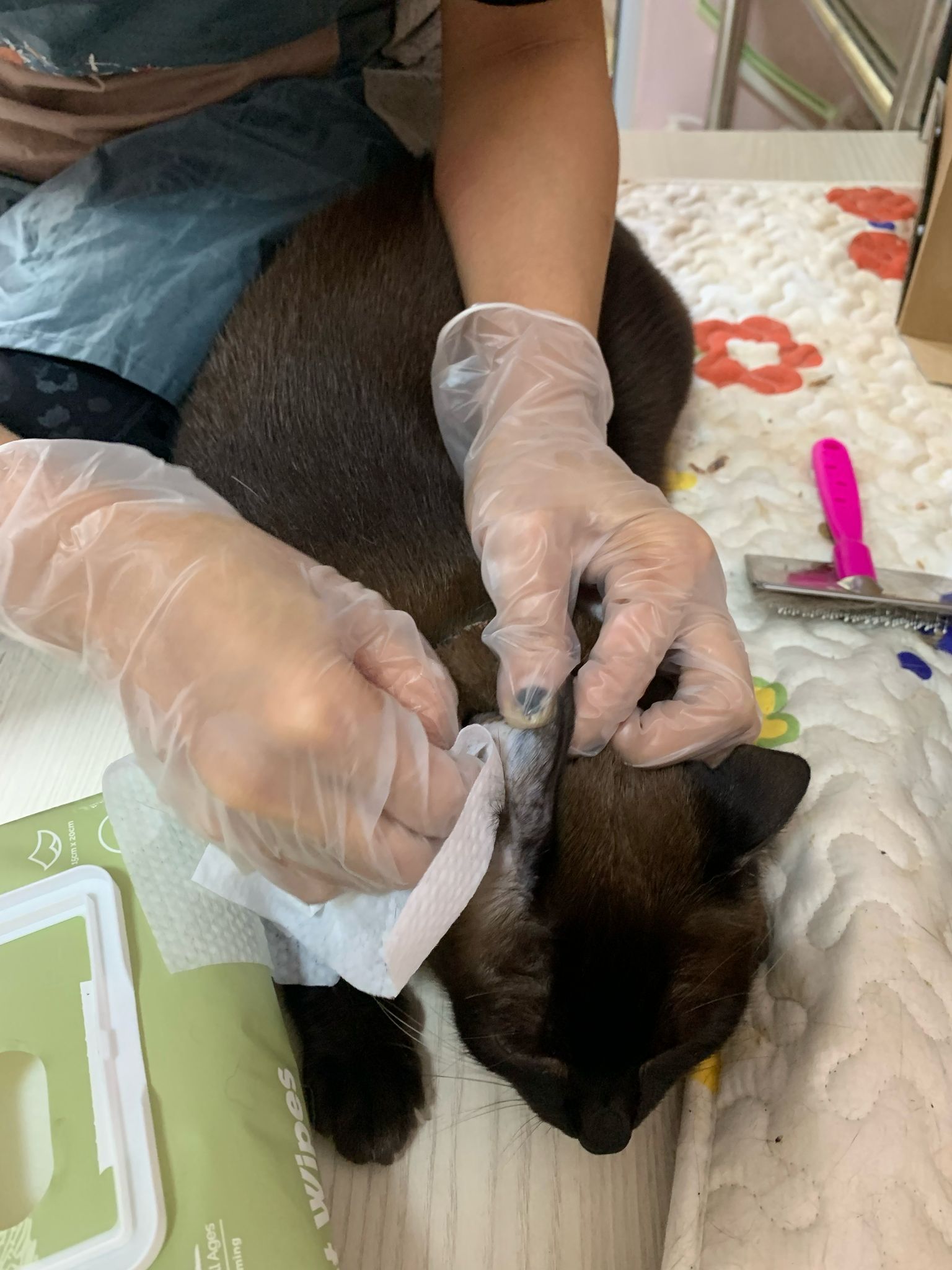 10am: basic grooming done – clean w dry shampoo, brush and wipe. Wipe ears and eyes. Nails cut.