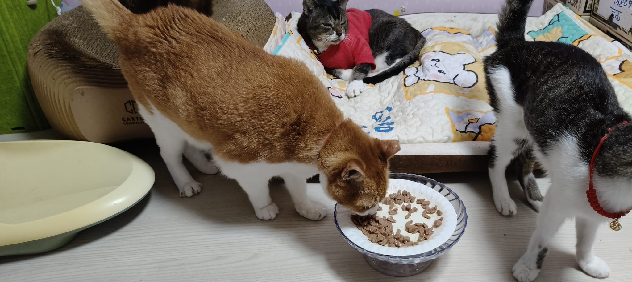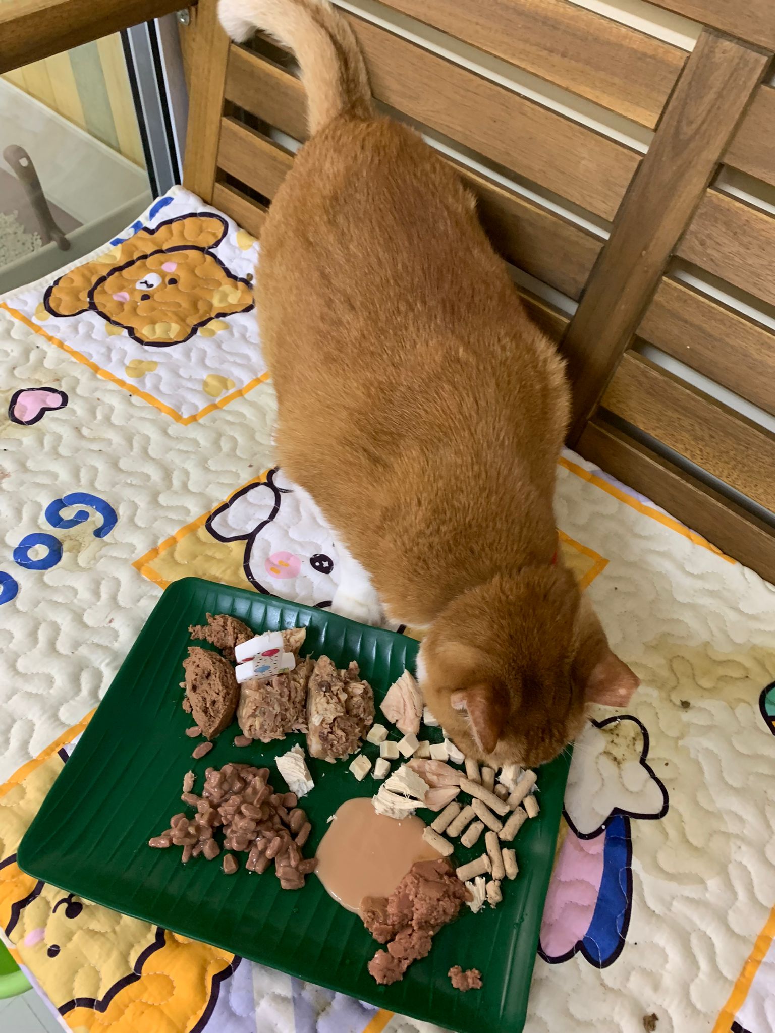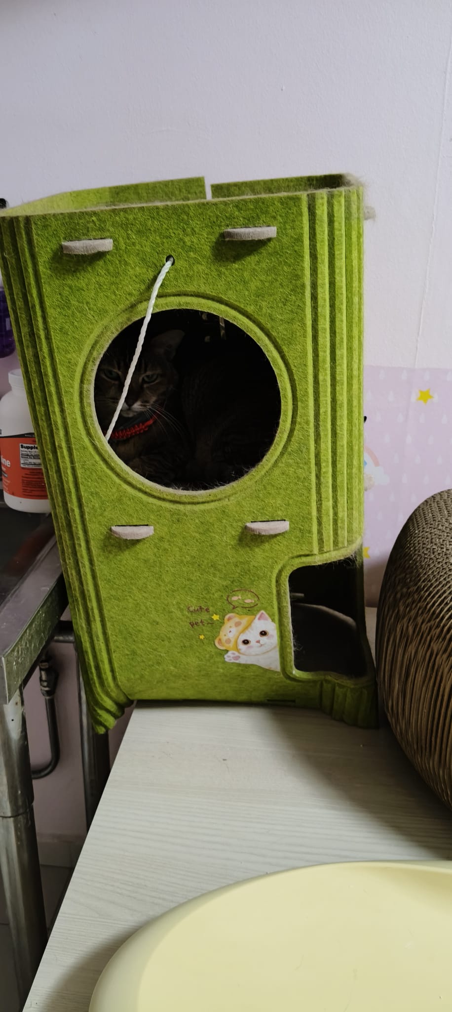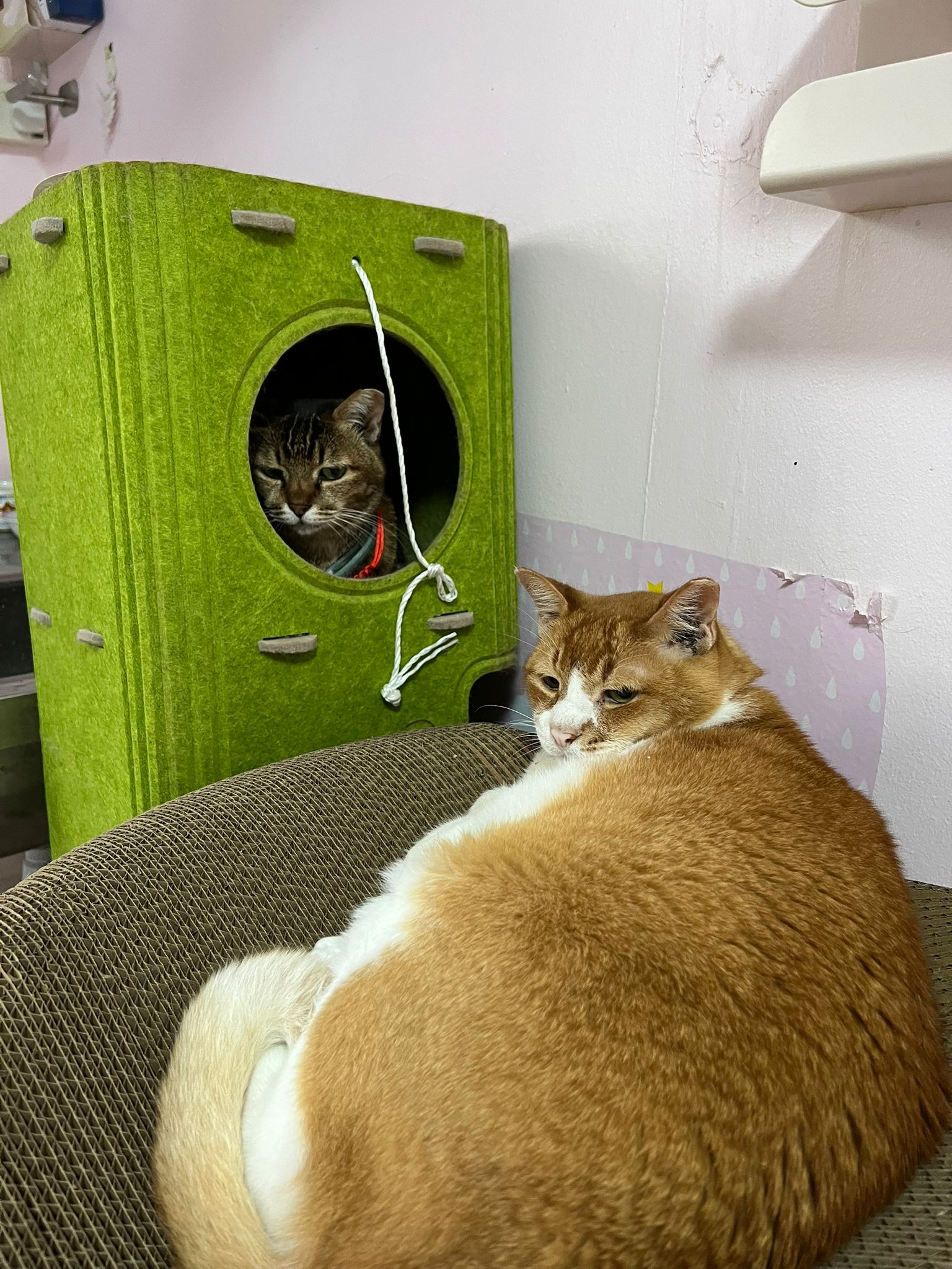 12om+: play w sena in the green condo for long and buddy at the window grooming himself come to find us for rubs and hugs n sayang